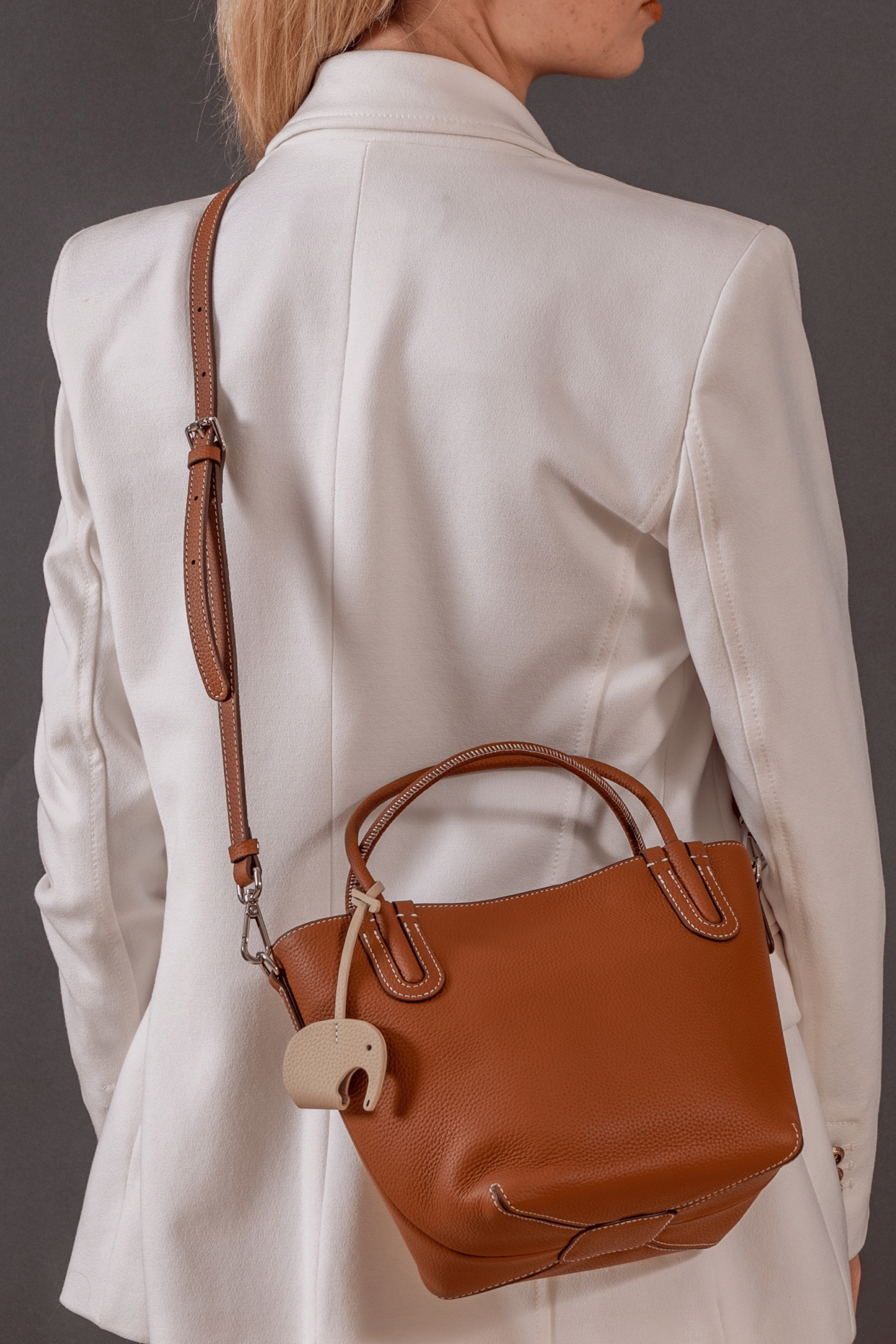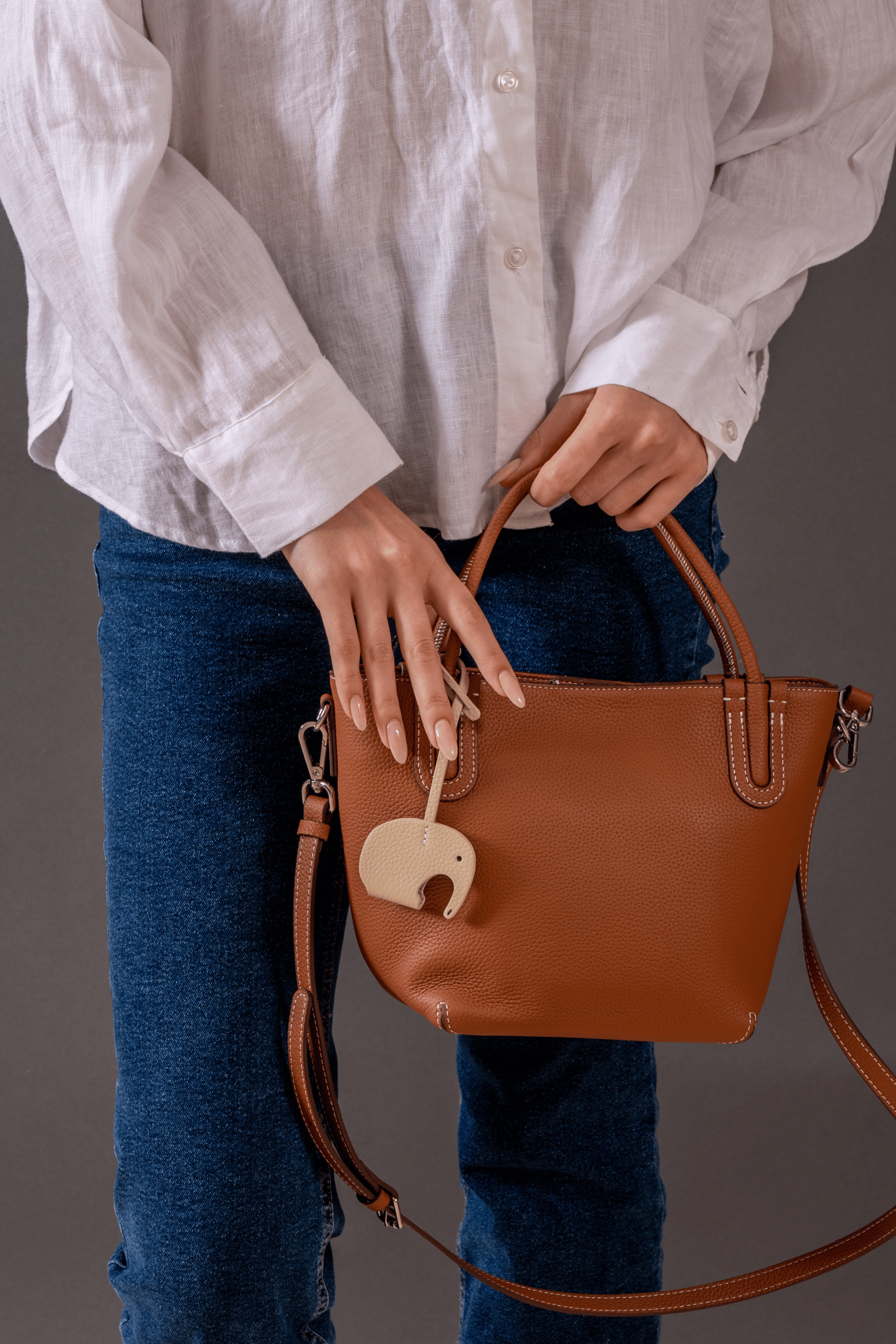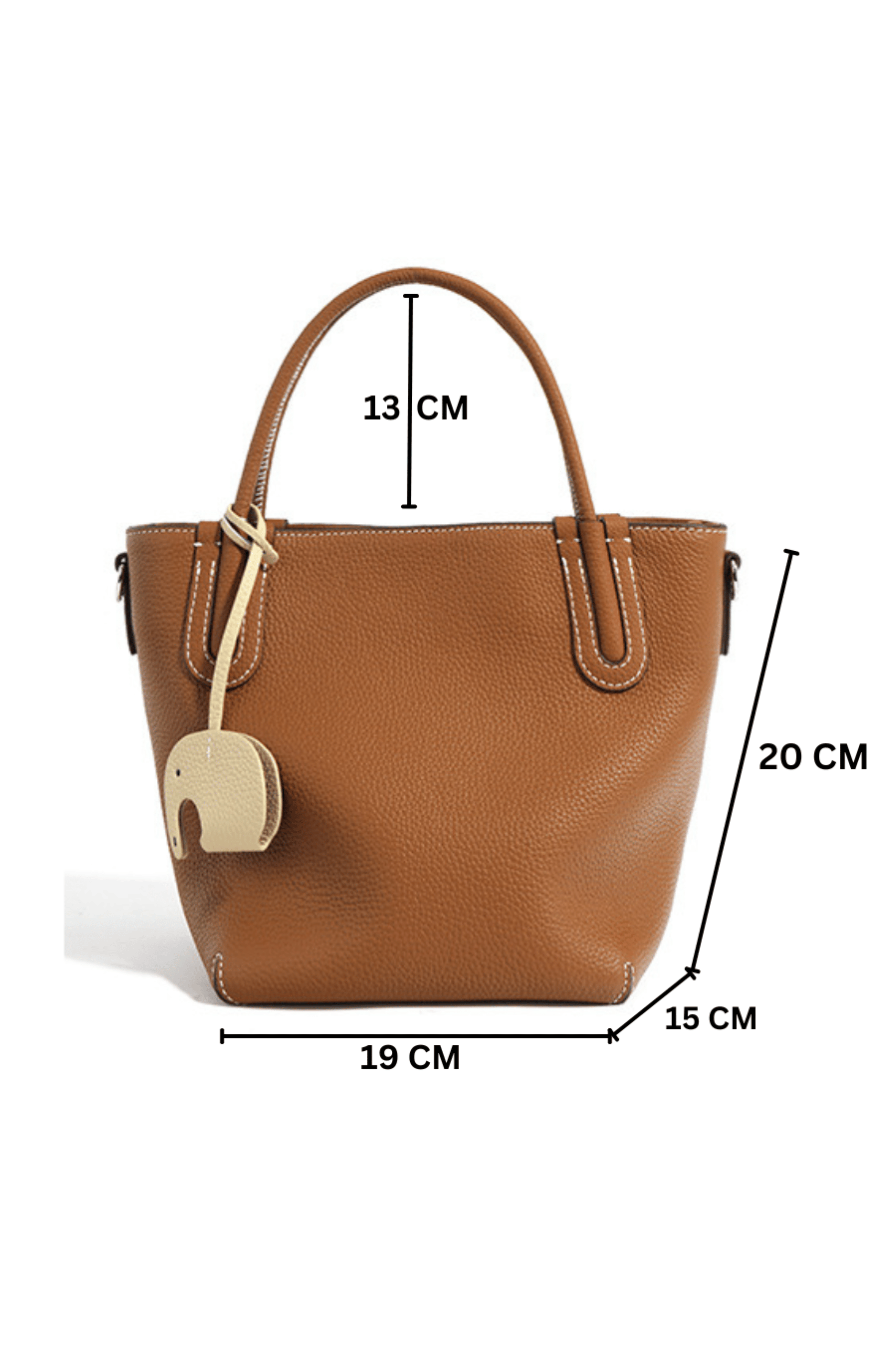 Add a touch of charm to your ensemble with our Ladies Bucket Bag, Elara crafted from genuine leather with a luxurious pebble grain texture in a rich Tan color. This stylish and functional bag features: 1. Pebble Grain Texture: A sophisticated finish that exudes understated elegance. 2. Magnetic Button Closure: Secure and convenient, blending practicality with style. 3. Well-Organized Interior: Two pockets- one open and one with zipper to provide easy access to your essentials. 4. Detachable Shoulder Strap: Customize to either a shoulder or cross-body fit for comfortable all-day wear. 5. Unique Elephant-Shaped Leather Charm: A playful, artisanal detail that adds character and individuality to your bag. 6. Dust Bag: comes in a cotton dust bag for storing when not in use.