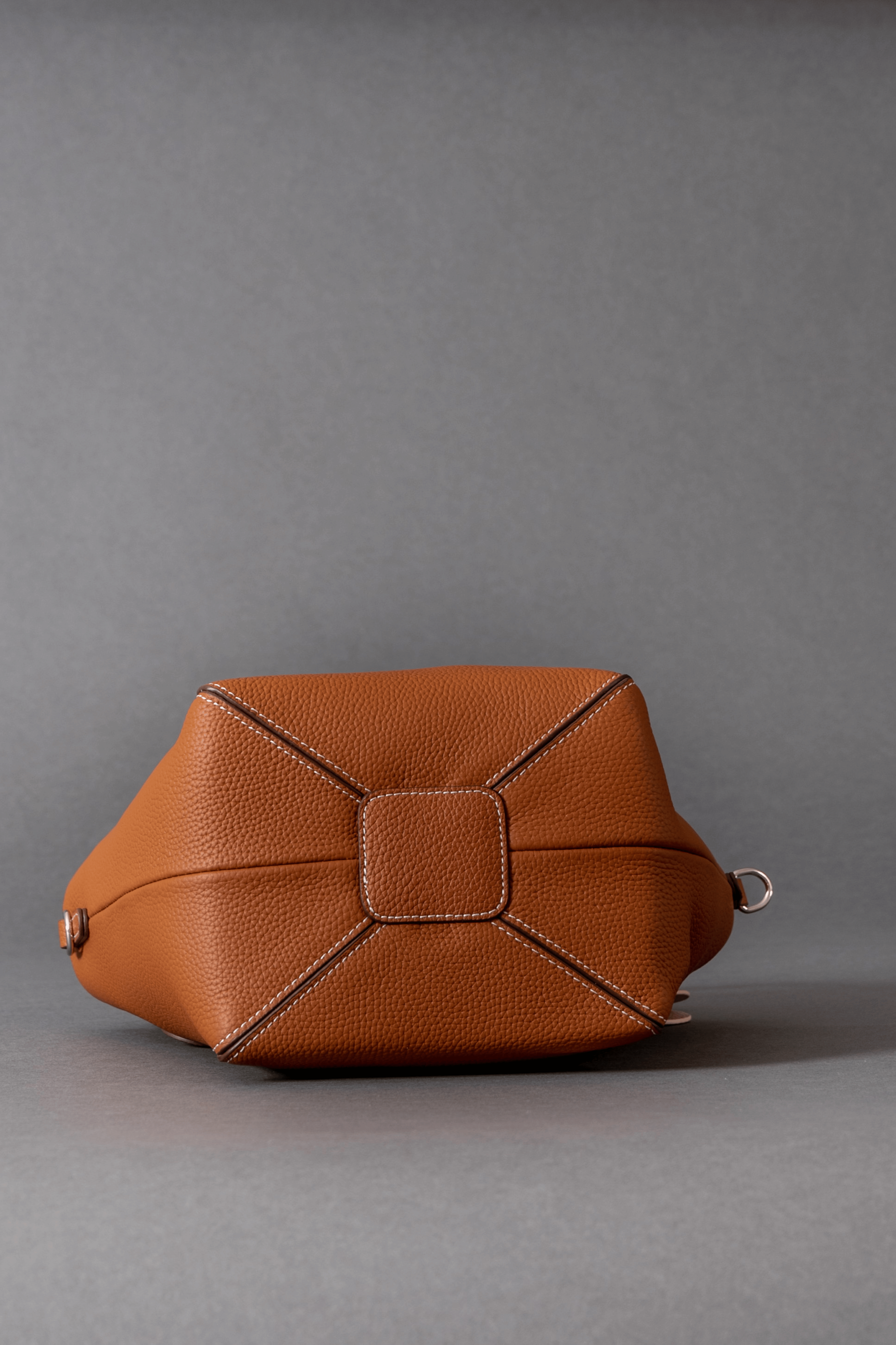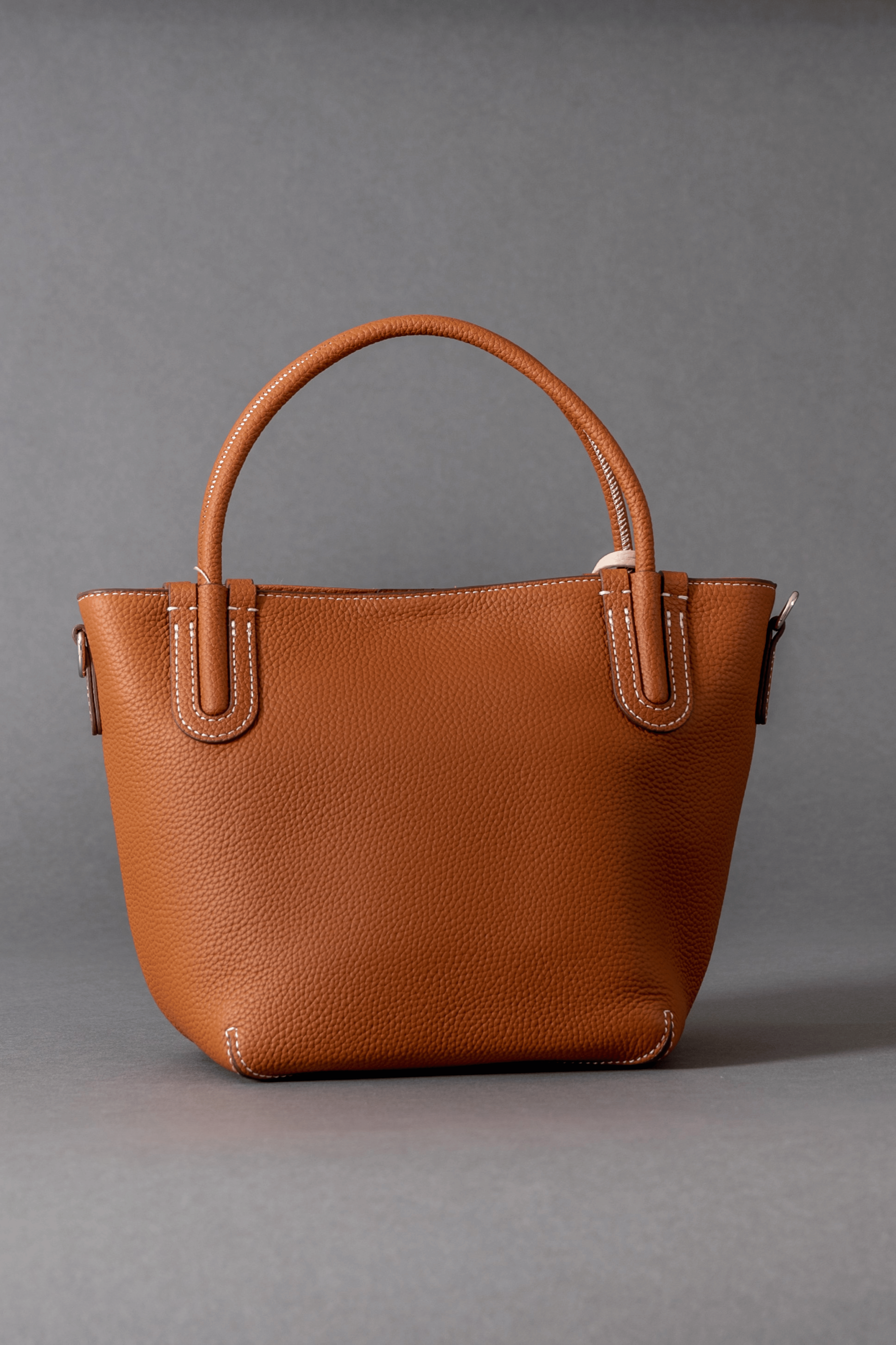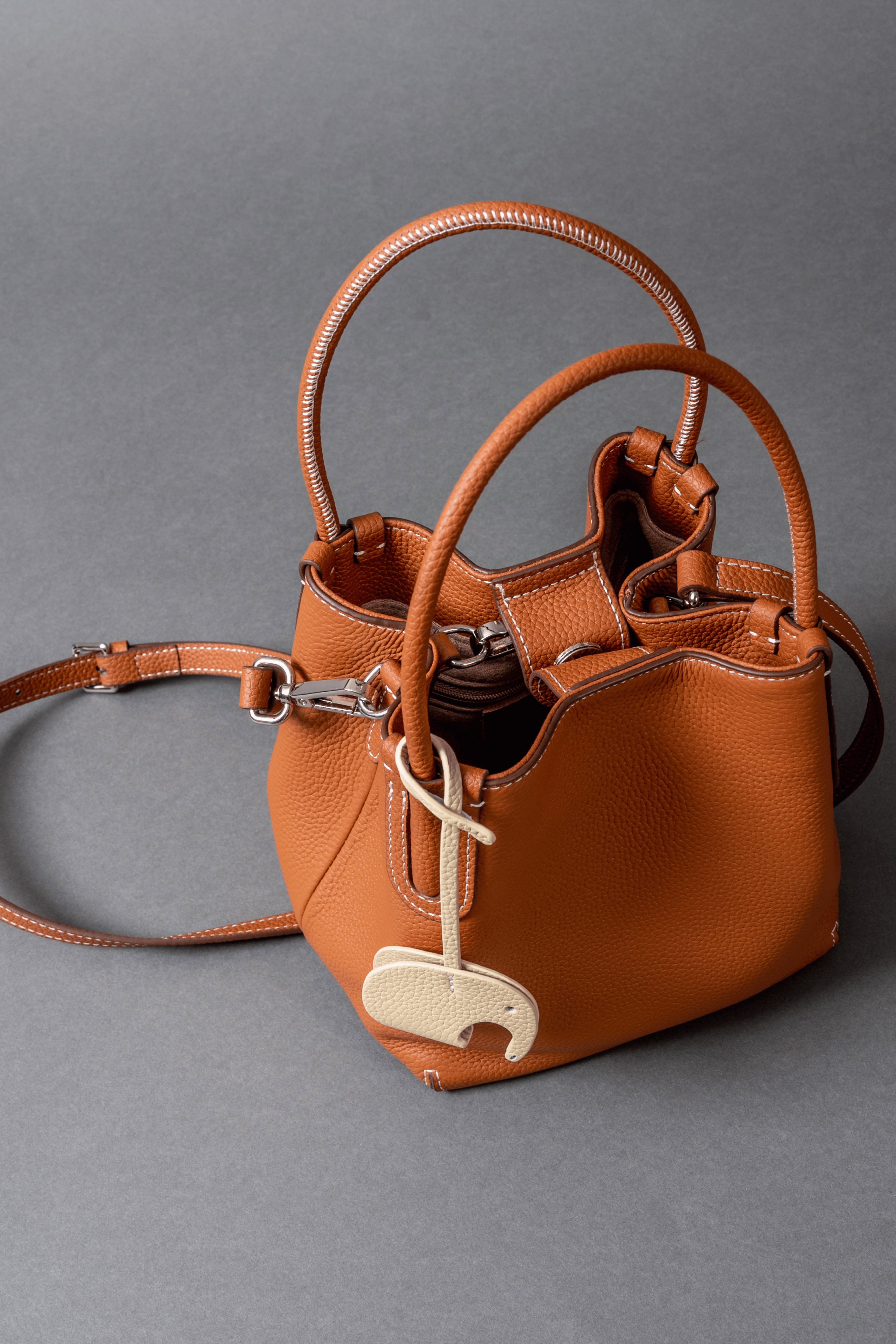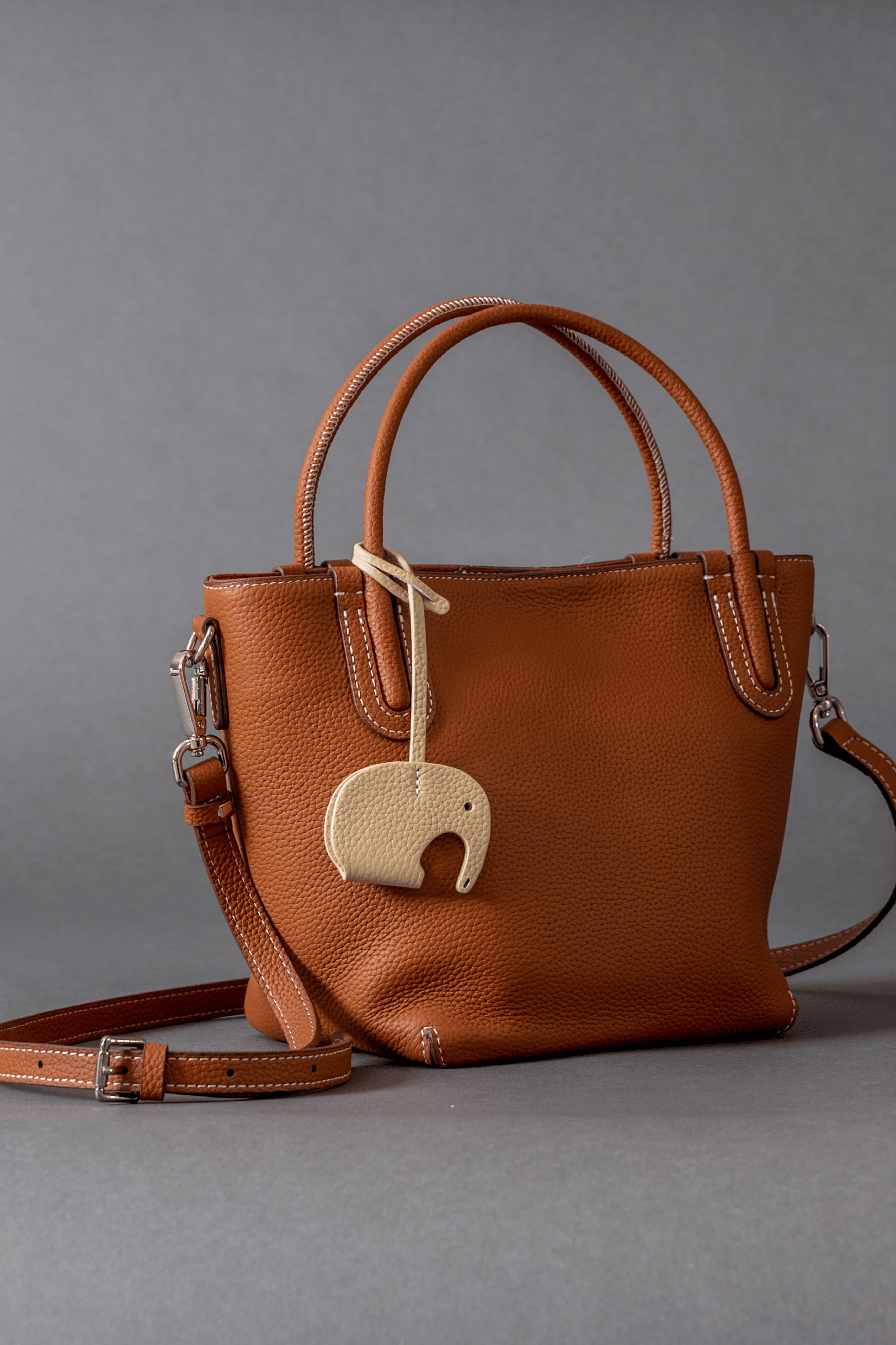 Add a touch of charm to your ensemble with our Ladies Bucket Bag, Elara crafted from genuine leather with a luxurious pebble grain texture in a rich Tan color. This stylish and functional bag features: 1. Pebble Grain Texture: A sophisticated finish that exudes understated elegance. 2. Magnetic Button Closure: Secure and convenient, blending practicality with style. 3. Well-Organized Interior: Two pockets- one open and one with zipper to provide easy access to your essentials. 4. Detachable Shoulder Strap: Customize to either a shoulder or cross-body fit for comfortable all-day wear. 5. Unique Elephant-Shaped Leather Charm: A playful, artisanal detail that adds character and individuality to your bag. 6. Dust Bag: comes in a cotton dust bag for storing when not in use.