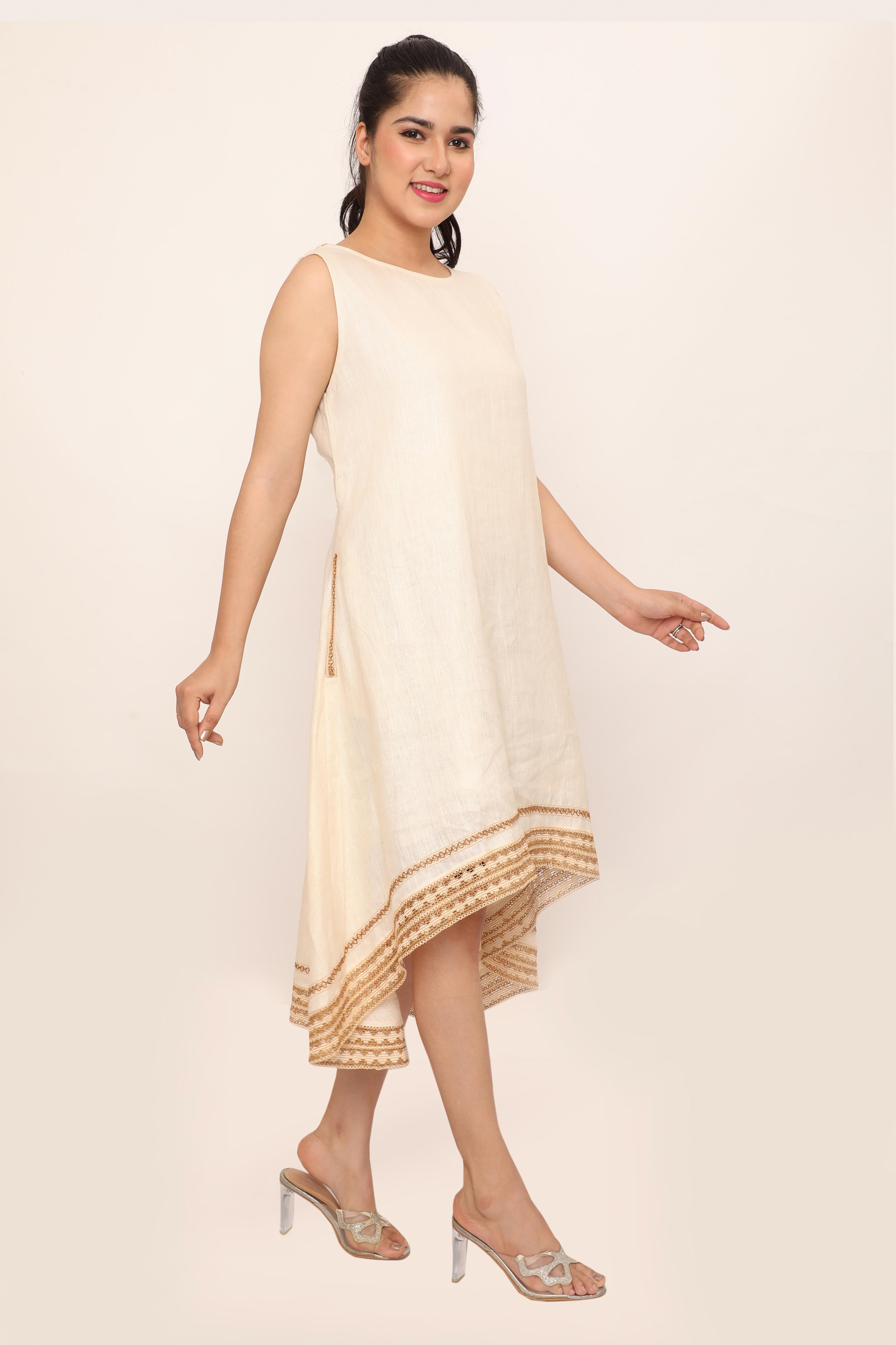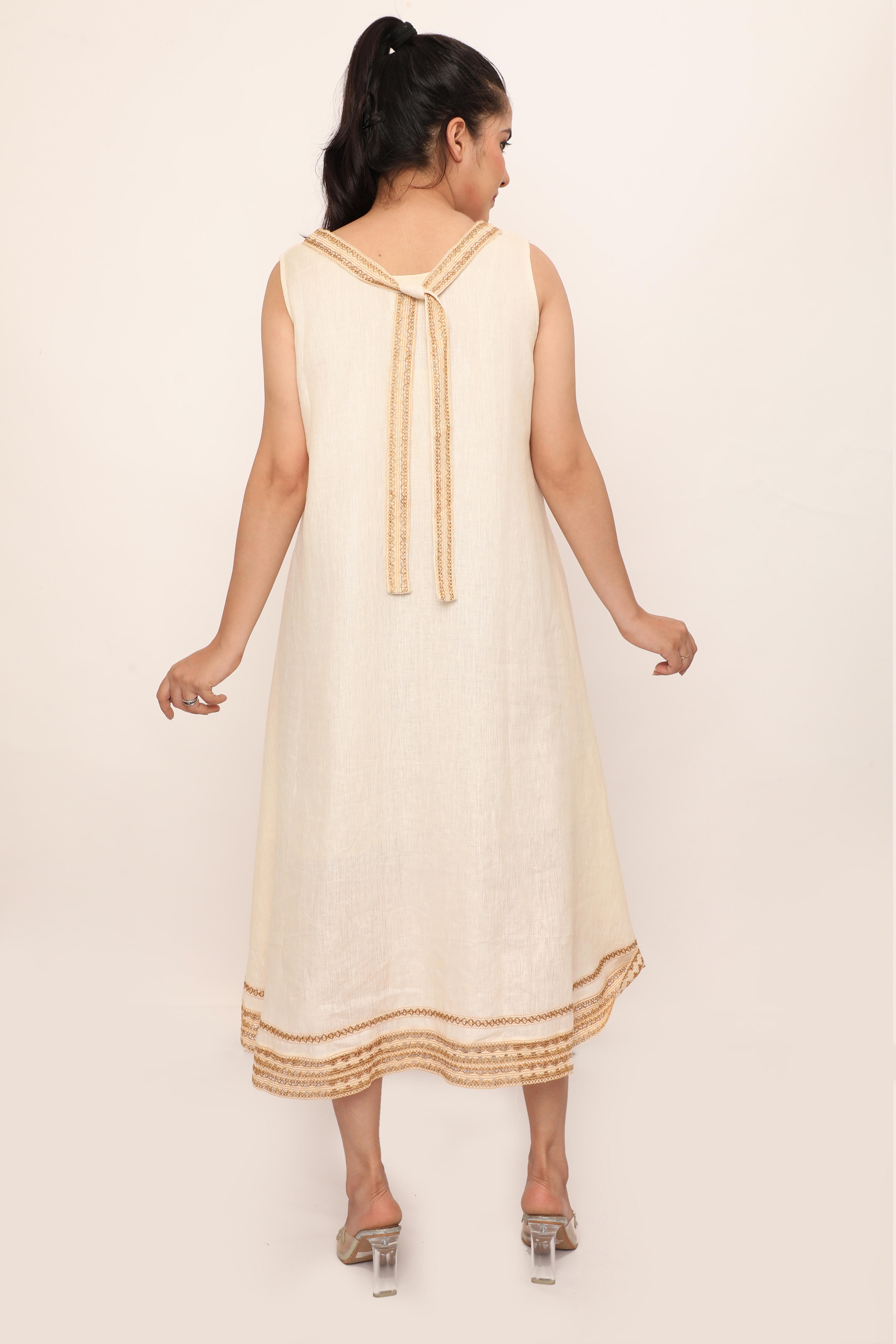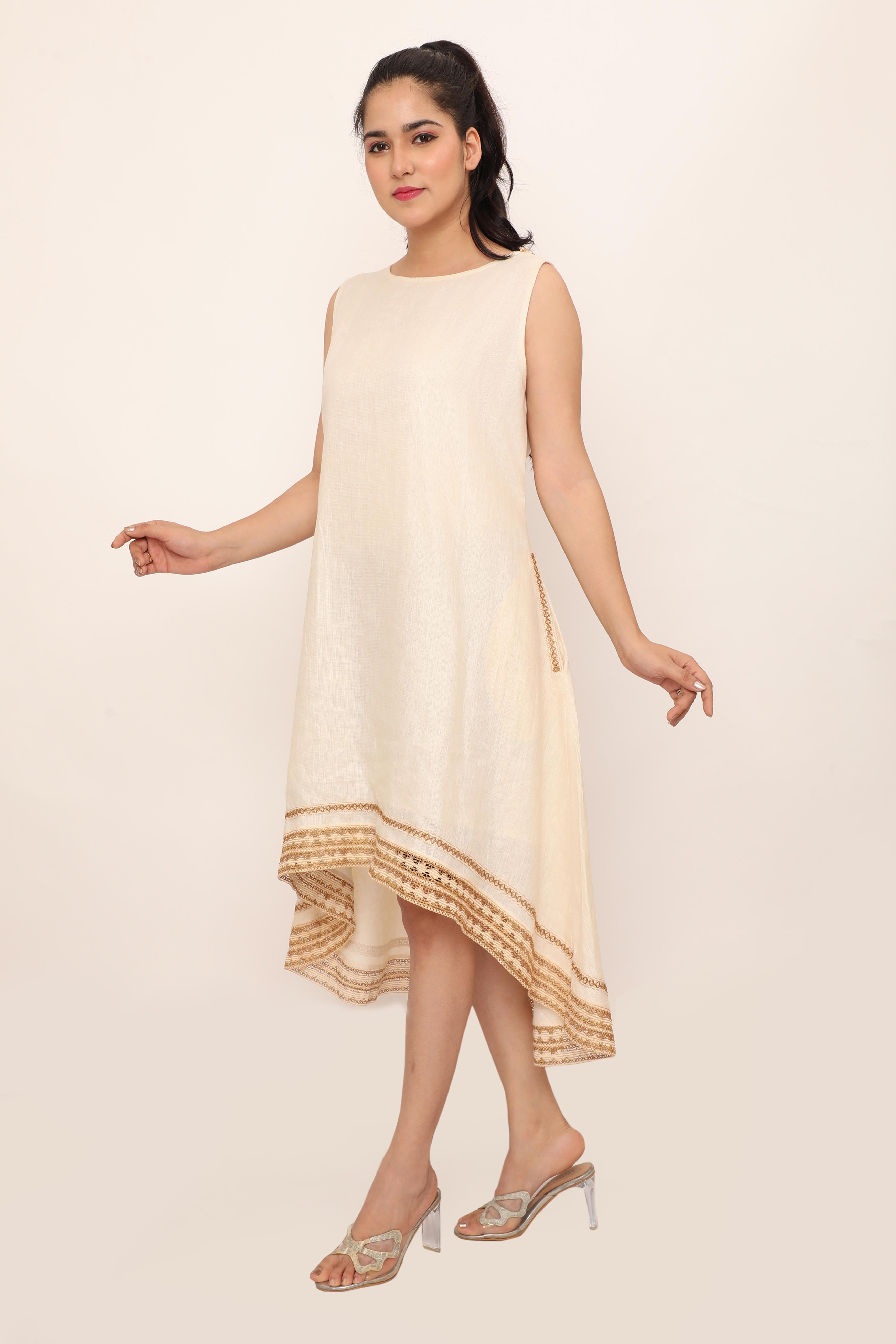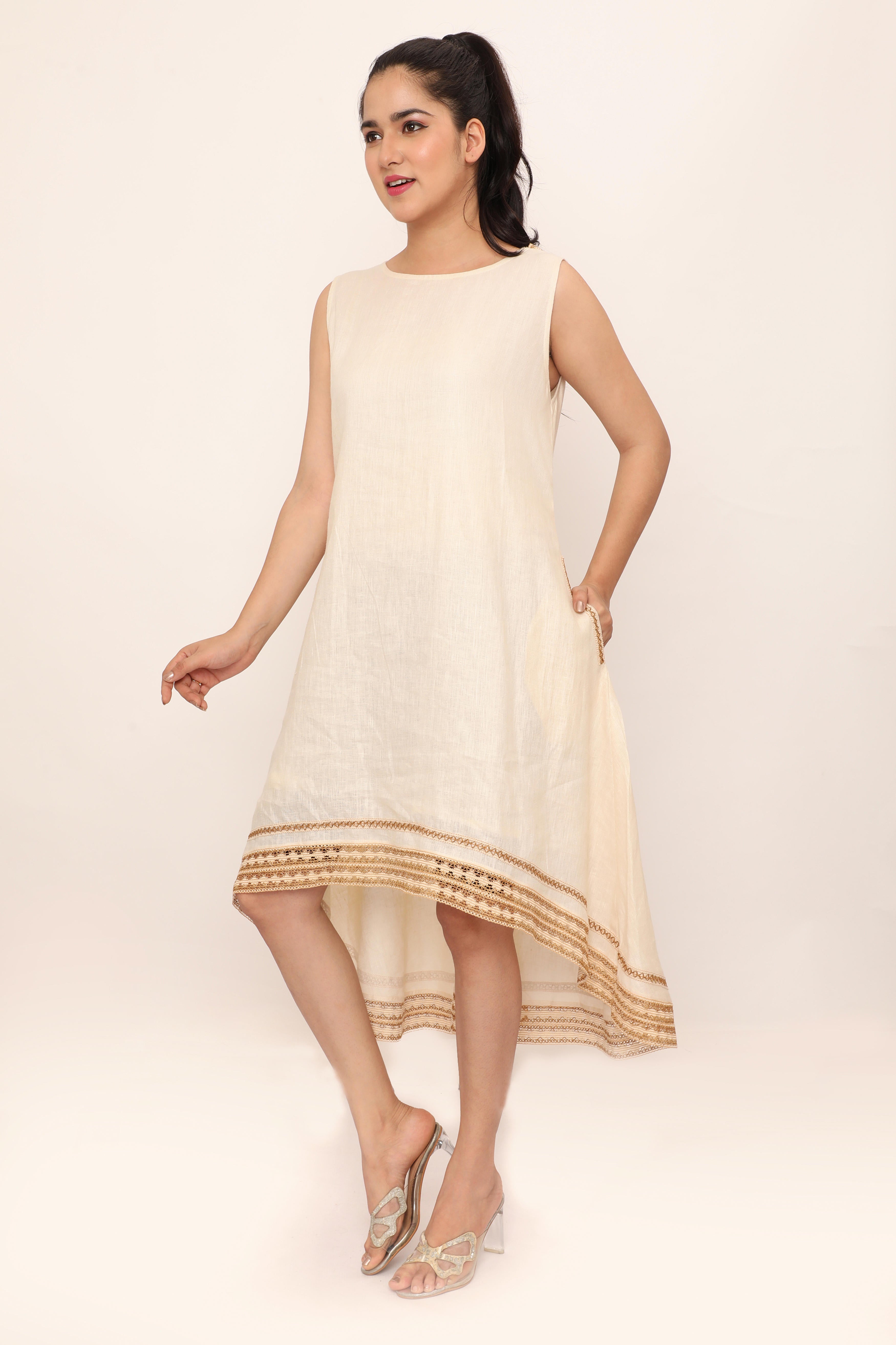 The Elara Dress - An elegant A-line dress featuring a sleeveless design with a high-low hem, giving it a graceful and flowing silhouette. The dress is adorned with intricate lace trim along the hemline, adding a touch of sophistication and charm. The back of the dress is highlighted by a delicate tie-up detail at the neckline, accentuated by lace that mirrors the hemline. The dress is crafted from light, breathable linen, making it perfect for warm weather.