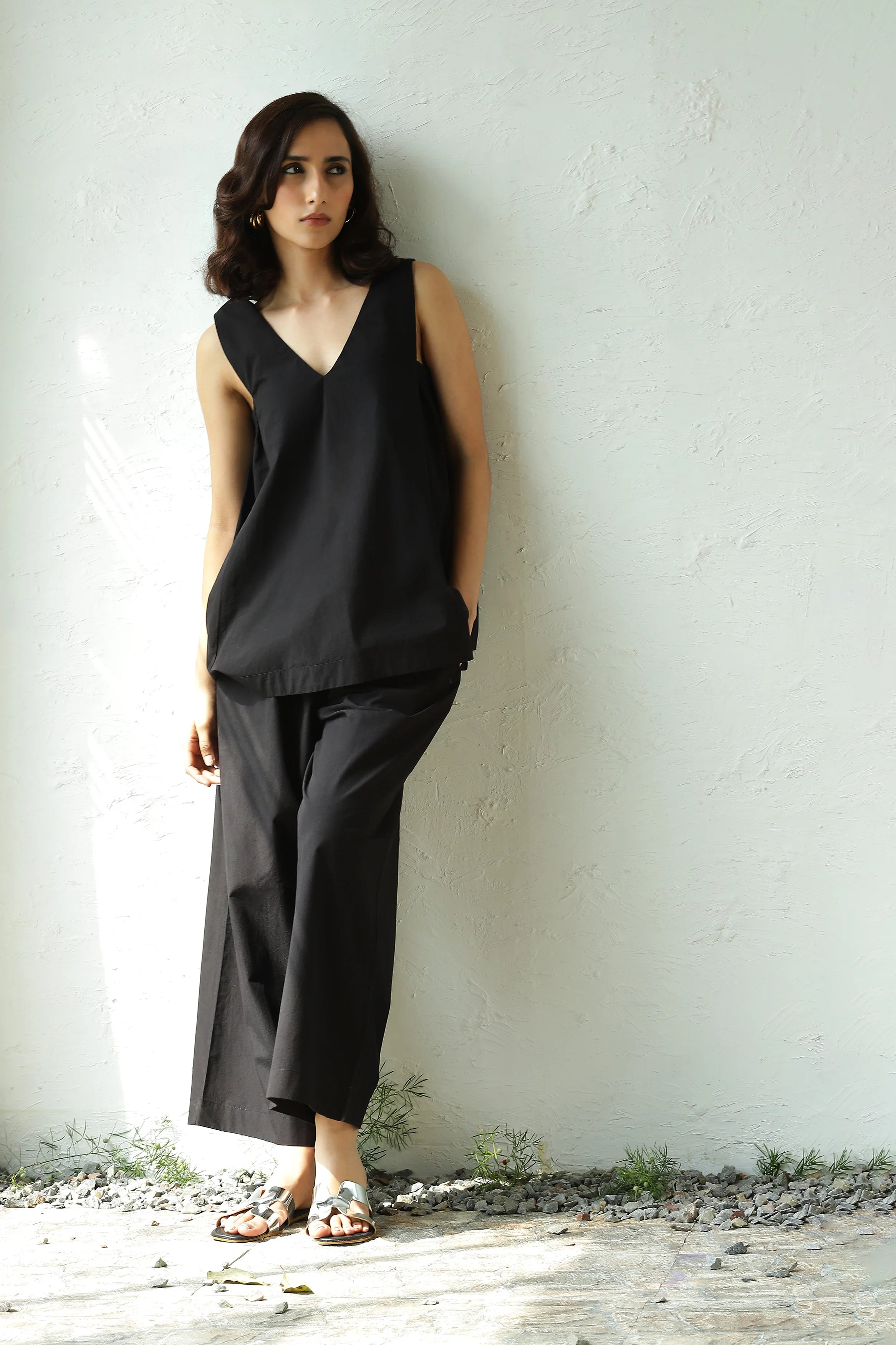 Step Out in Comfortable Elegance, in our 'Elegance Shift' Black Sleeveless Top – Your Ultimate Day-to-Night Transition Piece. Expertly tailored from crisp cotton poplin, it boasts a graceful A-line silhouette with a captivating V-neckline. The front inward pleat and elasticated side panels create a soft gathering effect. Embrace versatile style by pairing it flawlessly with the matching trousers for a coordinated ensemble.