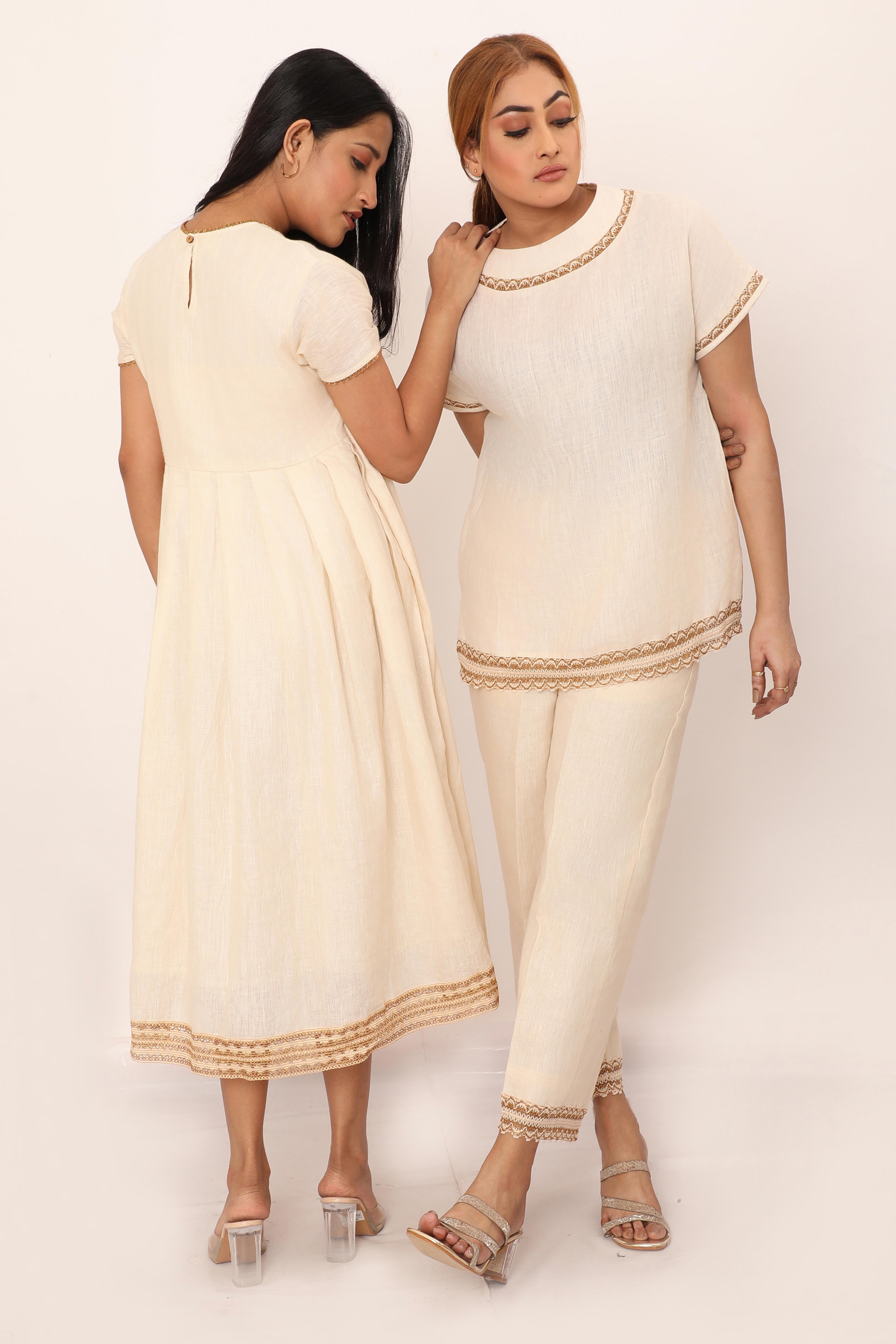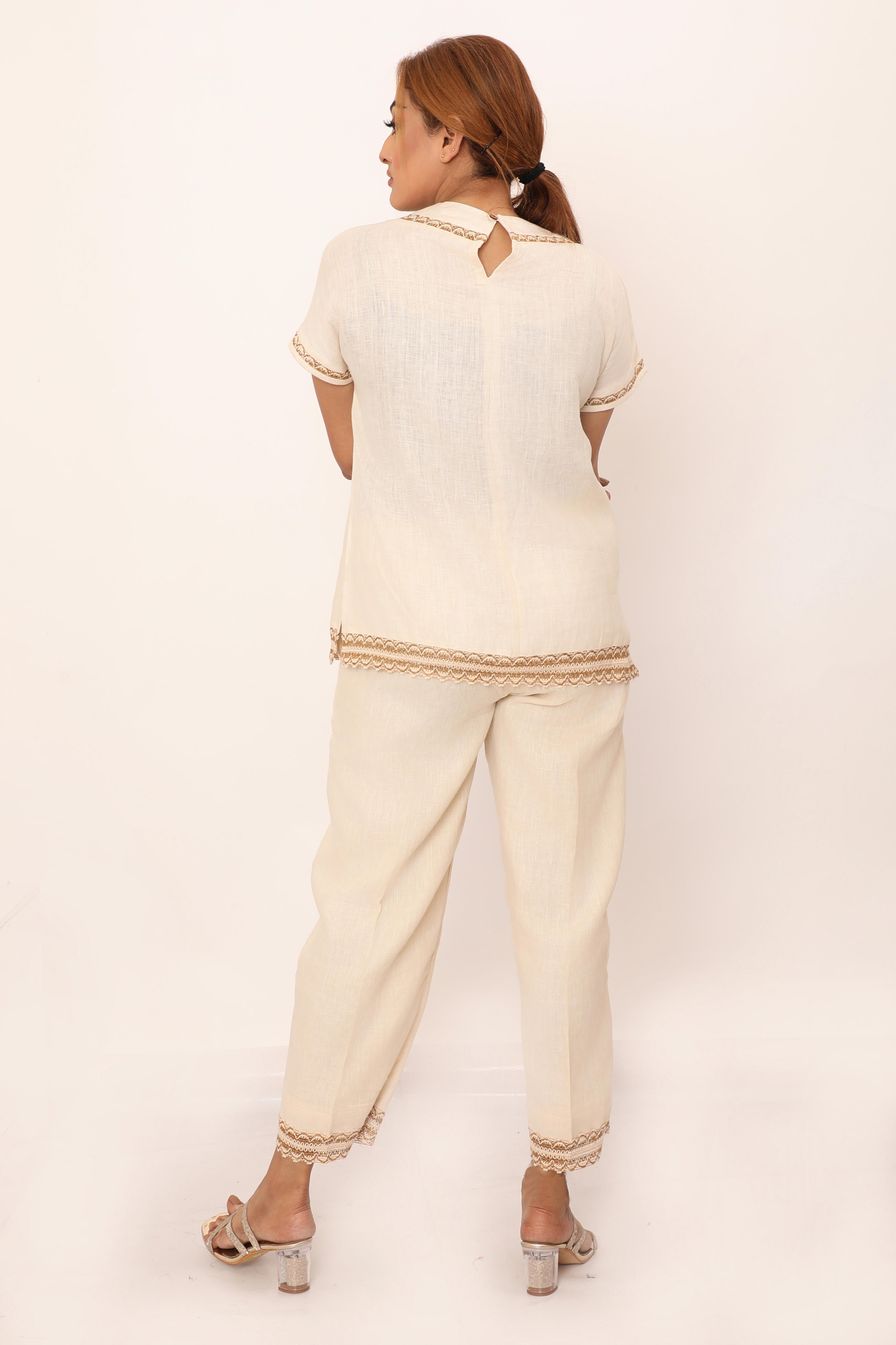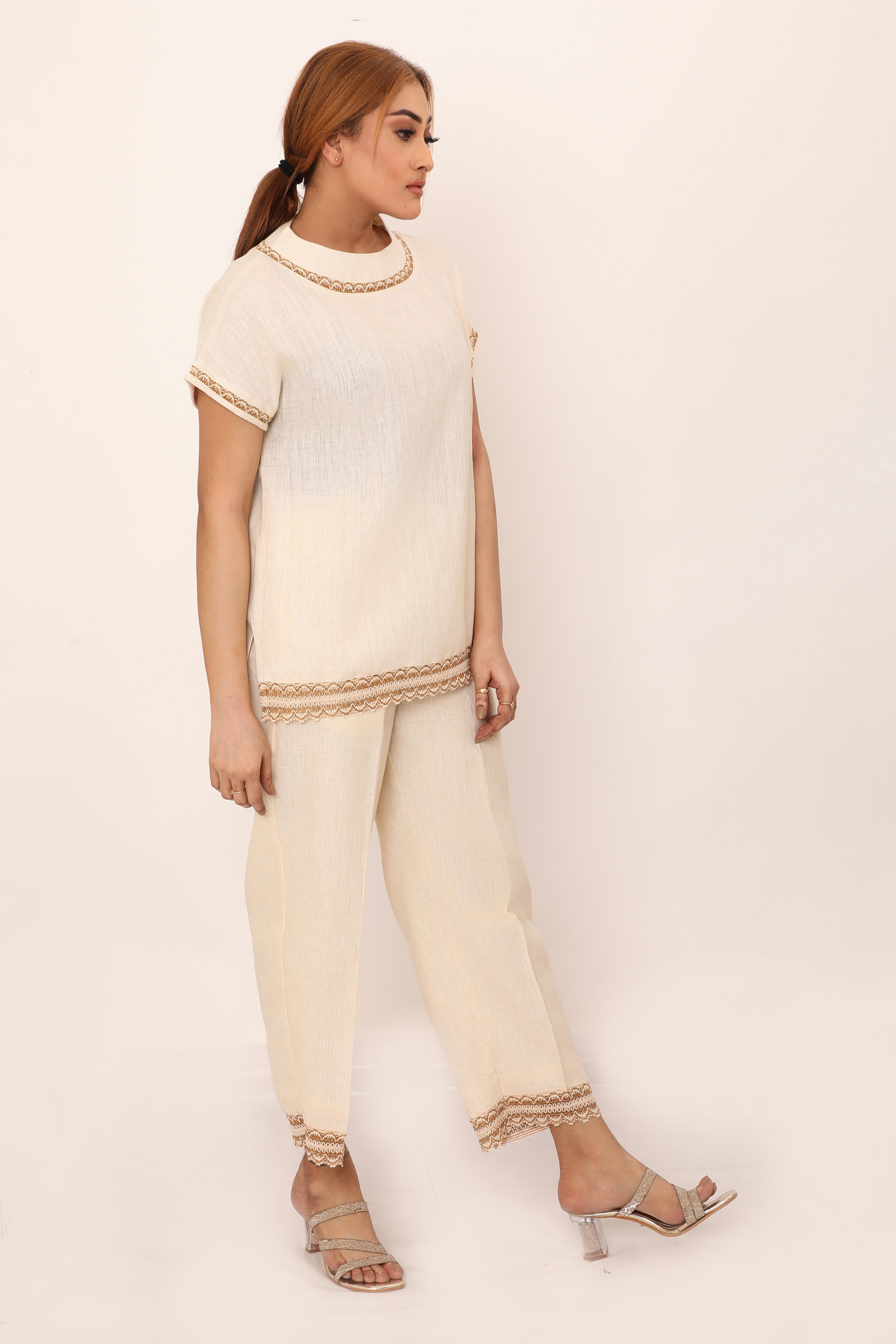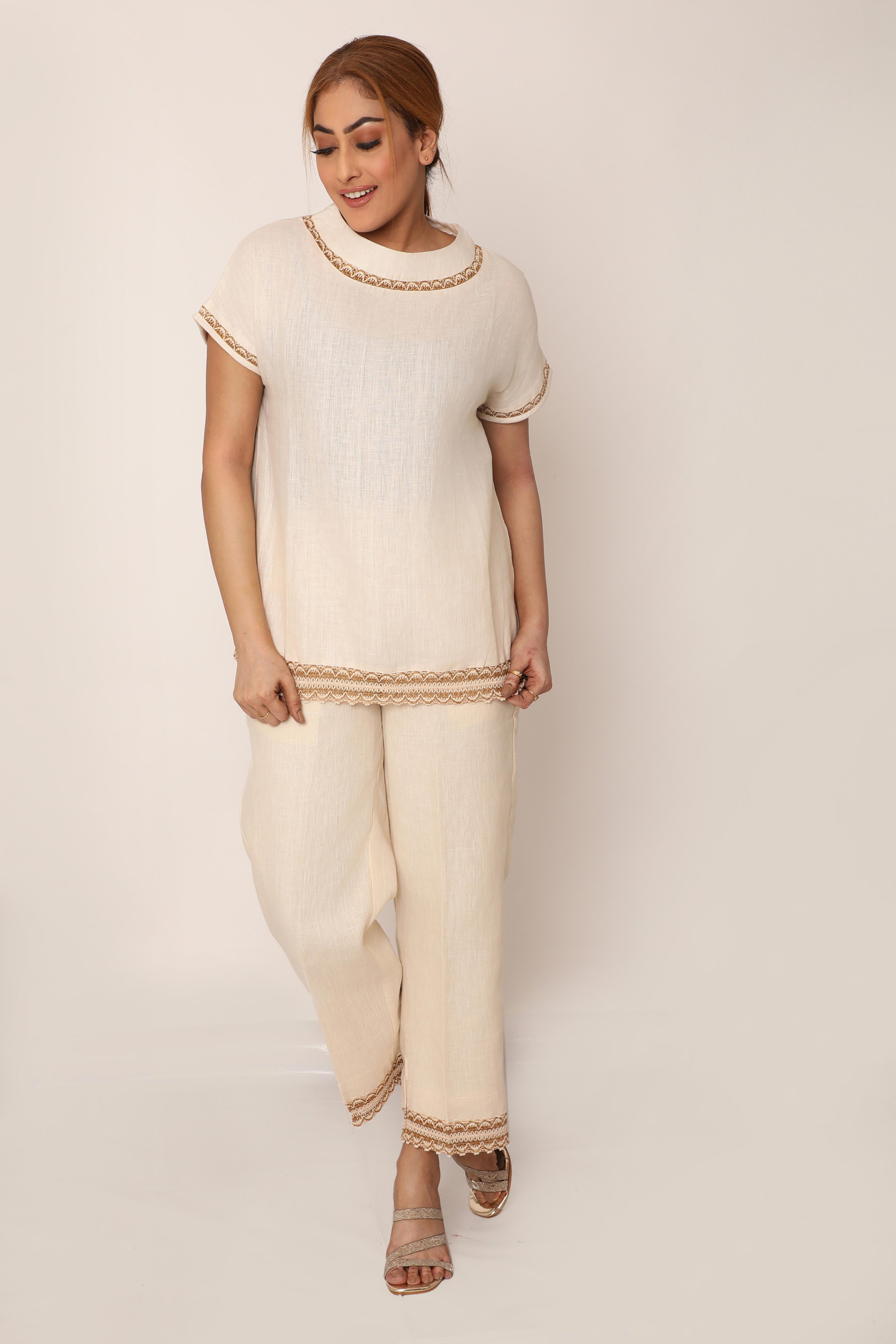 The Elysia set is where comfort meets craftsmanship. Thoughtfully designed with intricate detailing, this relaxed top and straight-leg pant combination is perfect for any occasion. The effortless silhouette and delicate accents make it both versatile and elegant, while the lightweight fabric ensures all-day ease. Whether you?e heading to a casual lunch or an evening gathering, Elysia brings refined simplicity to your look.