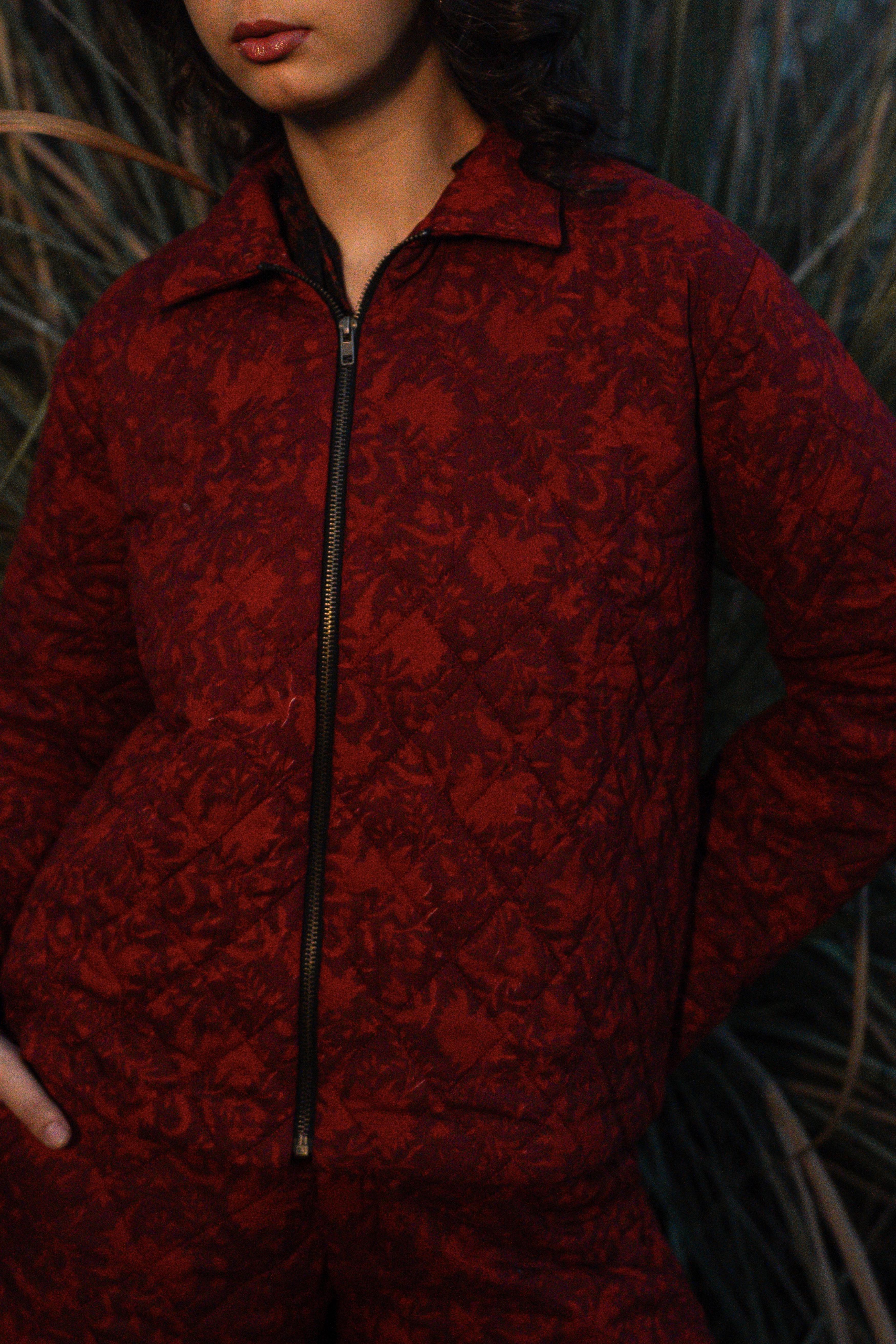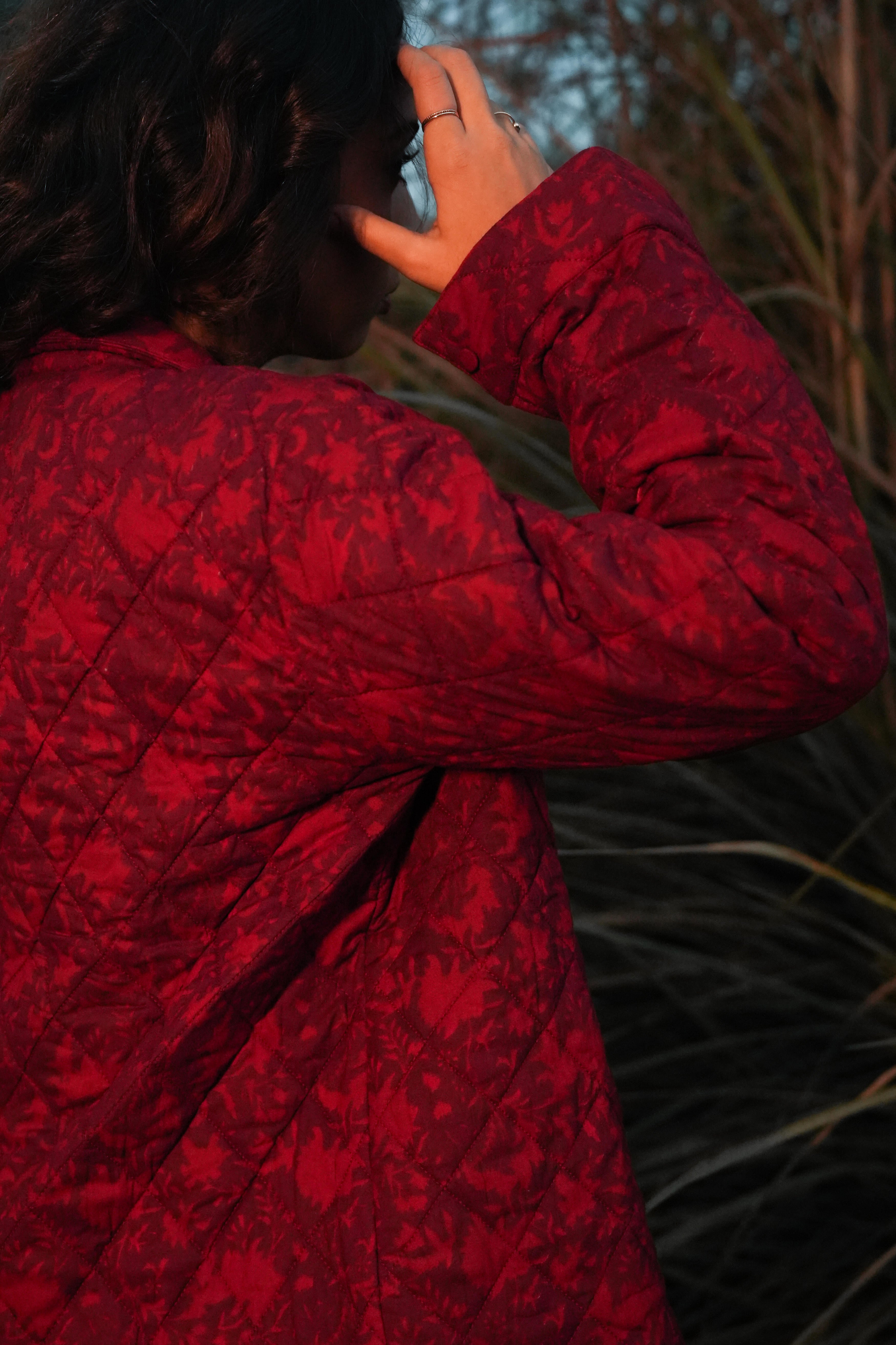 The Ember Quilted Jacket feels like wearing a glowing dusk sky. Its short, roomy silhouette sits away from the body, balanced by long sleeves that subtly flare at the cuffs. The intricate quilt lines slice through the dark red florals beneath, creating a grid of embers that brighten with movement and changing light. Quilted with pure cotton for natural warmth and softness, it’s a lightweight yet comforting layer that brings both texture and quiet drama to your look.