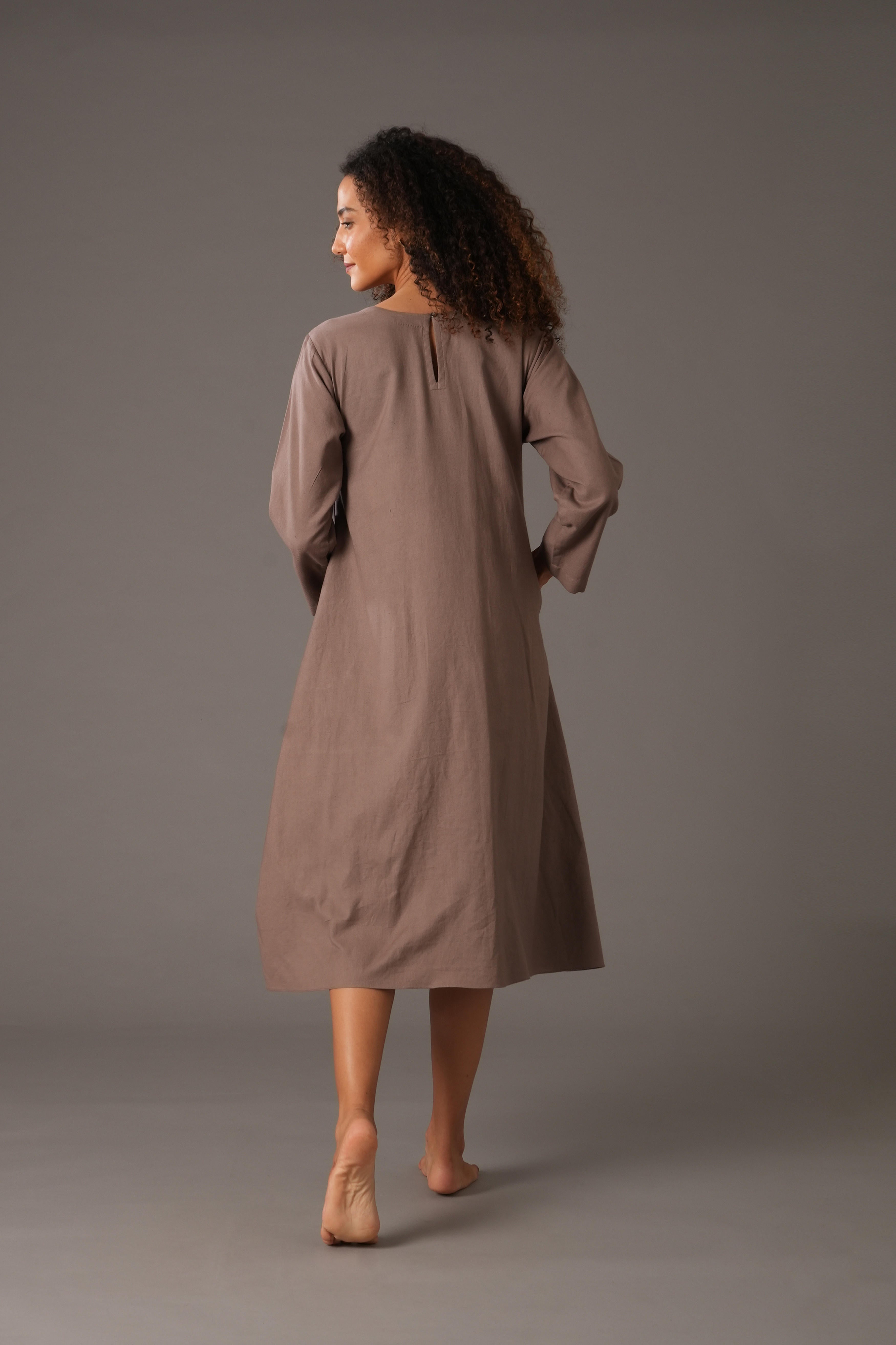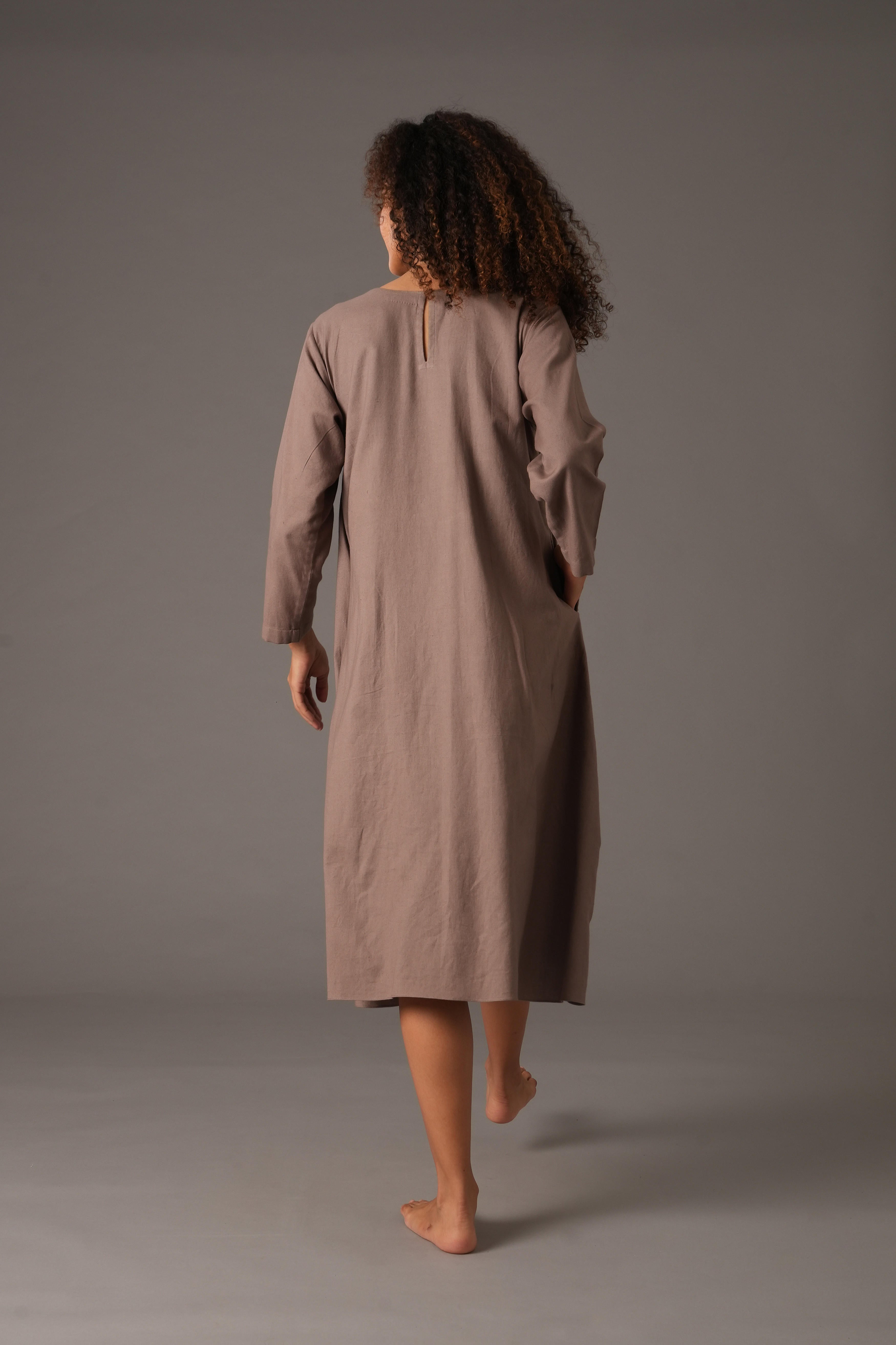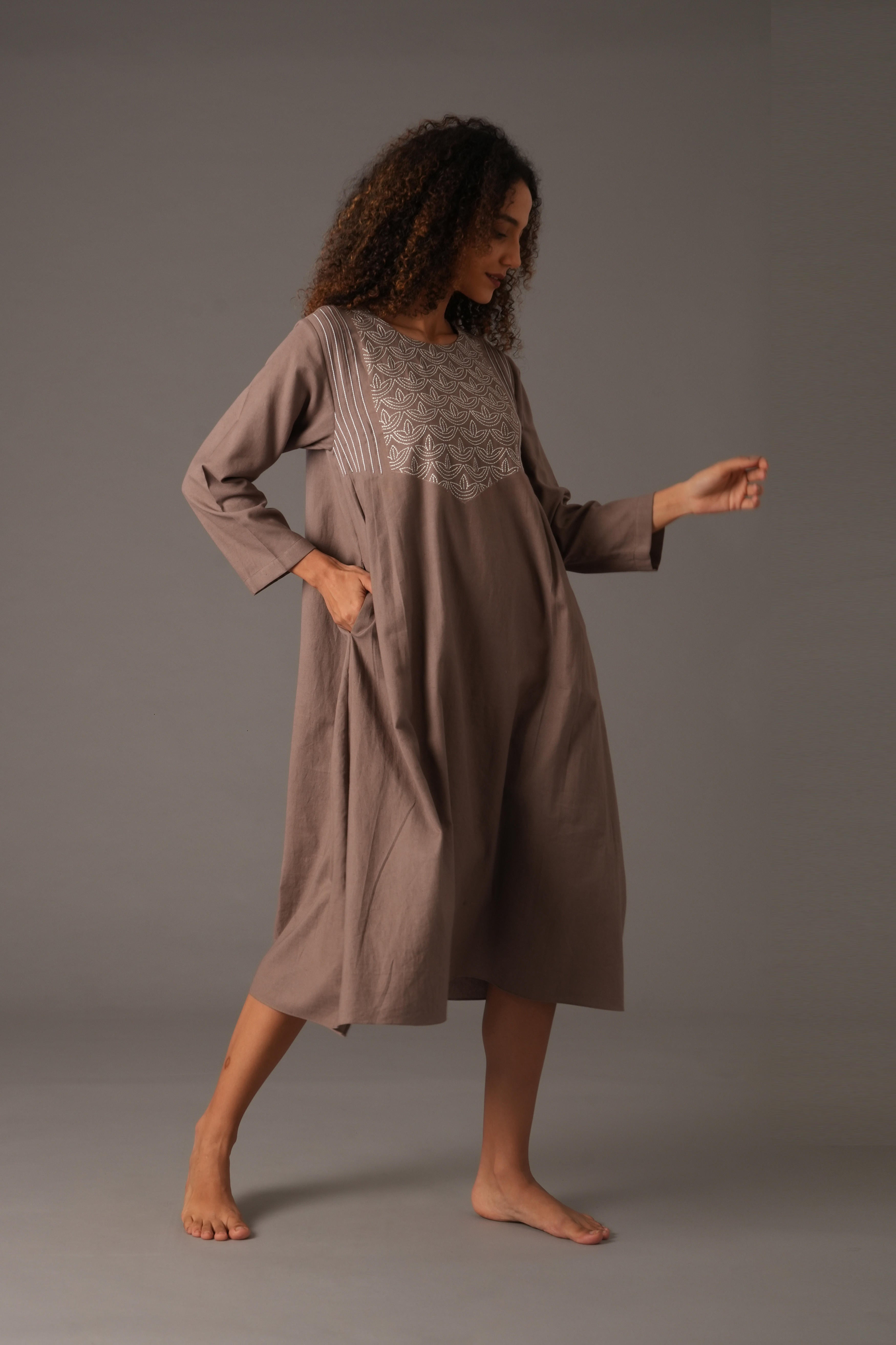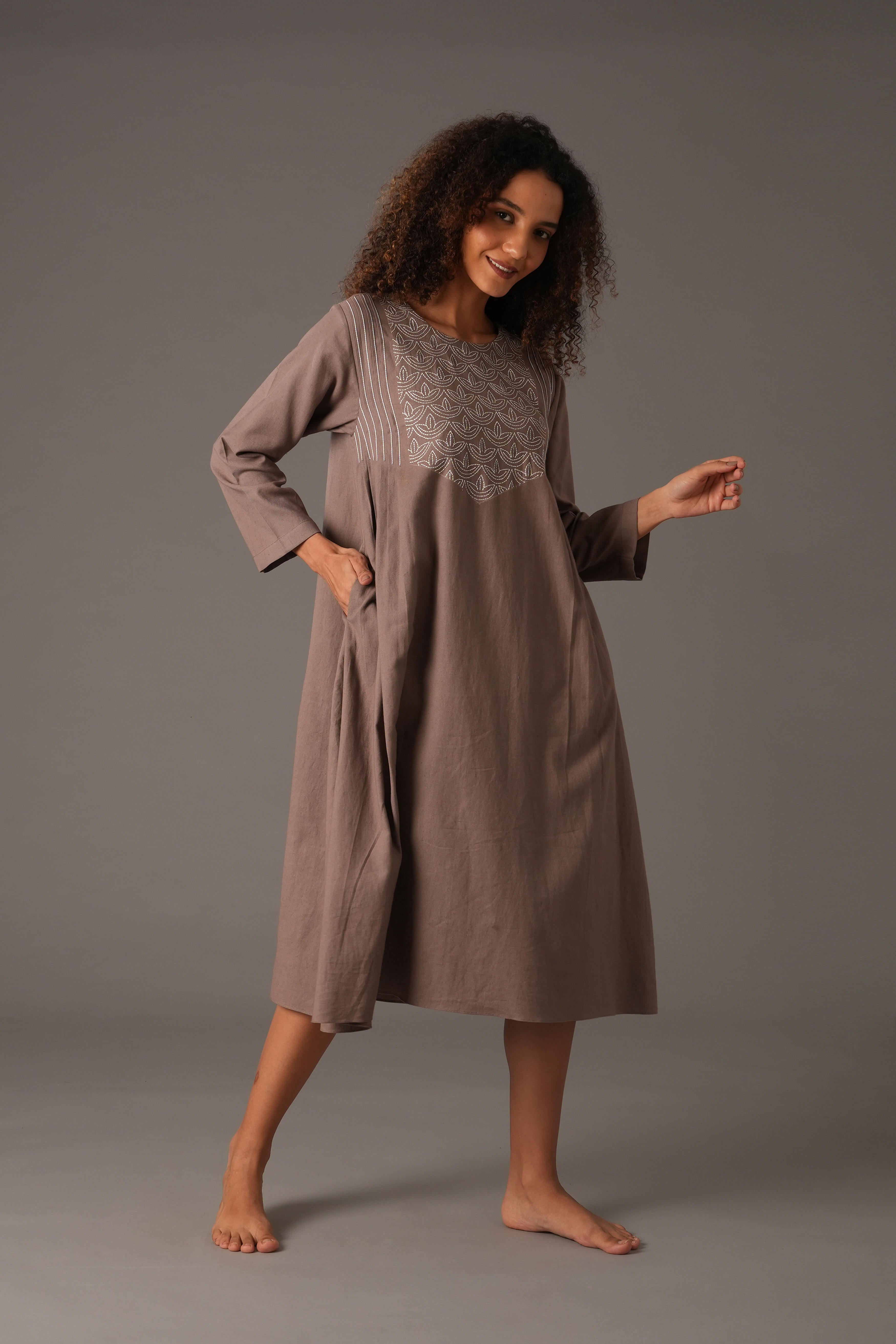 Step into effortless style with this Handwoven Cotton dress, crafted for a blend of comfort and elegance. Featuring a rich shade of taupe, this dress showcases timeless craftsmanship and a refined silhouette. With a length of 44 inches and 19-inch long sleeves, this dress offers a perfect fit. The round neck and pintuck detailing in the front provide a sophisticated touch, while the deep embroidery covers the full body, adding intricate beauty to the design. Designed for ease and functionality, the dress includes inseam pockets and gathers under the armhole for a flattering, flowy fit. Its regular fit is ideal for all-day wear, whether you're dressing up for a special occasion or going for a chic everyday look. Our model, standing at 5'8", is wearing a size S.