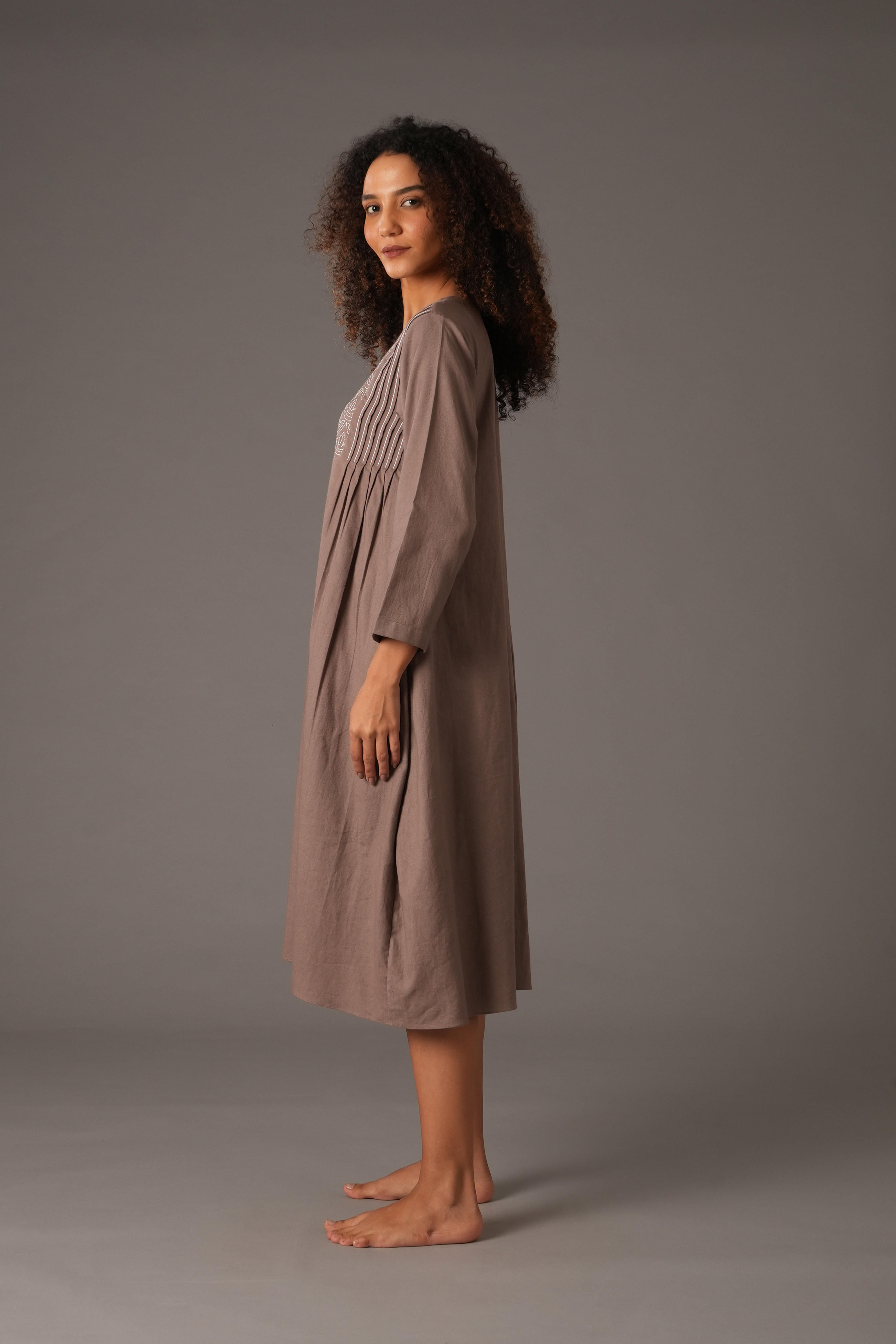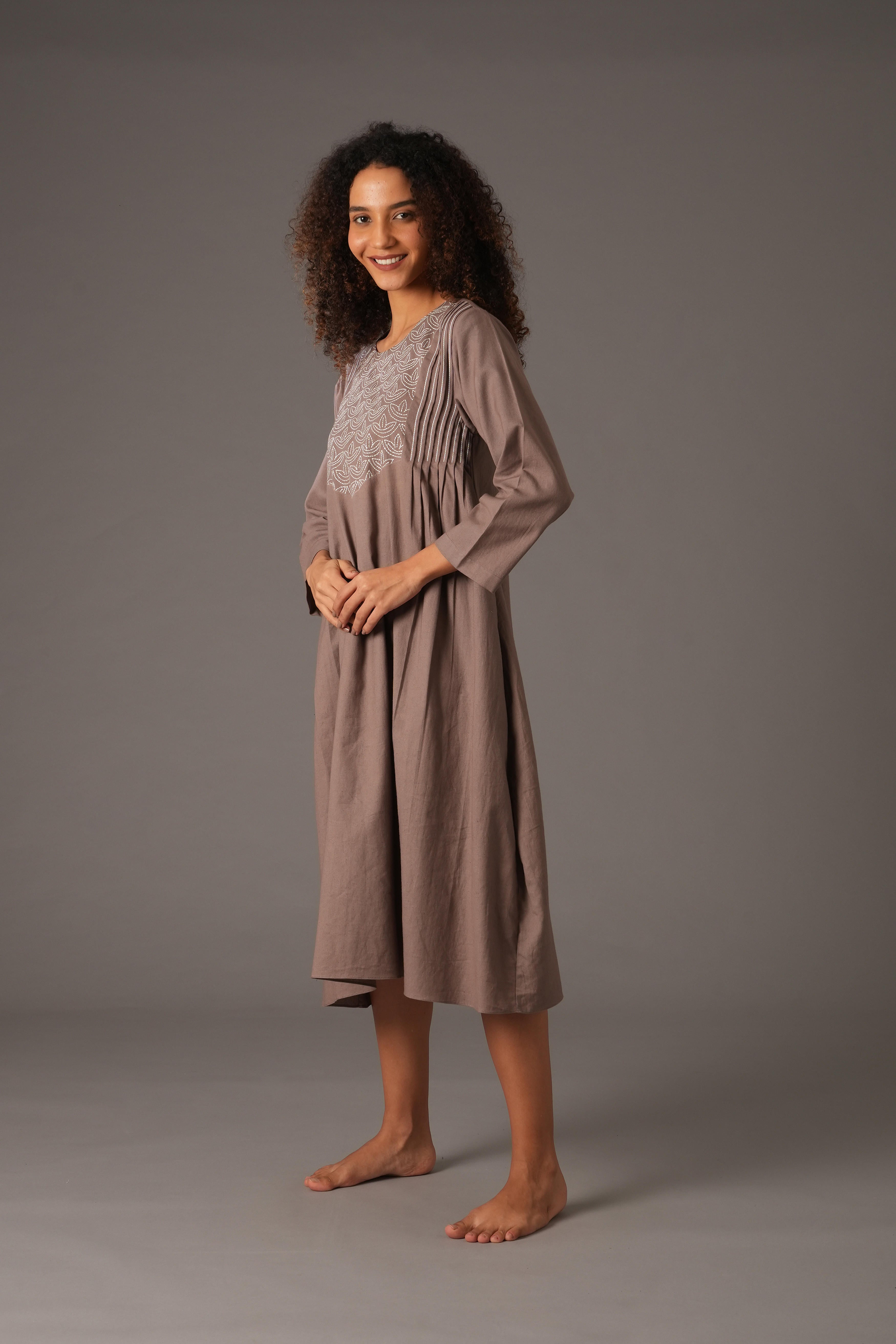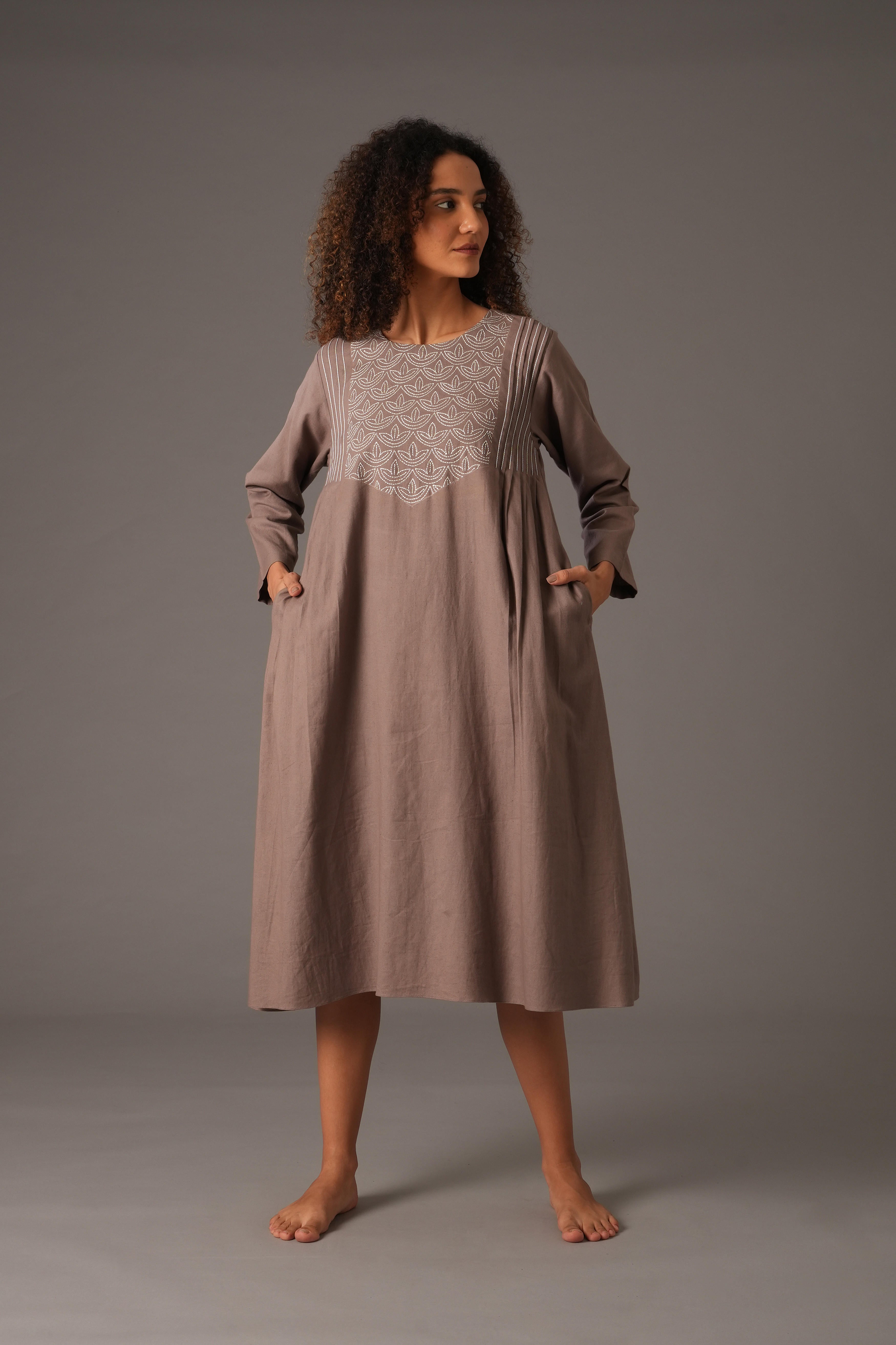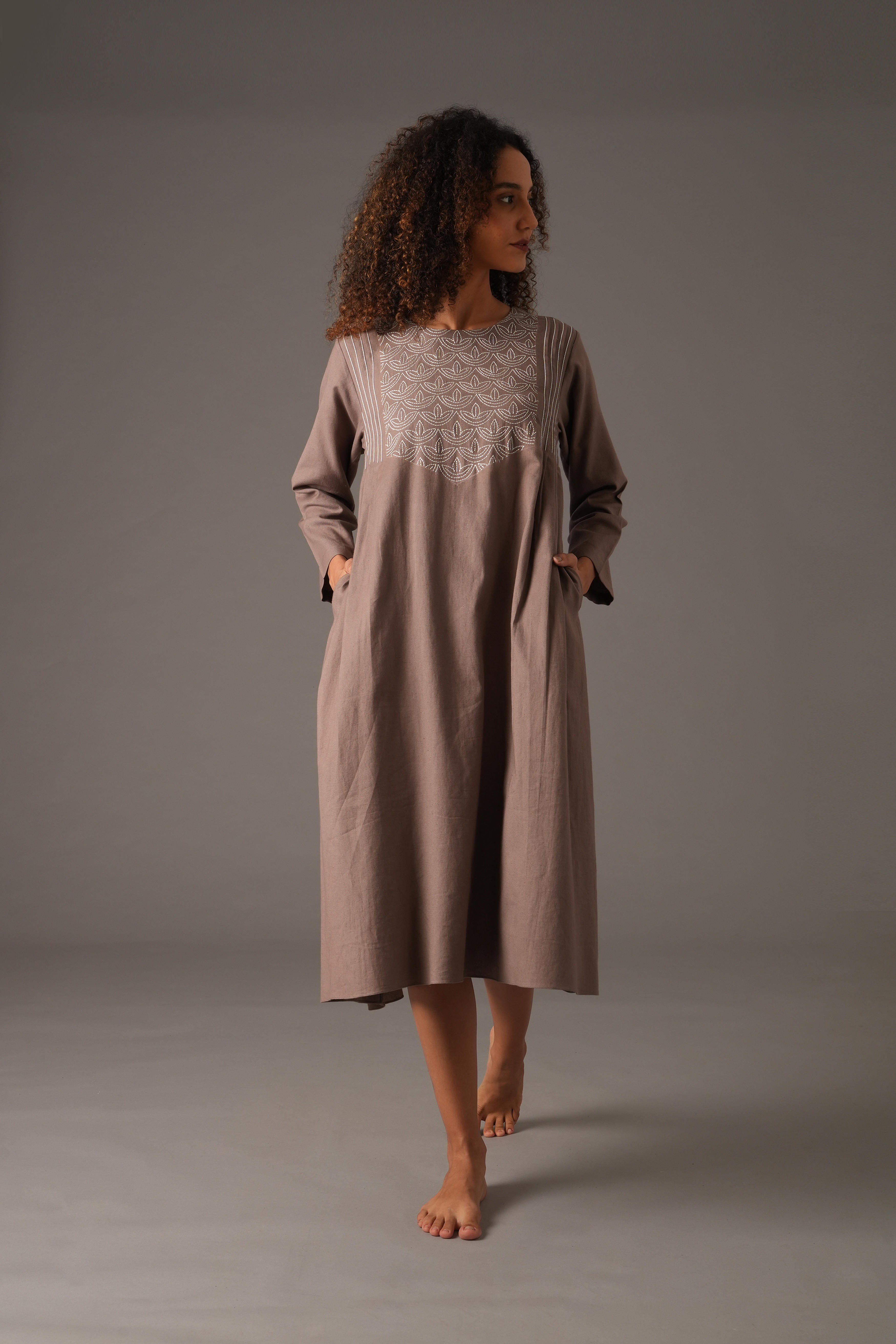 Step into effortless style with this Handwoven Cotton dress, crafted for a blend of comfort and elegance. Featuring a rich shade of taupe, this dress showcases timeless craftsmanship and a refined silhouette. With a length of 44 inches and 19-inch long sleeves, this dress offers a perfect fit. The round neck and pintuck detailing in the front provide a sophisticated touch, while the deep embroidery covers the full body, adding intricate beauty to the design. Designed for ease and functionality, the dress includes inseam pockets and gathers under the armhole for a flattering, flowy fit. Its regular fit is ideal for all-day wear, whether you're dressing up for a special occasion or going for a chic everyday look. Our model, standing at 5'8", is wearing a size S.