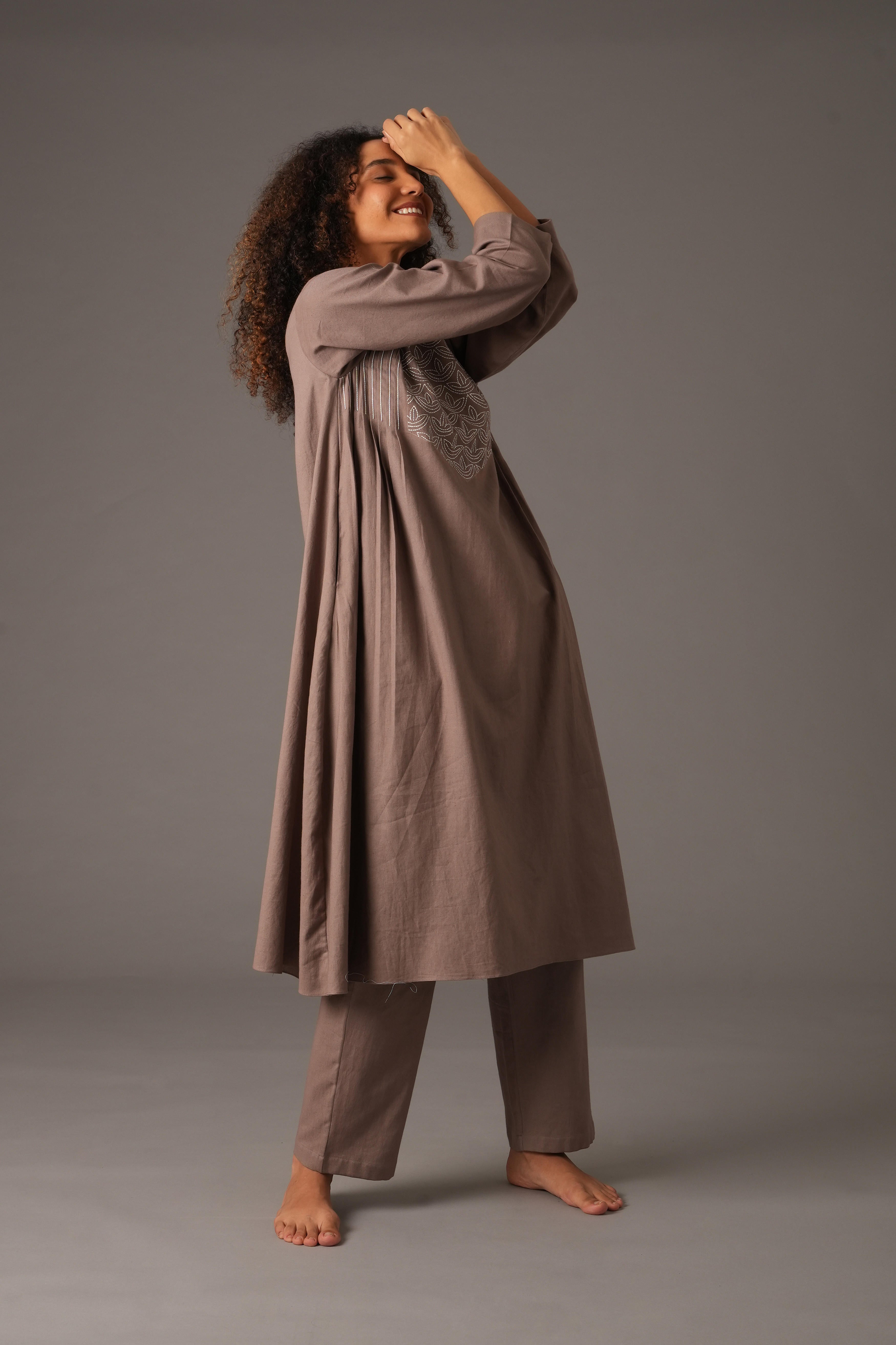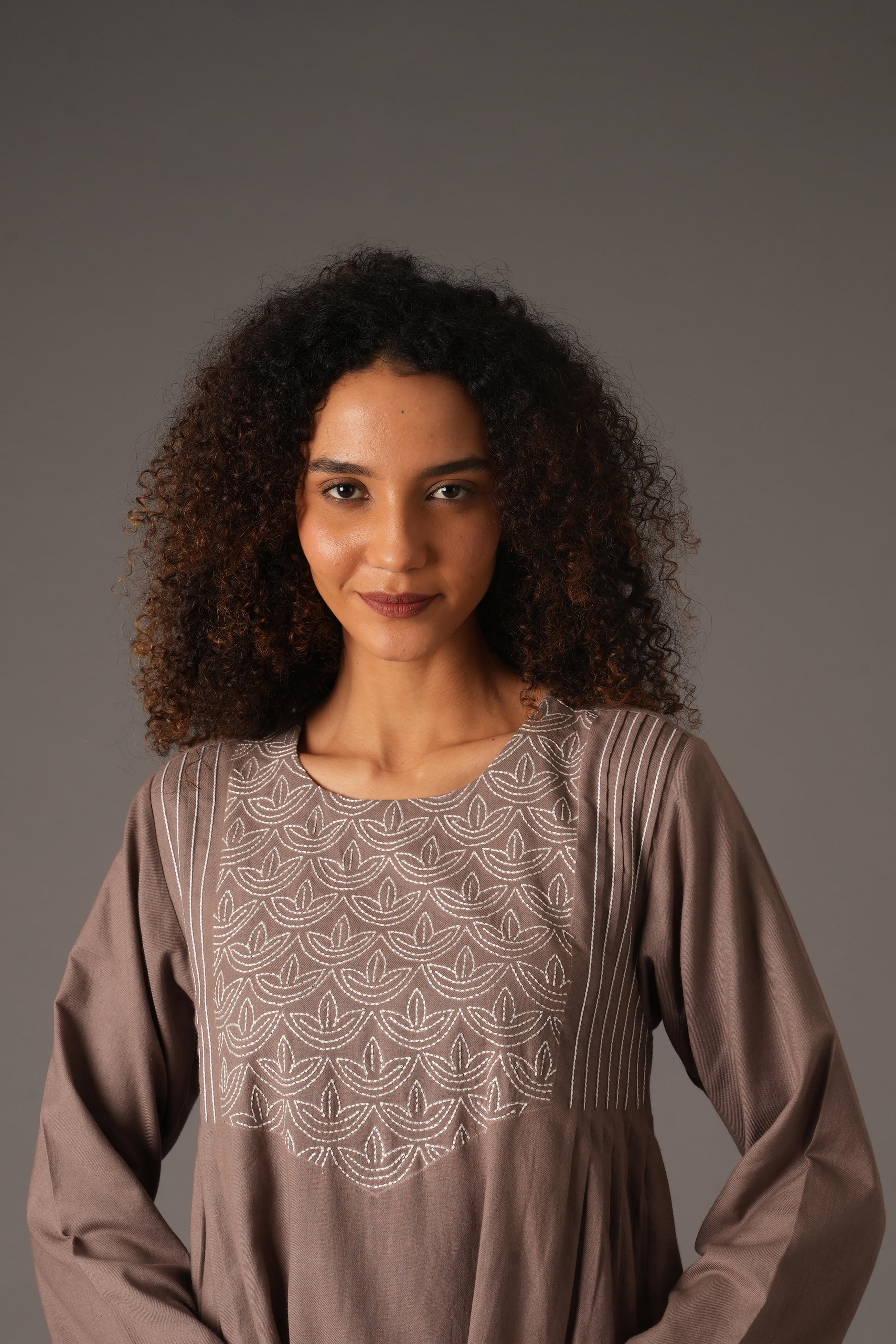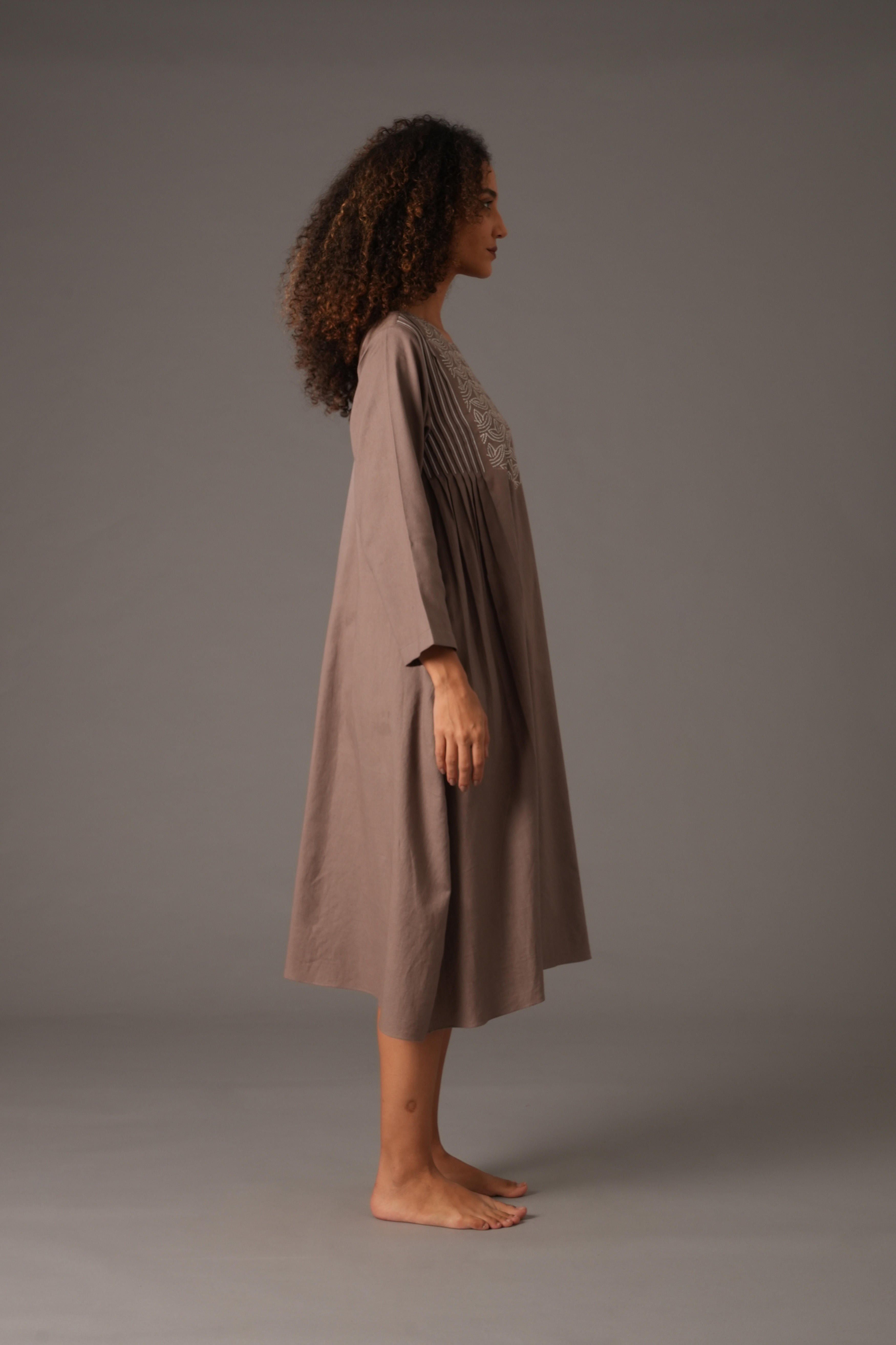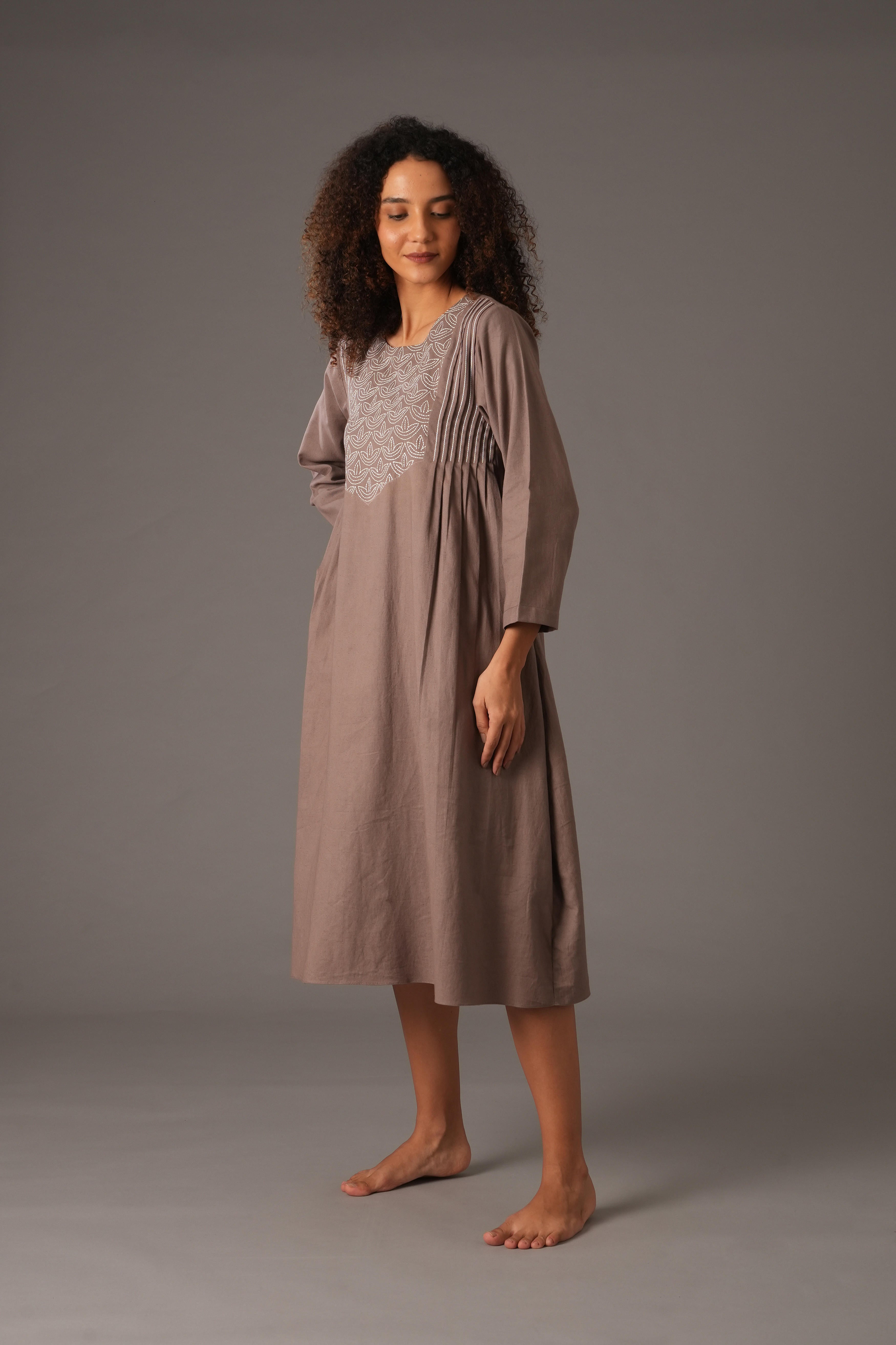 Step into effortless style with this Handwoven Cotton dress, crafted for a blend of comfort and elegance. Featuring a rich shade of taupe, this dress showcases timeless craftsmanship and a refined silhouette. With a length of 44 inches and 19-inch long sleeves, this dress offers a perfect fit. The round neck and pintuck detailing in the front provide a sophisticated touch, while the deep embroidery covers the full body, adding intricate beauty to the design. Designed for ease and functionality, the dress includes inseam pockets and gathers under the armhole for a flattering, flowy fit. Its regular fit is ideal for all-day wear, whether you're dressing up for a special occasion or going for a chic everyday look. Our model, standing at 5'8", is wearing a size S.