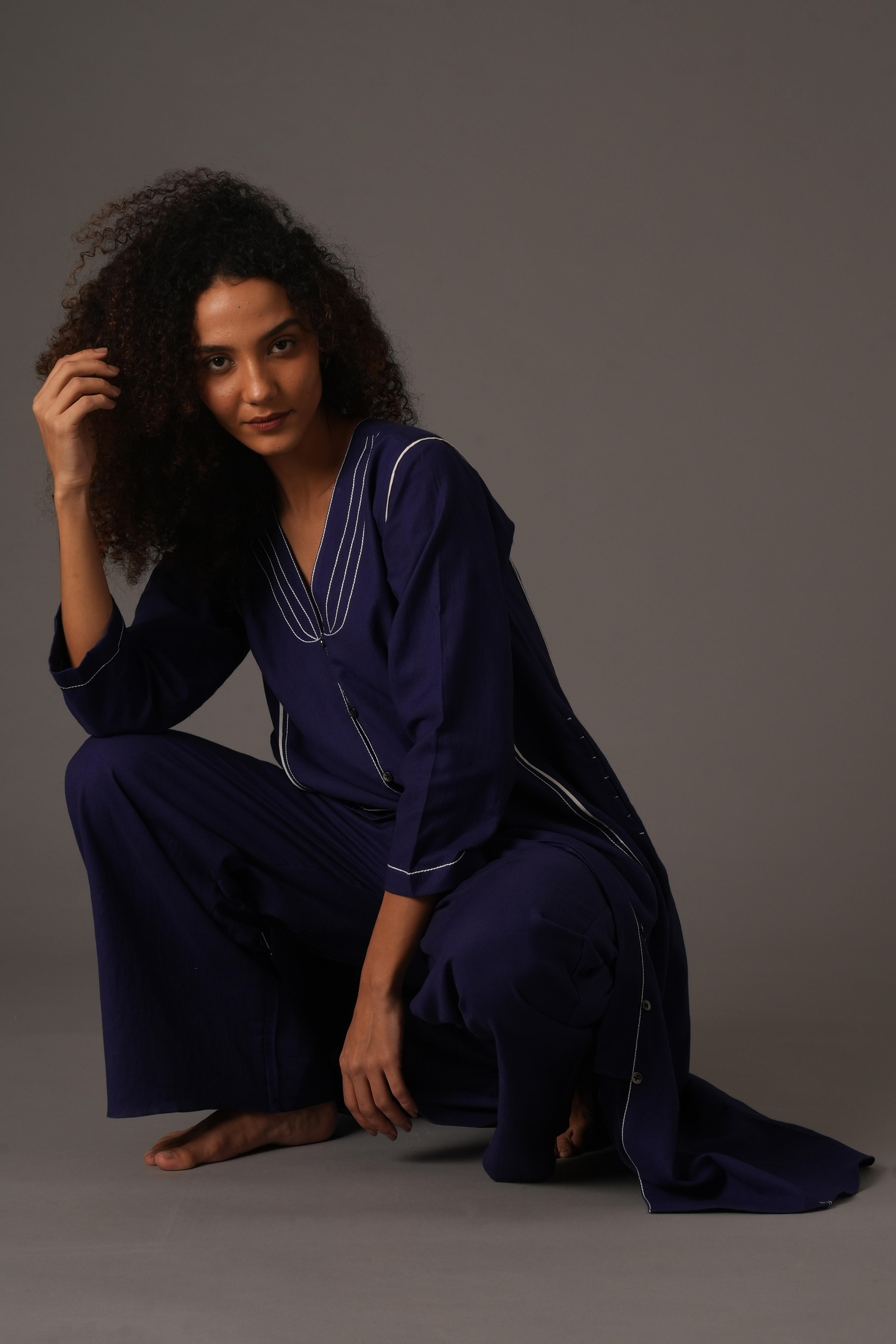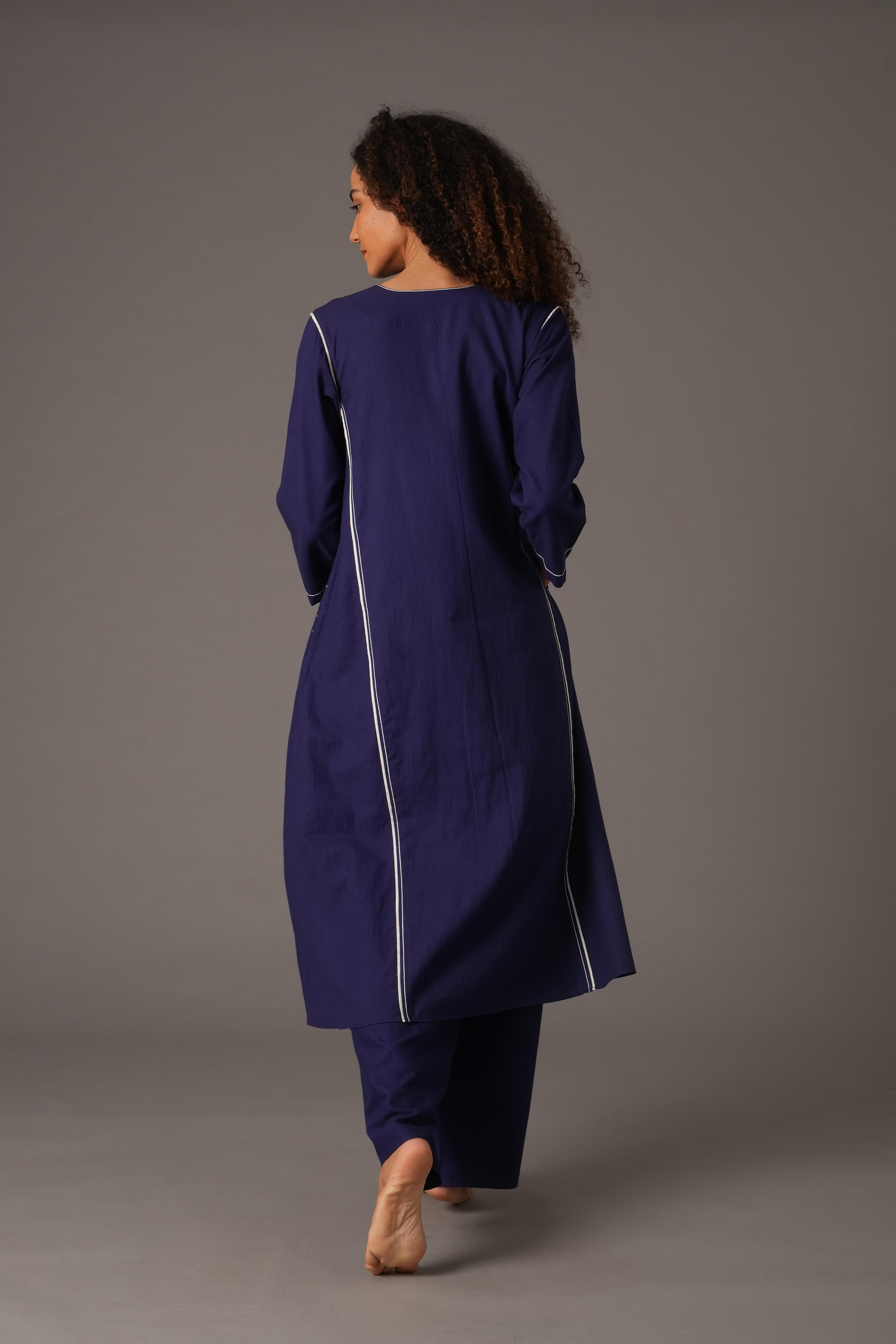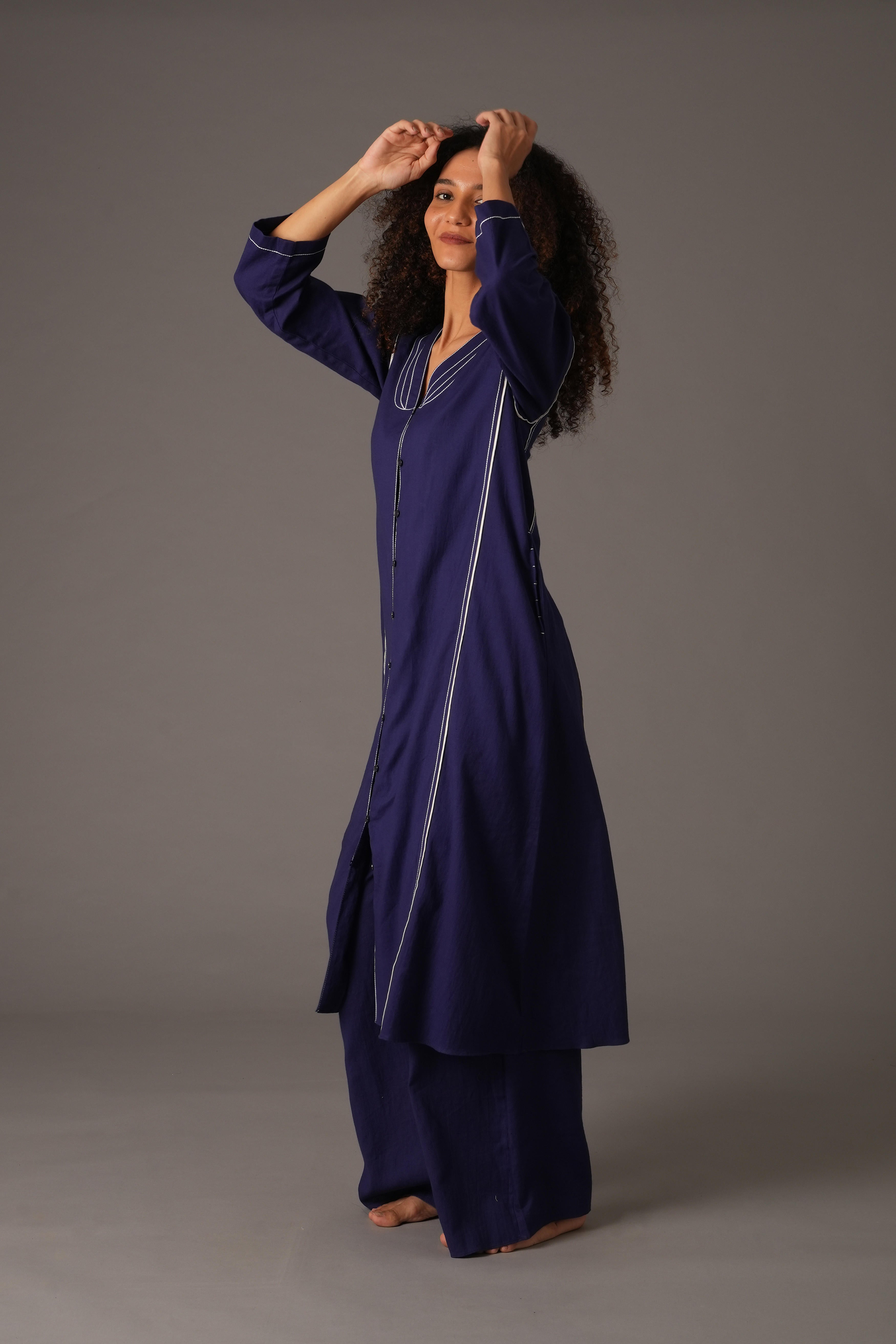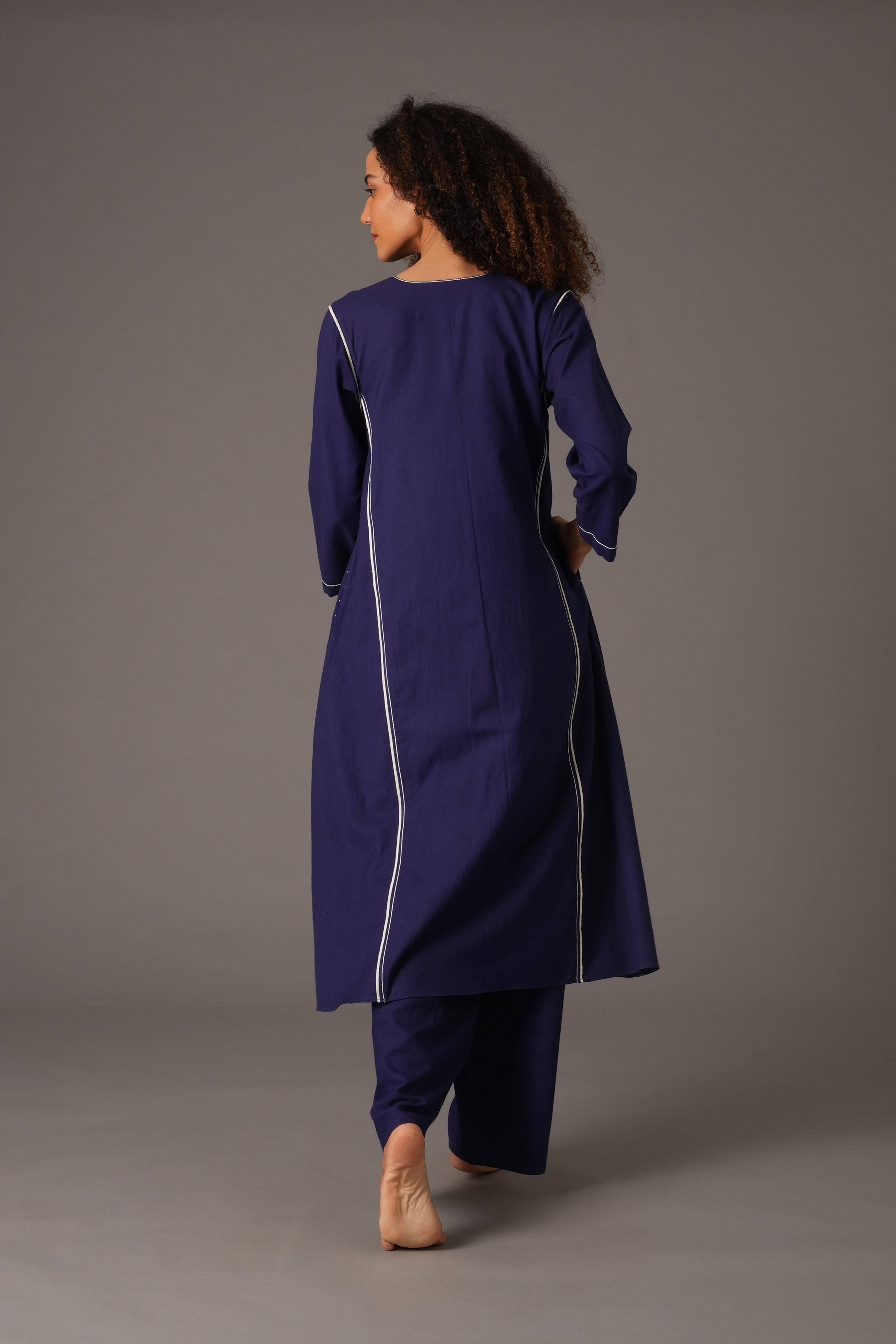 This elegant Handwoven Cotton set includes 2 pieces: Dress and pants in a beautiful Blue colour. The dress features a full length of 44 inches, a 7-inch deep neck, and 16-inch long sleeves. The pants have a 38-inch length, 26-inch waist, and 18-inch mohri, with a full elasticated waist for comfort. Our model, standing 5'8", is wearing a size S.