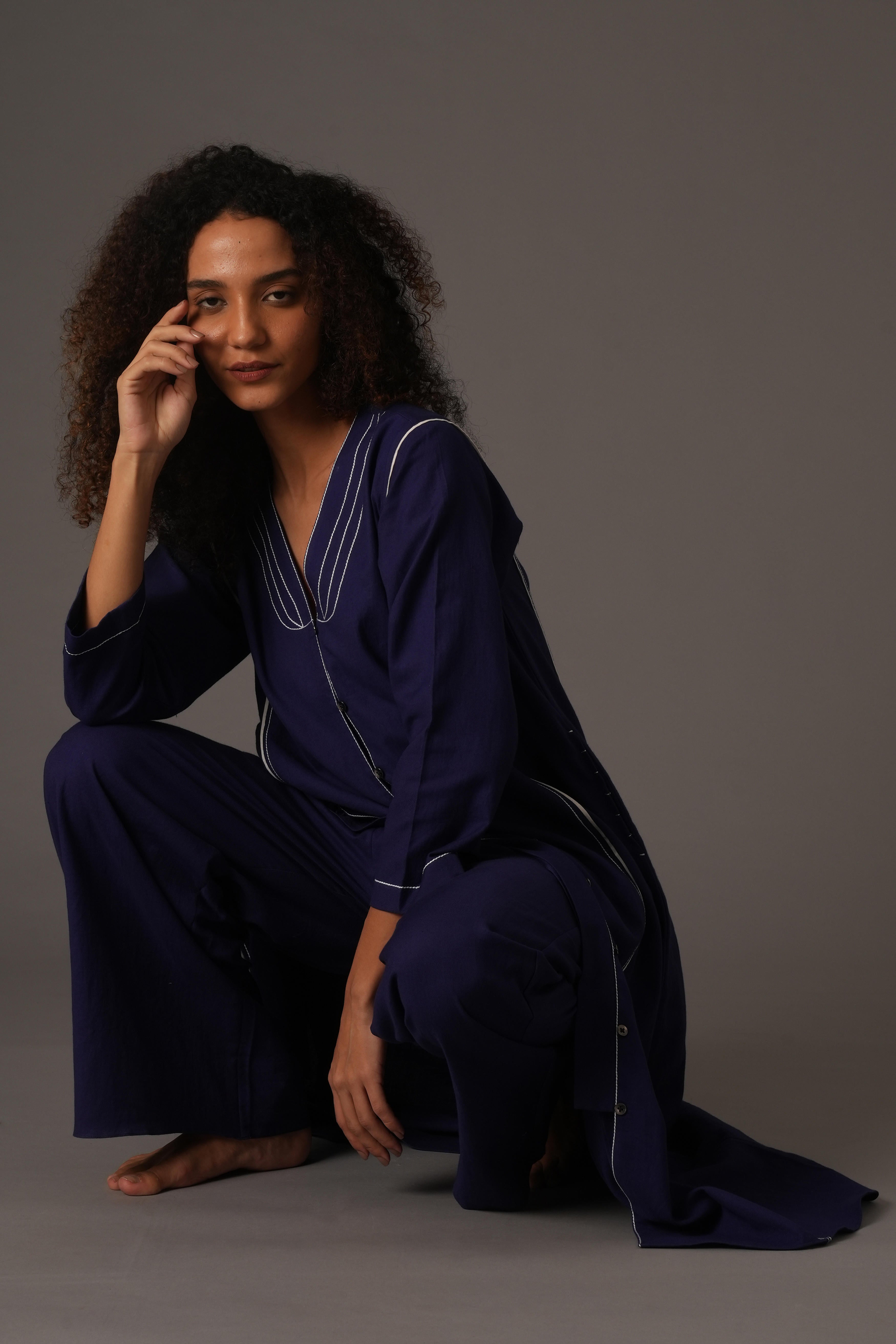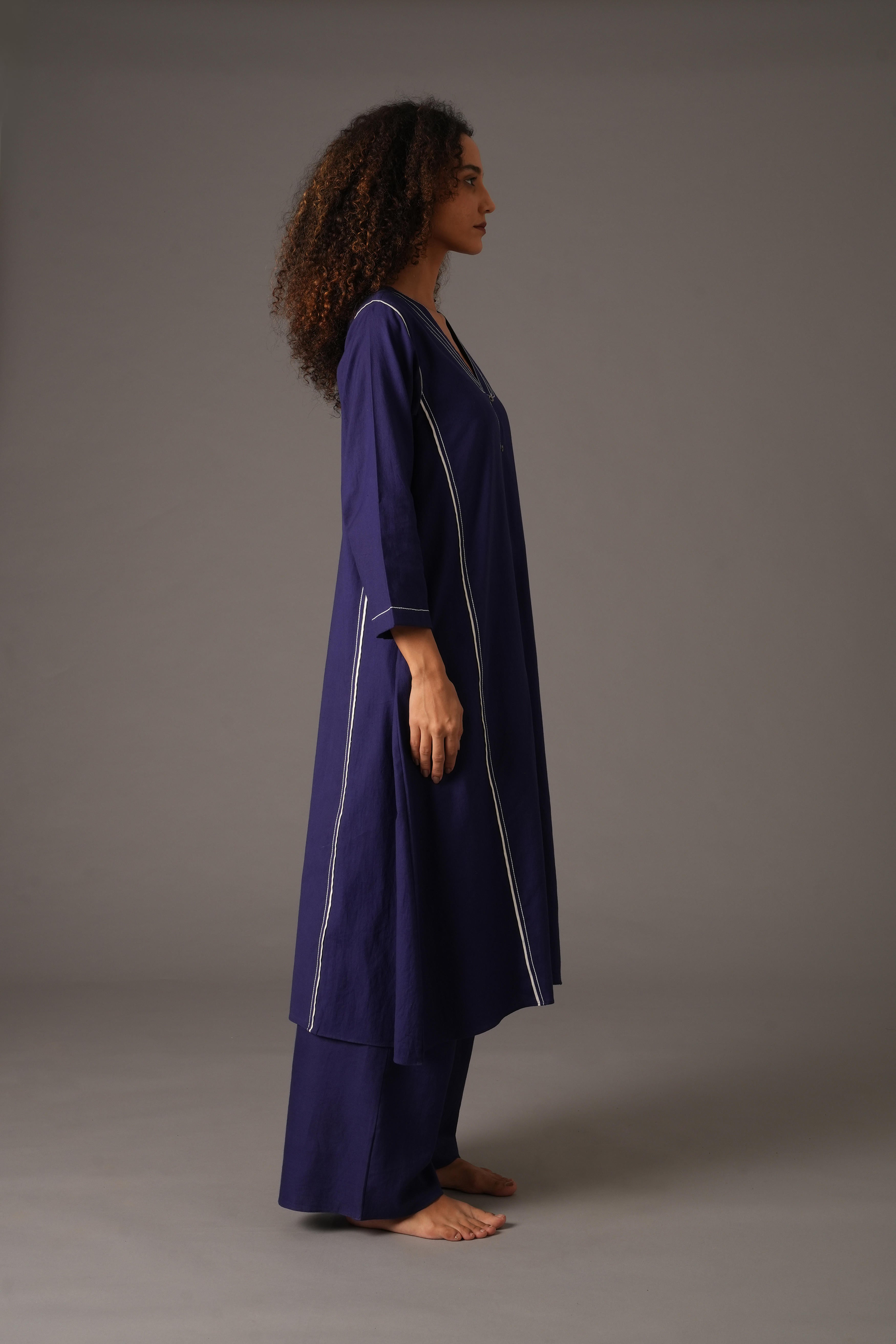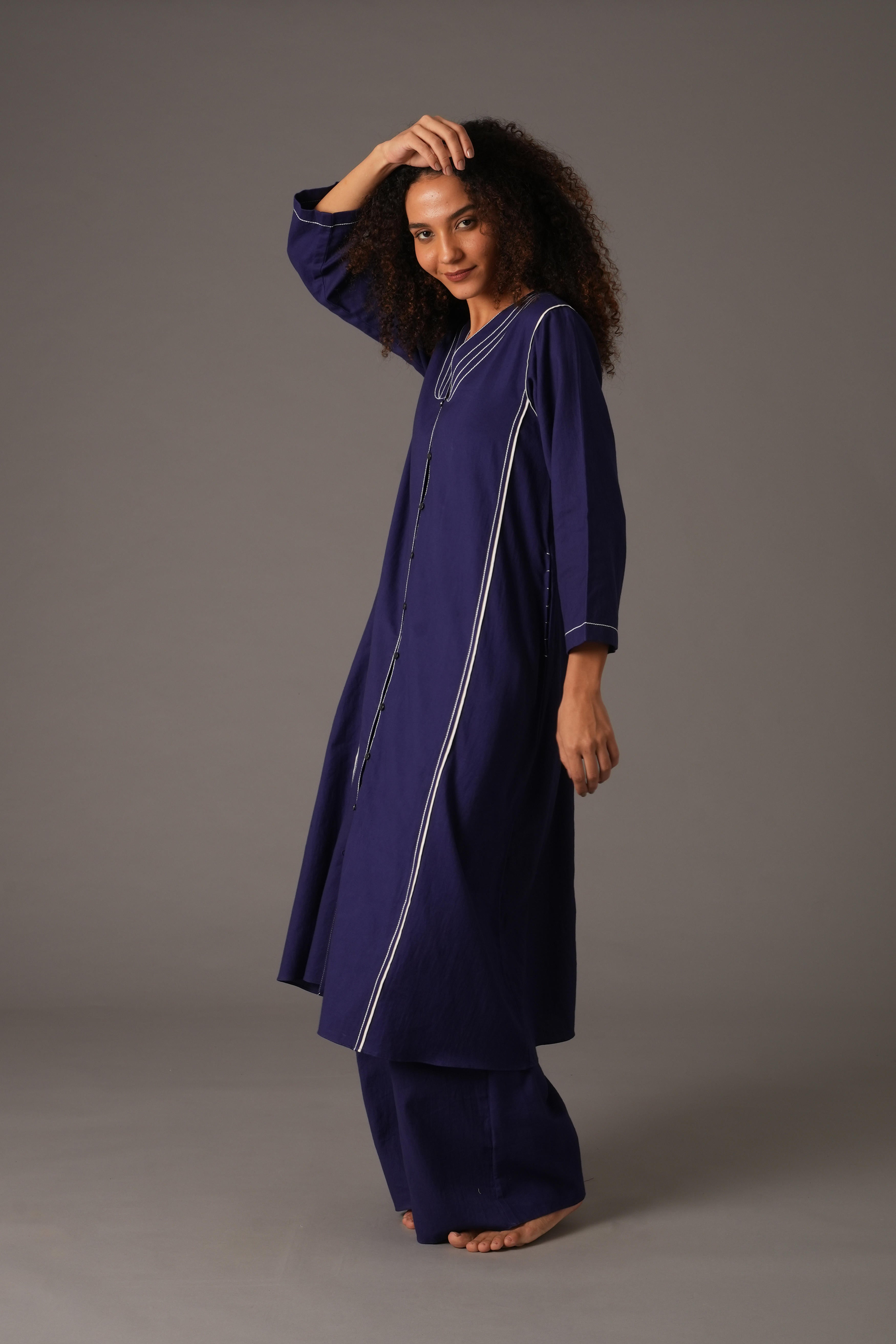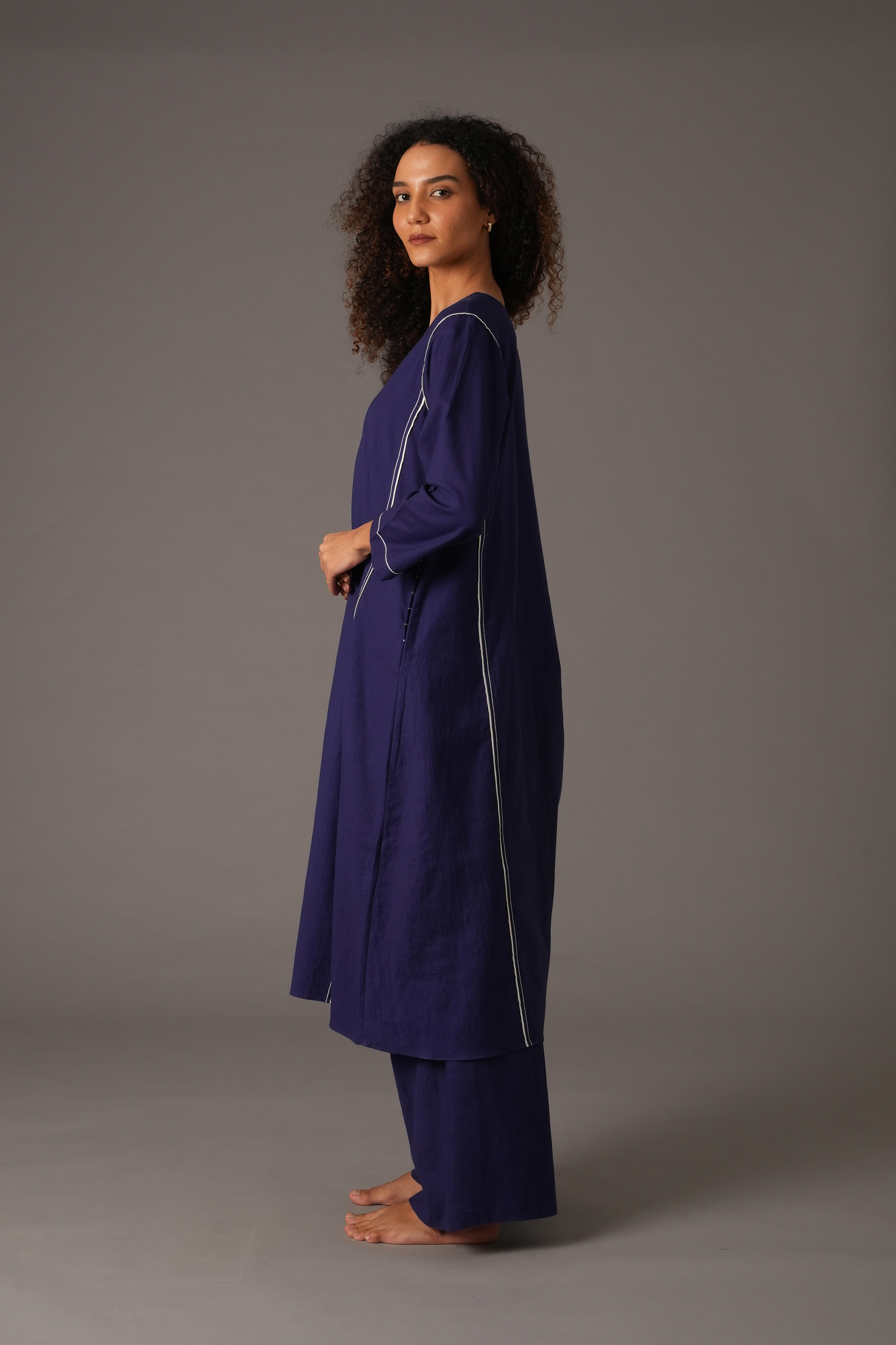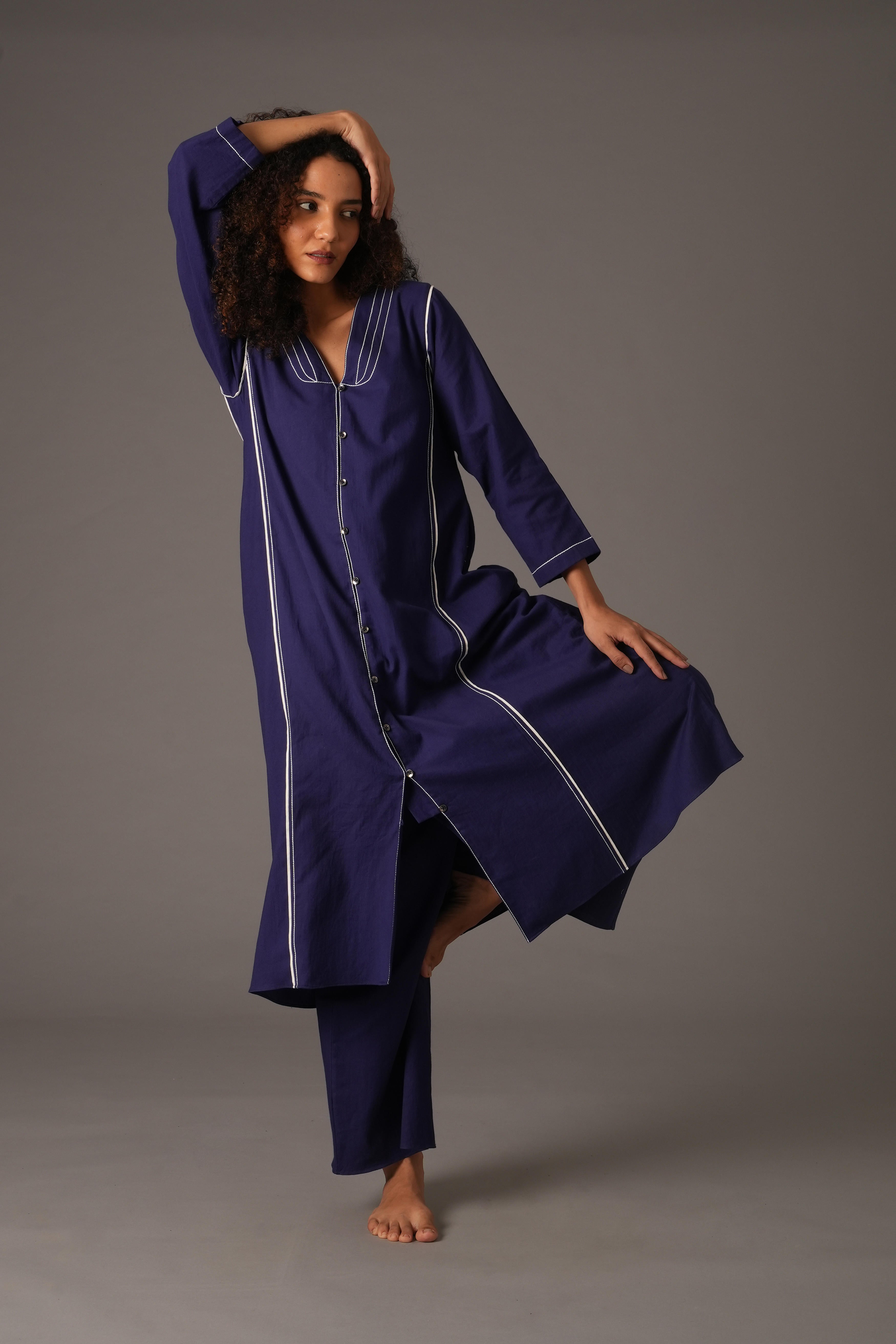 This elegant Handwoven Cotton set includes 2 pieces: Dress and pants in a beautiful Blue colour. The dress features a full length of 44 inches, a 7-inch deep neck, and 16-inch long sleeves. The pants have a 38-inch length, 26-inch waist, and 18-inch mohri, with a full elasticated waist for comfort. Our model, standing 5'8", is wearing a size S.