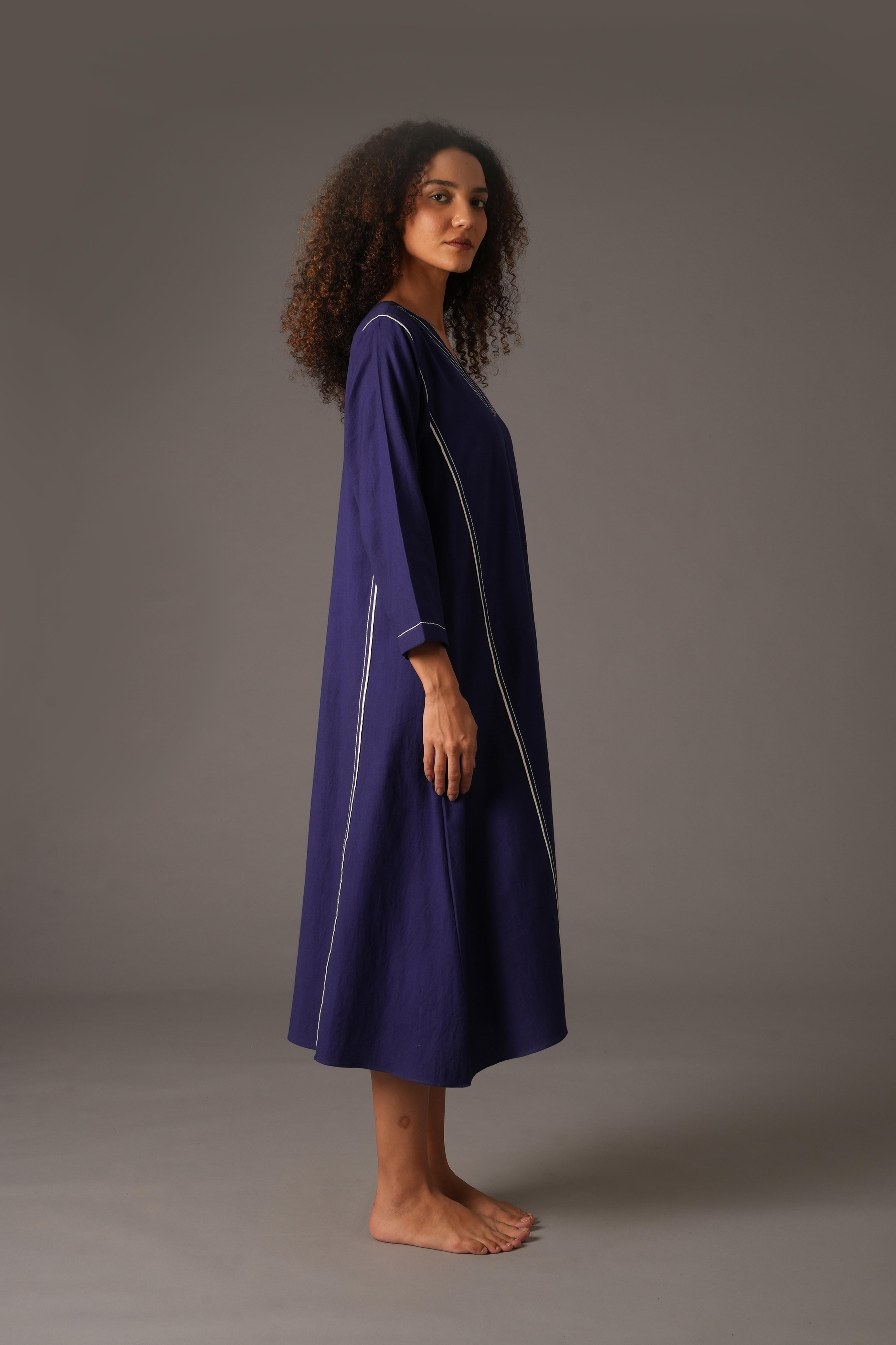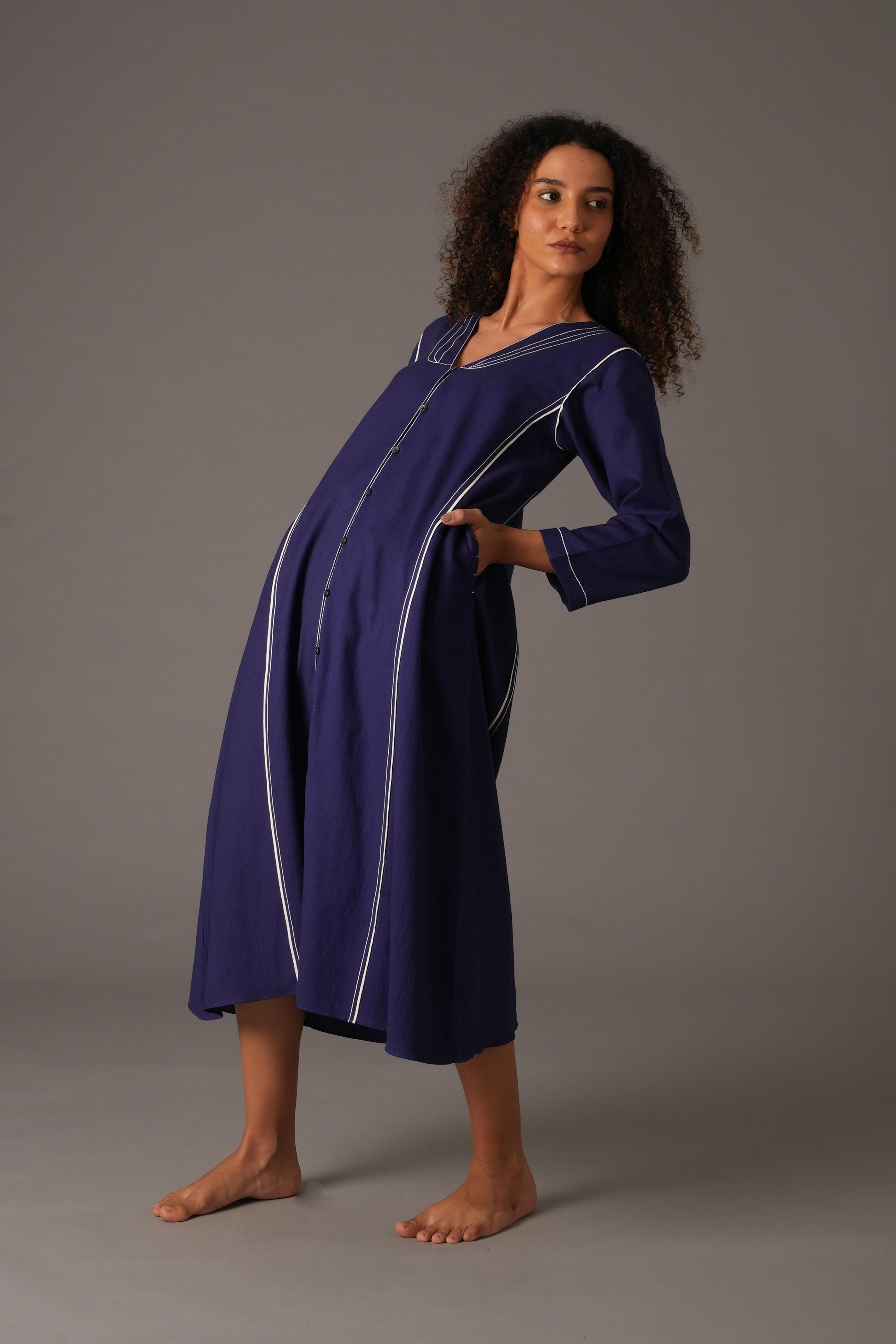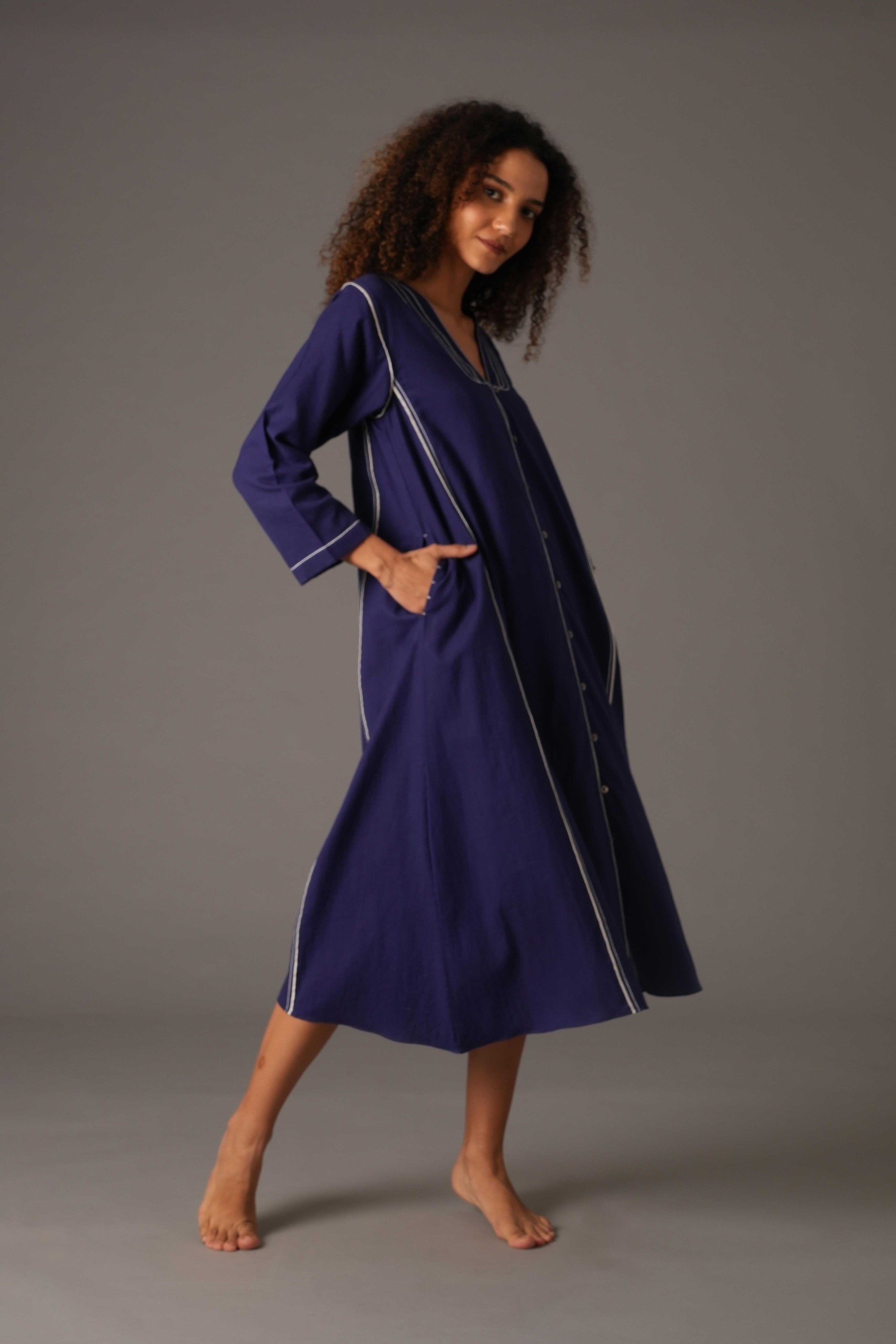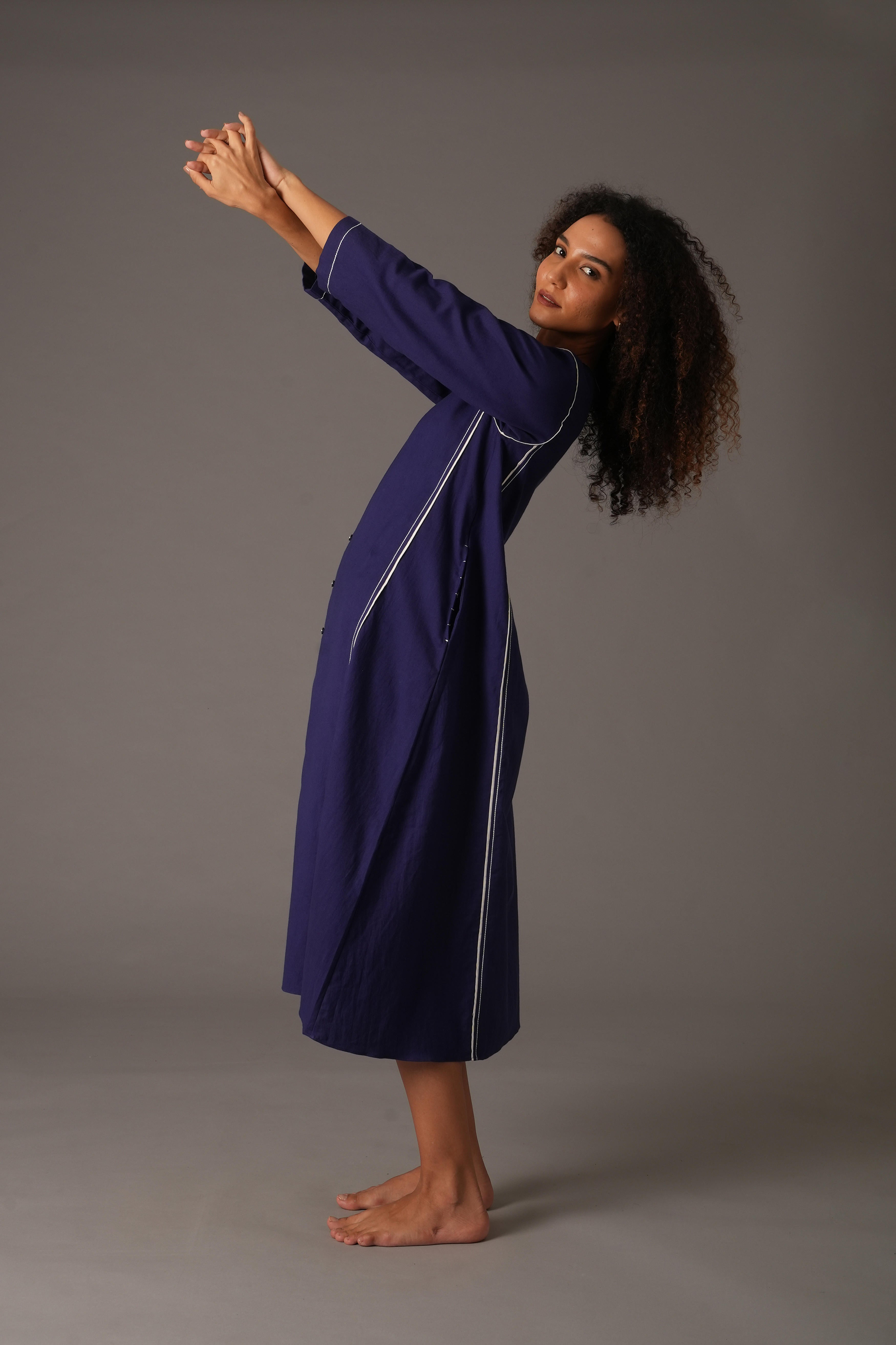 This elegant Handwoven Cotton Dress is in a stunning Blue hue. The dress features a full length of 44 inches, a 7-inch deep neck, and 16-inch long sleeves for a graceful silhouette. Our model, standing 5'8", is wearing a size S.
