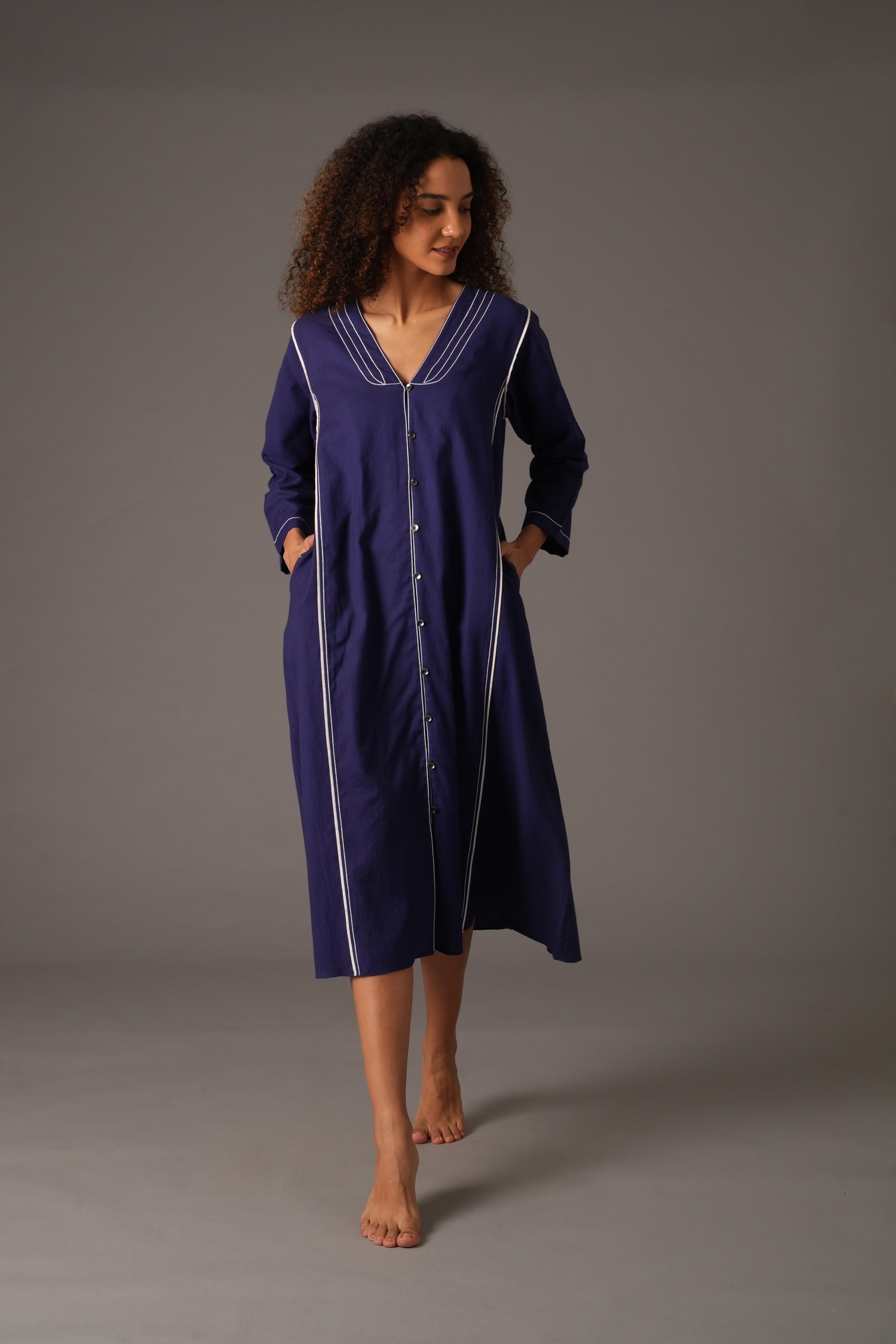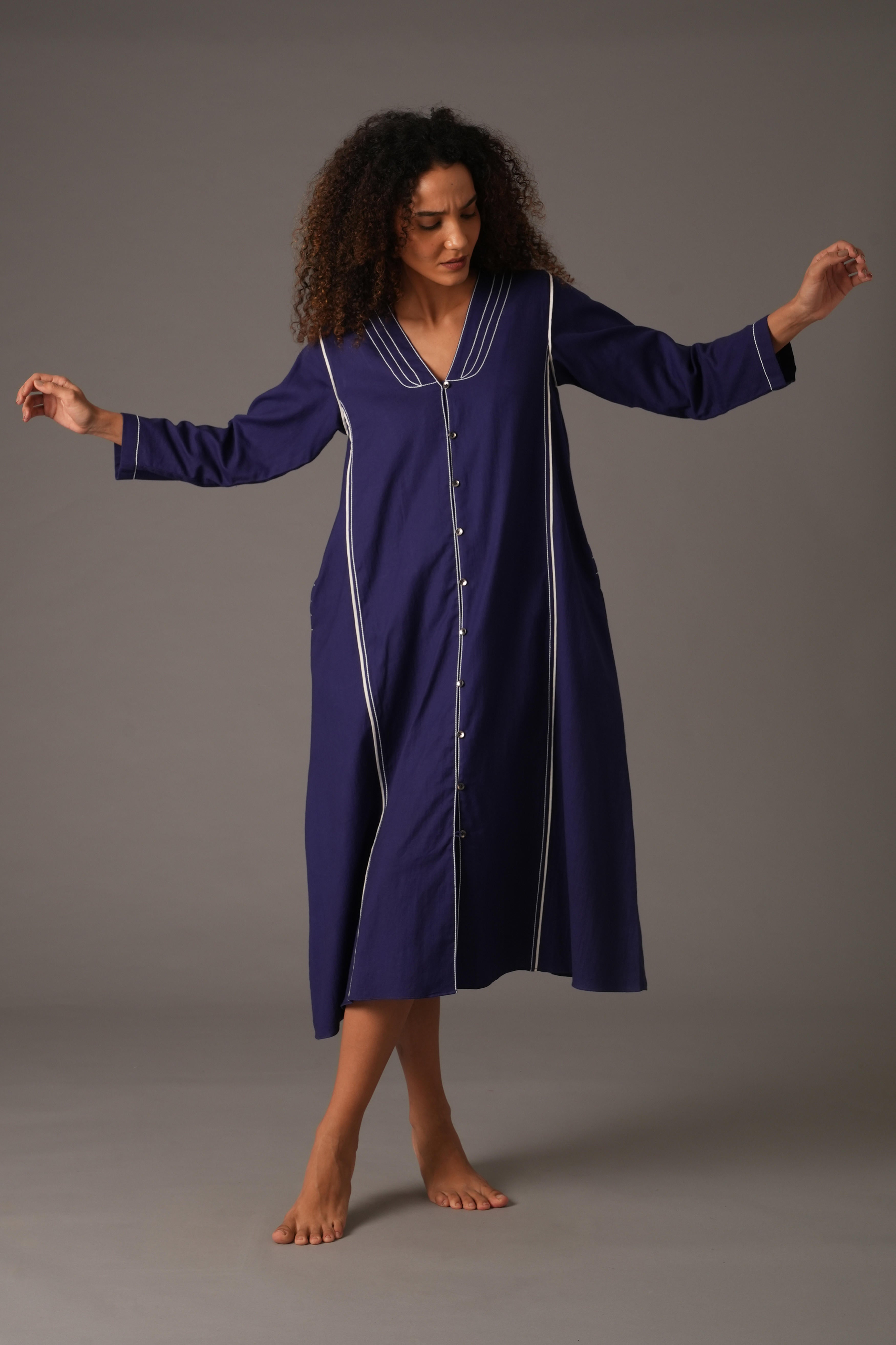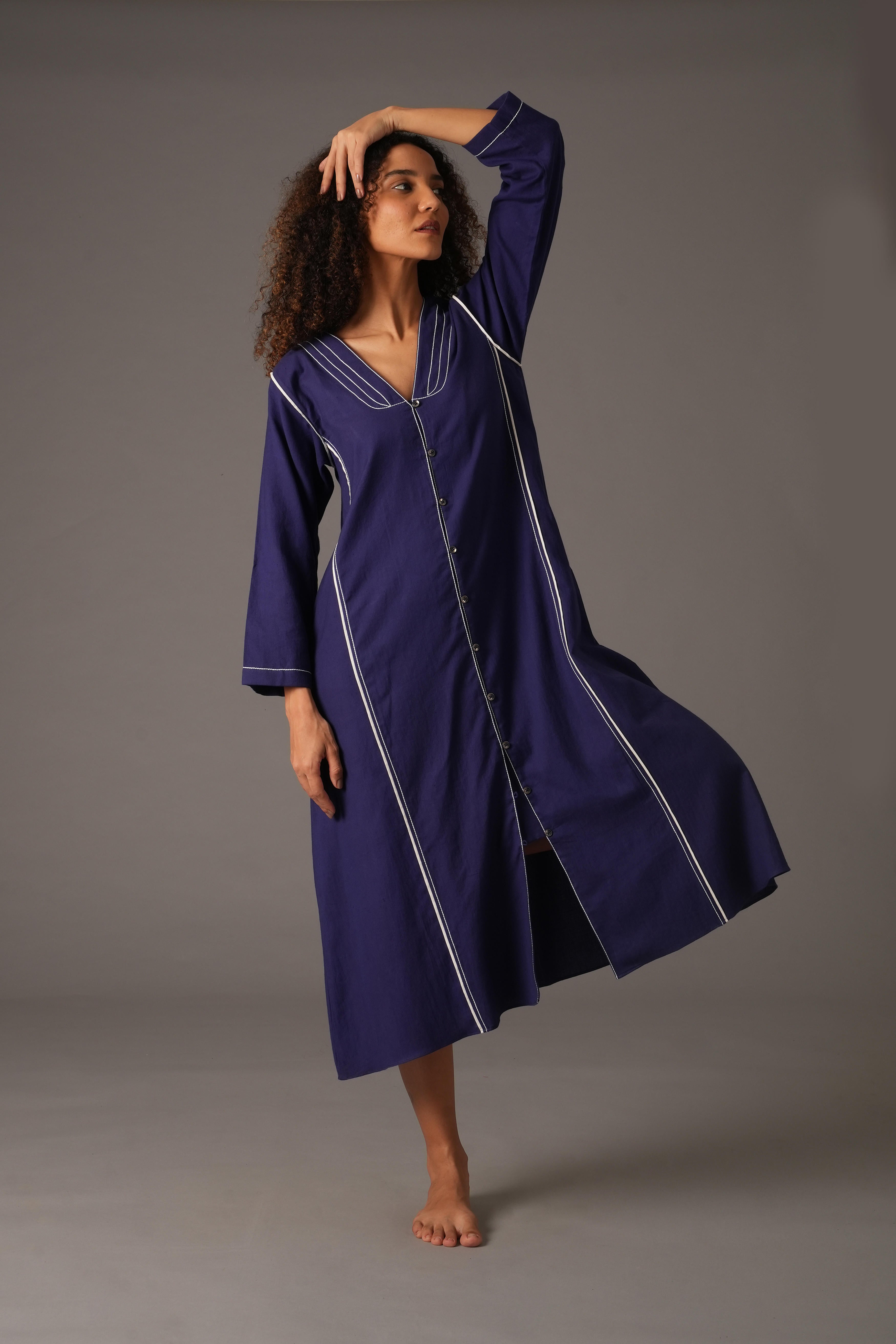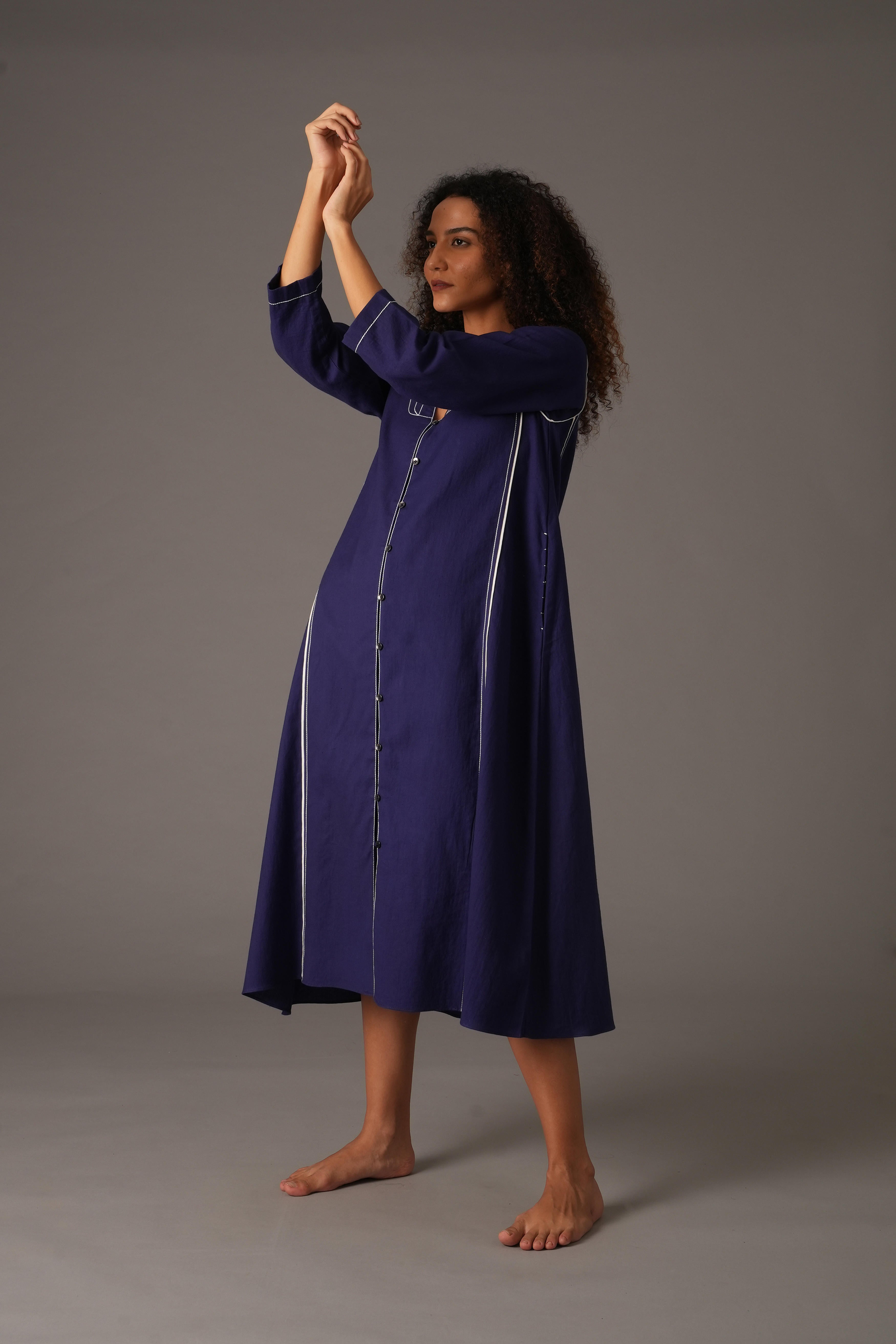 This elegant Handwoven Cotton Dress is in a stunning Blue hue. The dress features a full length of 44 inches, a 7-inch deep neck, and 16-inch long sleeves for a graceful silhouette. Our model, standing 5'8", is wearing a size S.