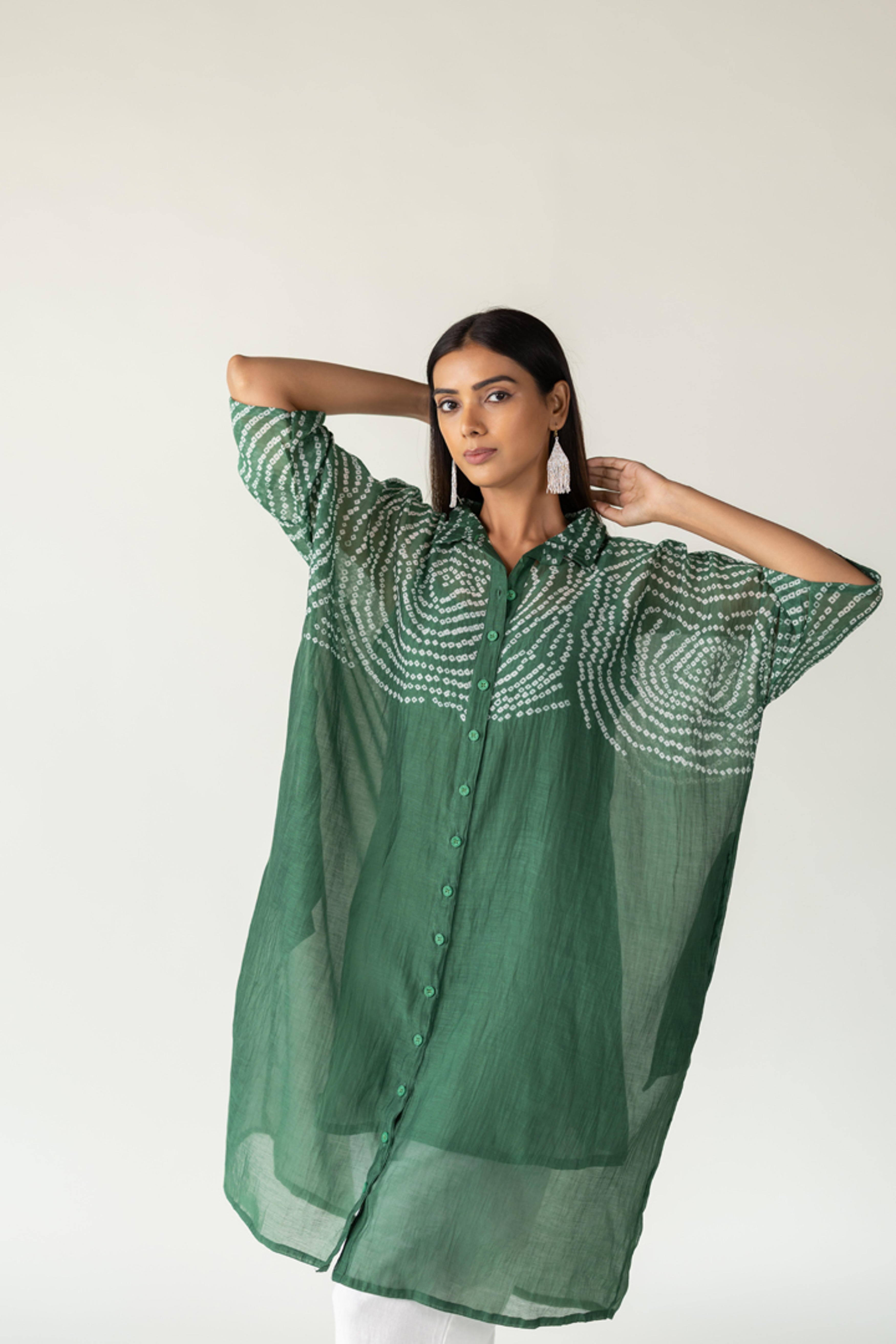 Step into serene style with Emerald Swirl Bandhani Tunic, a fresh interpretation of timeless craftsmanship. Featuring intricate hand-tied bandhani in circular patterns across the shoulders and sleeves, this tunic glows in a rich emerald green hue on a breezy, sheer cotton-silk base. The elongated shirt silhouette offers relaxed sophistication, perfect for day-to-evening wear. It comes with a slip. Lengths: Tunic: 40" Slip: 36"