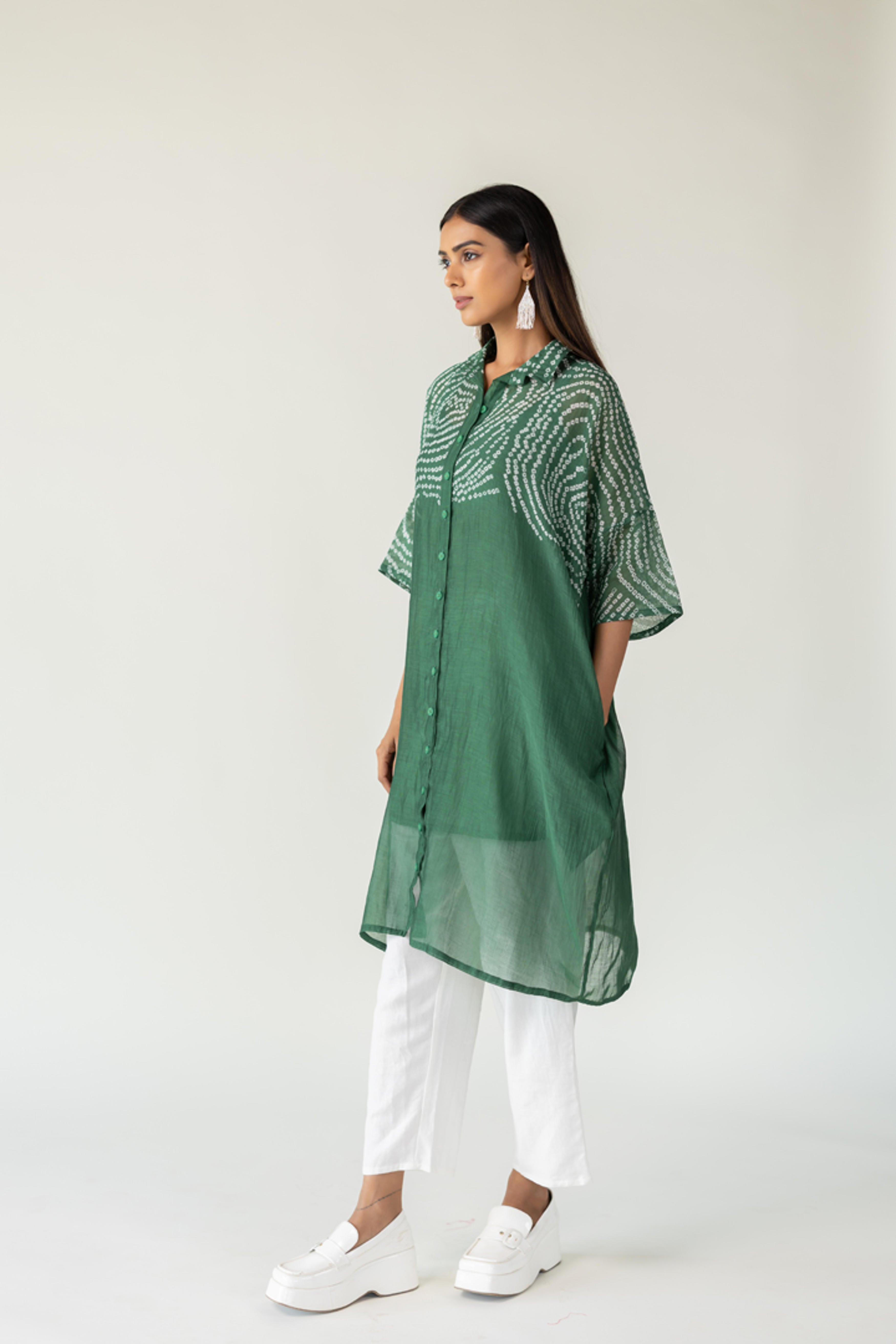 Step into serene style with Emerald Swirl Bandhani Tunic and Pants Set, a fresh interpretation of timeless craftsmanship. Featuring intricate hand-tied bandhani in circular patterns across the shoulders and sleeves, this tunic glows in a rich emerald green hue on a breezy, sheer cotton-silk base. The elongated shirt silhouette offers relaxed sophistication, perfect for day-to-evening wear. It comes with a slip. Lengths: Tunic: 40" Pants: 30" Slip: 36"