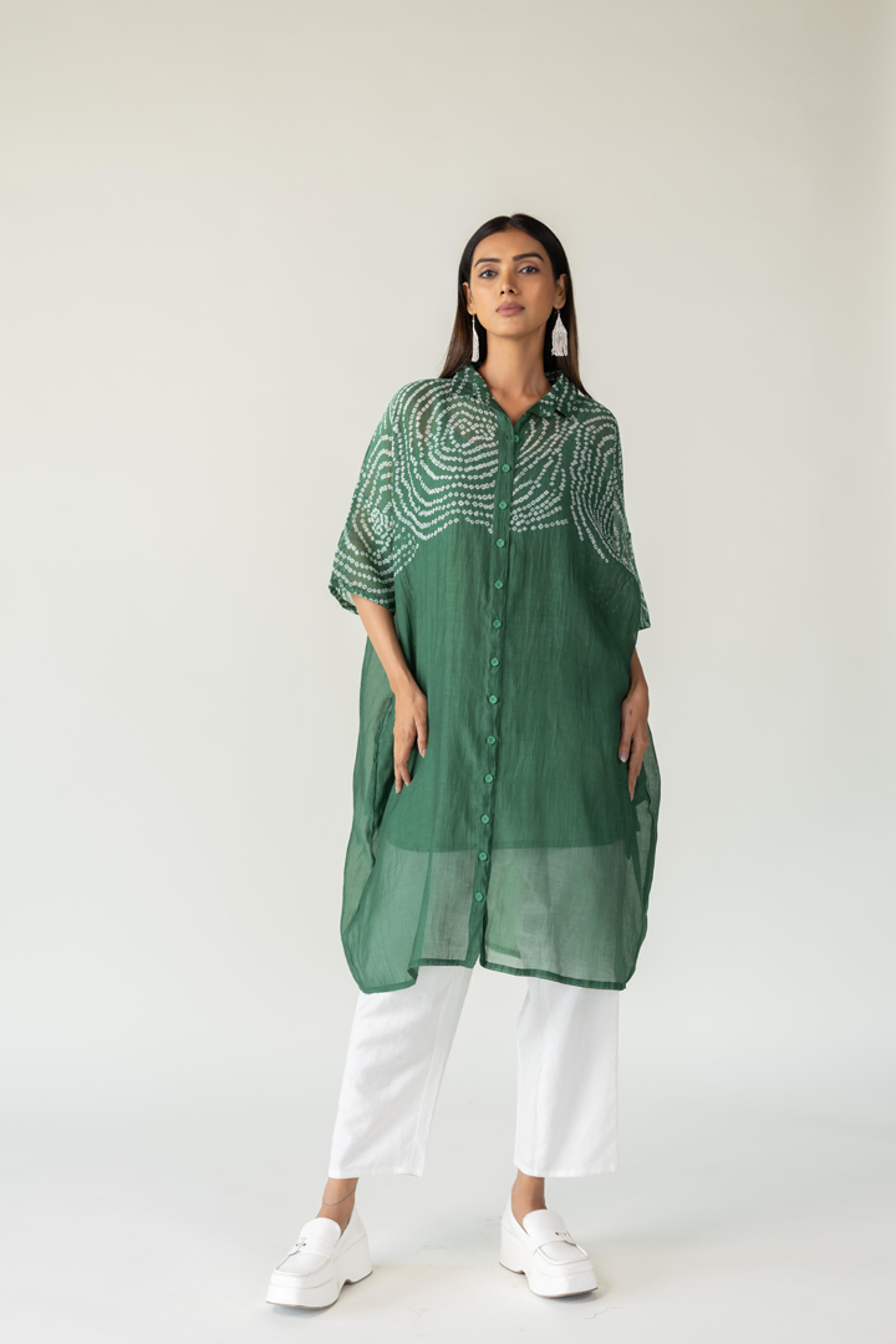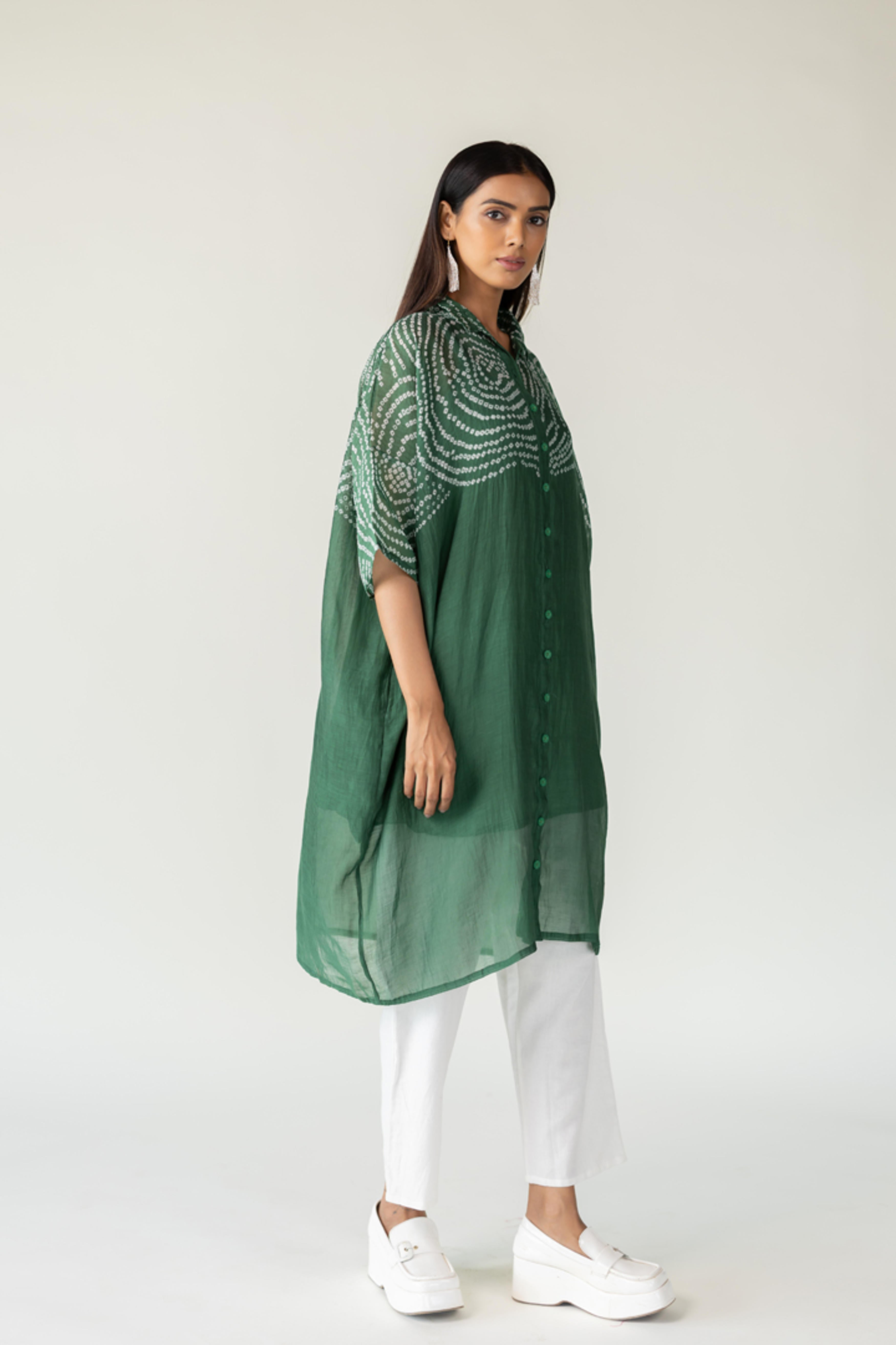 Step into serene style with Emerald Swirl Bandhani Tunic, a fresh interpretation of timeless craftsmanship. Featuring intricate hand-tied bandhani in circular patterns across the shoulders and sleeves, this tunic glows in a rich emerald green hue on a breezy, sheer cotton-silk base. The elongated shirt silhouette offers relaxed sophistication, perfect for day-to-evening wear. It comes with a slip. Lengths: Tunic: 40" Slip: 36"