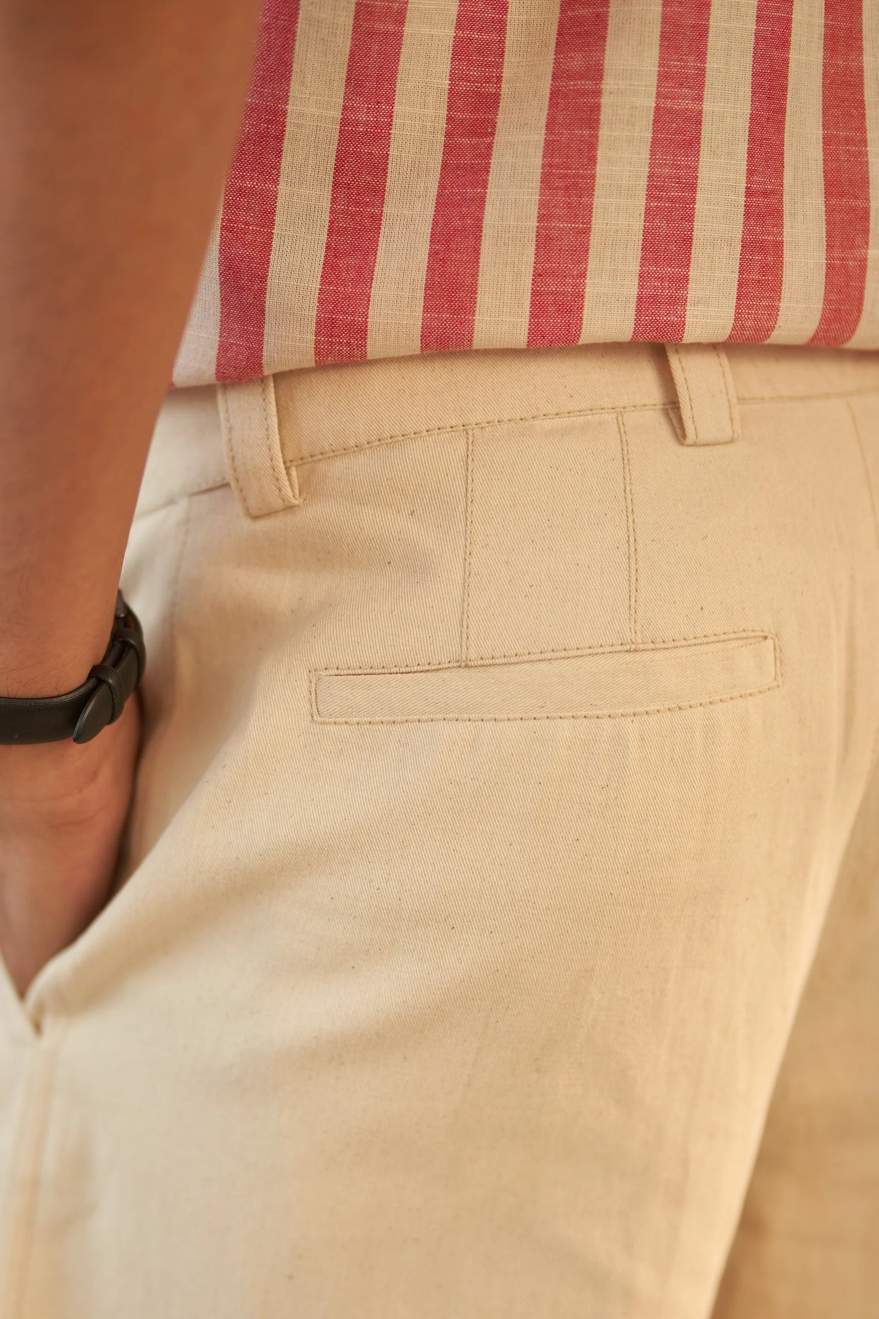 European alley Shorts, ideal for city explorations. Crafted for both style and convenience, these smart shorts feature convenient side and back pockets. With their versatile off-white color and comfortable cotton twill fabric, they are perfect for navigating city streets in style.
