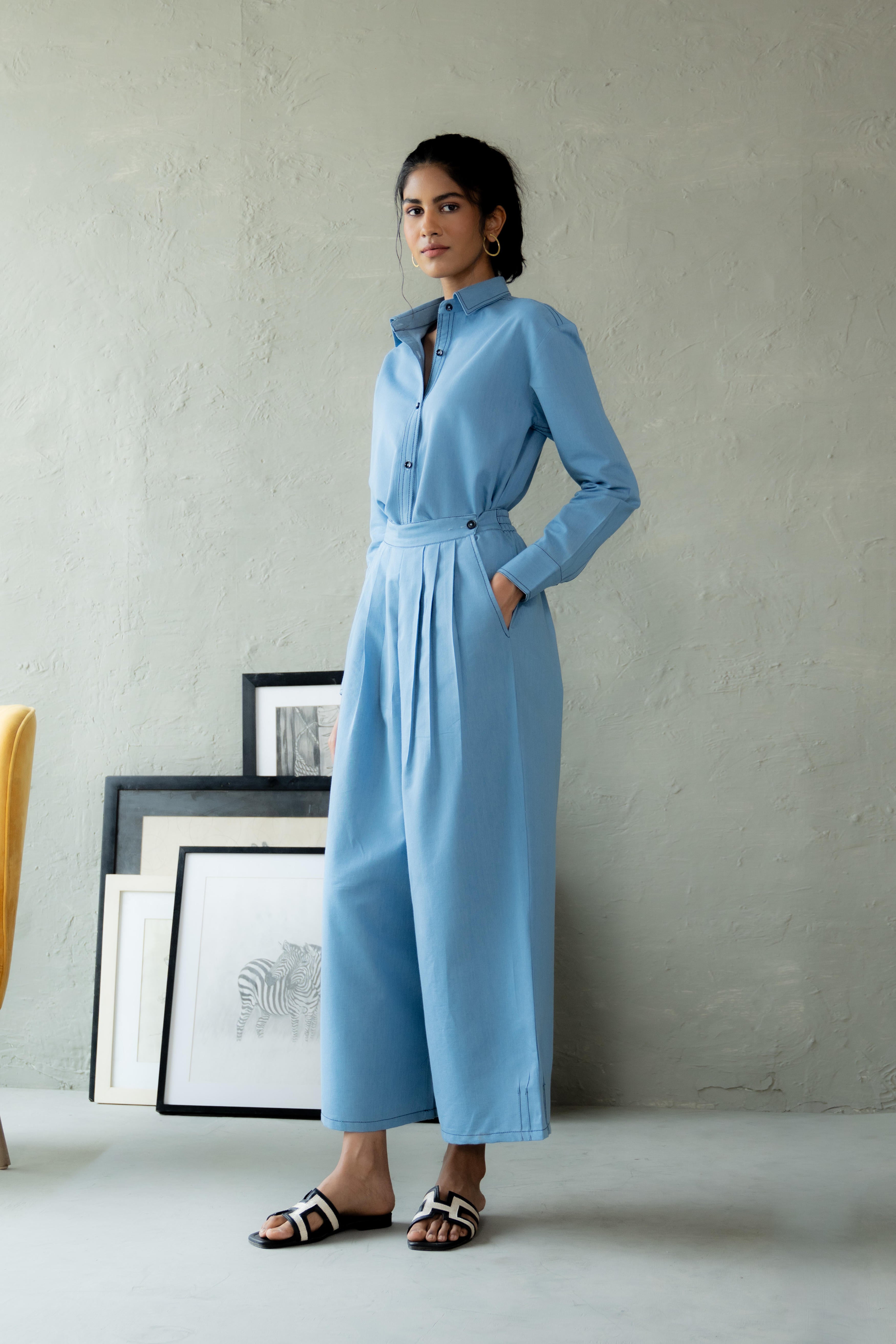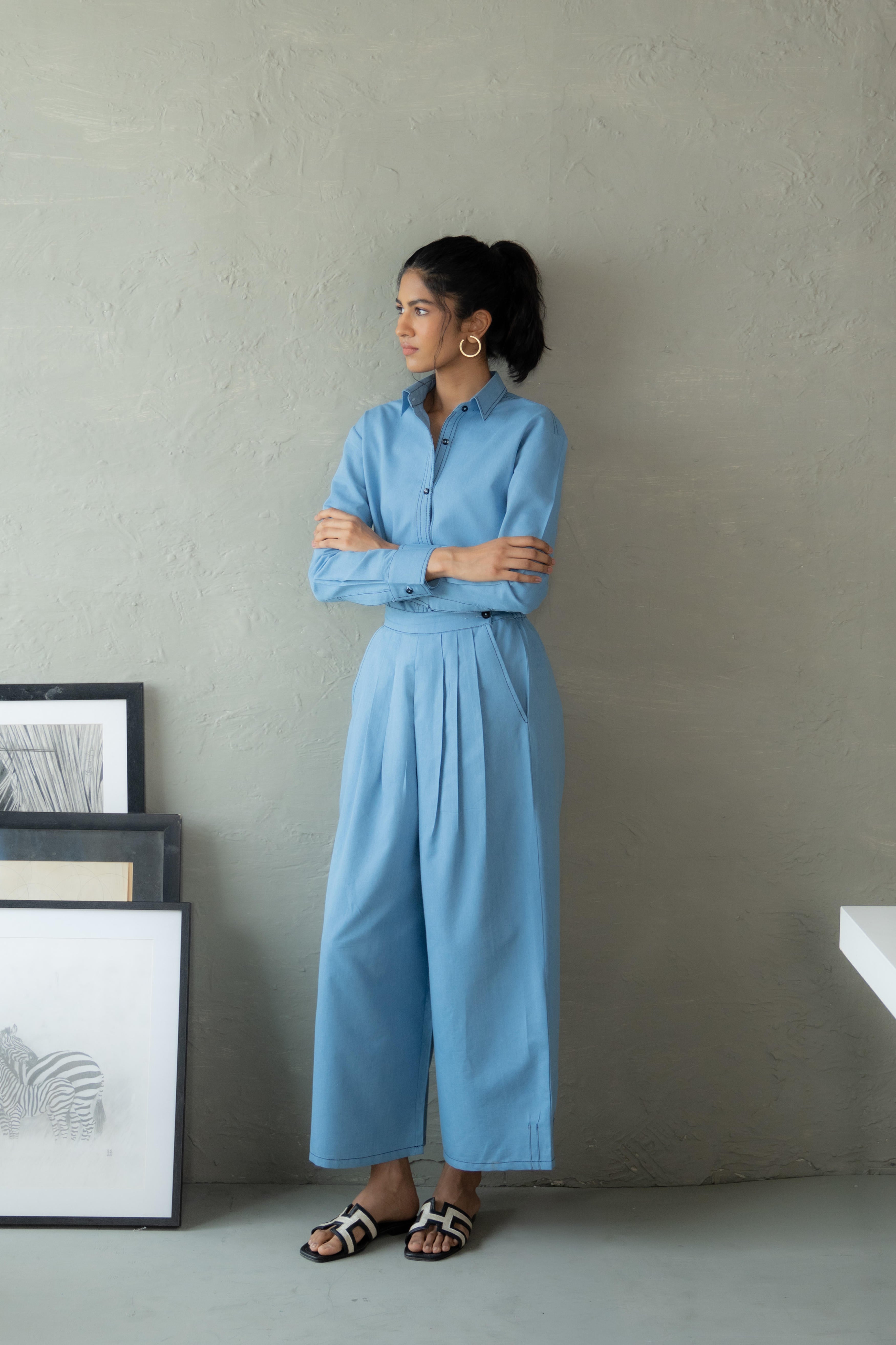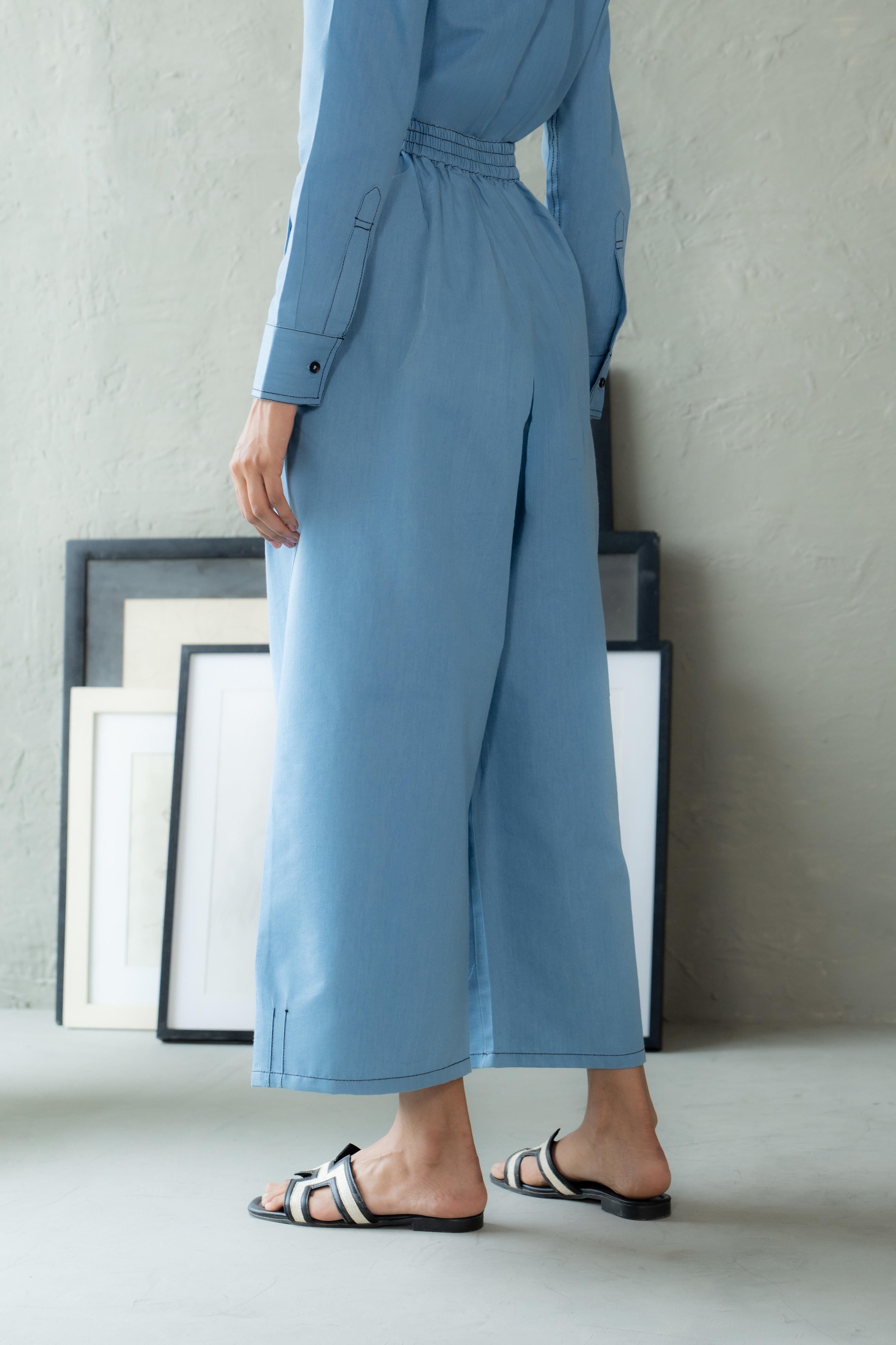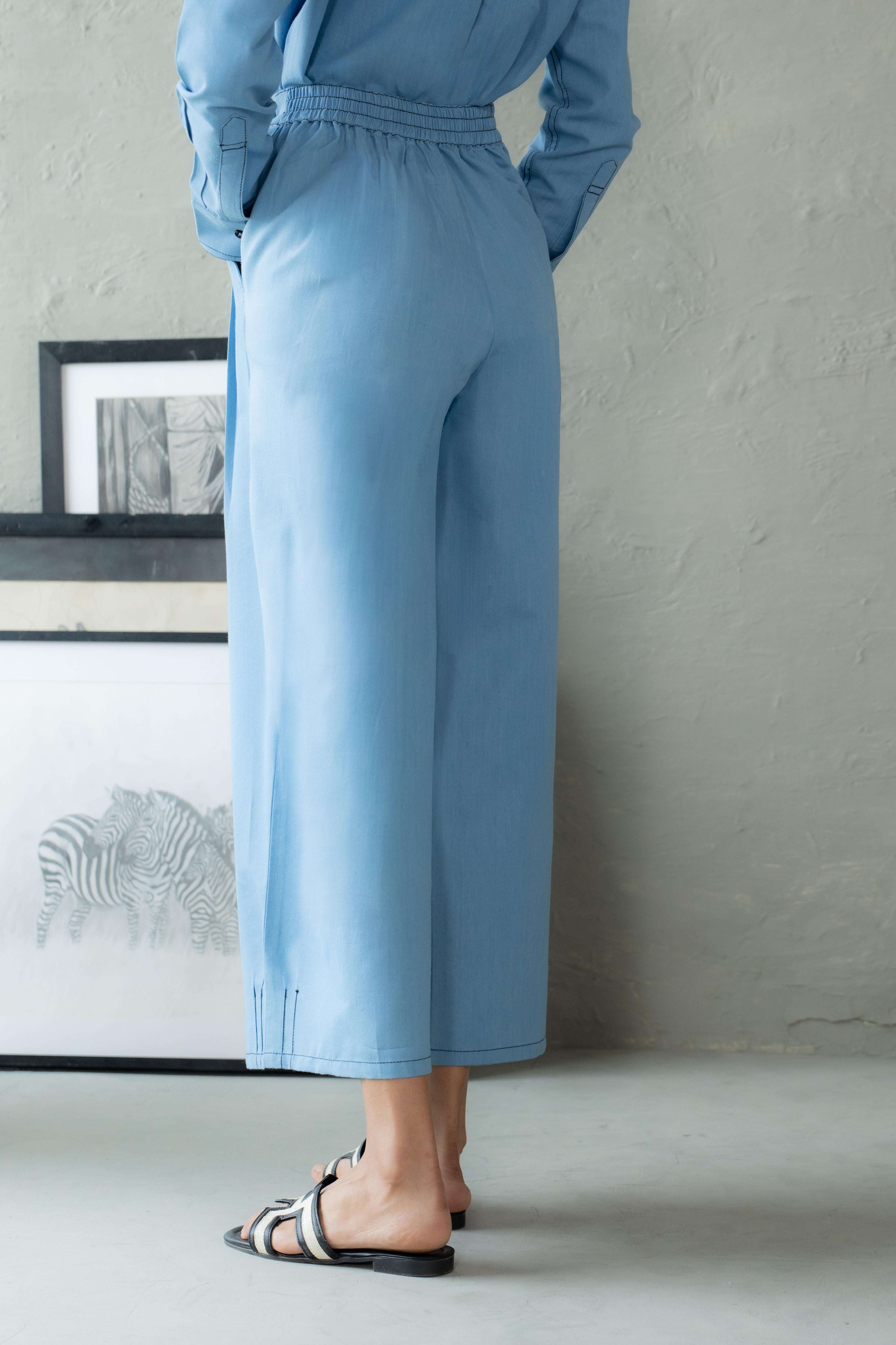 The Everyday Voyager Pants are designed for comfort with a contemporary edge. Tailored in soft denim, these ankle-length pants feature inverted box pleats that add structure and sophistication. The half-elasticated waistband with button closure ensures a personalized fit, while the relaxed silhouette makes them perfect for both everyday ease and refined styling. Model is 5.9".