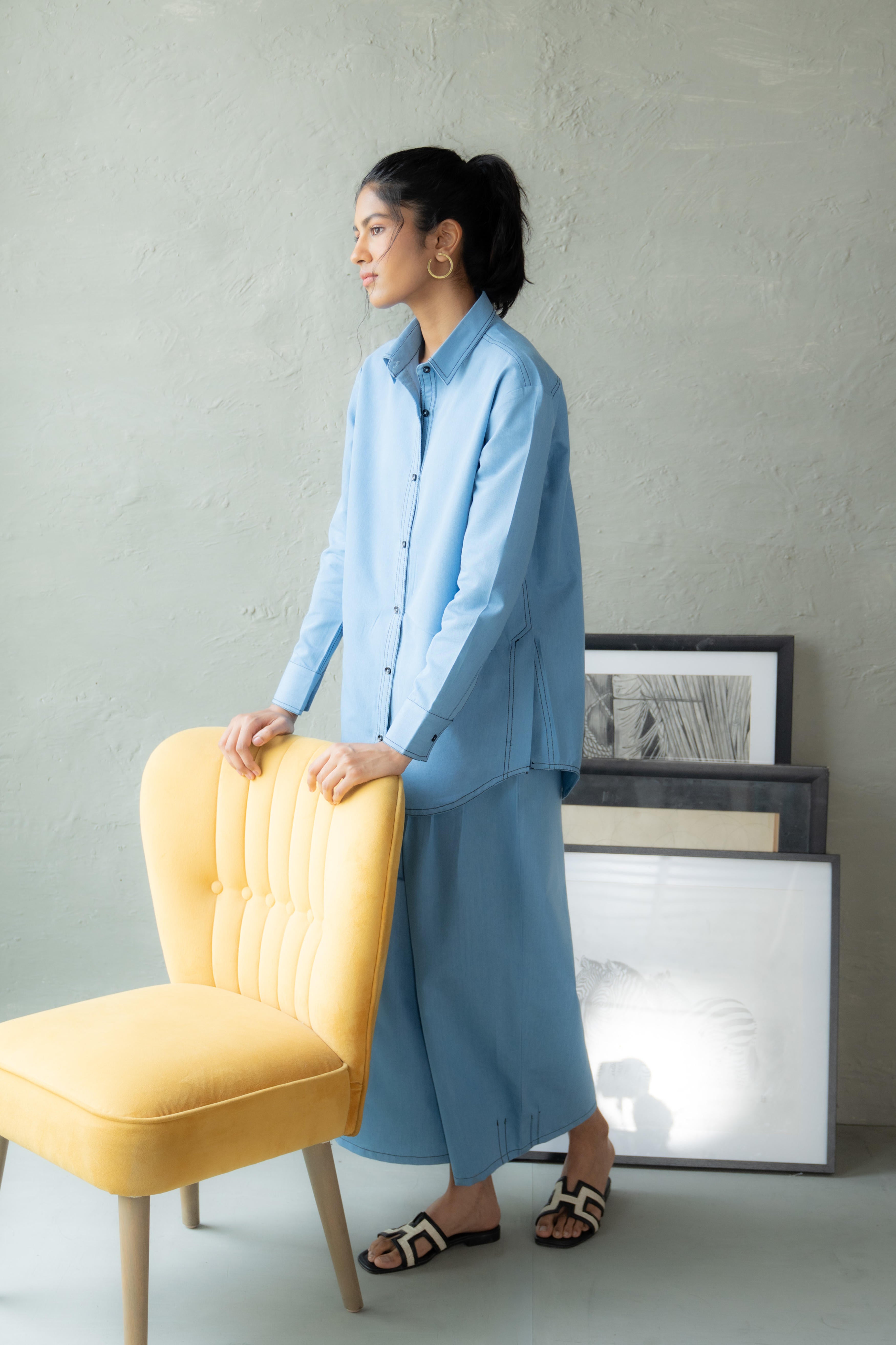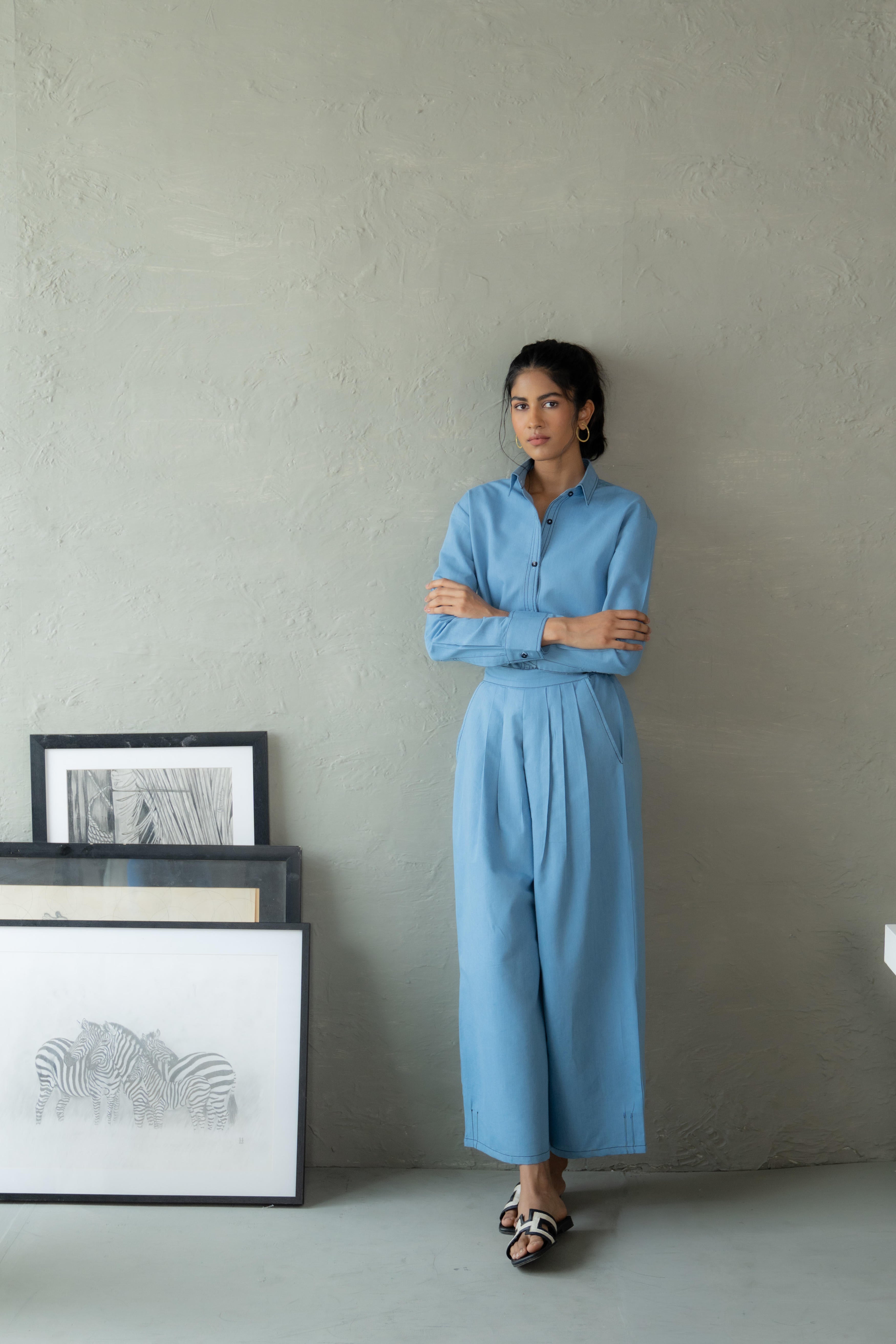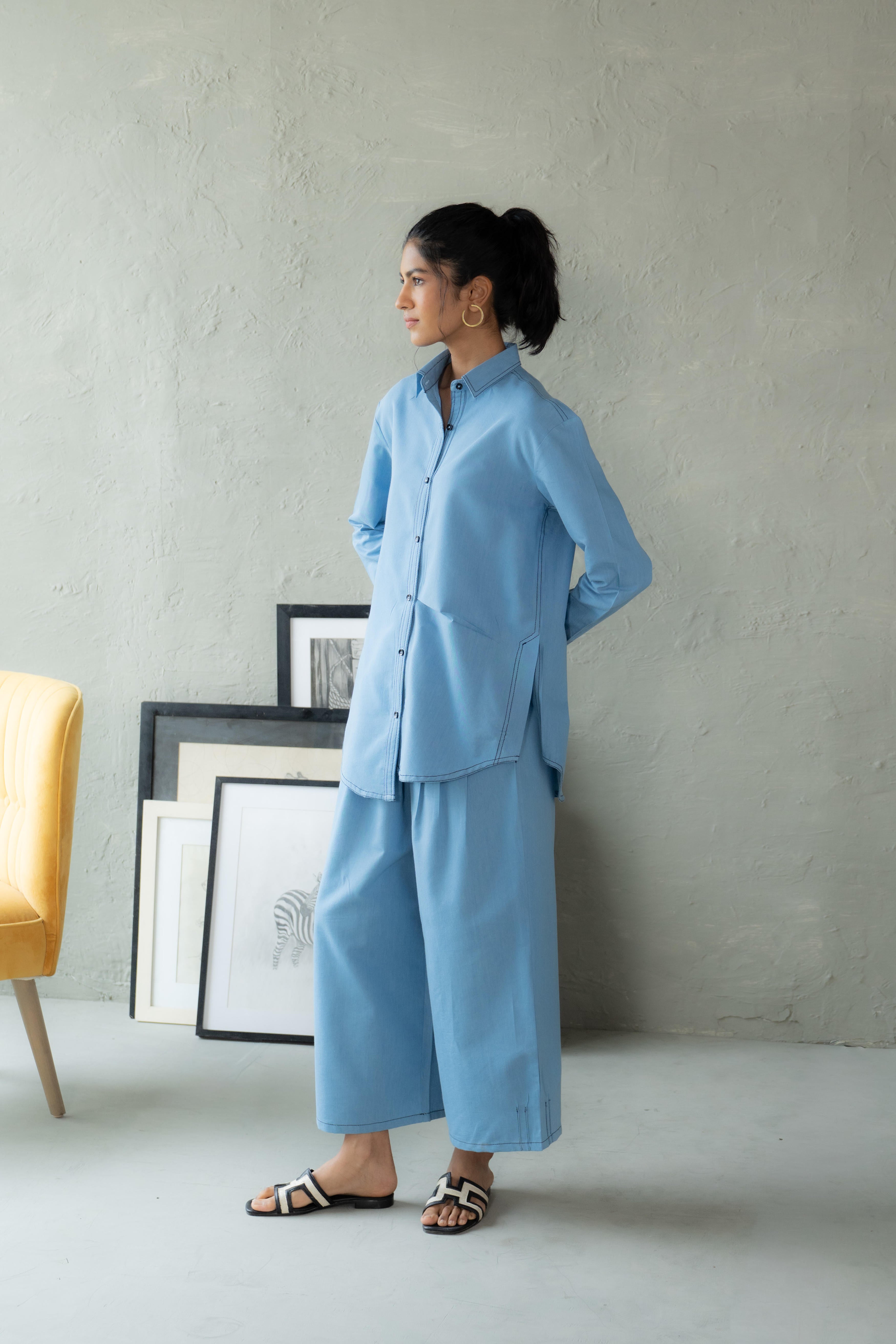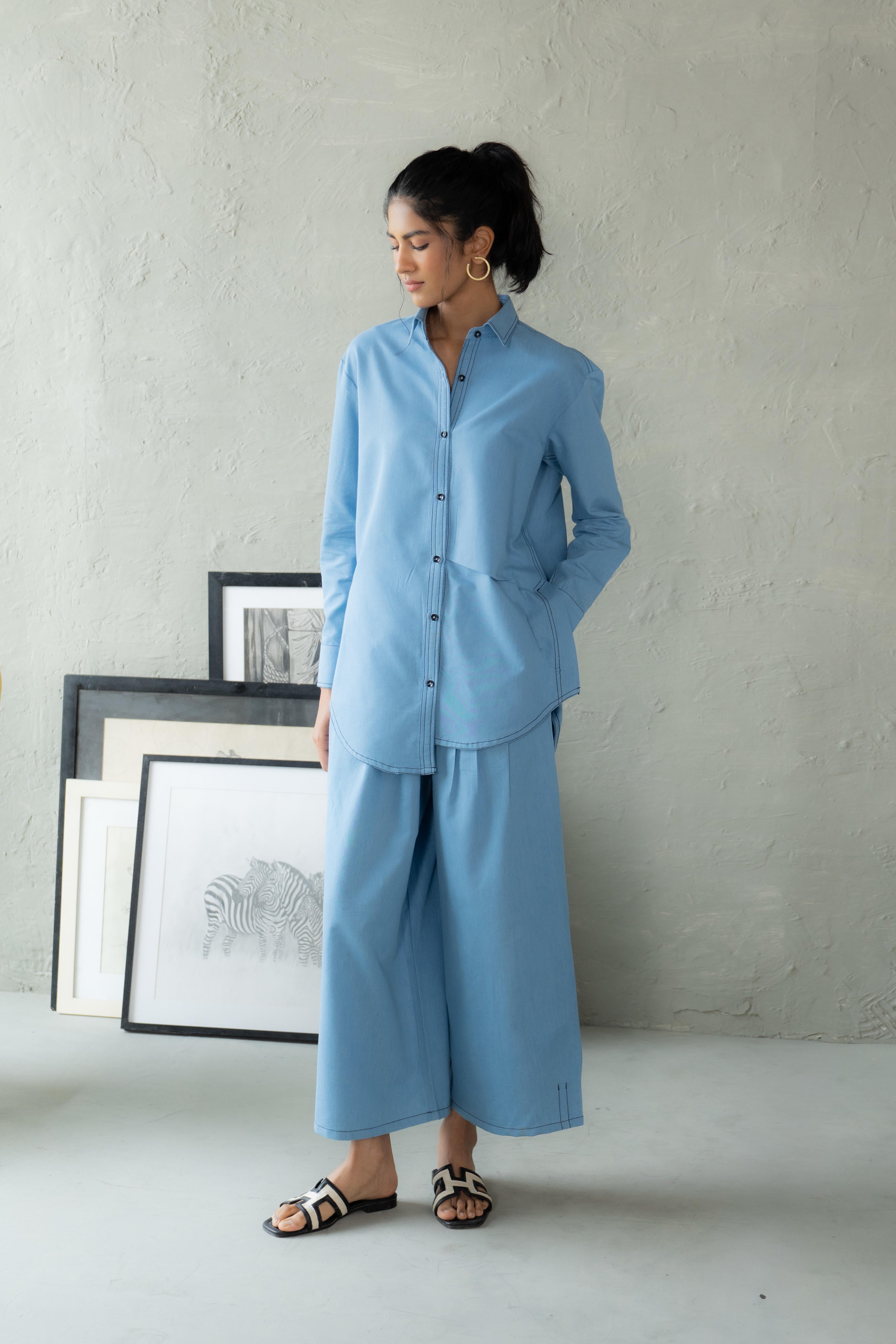 The Everyday Voyager Set redefines classics with a modern edge. The asymmetric shirt, crafted in soft cotton denim, is tailored in a relaxed shape and features a unique asymmetric placket that creates a pleated panel on the left side. Sharp black stitch detailing adds a touch of refinement to the look. Paired with elasticated box-pleat pants which feature a half-elasticated waist with a button for a customized fit, while the inverted box pleats add sophistication and structure. Perfect for versatile styling, from casual gatherings to elevated daywear. Model is 5.9".