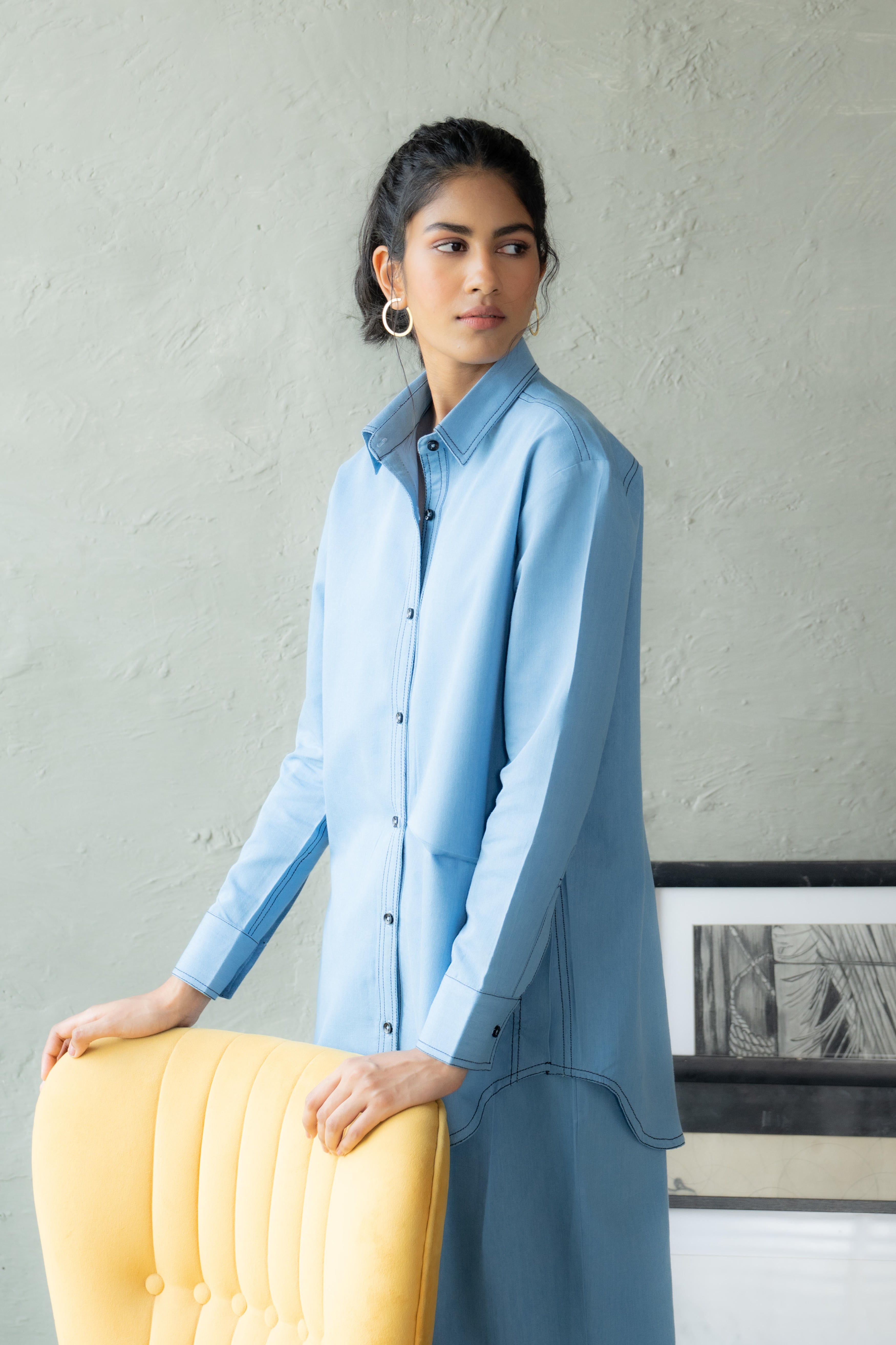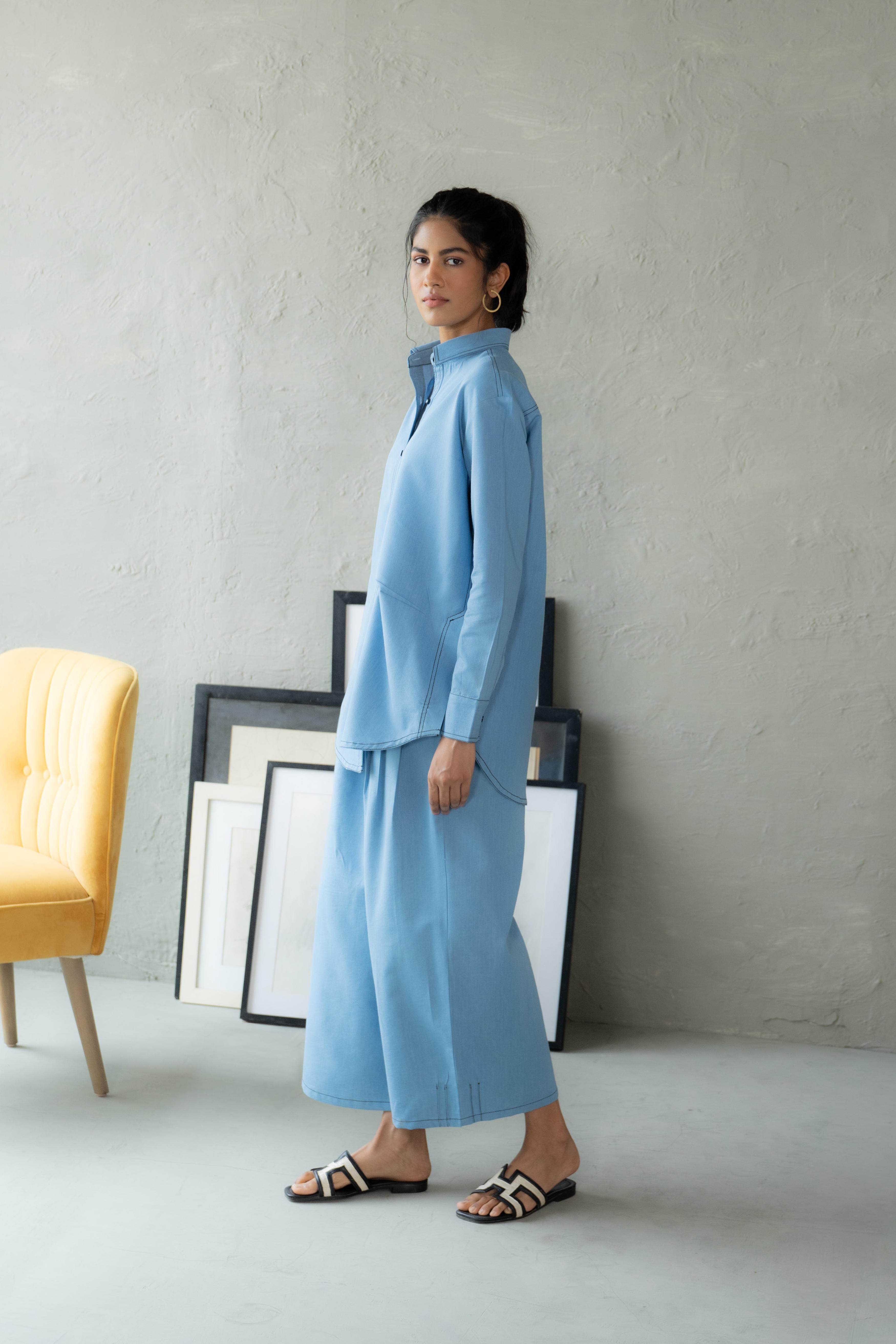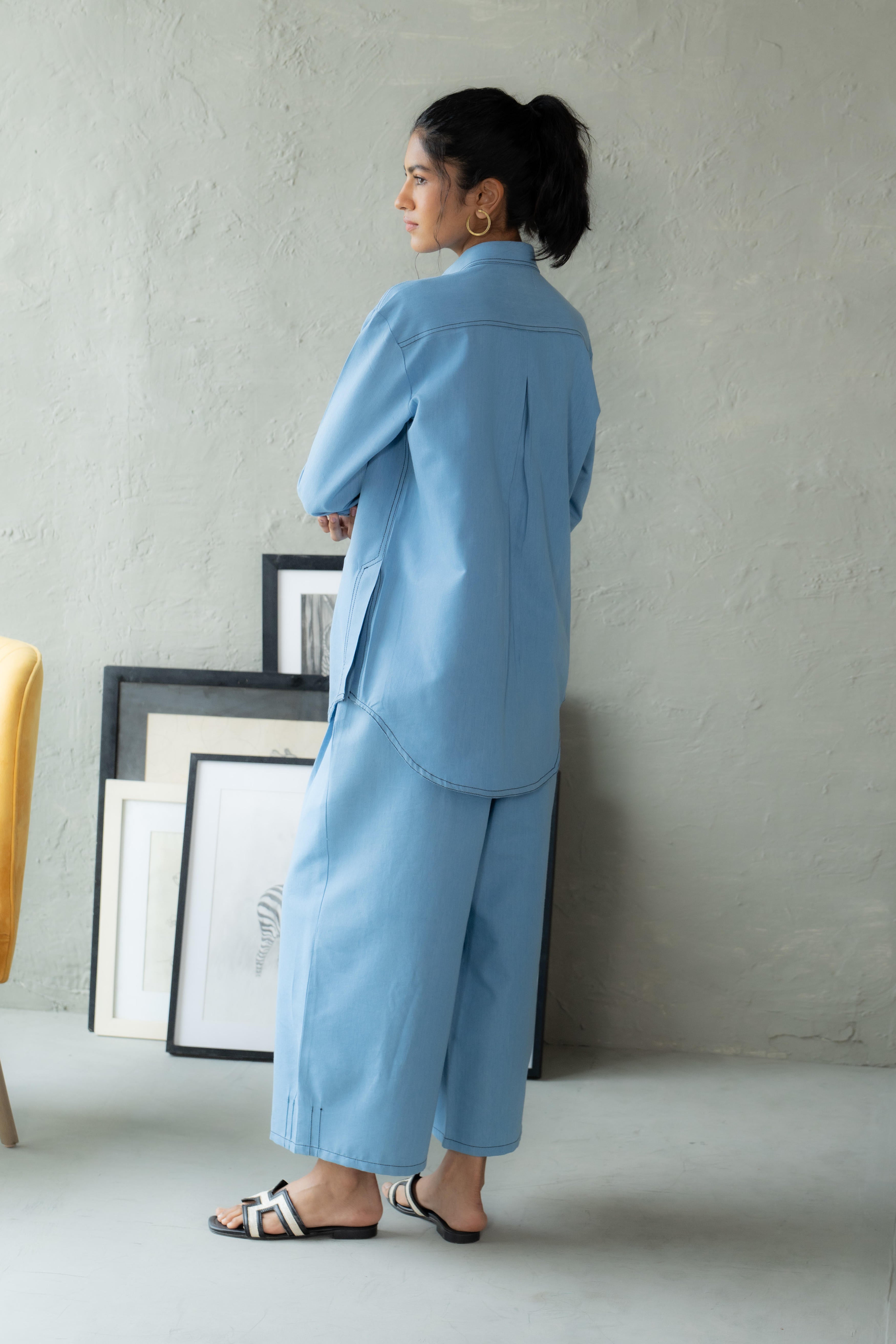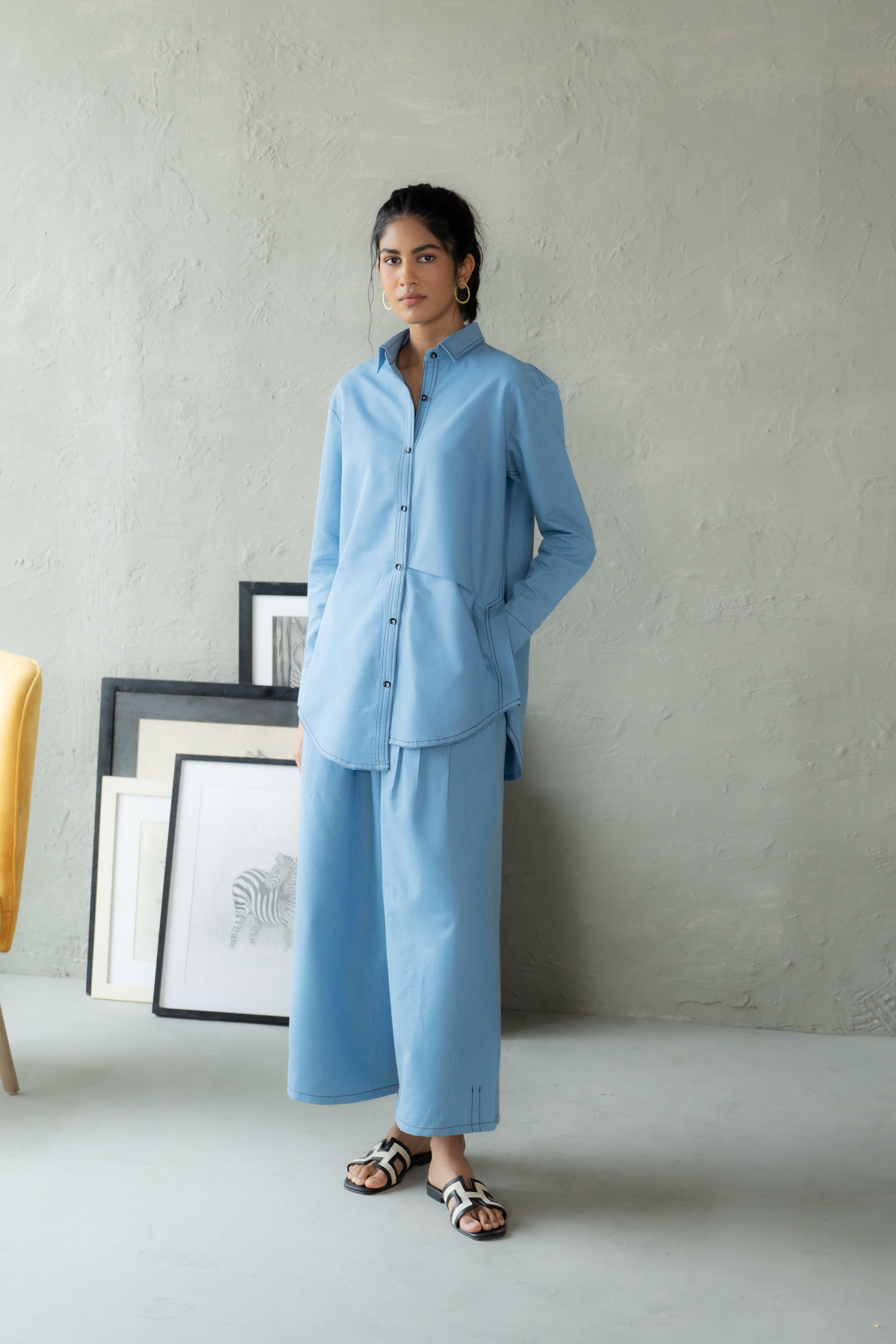 The Everyday Voyager Set redefines classics with a modern edge. The asymmetric shirt, crafted in soft cotton denim, is tailored in a relaxed shape and features a unique asymmetric placket that creates a pleated panel on the left side. Sharp black stitch detailing adds a touch of refinement to the look. Paired with elasticated box-pleat pants which feature a half-elasticated waist with a button for a customized fit, while the inverted box pleats add sophistication and structure. Perfect for versatile styling, from casual gatherings to elevated daywear. Model is 5.9".