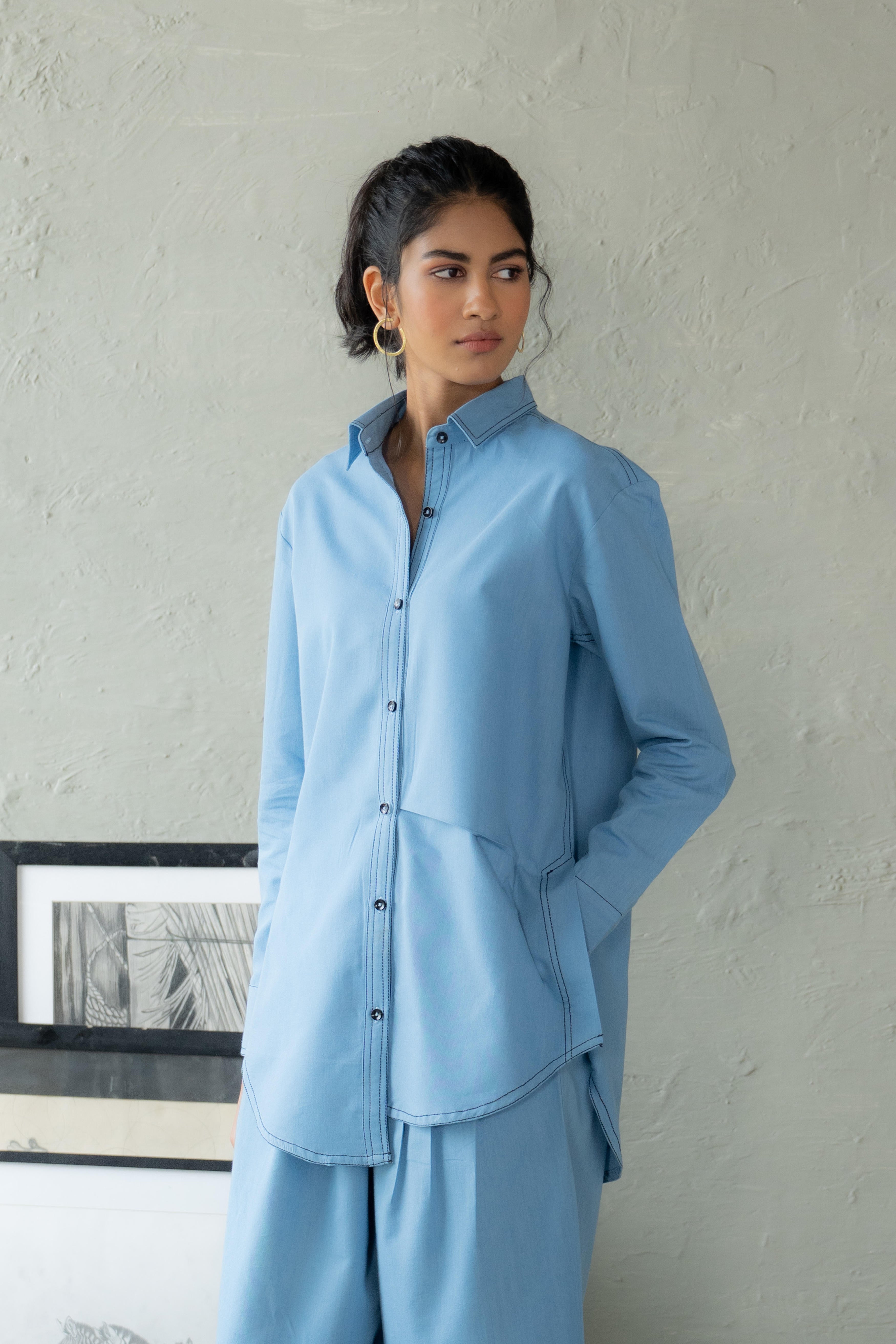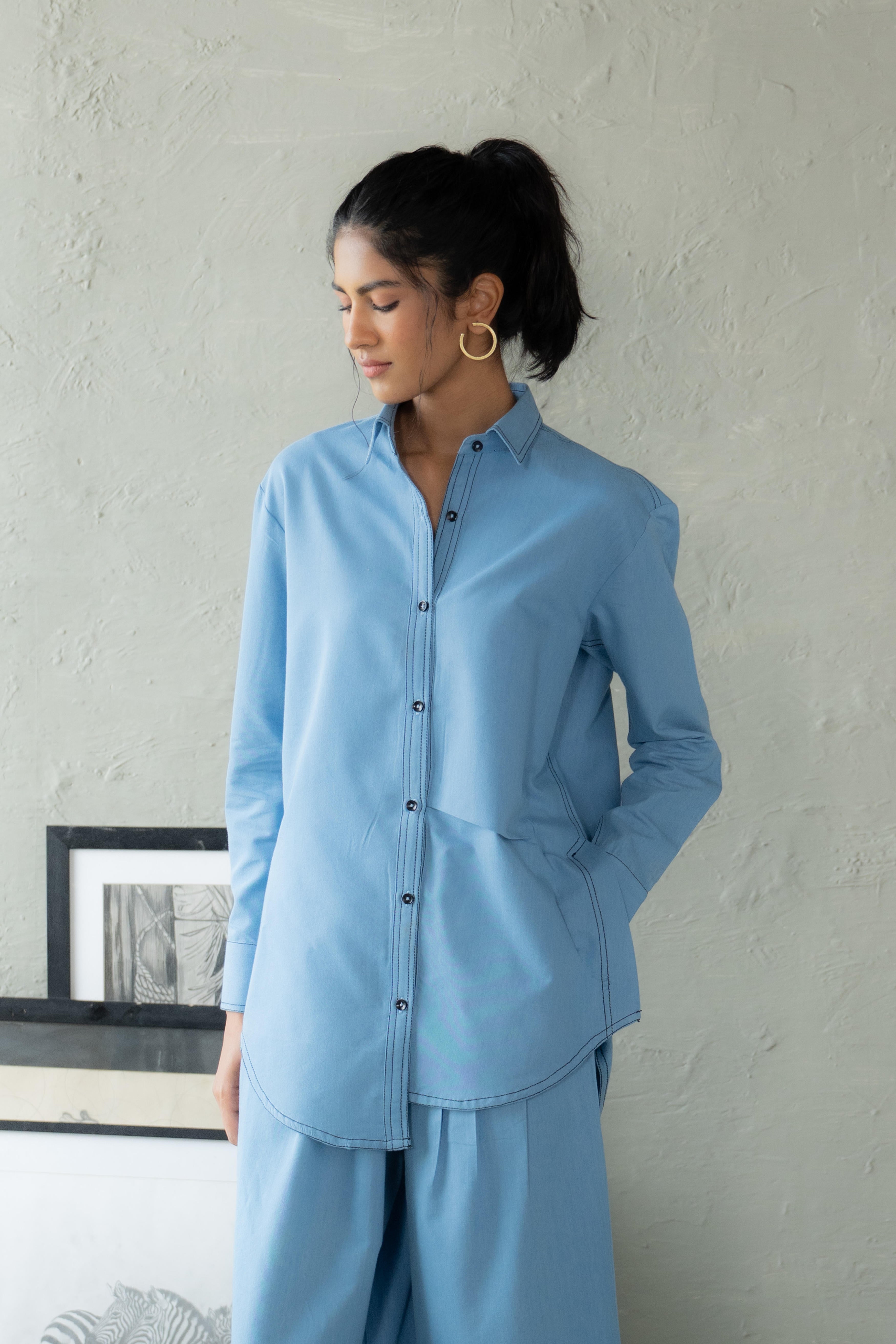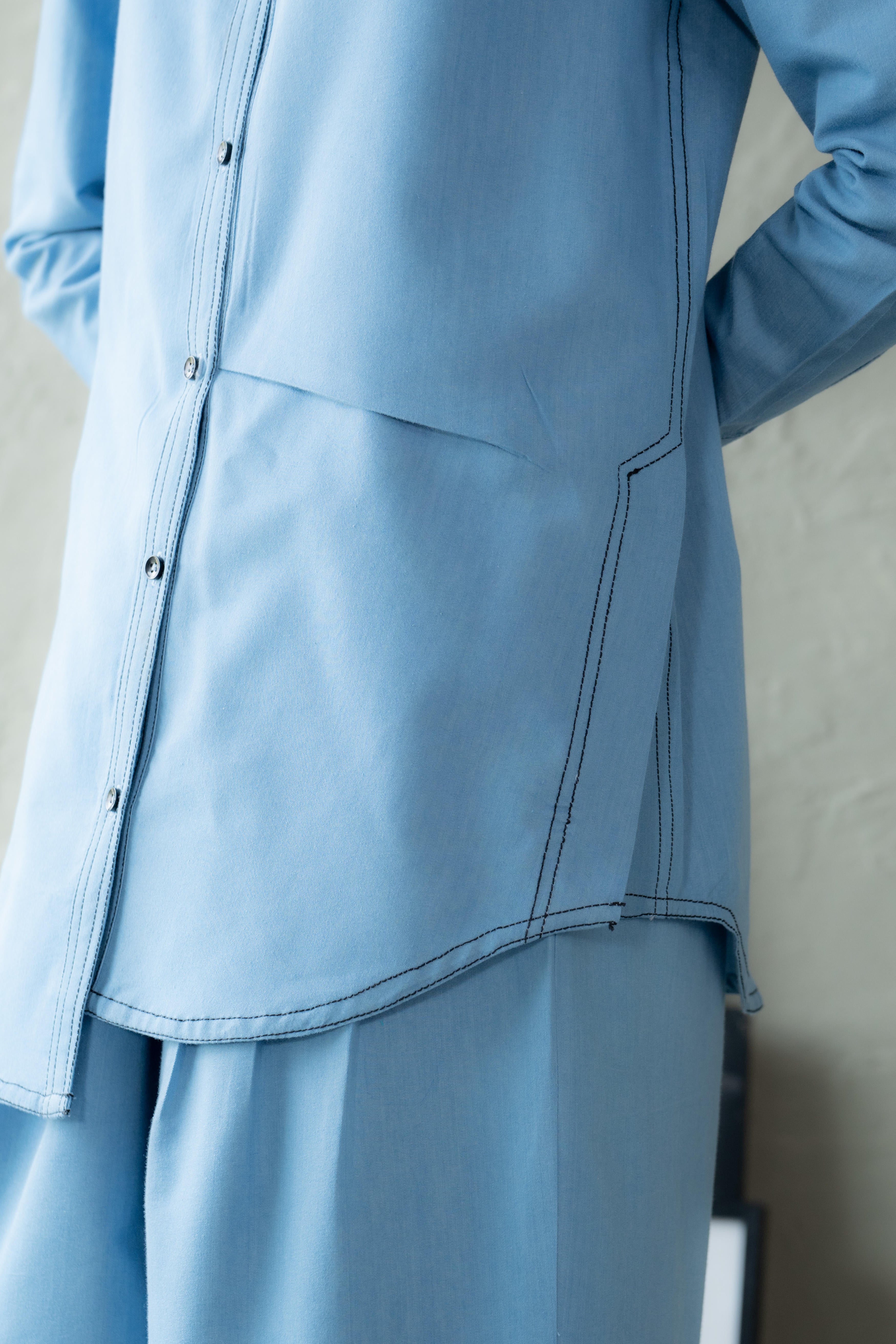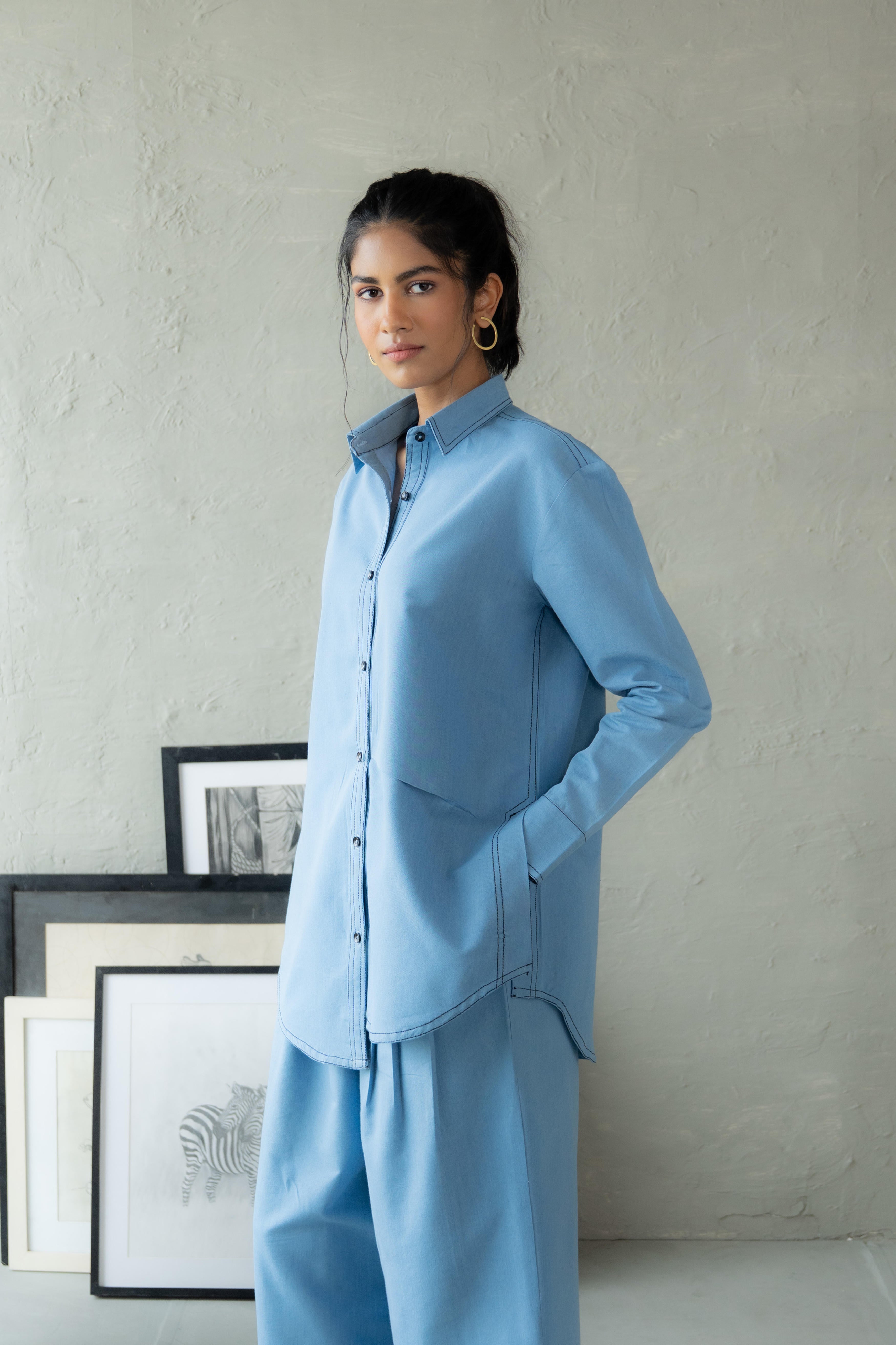 The Everyday Voyager Shirt is a modern twist on a classic. Crafted in soft cotton denim, it features an asymmetric placket that creates a pleated panel on the left side, lending visual intrigue. Sharp black stitch detailing highlights its contemporary tailoring, while the relaxed fit ensures effortless ease. A versatile piece that can be styled for workdays, casual outings, or layered for travel-ready comfort. Model is 5.9".