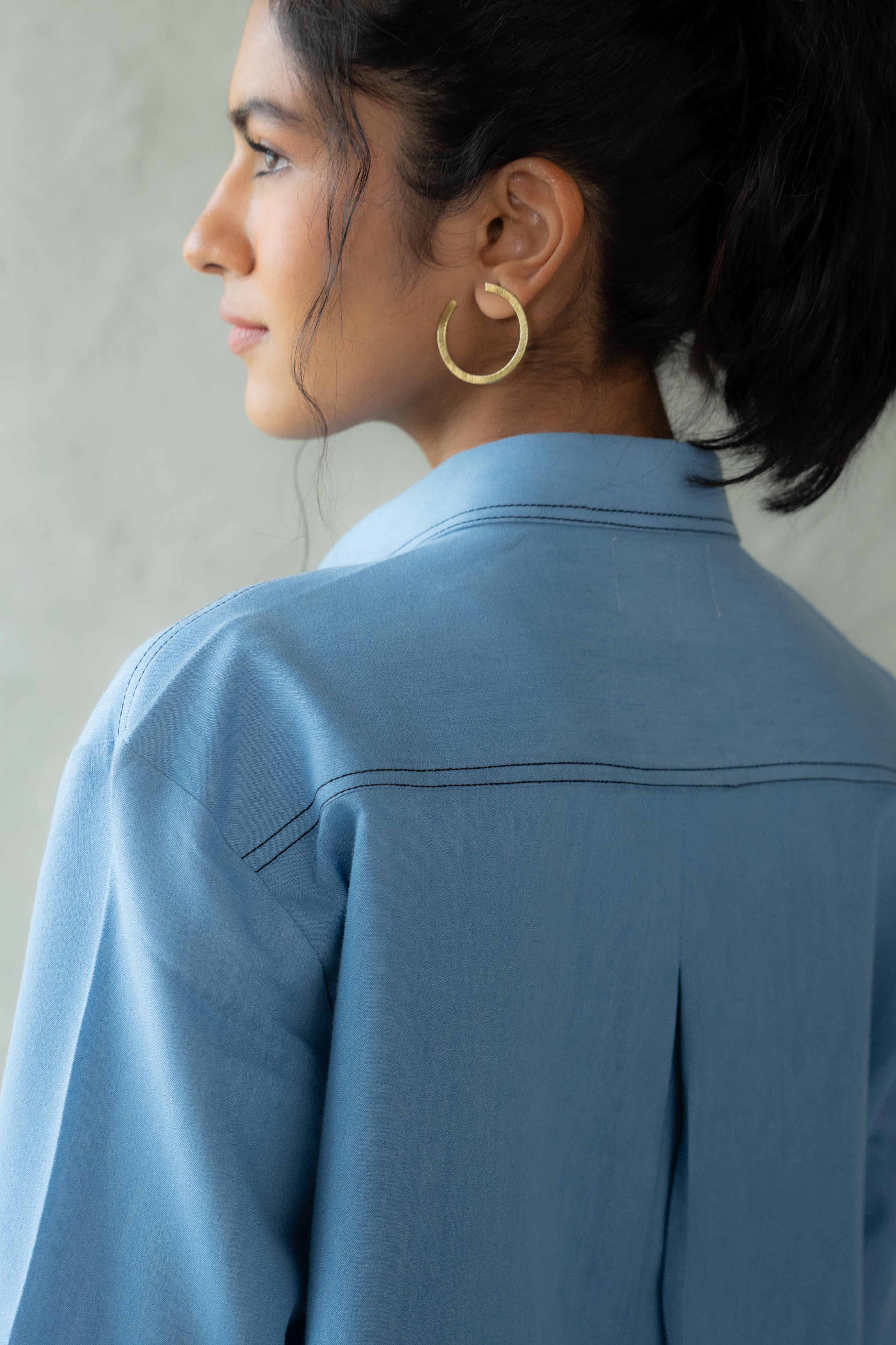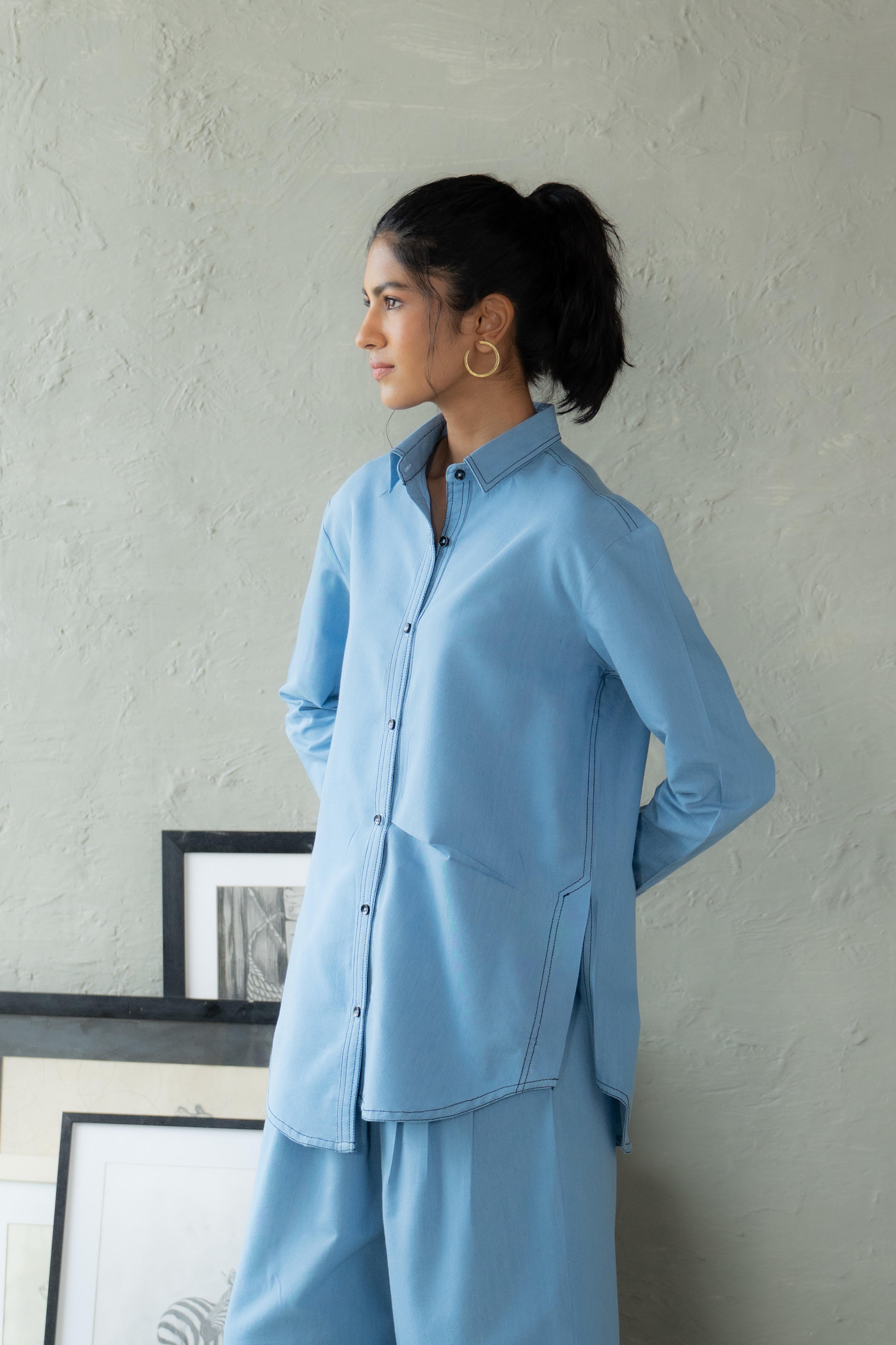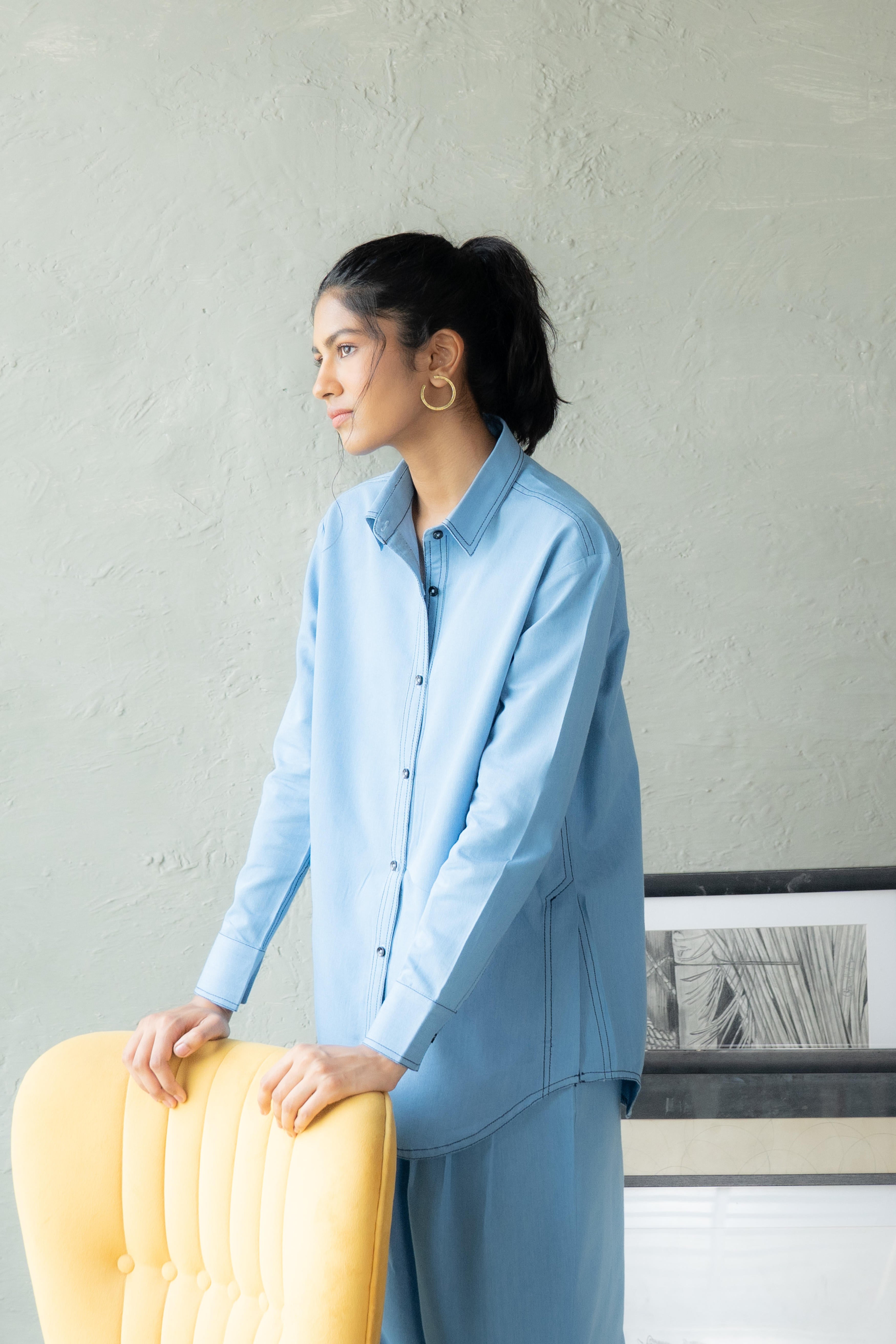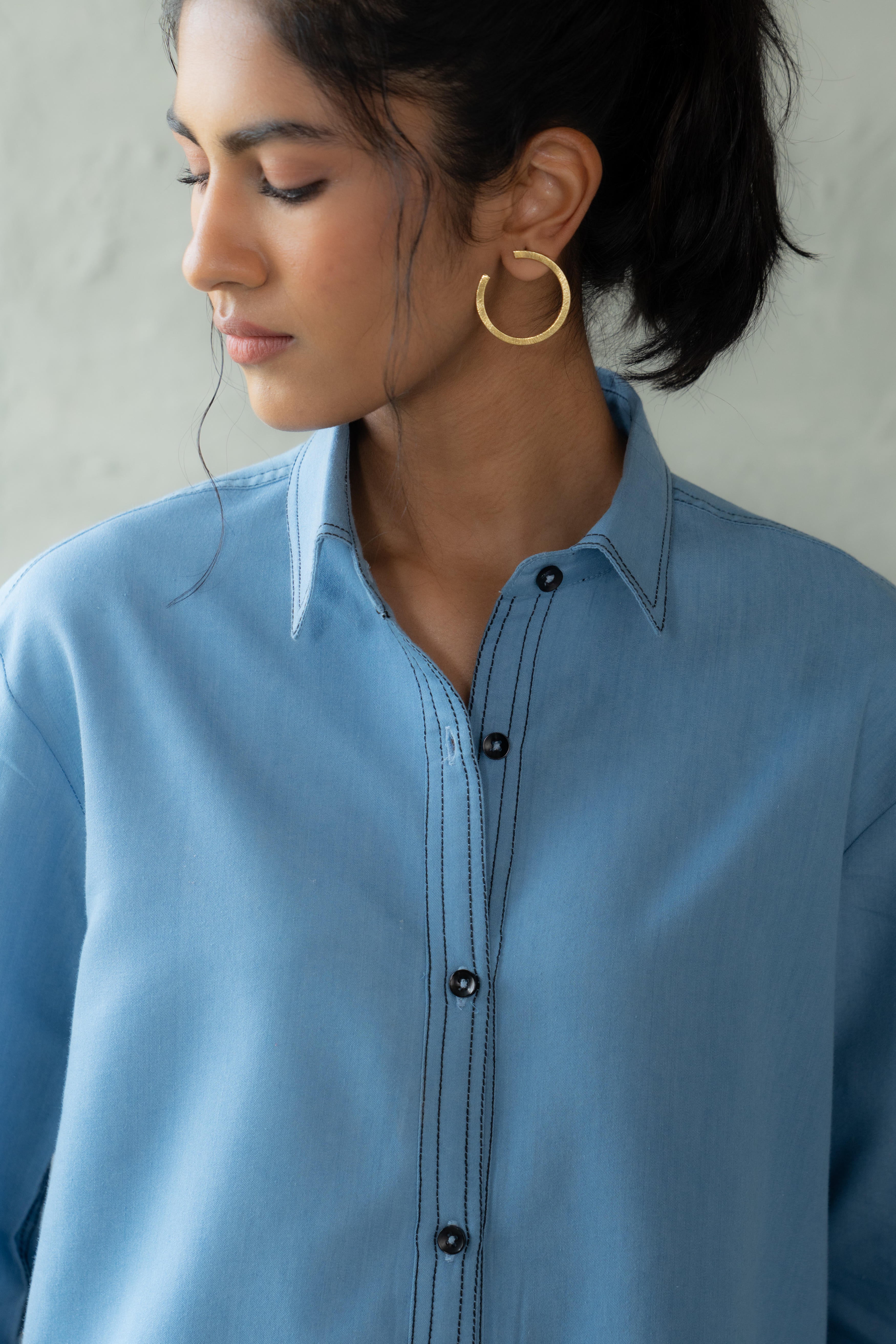 The Everyday Voyager Shirt is a modern twist on a classic. Crafted in soft cotton denim, it features an asymmetric placket that creates a pleated panel on the left side, lending visual intrigue. Sharp black stitch detailing highlights its contemporary tailoring, while the relaxed fit ensures effortless ease. A versatile piece that can be styled for workdays, casual outings, or layered for travel-ready comfort. Model is 5.9".