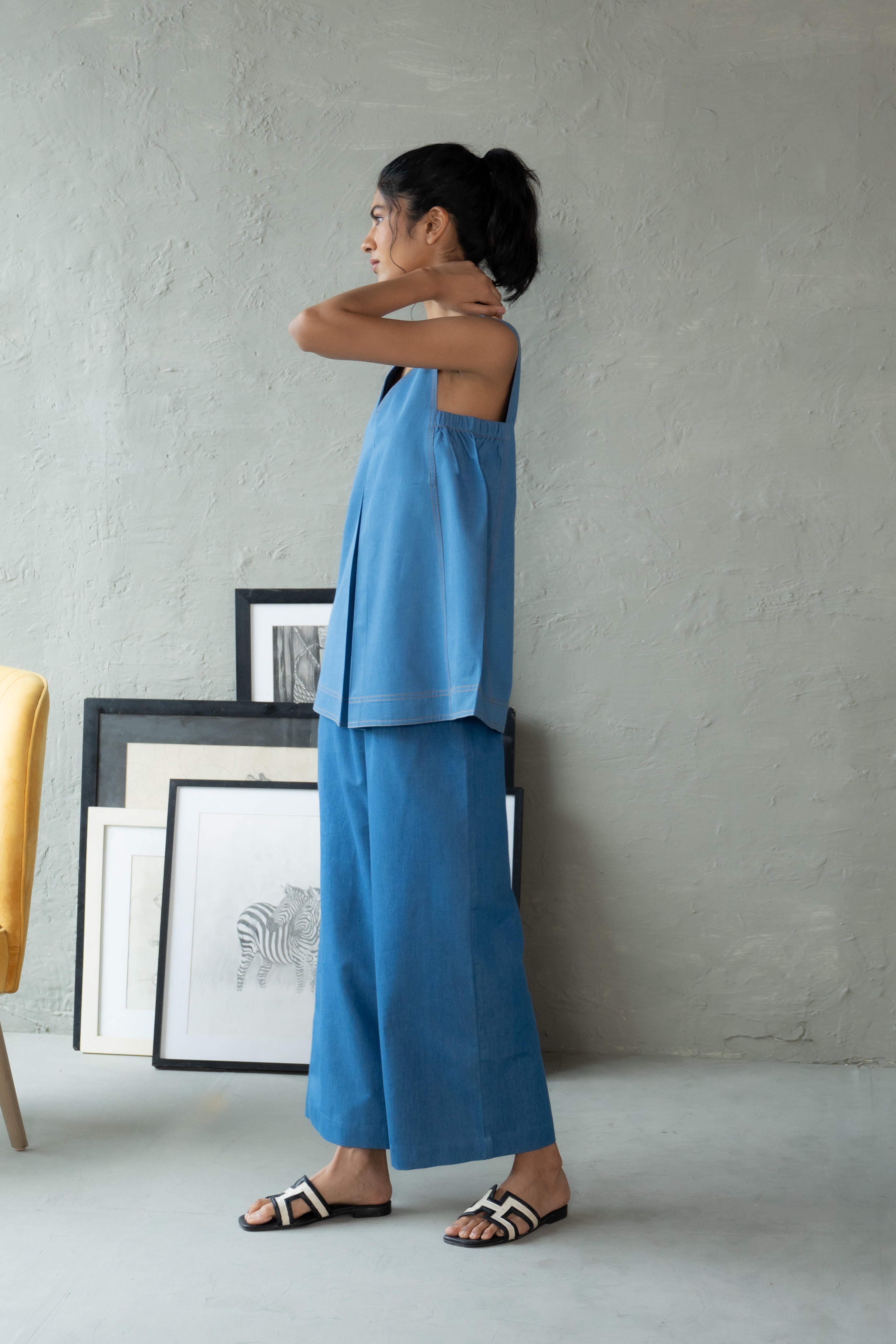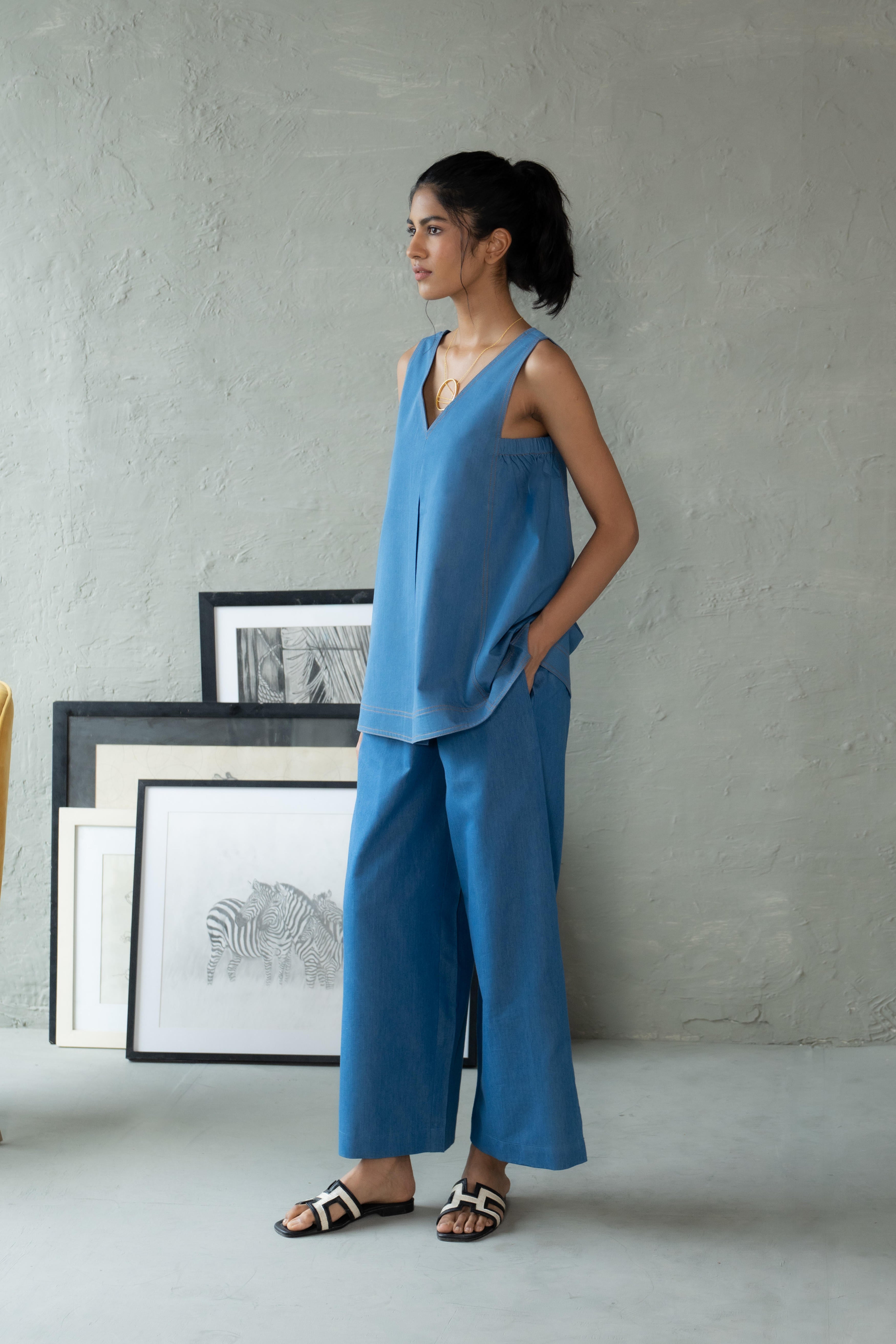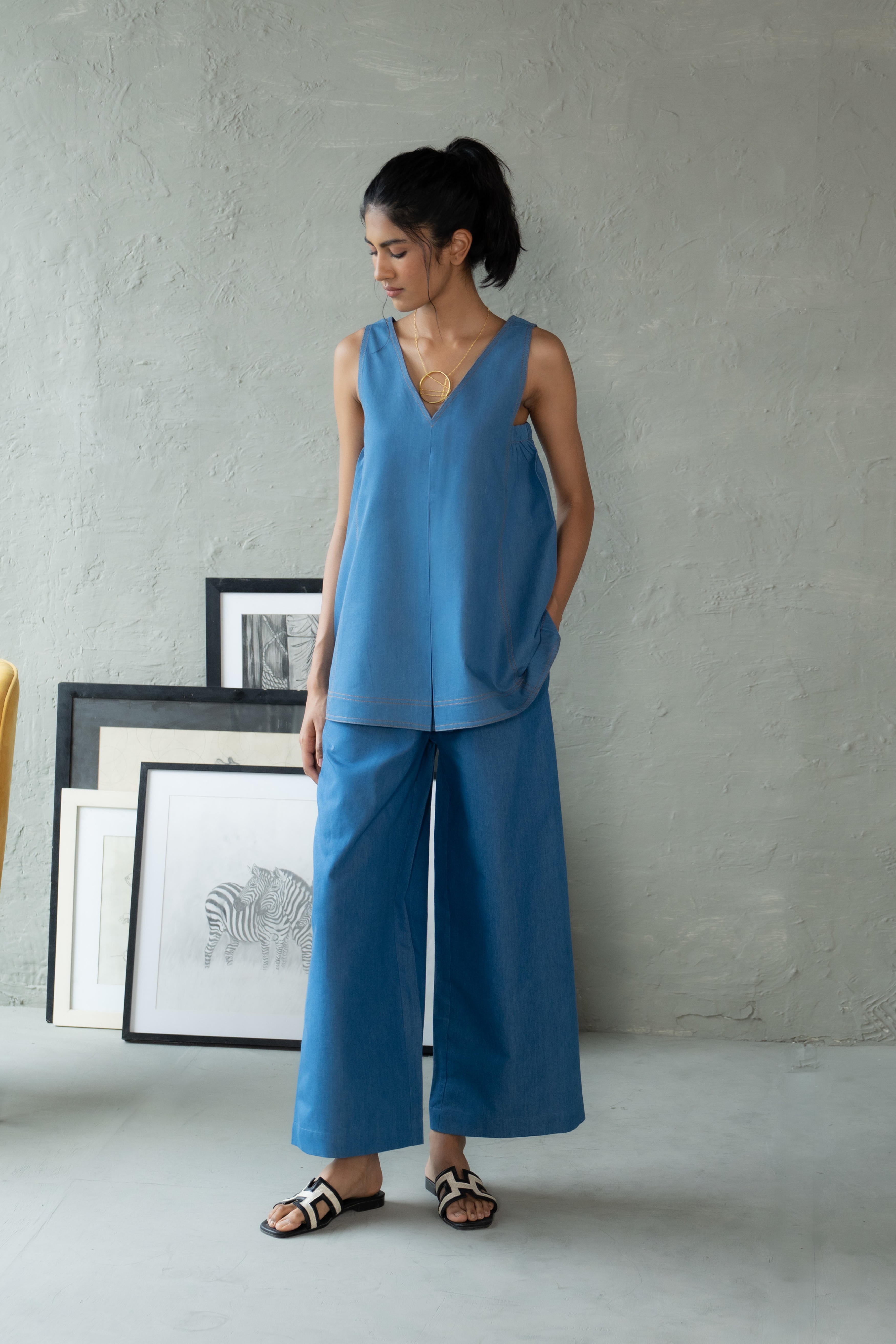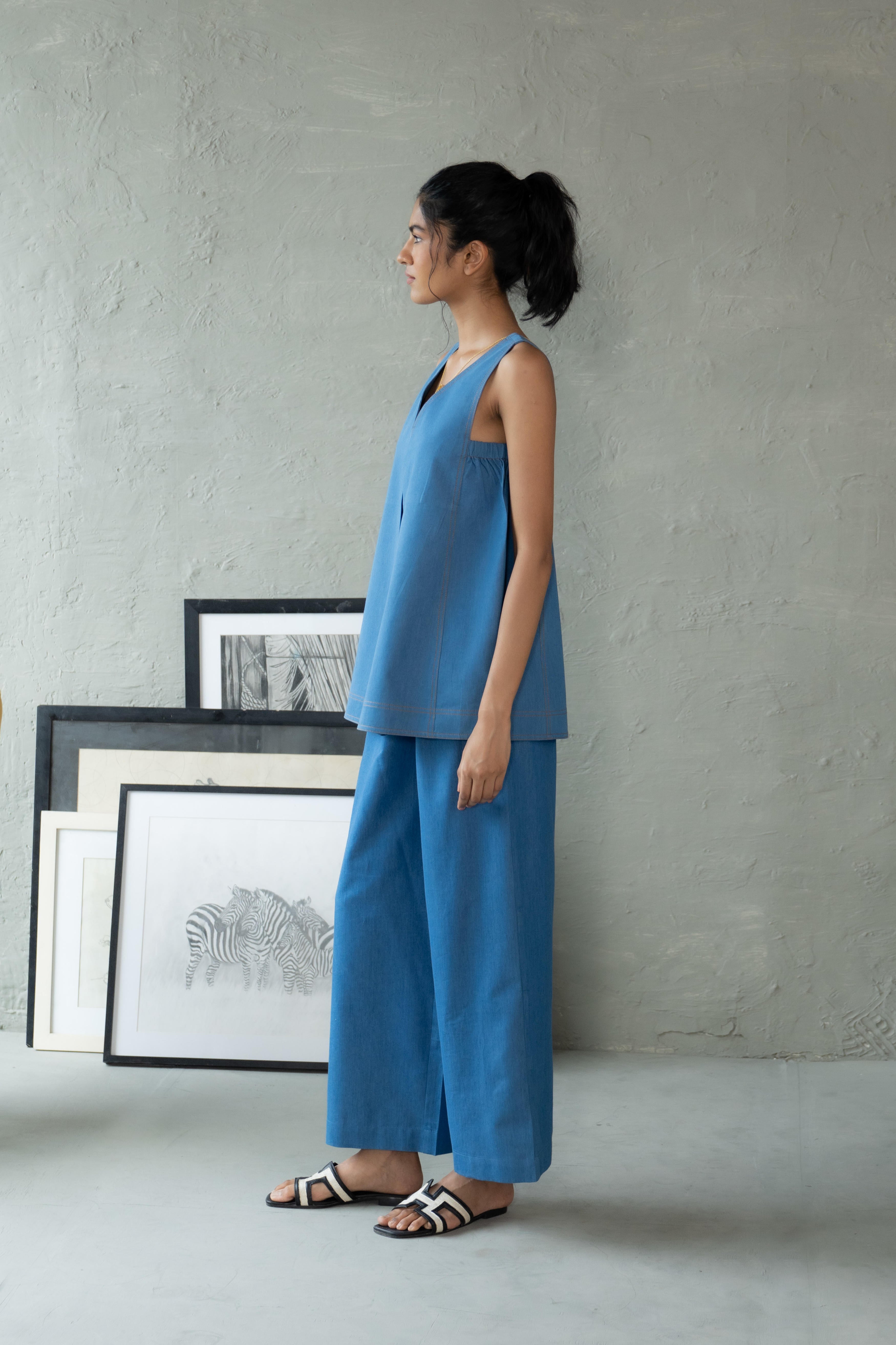 The Explorer’s Note Set in lightweight denim is designed for movement and ease. The sleeveless top features a graceful A-line silhouette with a V-neckline, enhanced by a front inward pleat and elasticated side panels that create soft gathers. Detailed contrast stitching adds subtle intrigue. Paired with matching flared pants, finished with a broad elasticate and a drawstring waist and functional side pockets, this set blends comfort with effortless style—perfect for everyday explorations. Model is 5.9".