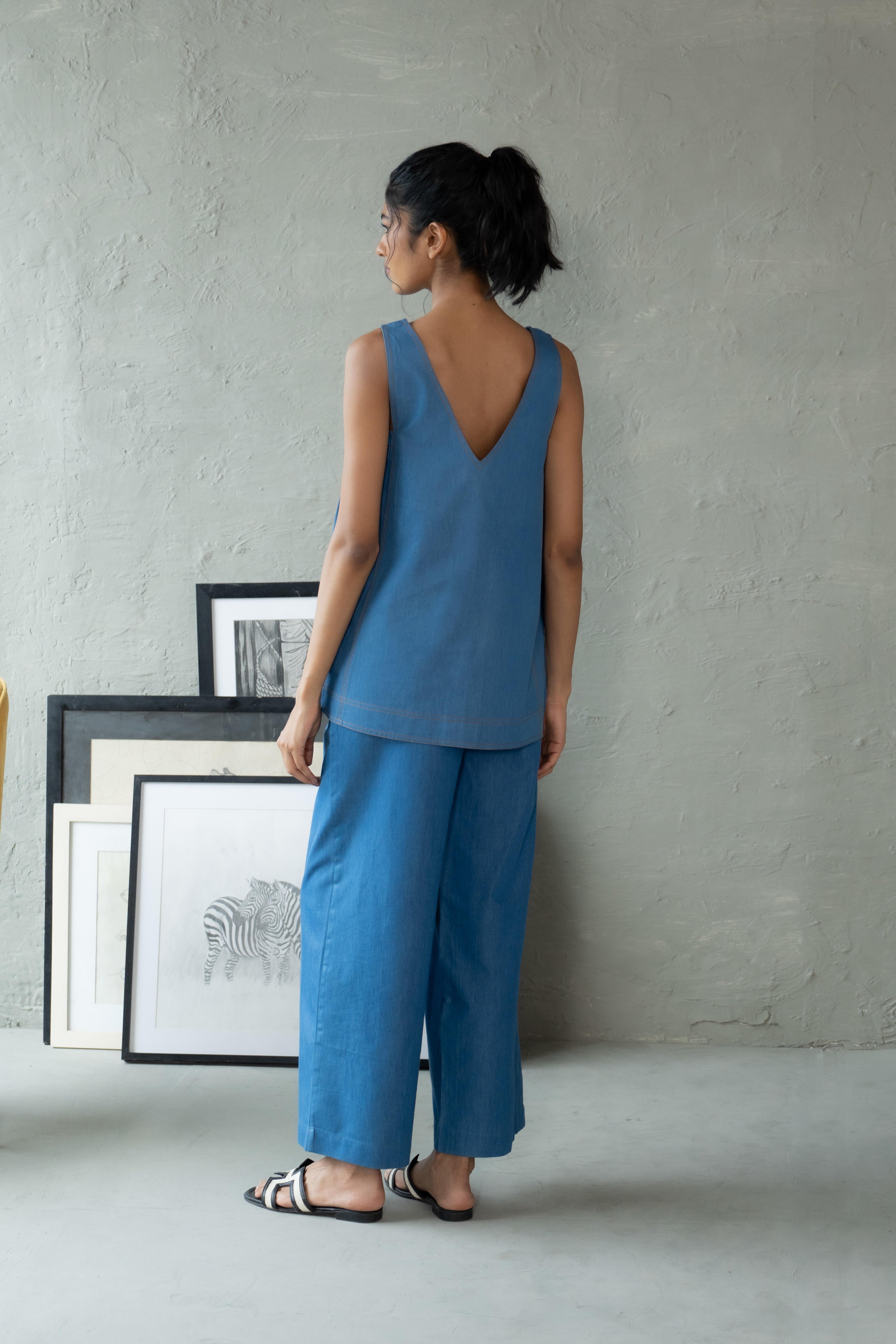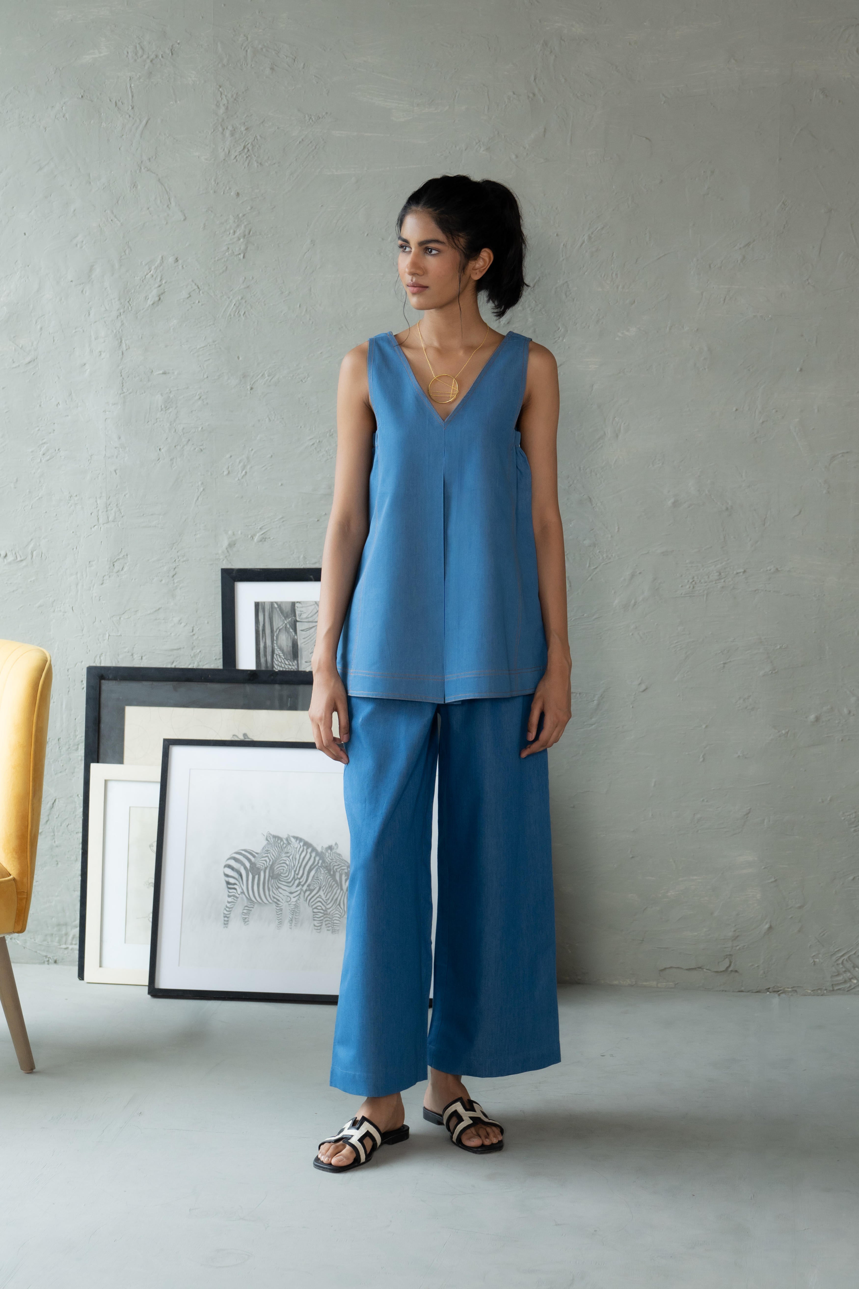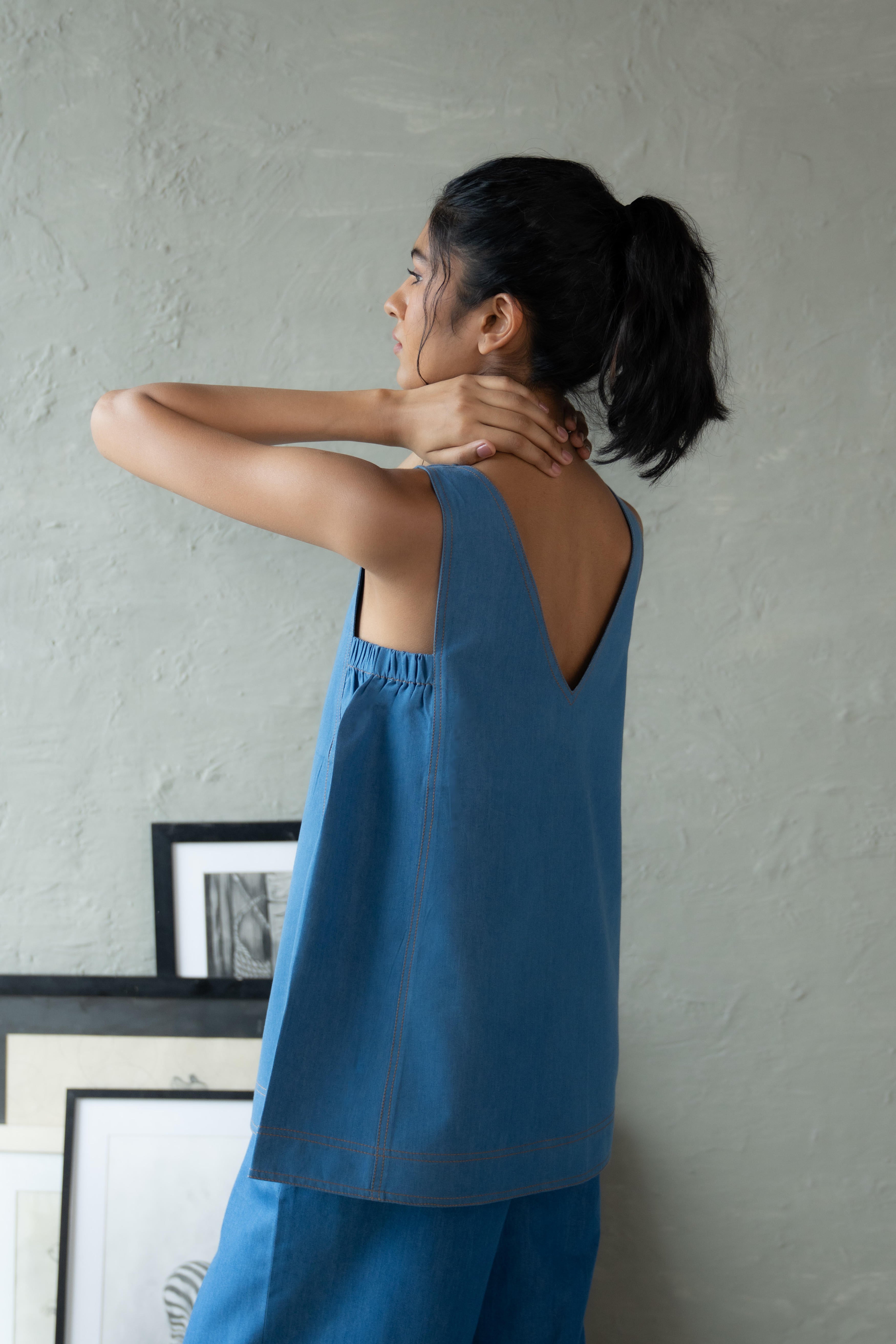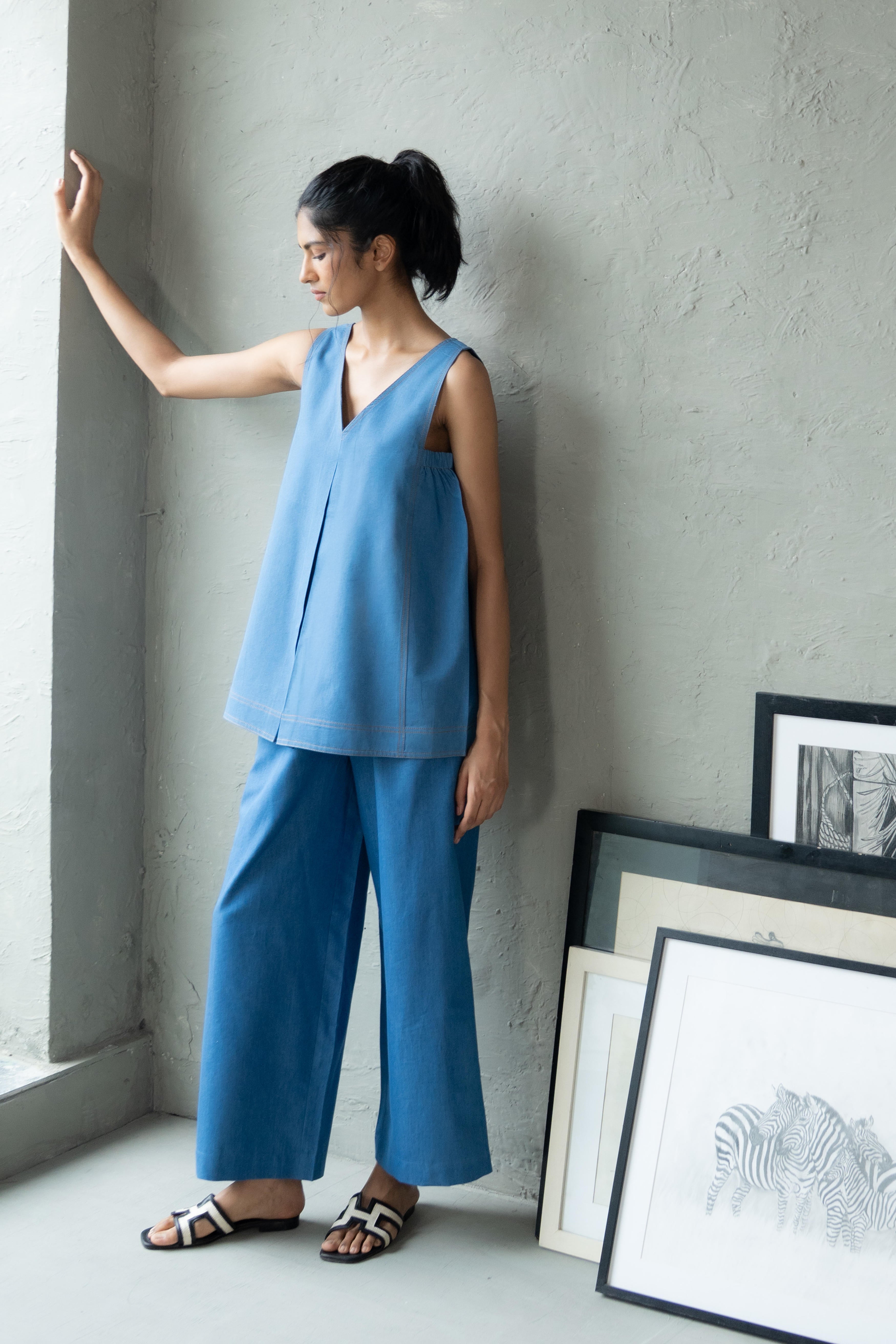 The Explorer’s Note Set in lightweight denim is designed for movement and ease. The sleeveless top features a graceful A-line silhouette with a V-neckline, enhanced by a front inward pleat and elasticated side panels that create soft gathers. Detailed contrast stitching adds subtle intrigue. Paired with matching flared pants, finished with a broad elasticate and a drawstring waist and functional side pockets, this set blends comfort with effortless style—perfect for everyday explorations. Model is 5.9".