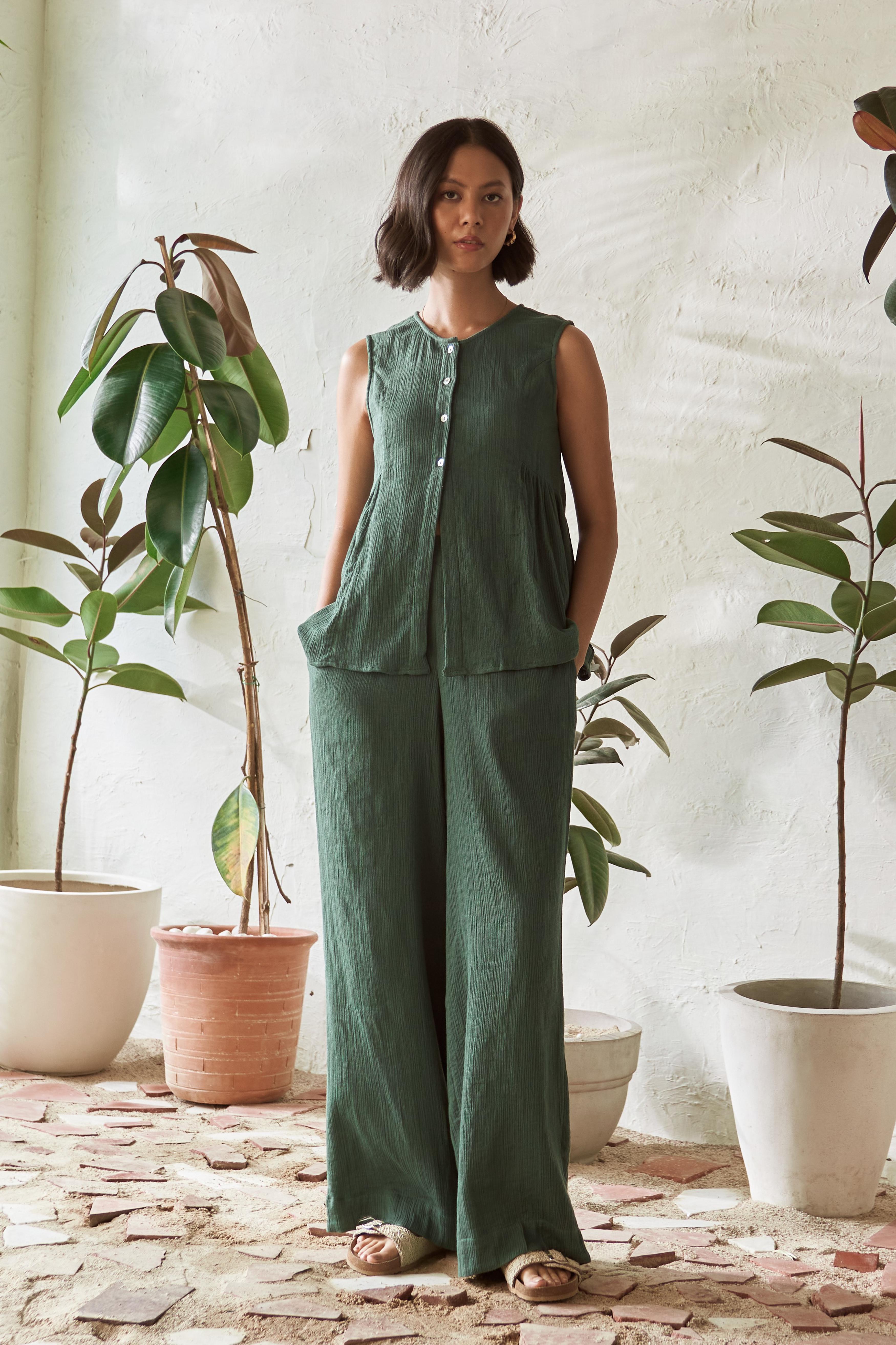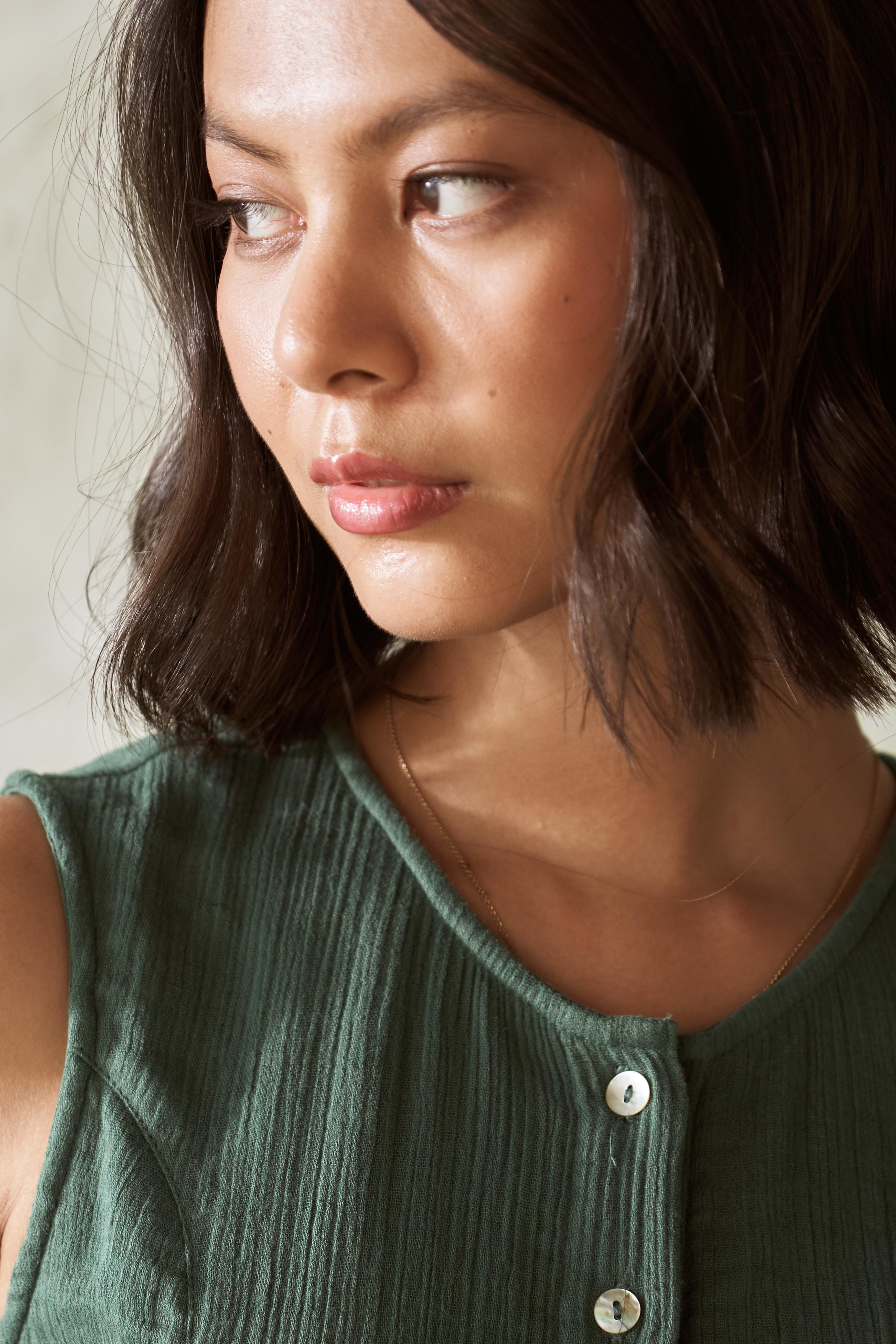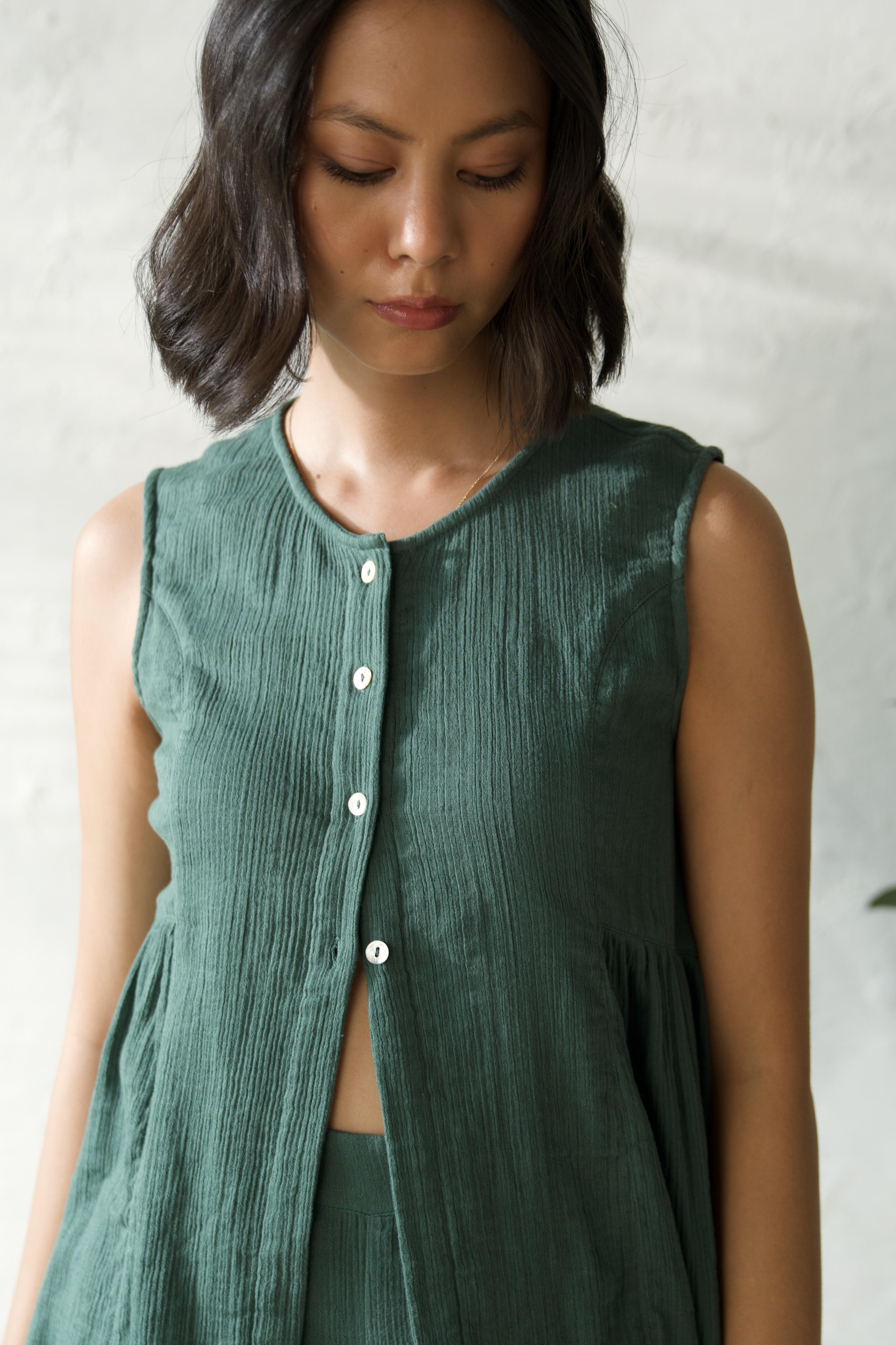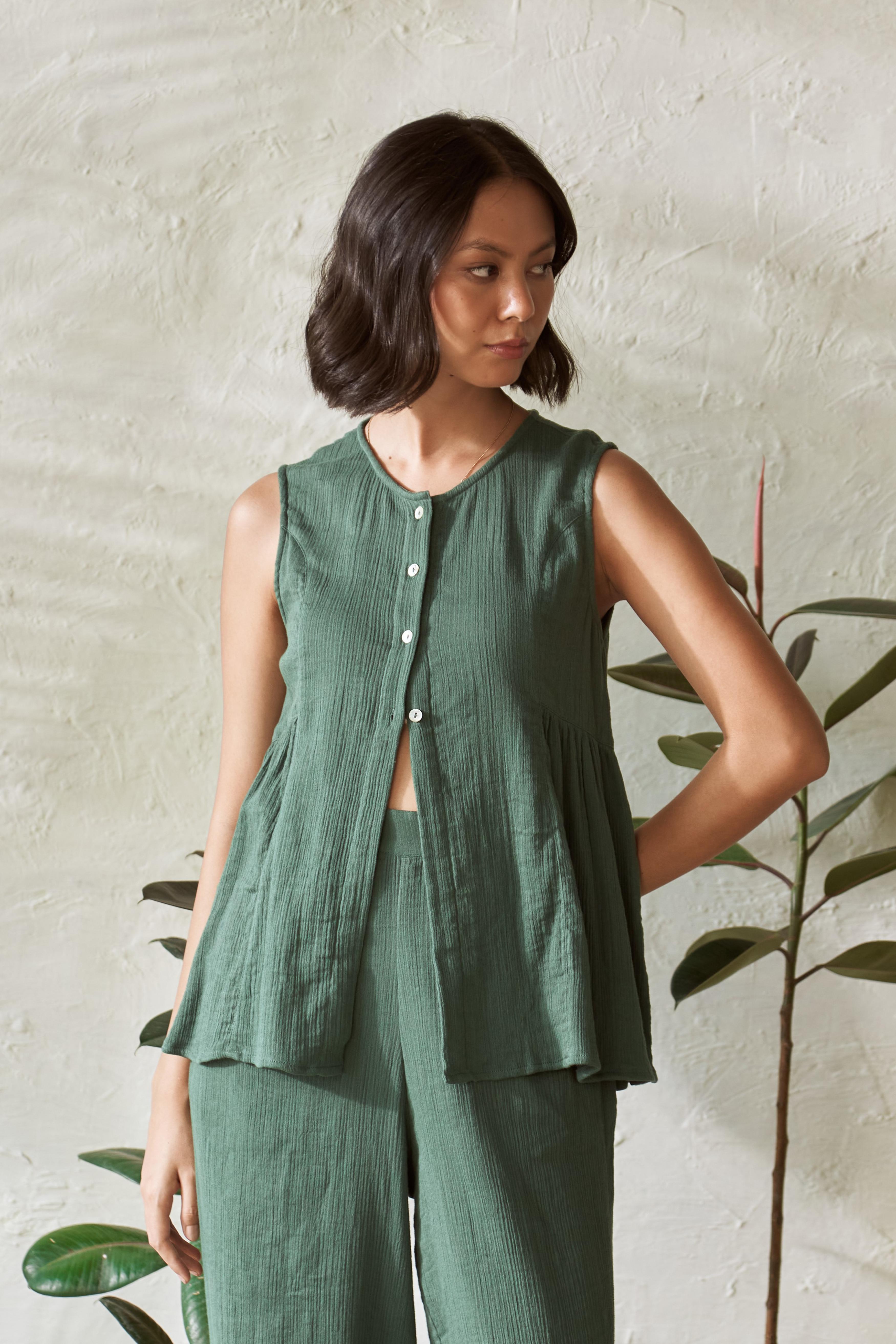 This side gathered top is a versatile and easy-to-wear garment for everyday comfort. With gathered detailing under the arm and a sleeveless design, this top exudes effortless style. The full placket features five buttons, adding a touch of sophistication, while the rest of the placket remains open for a relaxed look.