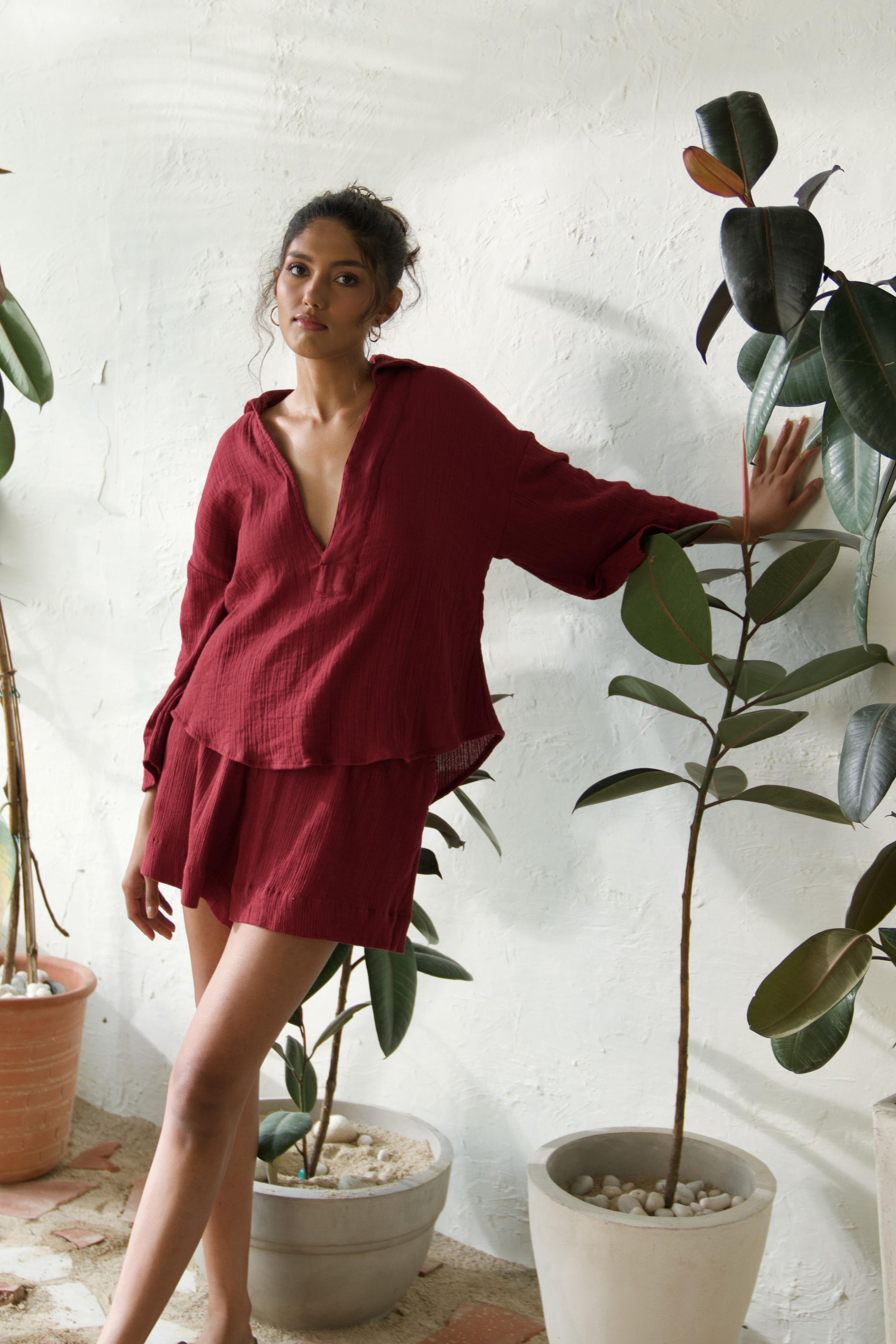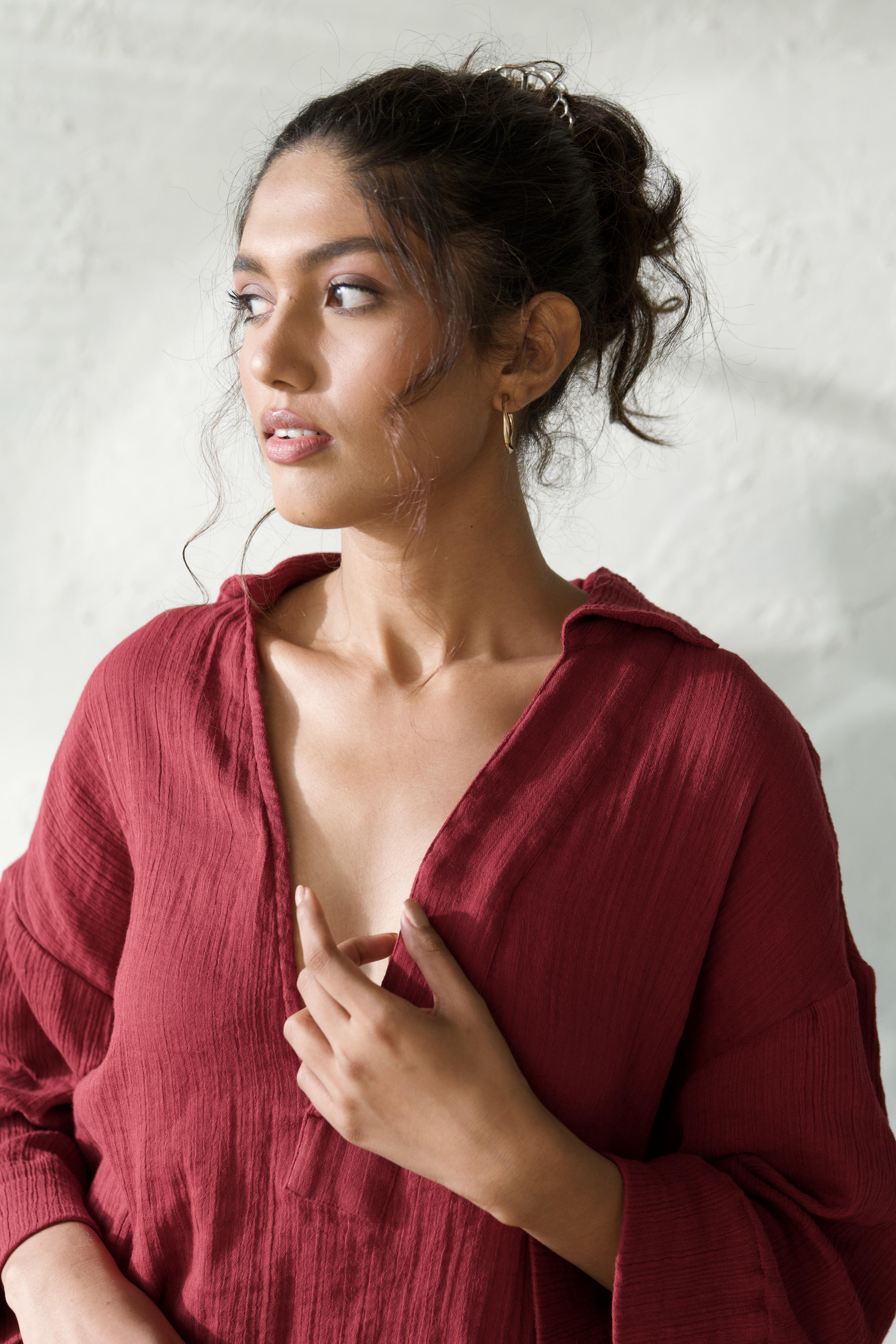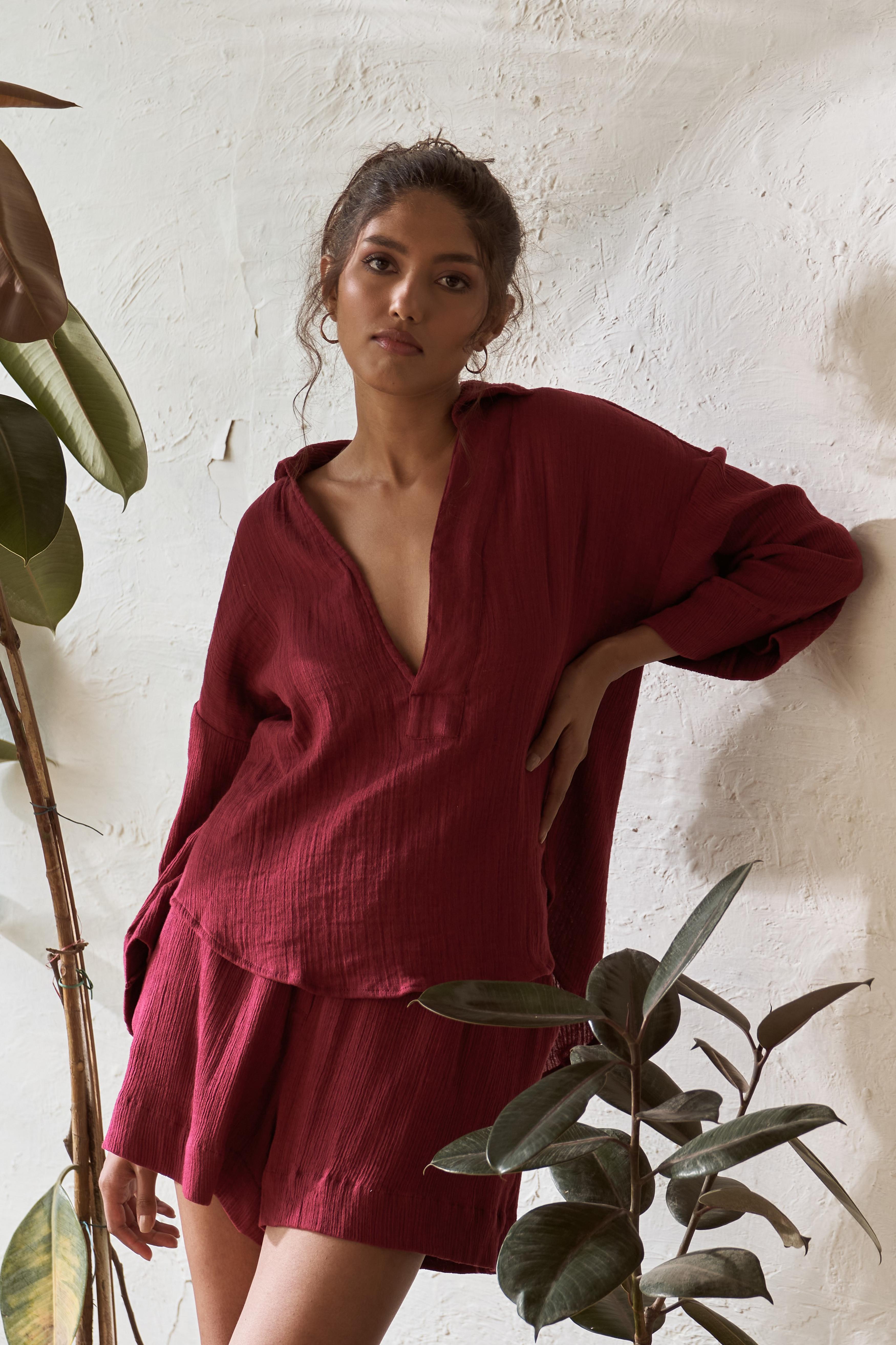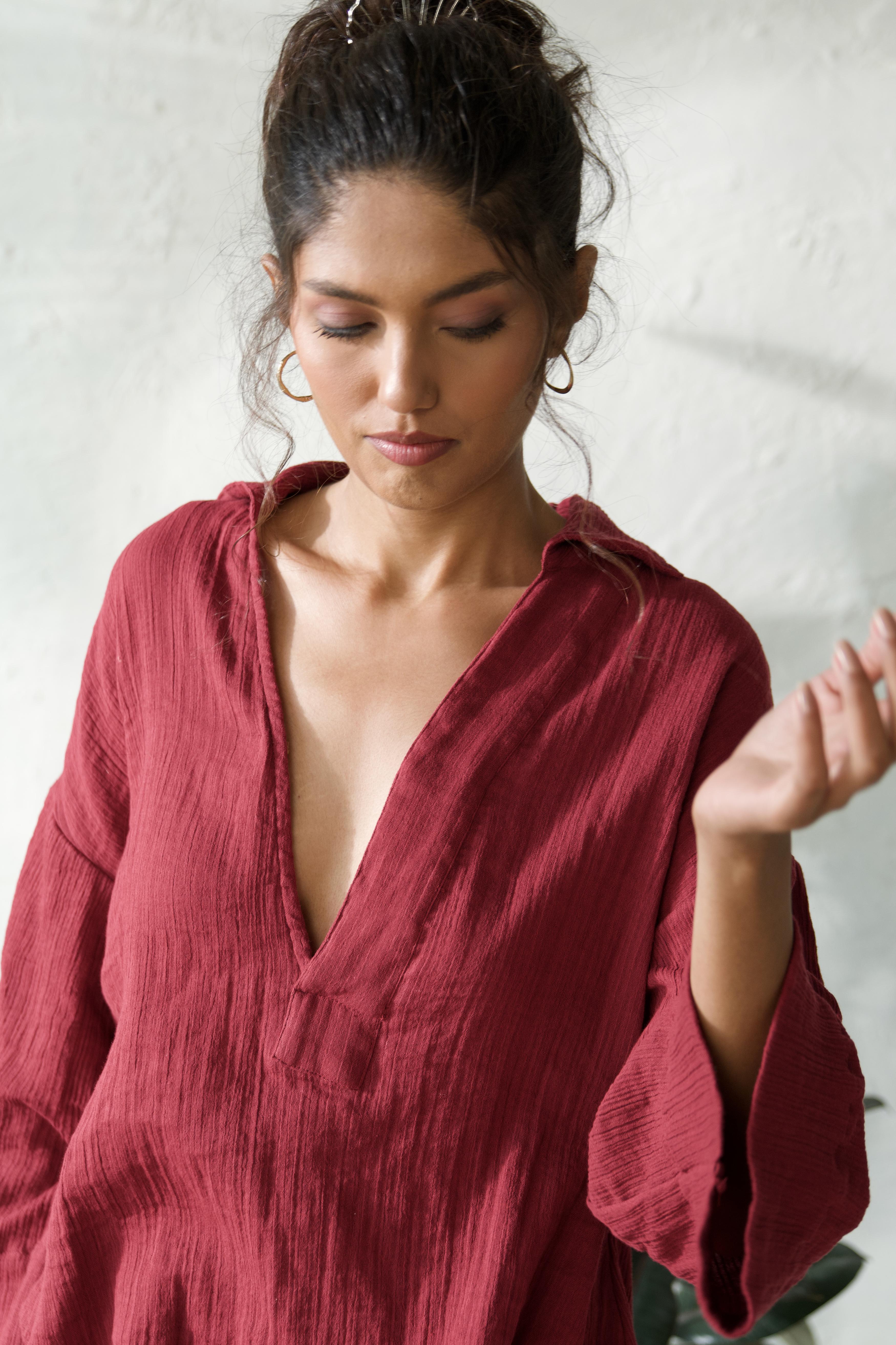 Picture this trendy top with a single placket, a deep neckline, and short sleeves that hit just above the elbow. This top is perfect for adding a touch of style to your outfit. The deep neck adds a hint of allure, while the single placket offers a chic detail. With its versatile three-fourth sleeves, this top is a great choice for a casual yet fashionable look. Pair it with your favorite bottoms for a stylish and comfortable ensemble that's perfect for any occasion. Styling Note: A complementing underlayer maybe needed for the deep-neck top.