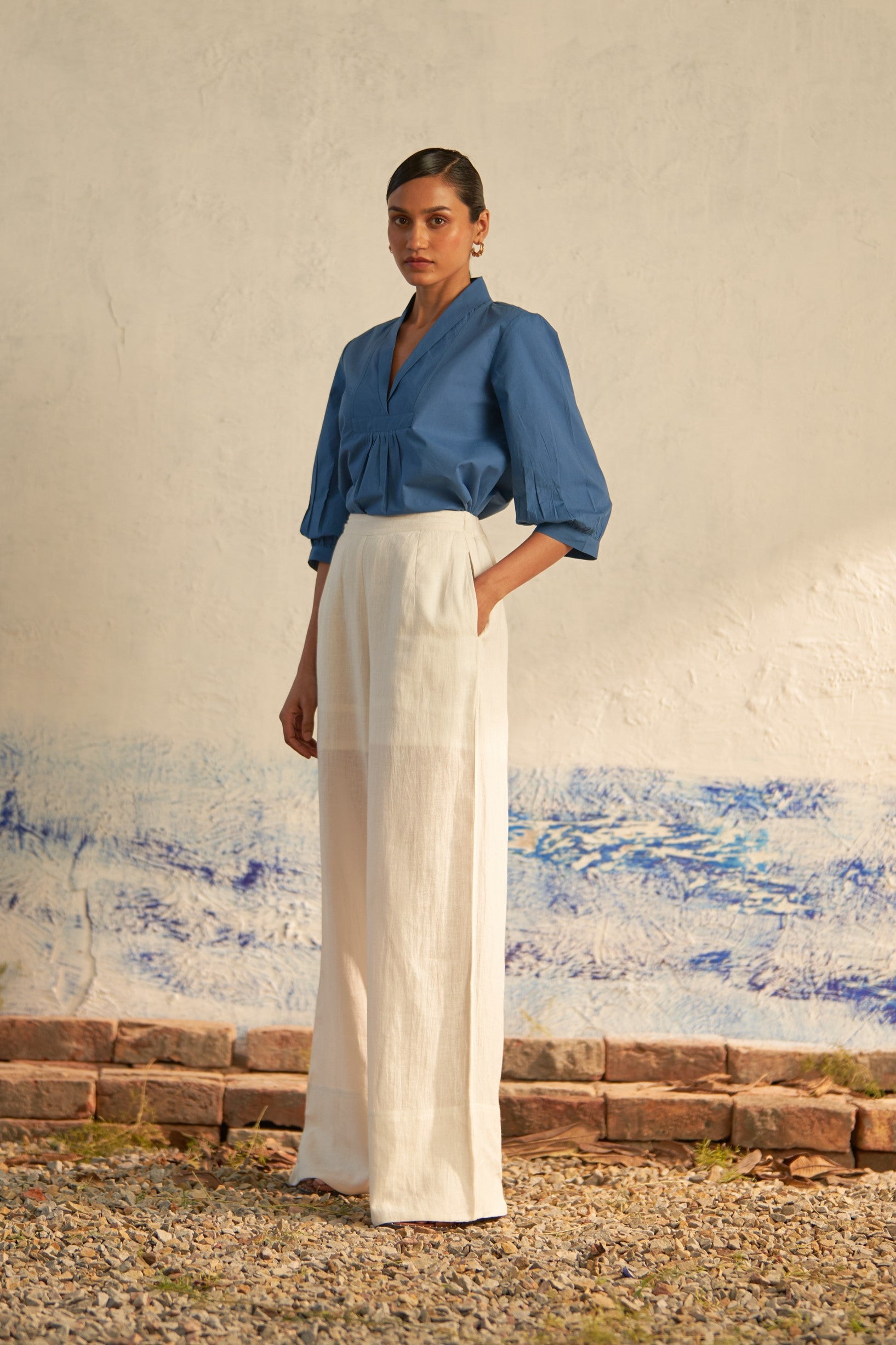 Elevate your casual wardrobe with the ultimate versatility of these textured pants made from flex fabric. In timeless white, they effortlessly pair with any top for endless styling possibilities. Featuring wide, full-length legs with chic broad folds at the bottom, these pants exude contemporary flair. The half elasticated waistband offer a comfortable fit, ensuring you stay stylish and relaxed during leisurely outings.