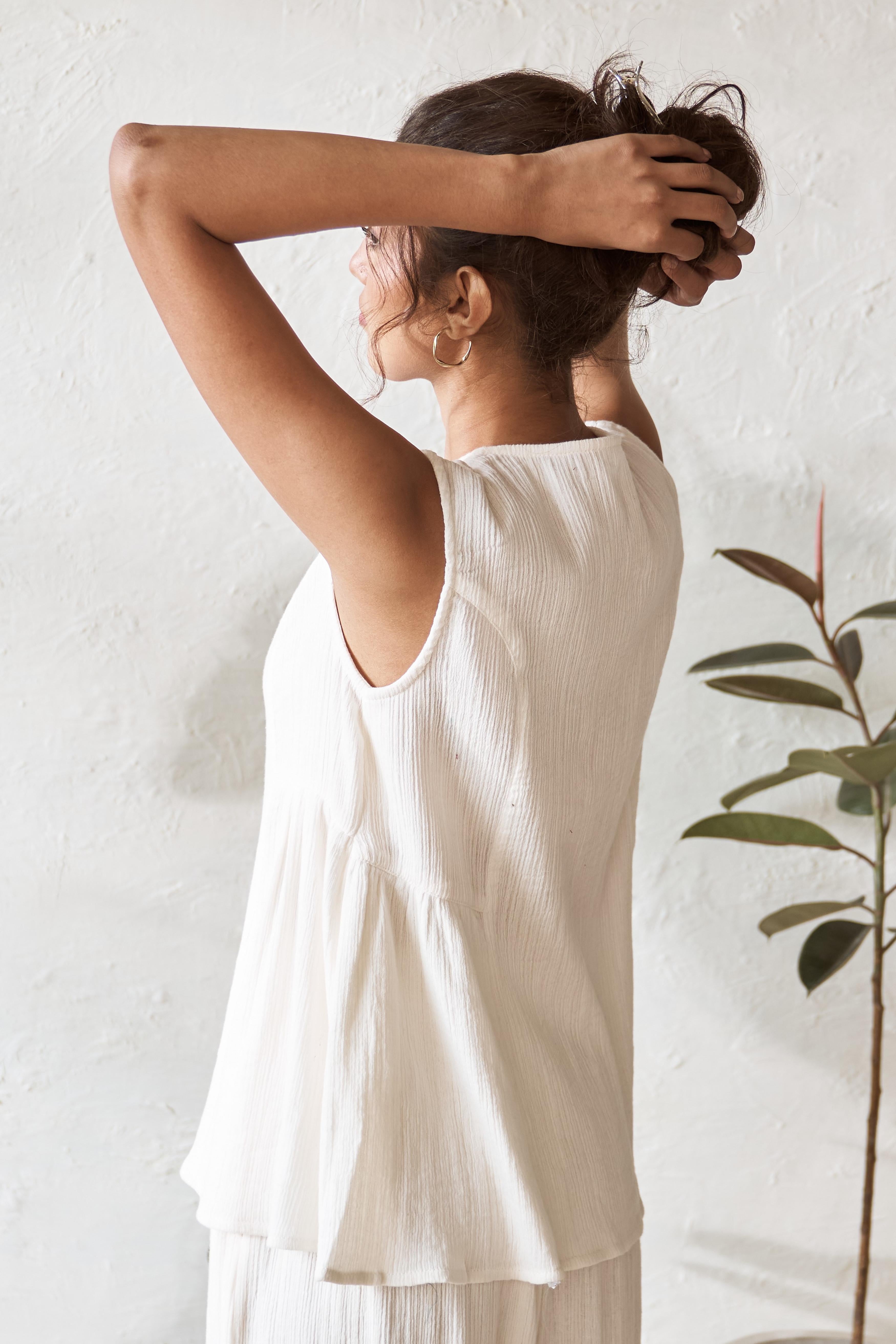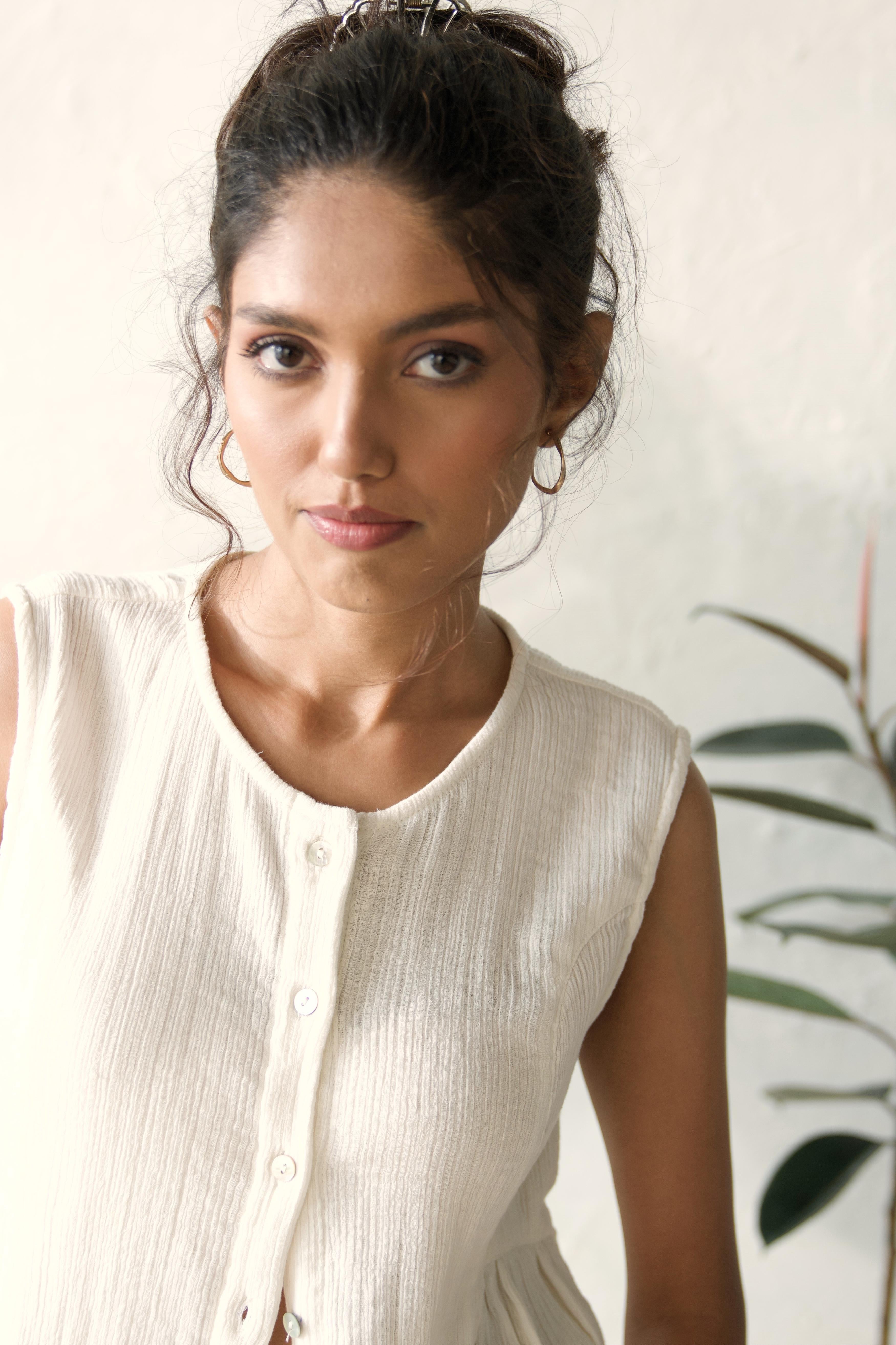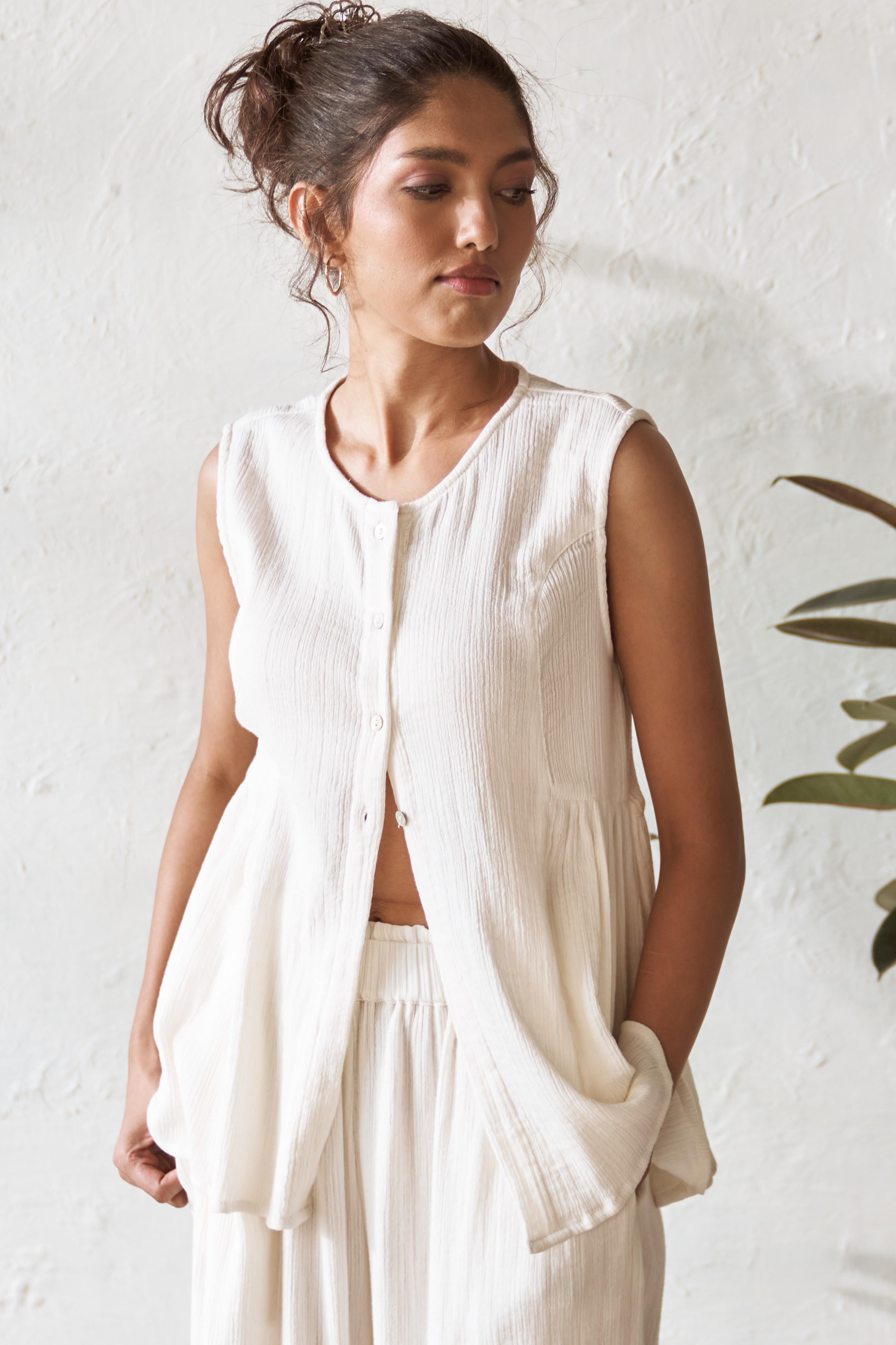 A versatile piece perfect for any wardrobe. Designed with a stylish gathered detail under the arm, this sleeveless top offers a flattering silhouette that effortlessly combines comfort and elegance. The top features a full placket with five buttons, allowing you to adjust the neckline to your preference, while the remaining open placket adds a relaxed, laid-back vibe. Ideal for both smart and casual occasions, this top is your go-to choice for everyday wear with a hint of sophistication. Styling Note: This outfit may be slightly transparent in certain lighting, complementing underlayer maybe needed.
