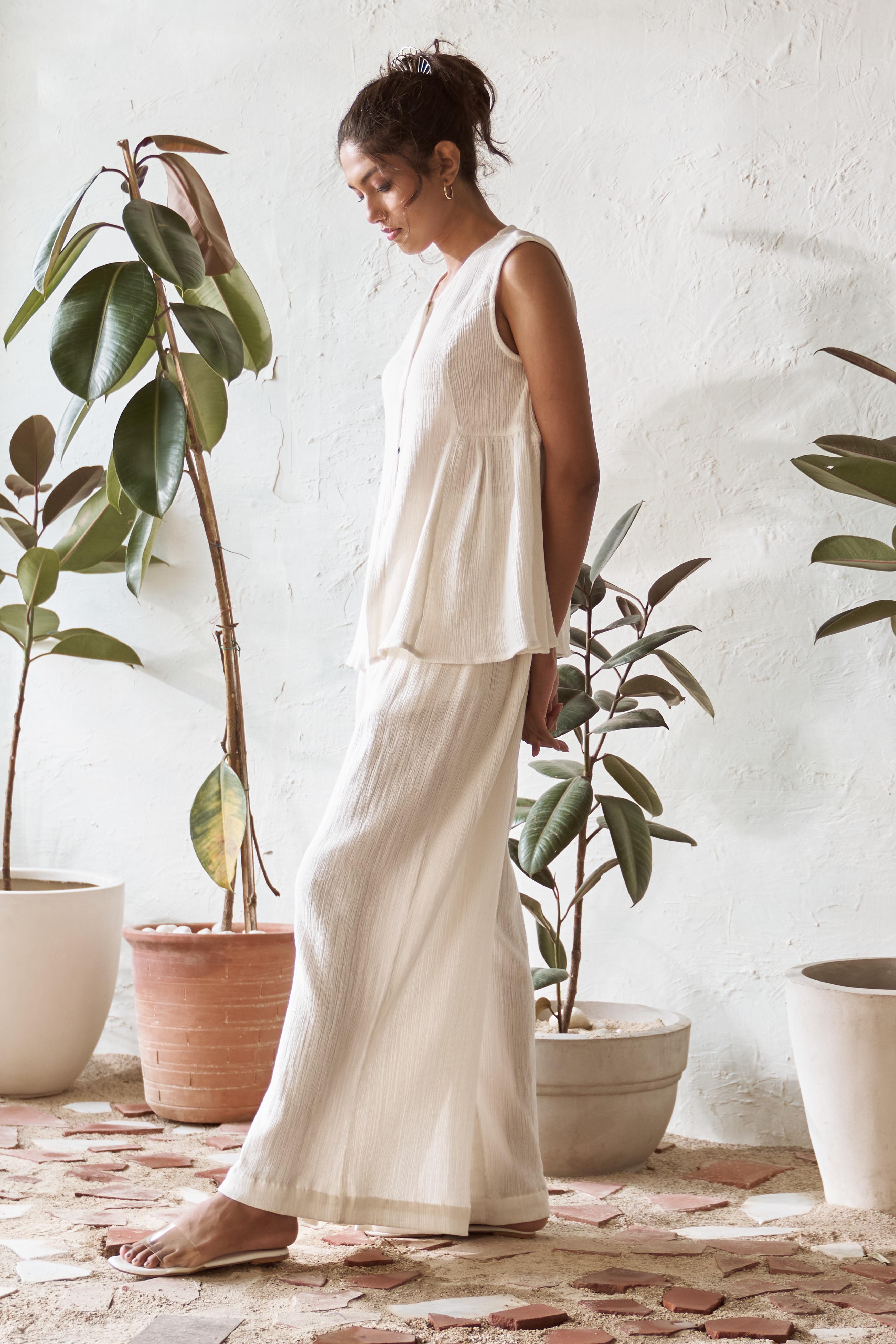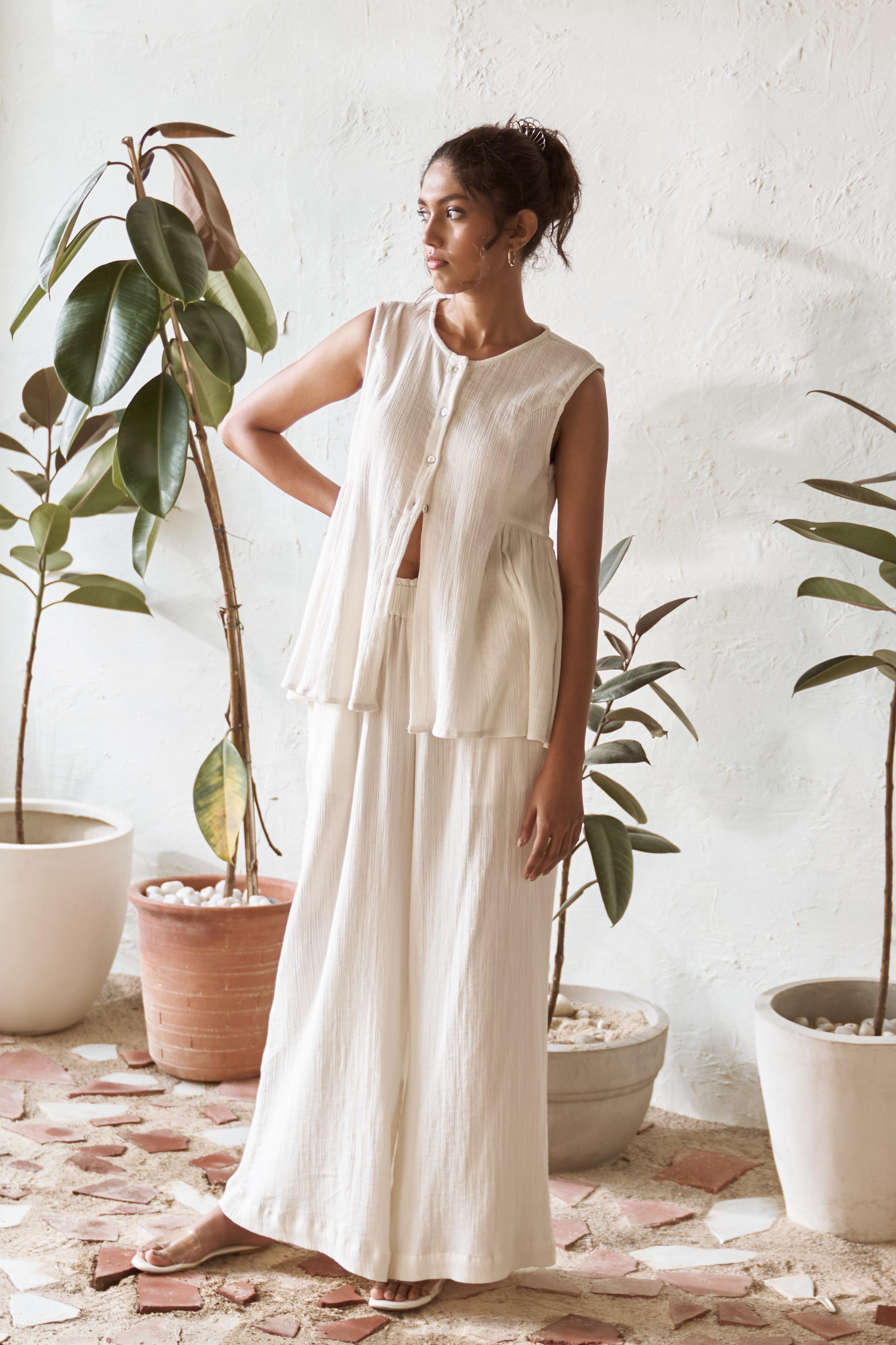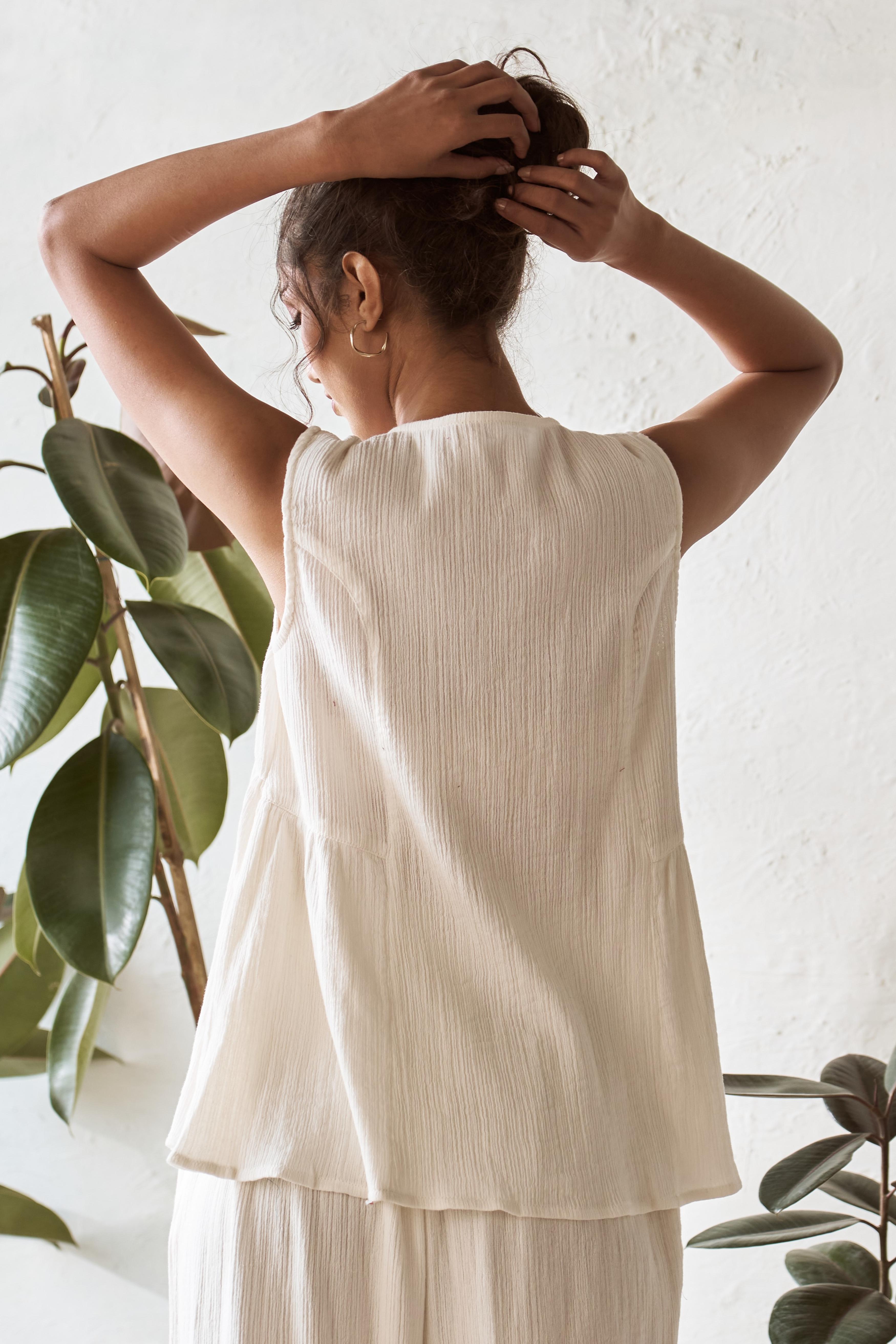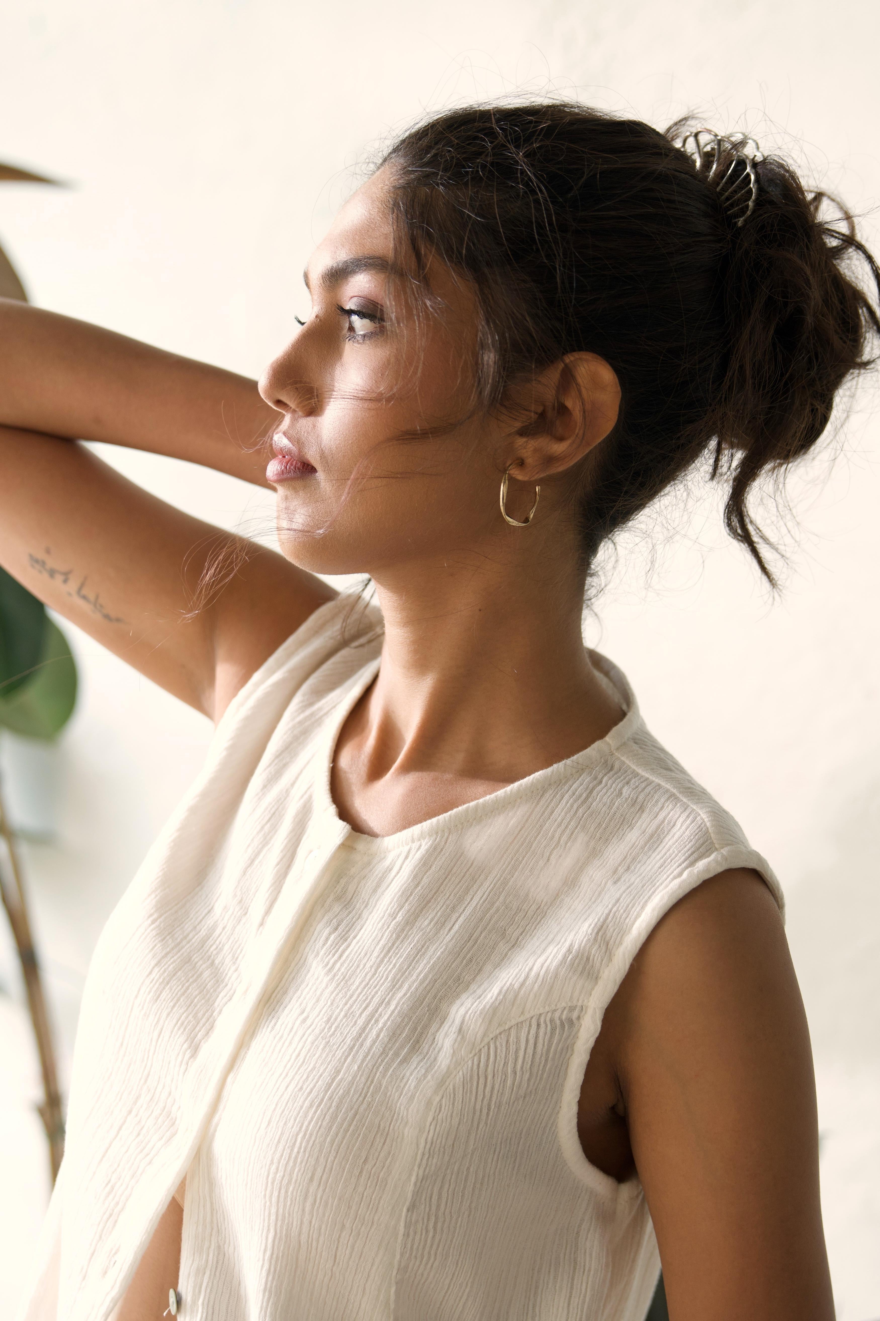 A versatile piece perfect for any wardrobe. Designed with a stylish gathered detail under the arm, this sleeveless top offers a flattering silhouette that effortlessly combines comfort and elegance. The top features a full placket with five buttons, allowing you to adjust the neckline to your preference, while the remaining open placket adds a relaxed, laid-back vibe. Ideal for both smart and casual occasions, this top is your go-to choice for everyday wear with a hint of sophistication. Styling Note: This outfit may be slightly transparent in certain lighting, complementing underlayer maybe needed.