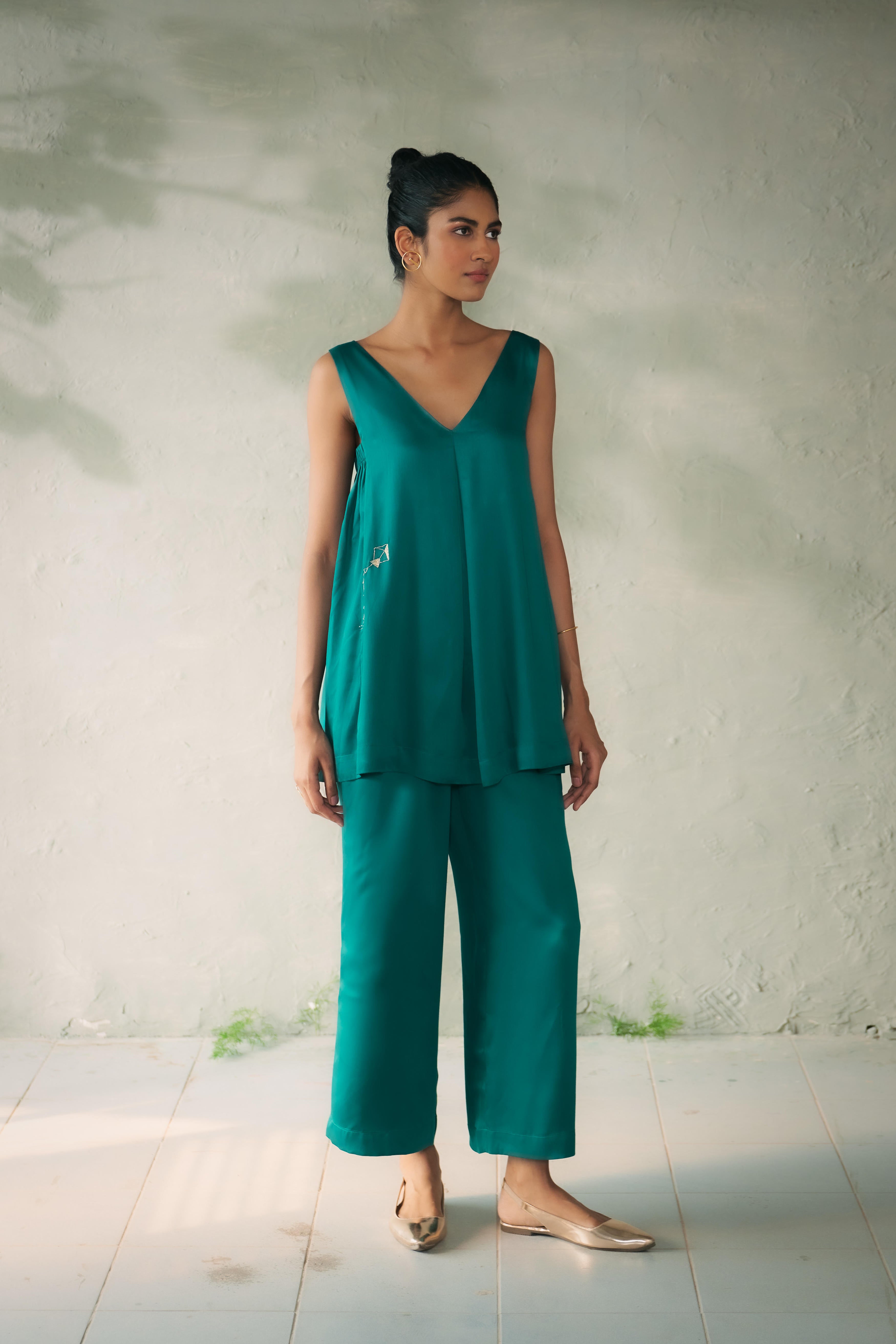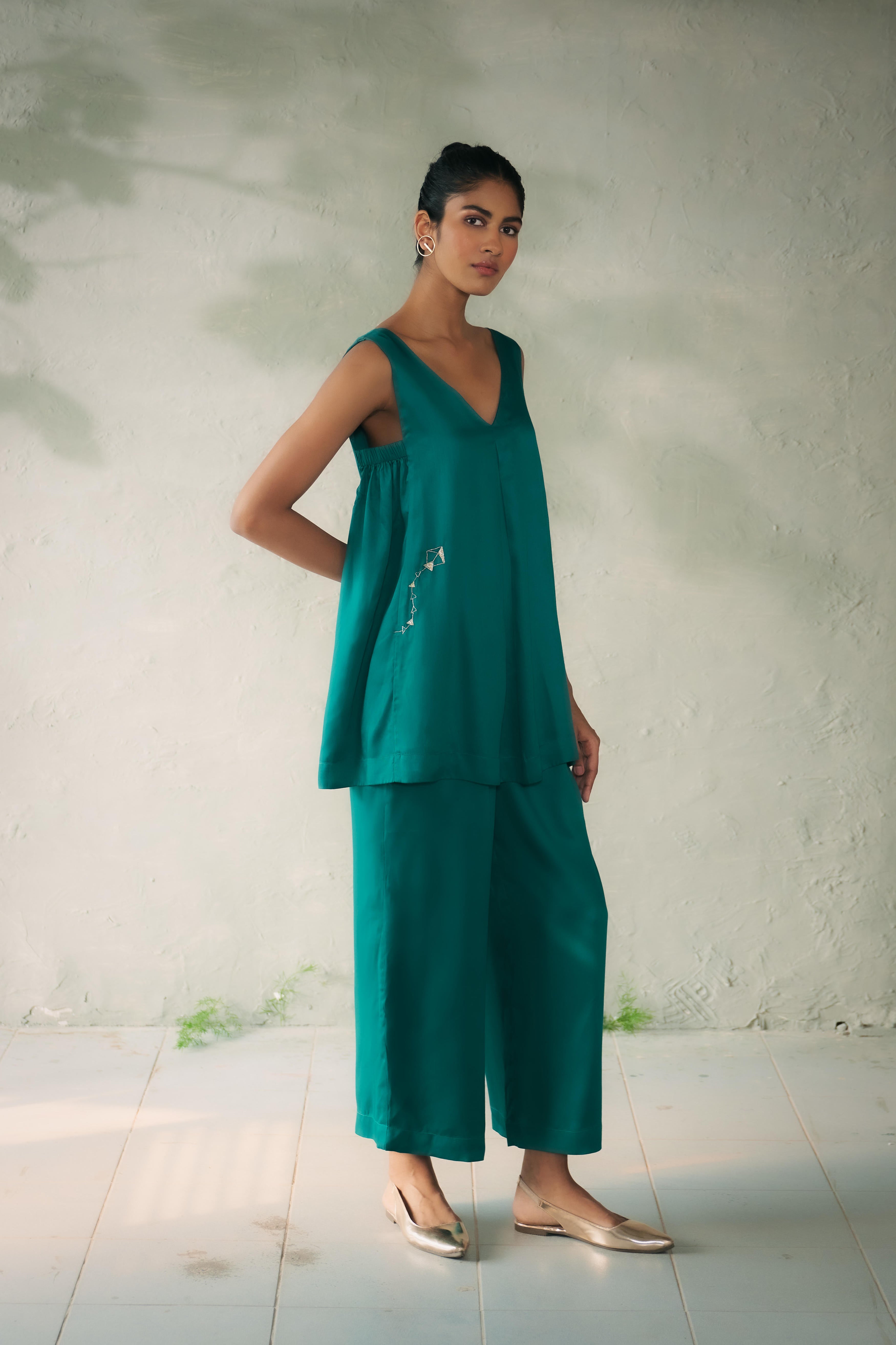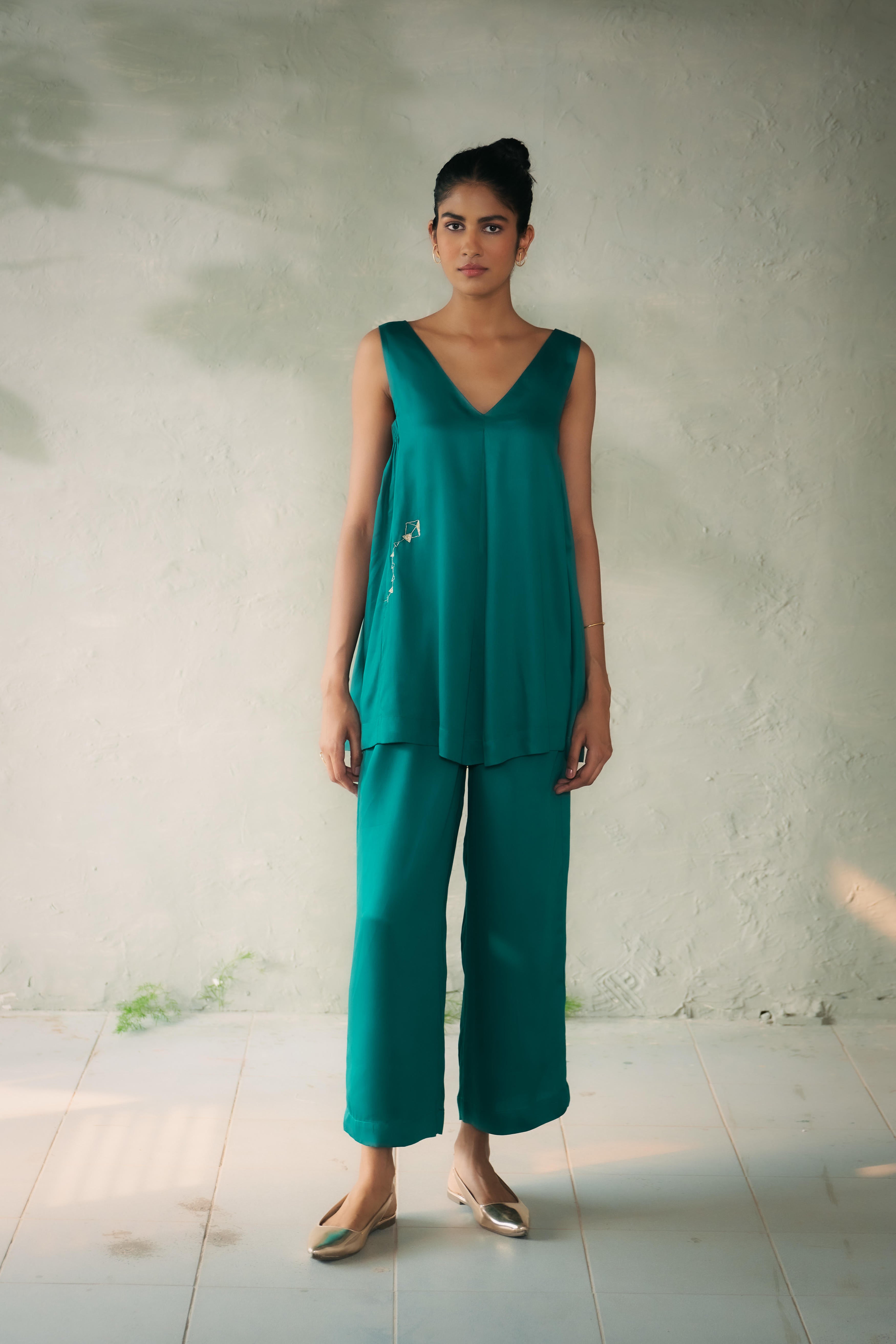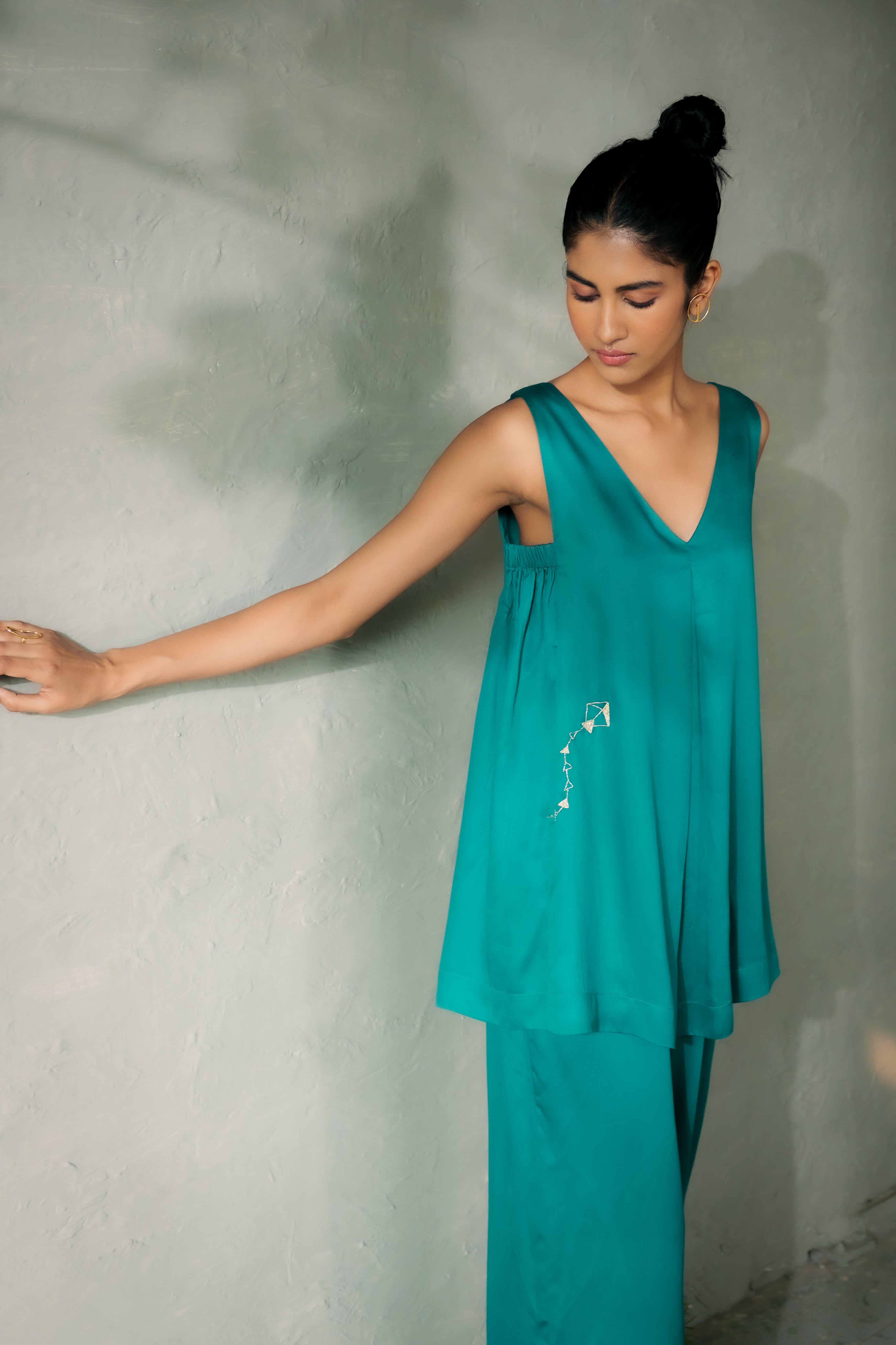 Confident and fluid, the Fly High Co-ord Set in deep emerald brings a touch of skyward spirit to grounded style. The sleeveless top features an elegant A-line silhouette with a V-neckline, front inward pleat, and soft side gathering through elasticated panels — designed for ease and quiet charm. A delicately hand-embroidered flying kite motif elevates the piece with celebratory subtlety. Paired with wide-flared matching pants with an elasticated drawstring waistband and side pockets, this set is made for movement — and moments that rise above. Model is 5'10" & wearing Size 'S'