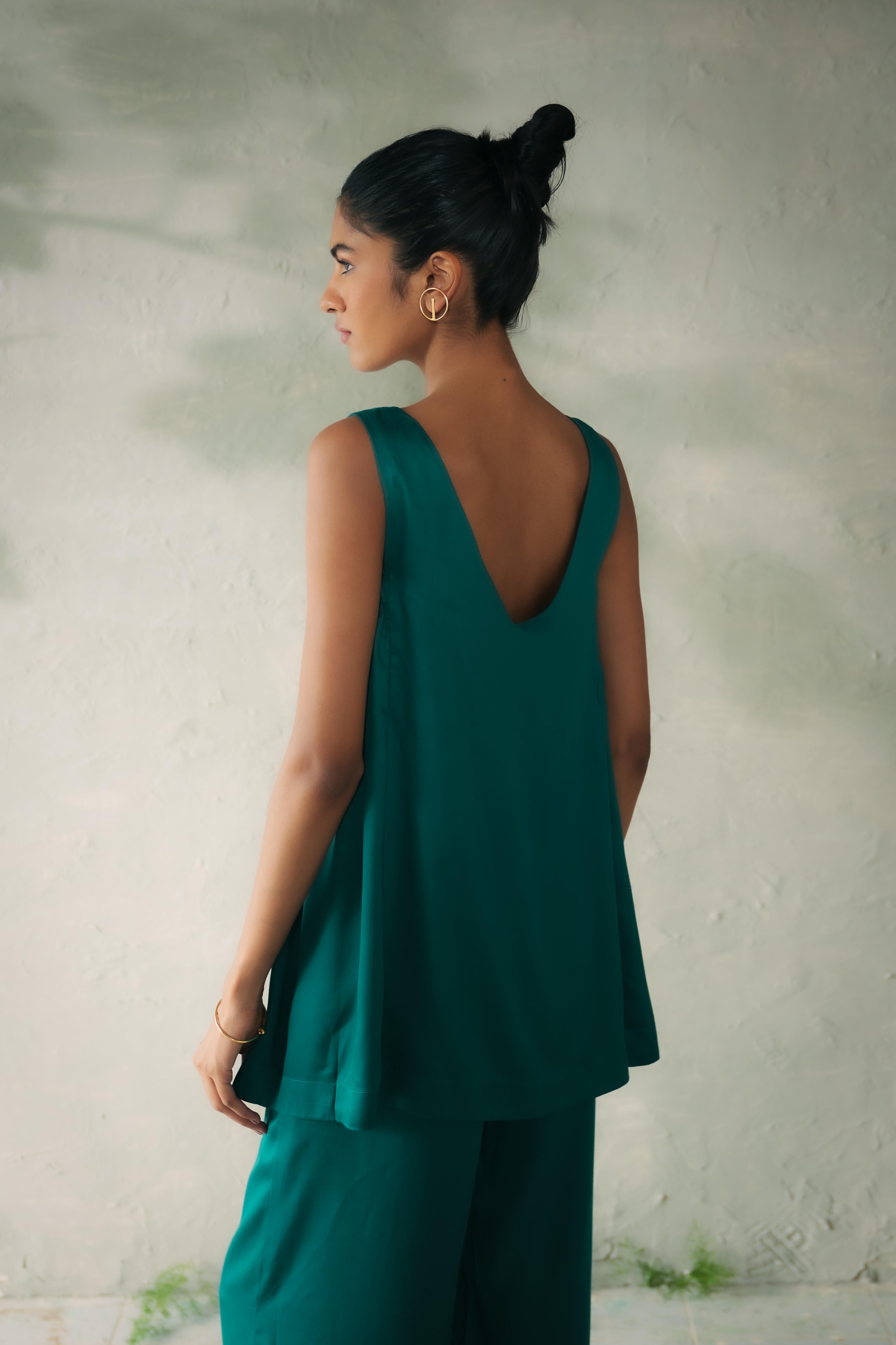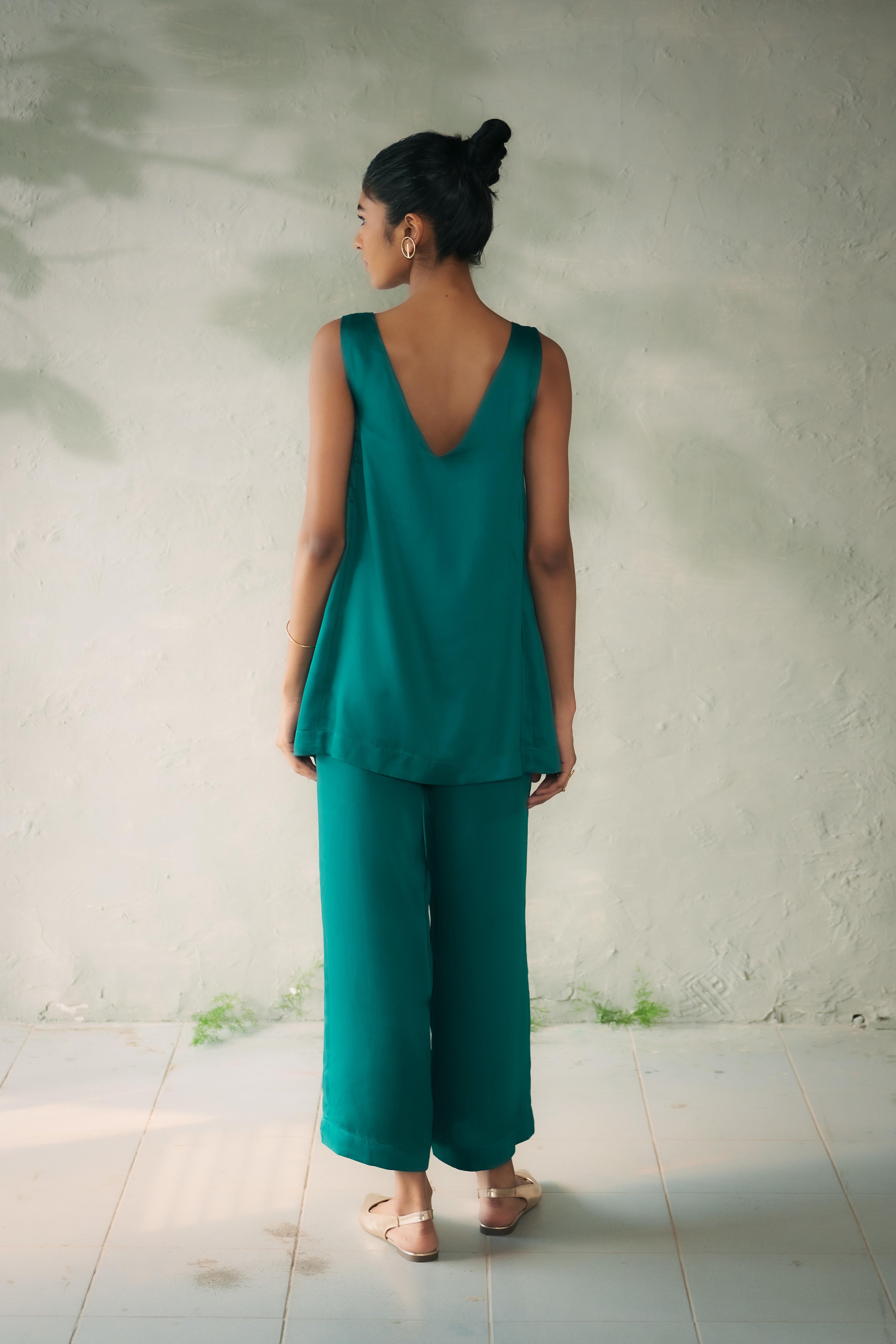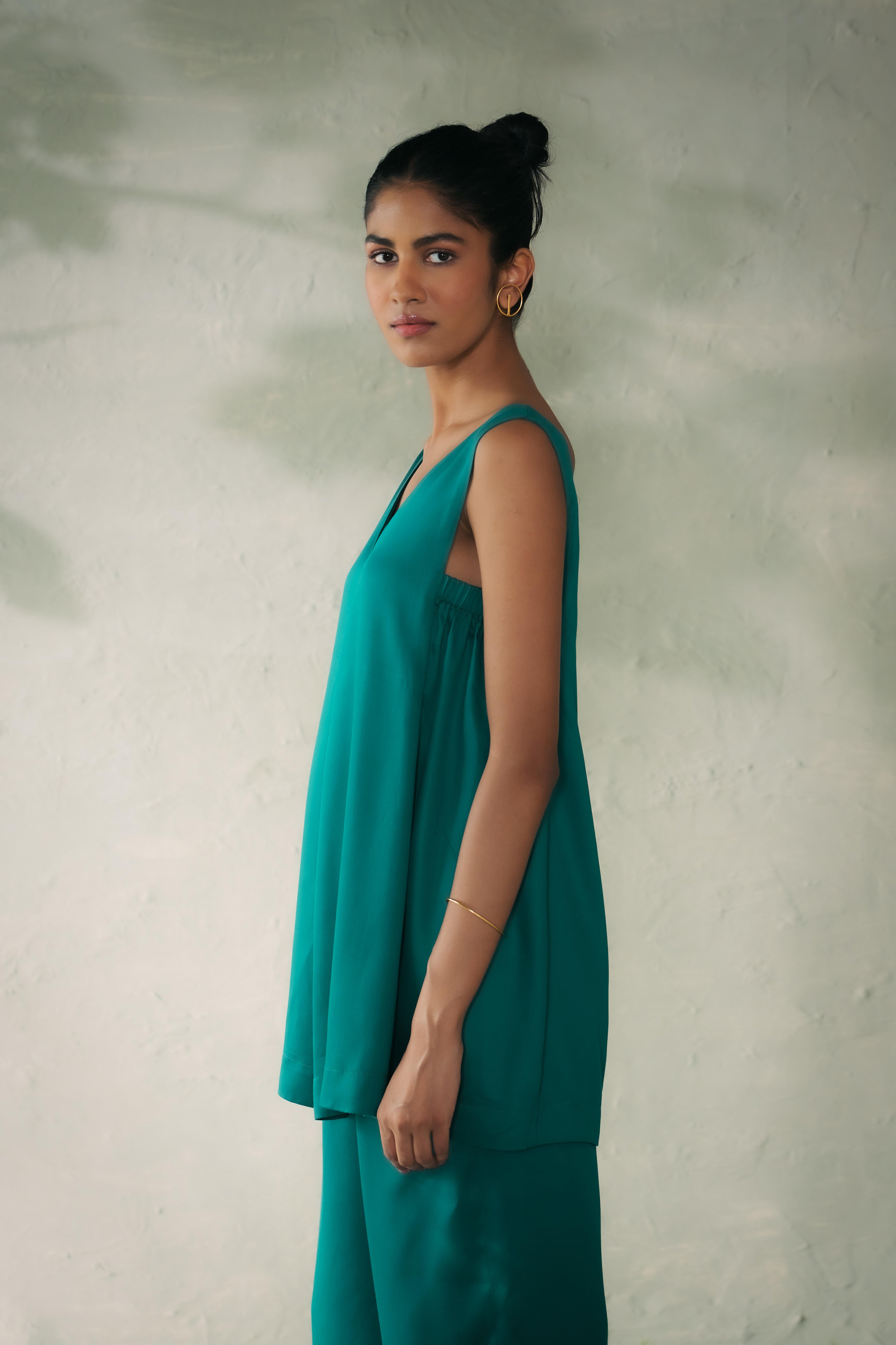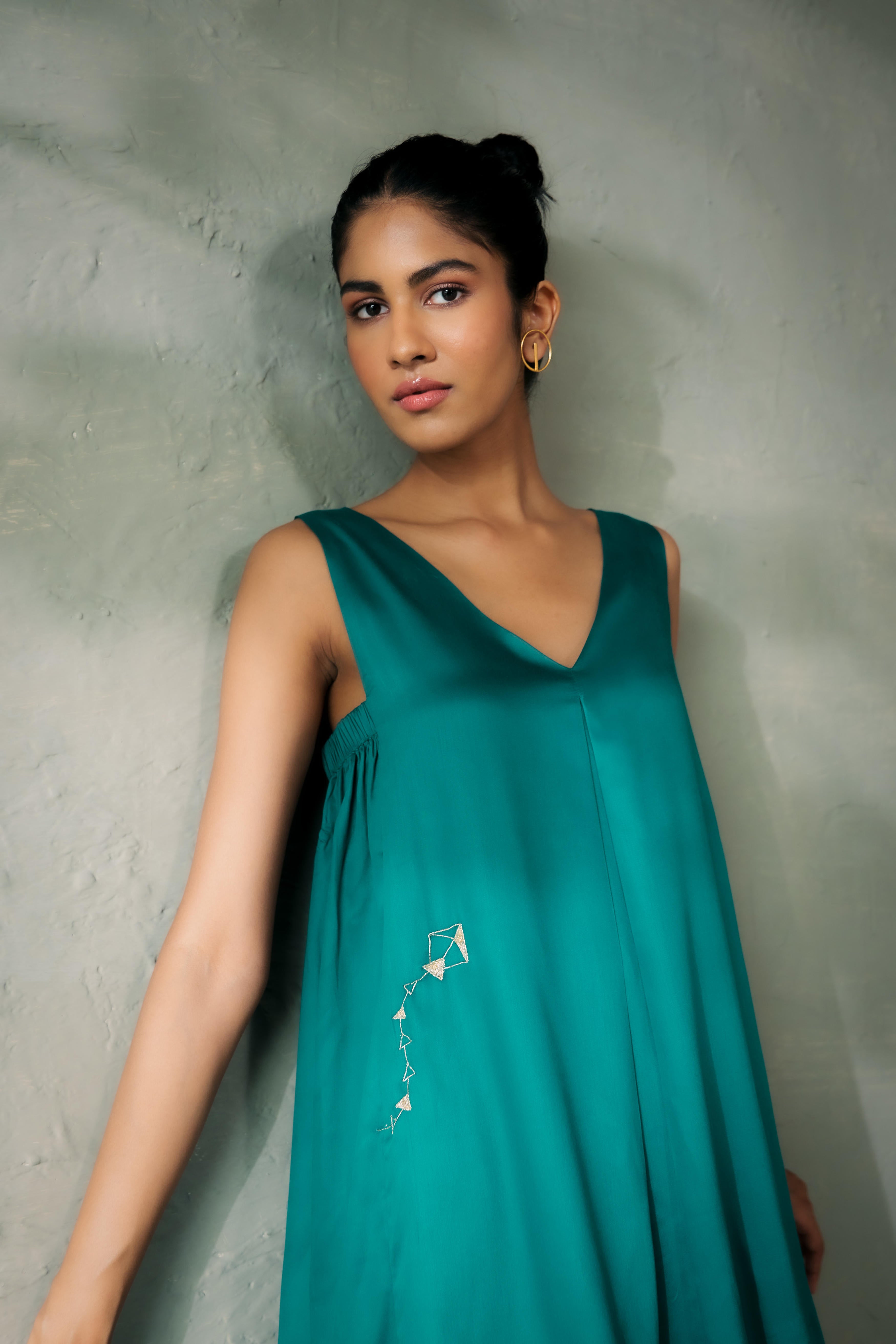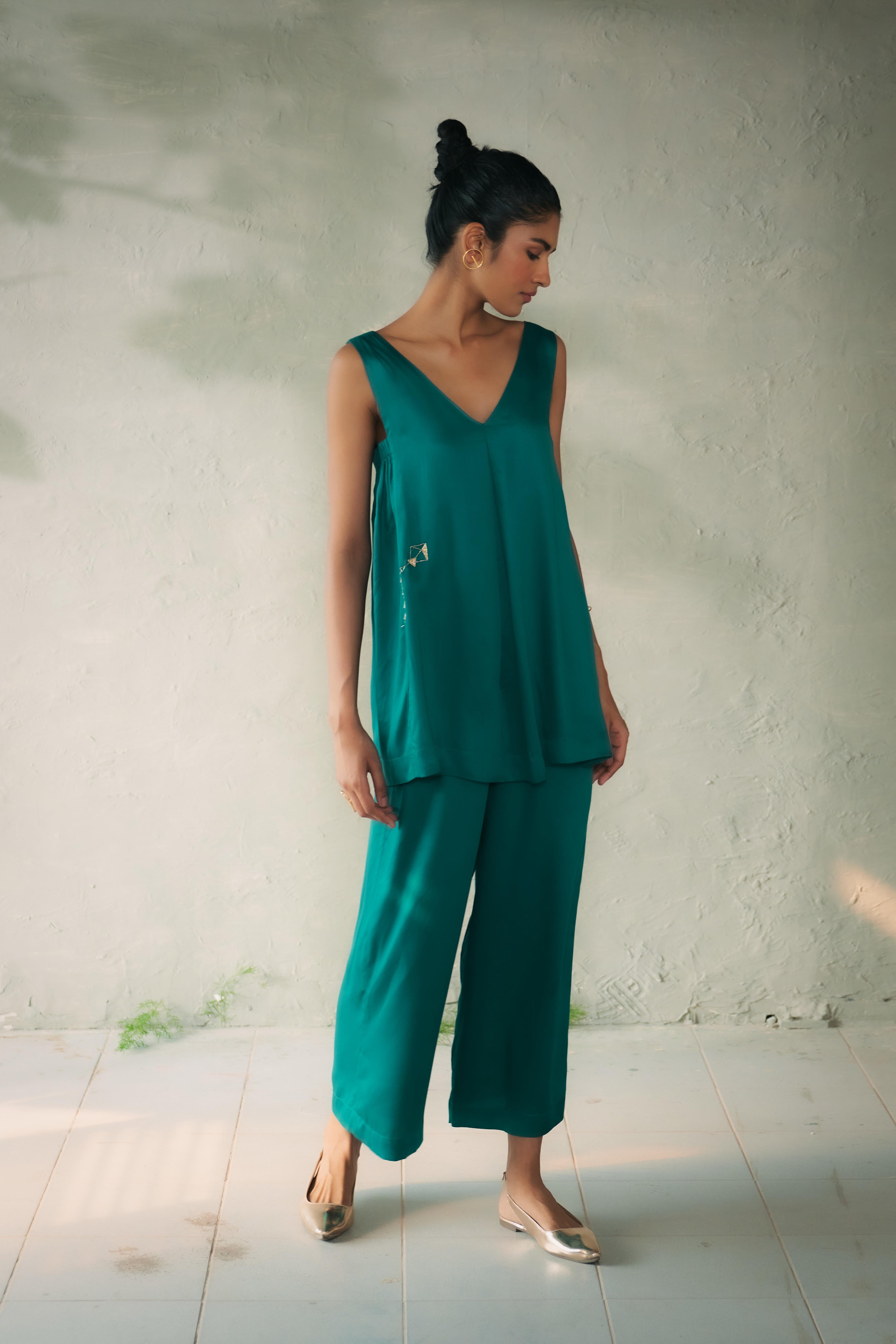 Confident and fluid, the Fly High Co-ord Set in deep emerald brings a touch of skyward spirit to grounded style. The sleeveless top features an elegant A-line silhouette with a V-neckline, front inward pleat, and soft side gathering through elasticated panels — designed for ease and quiet charm. A delicately hand-embroidered flying kite motif elevates the piece with celebratory subtlety. Paired with wide-flared matching pants with an elasticated drawstring waistband and side pockets, this set is made for movement — and moments that rise above. Model is 5'10" & wearing Size 'S'