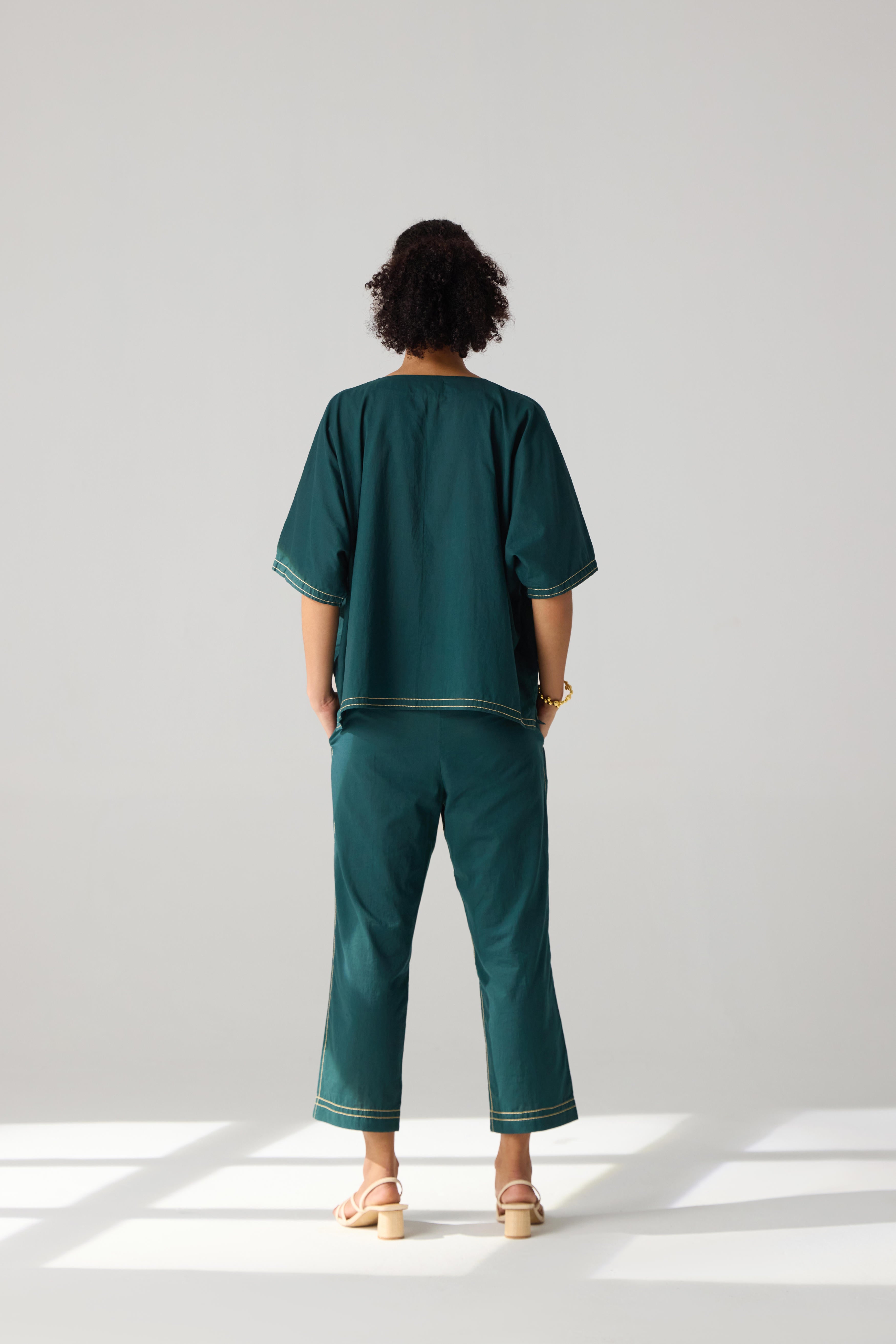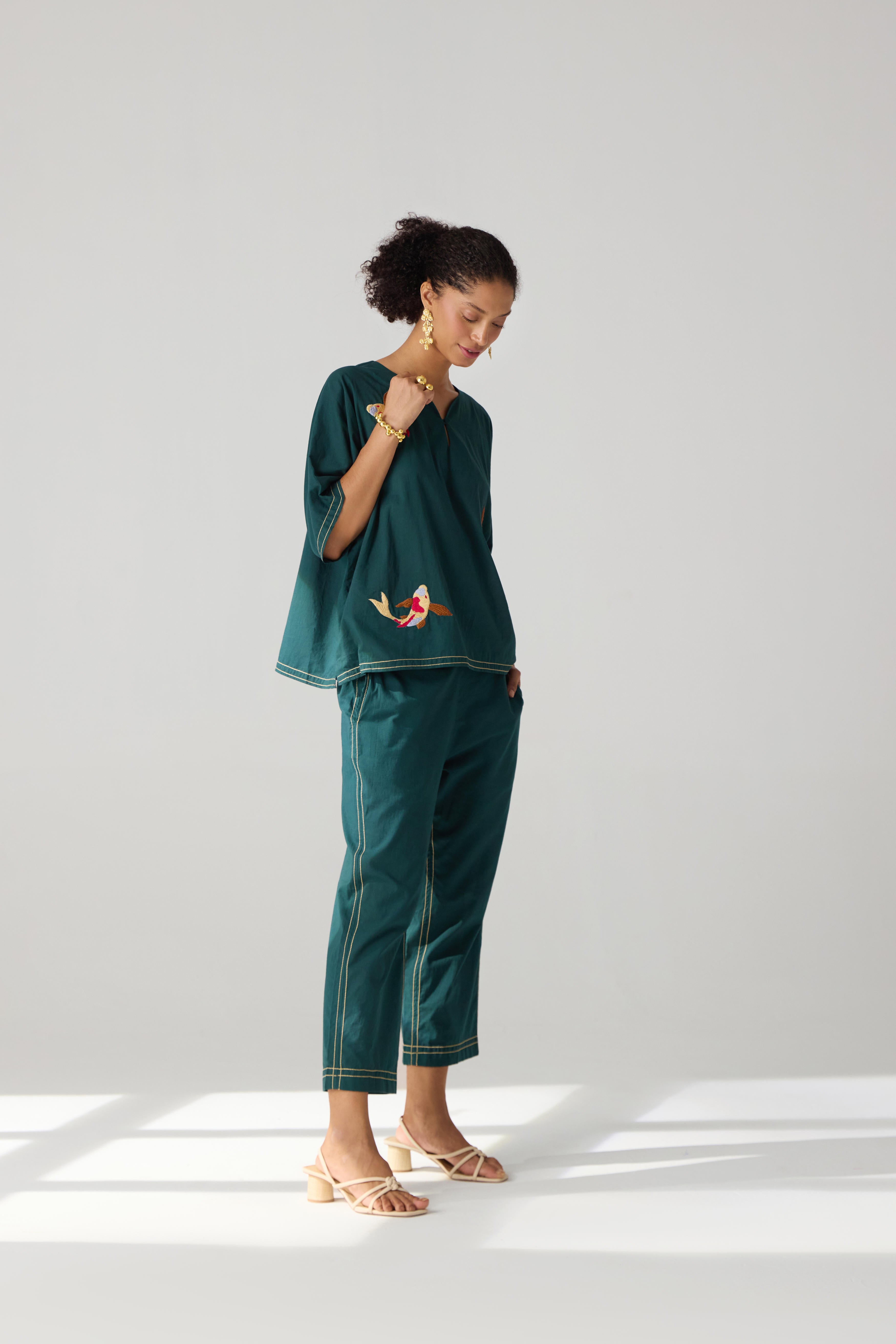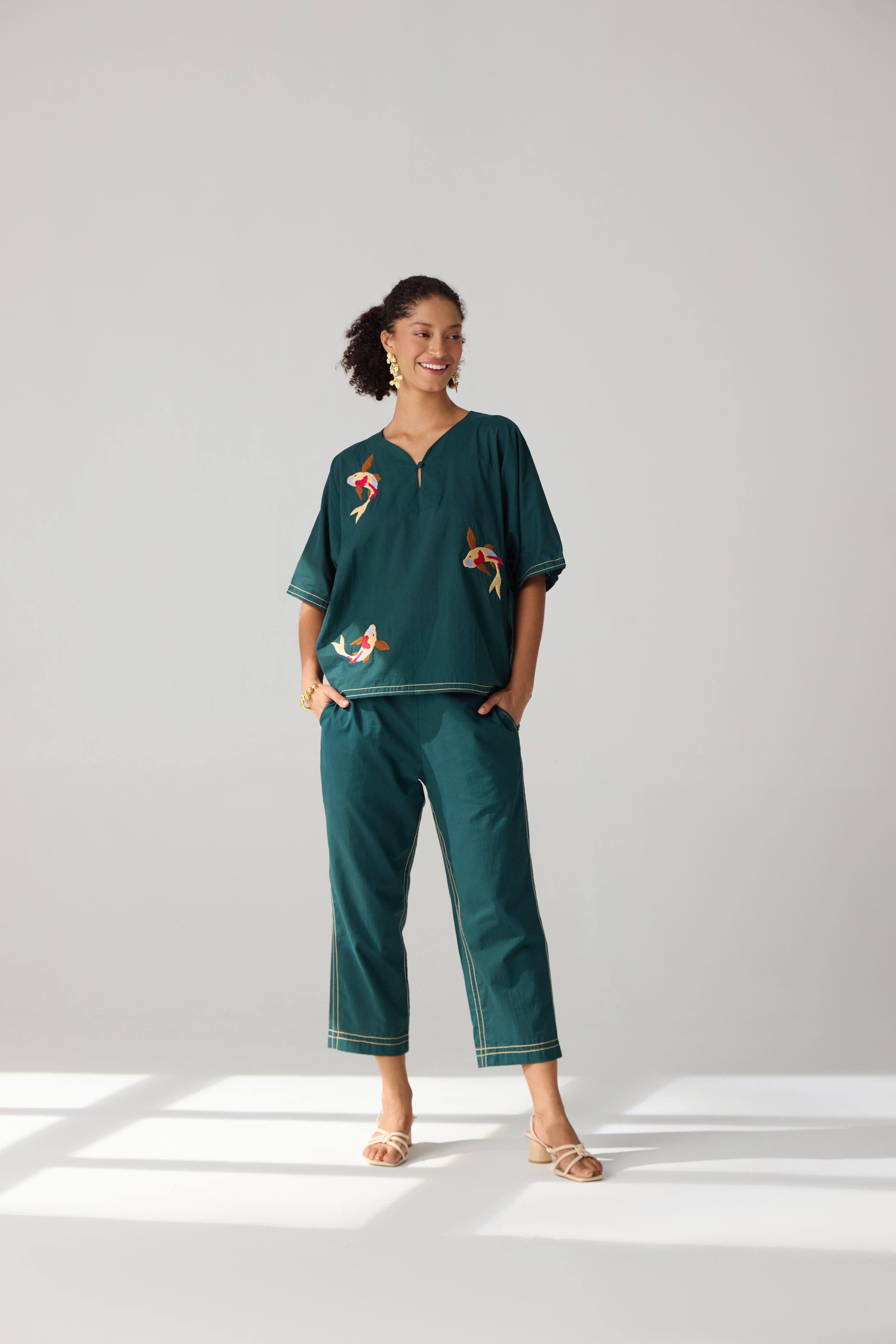 Co-ord Set with hand-embroidered fish motifs and highlighted with contrast stitch featuring relaxed fit top paired with straight fit Pants. The top features kimono style sleeves and pants have curved insert pockets and half elasticated belt. This product will be exclusively handcrafted for you, making the pattern/texture/color slightly vary from the image shown, due to multiple artisan led techniques and processes involved. Color may also slightly vary due to photographic lighting sources. Top Length: 25" Pant Length: 36"