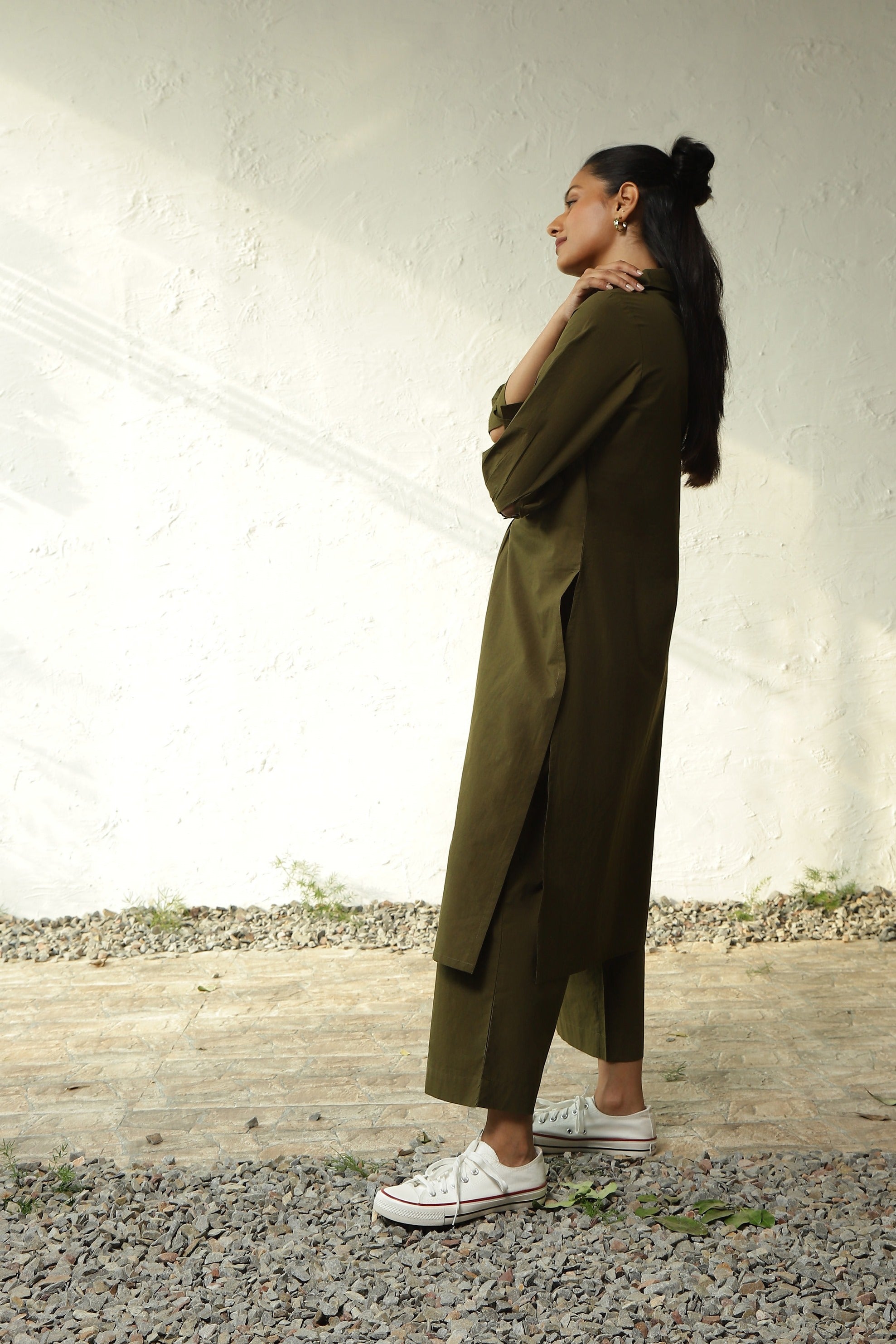 Prepare for a jungle exploration with our forest green front-buttoned co-ord set. Crafted from premium cotton poplin fabric, the kurta boasts a collared neckline and high side slits, forming a relaxed silhouette. The shell buttons and side seam pockets add a touch of elevated style. Paired perfectly with canoopi's drawstring pleated pants, featuring a comfortable elasticated waistband and inward box pleats that lead to wide legs, creating a breezy silhouette. Enjoy exploration in comfort and style.