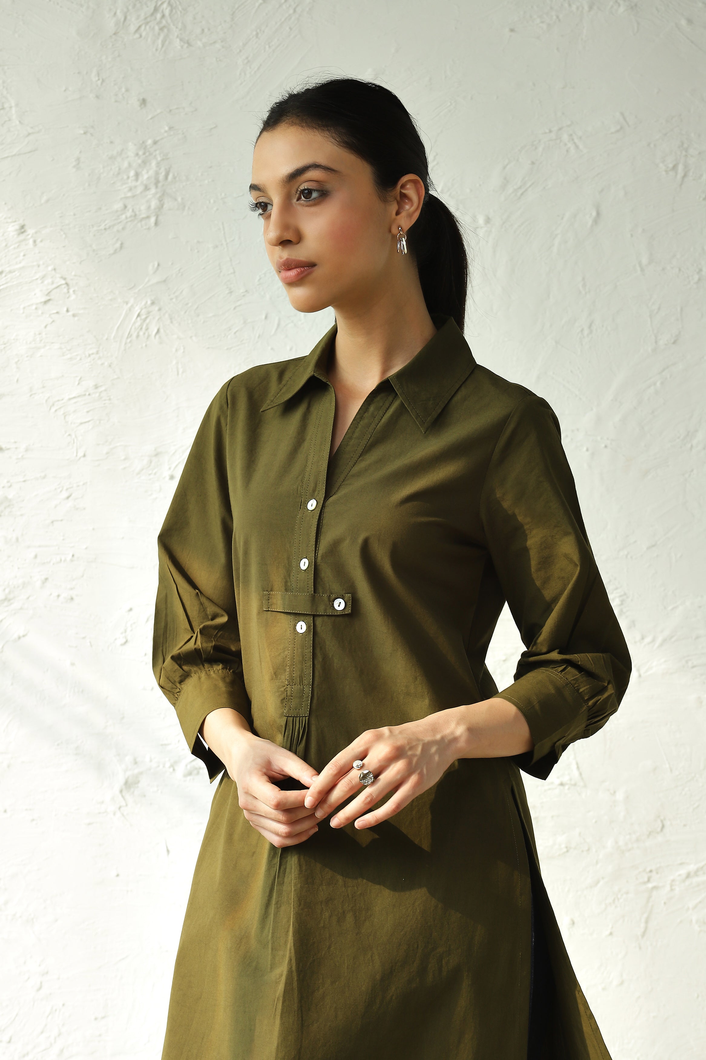 Embark on adventurous journeys with our forest green front-buttoned tunic. Crafted from premium cotton poplin fabric in a breathable green finish, this relaxed-fit shirt dress showcases a collared neckline and high side slits for a laid-back silhouette. The shell buttons and side seam pockets elevate this style, ensuring both practicality and elegance.