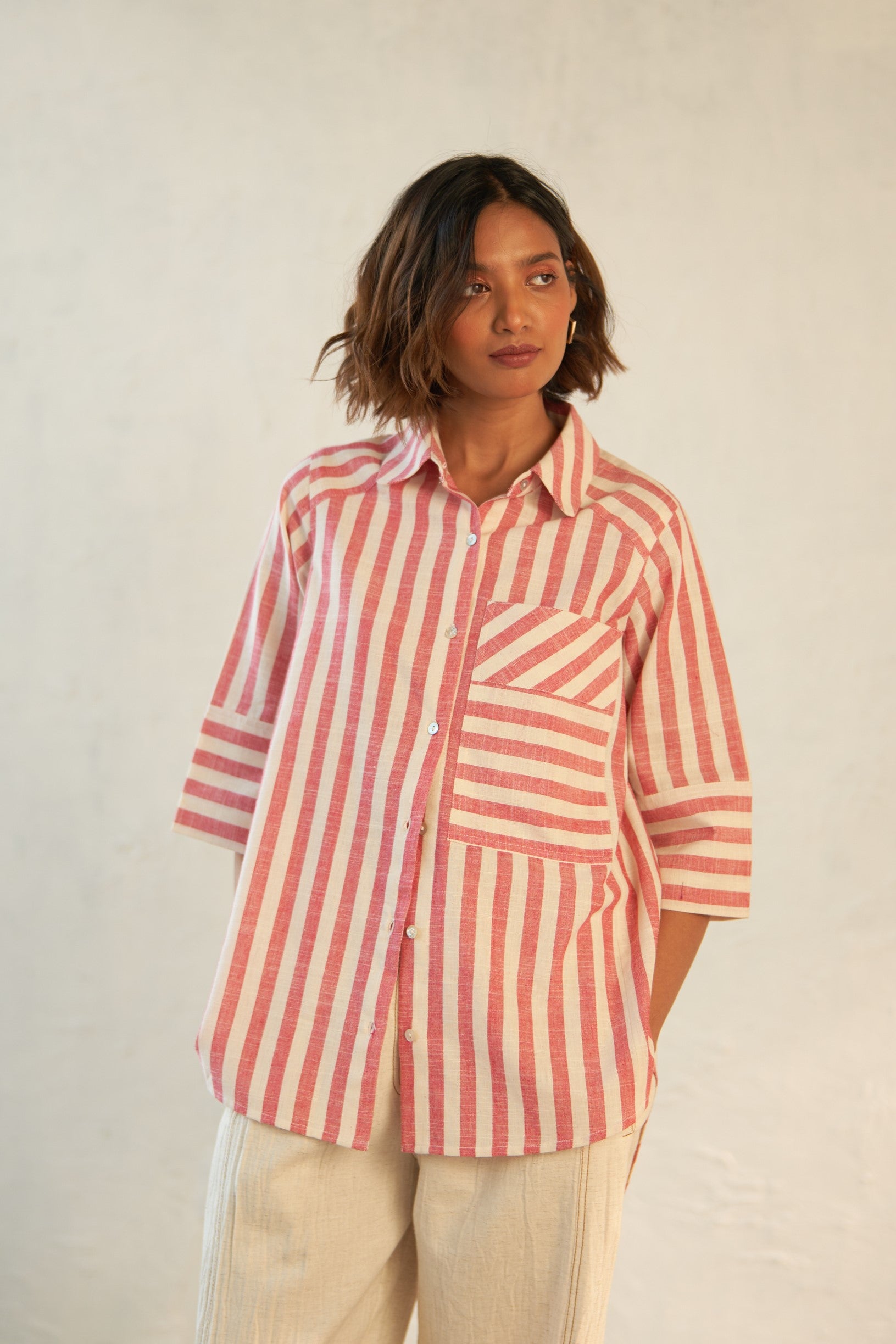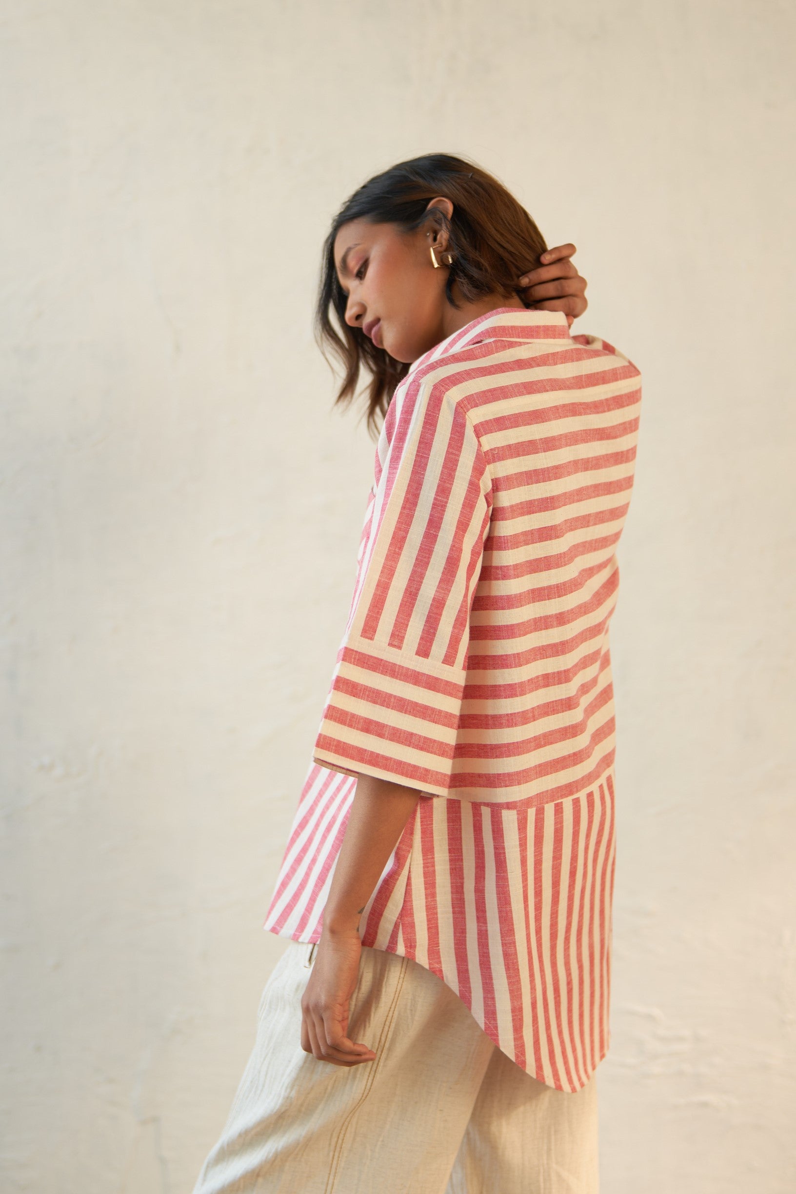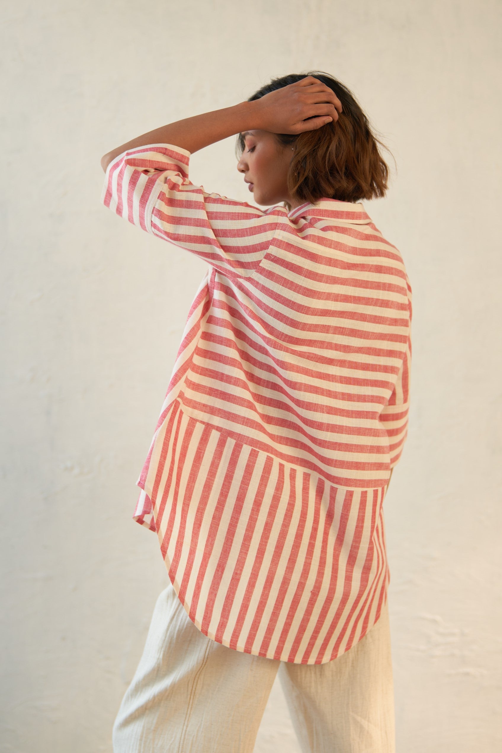 A perfect blend of refined tailoring and effortless, airy silhouette, this hi-lo red striped shirt is a must-have for your wardrobe. It features a patch pocket, curved hemline, and elegant shell buttons. The directional play of lines, along with the hi-lo silhouette, makes for a fun outfit. Pair it with our flex loop pants for a comfortable fit.