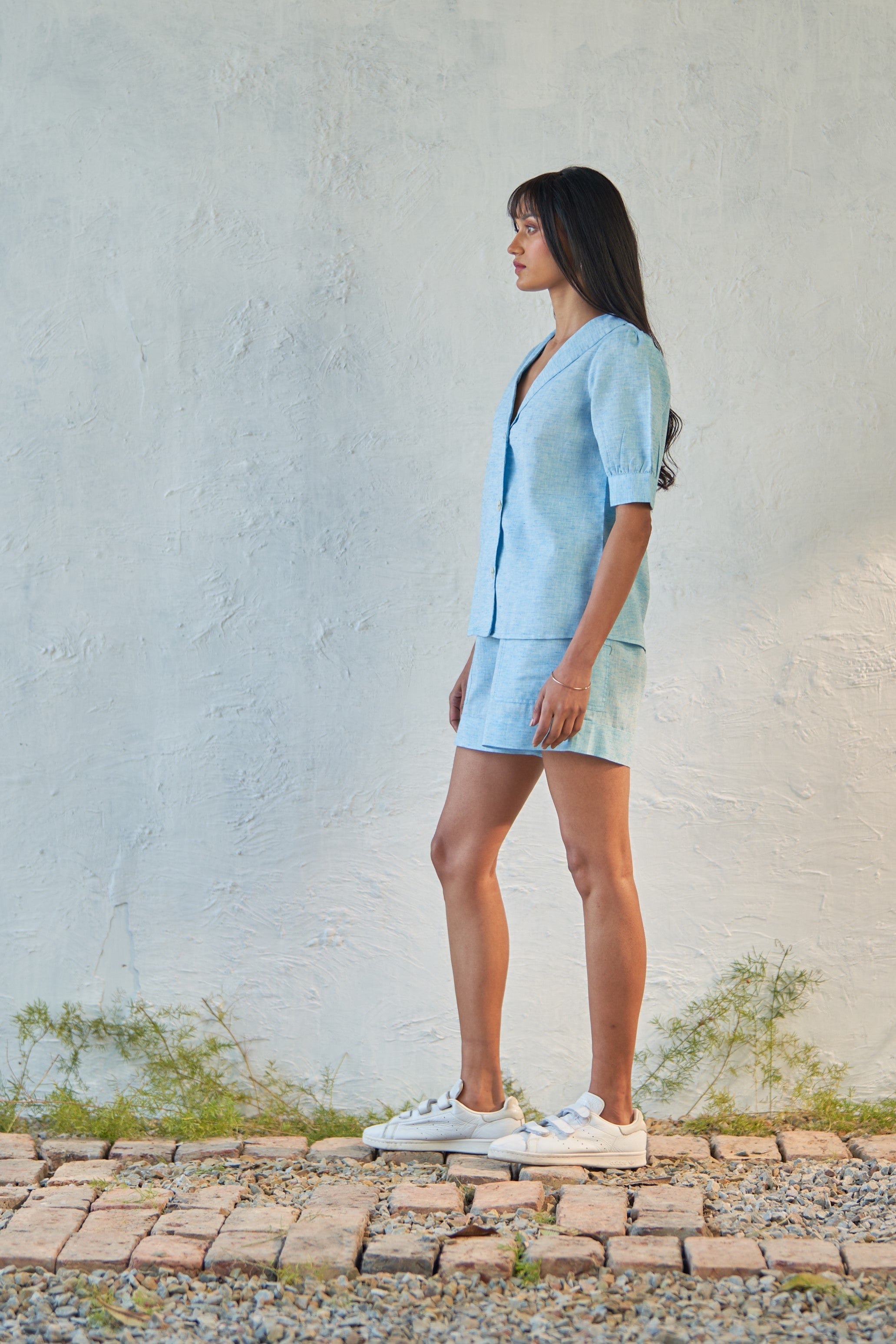 Endless explorations with this icy blue duo. Tailored from premium cotton slub fabric, the puffed sleeve shirt boasts a curved collar and a row of delicate shell buttons for added elegance. Paired with matching shorts featuring a half elastic waistband and flap pockets, this ensemble ensures both style and comfort for your adventures.