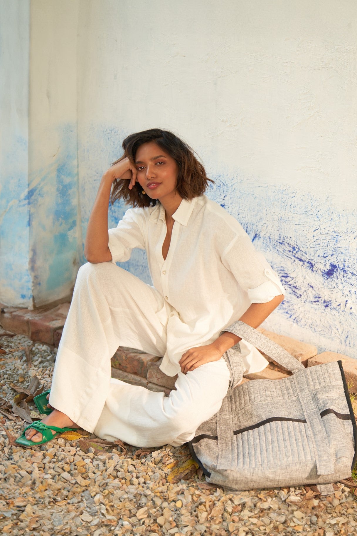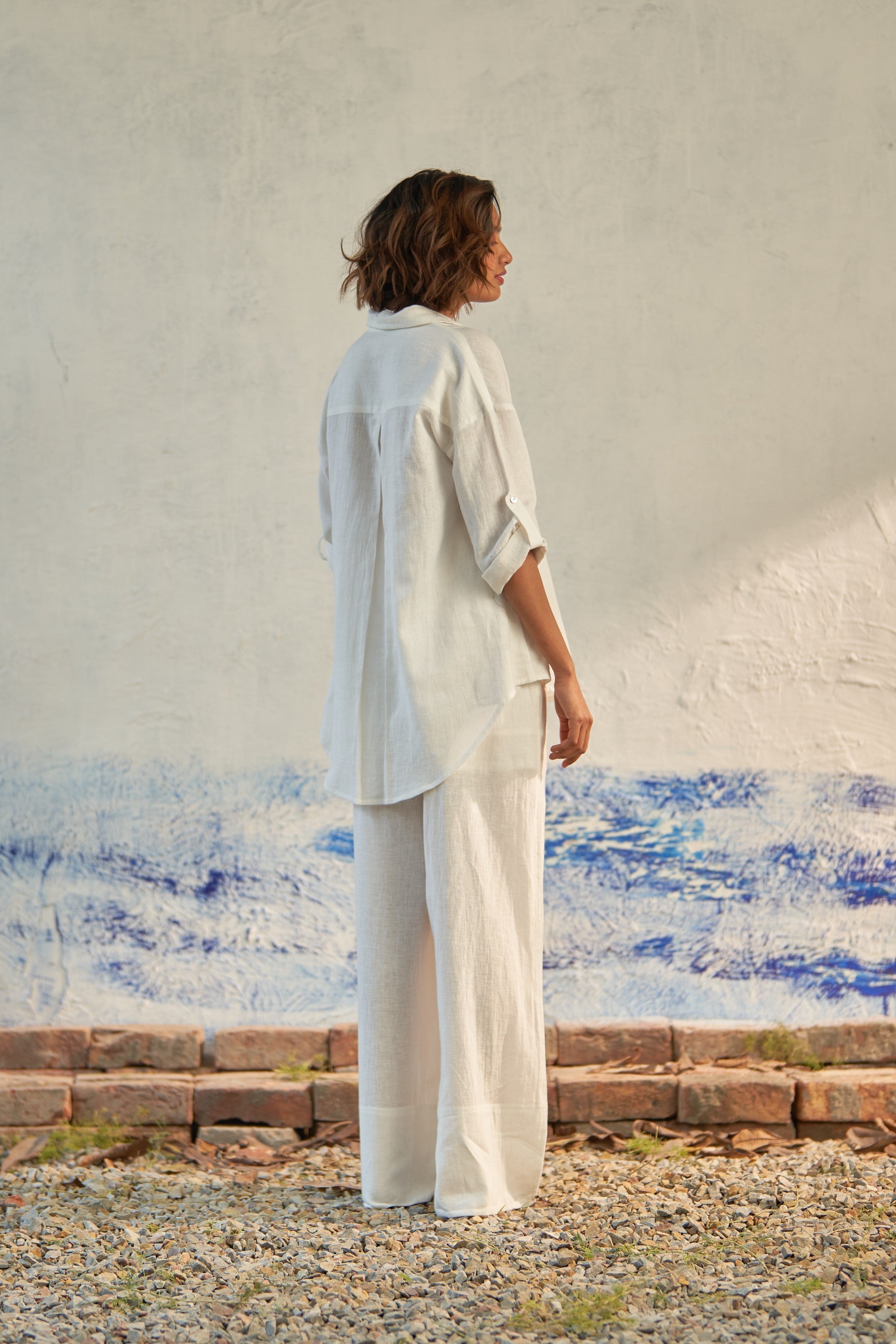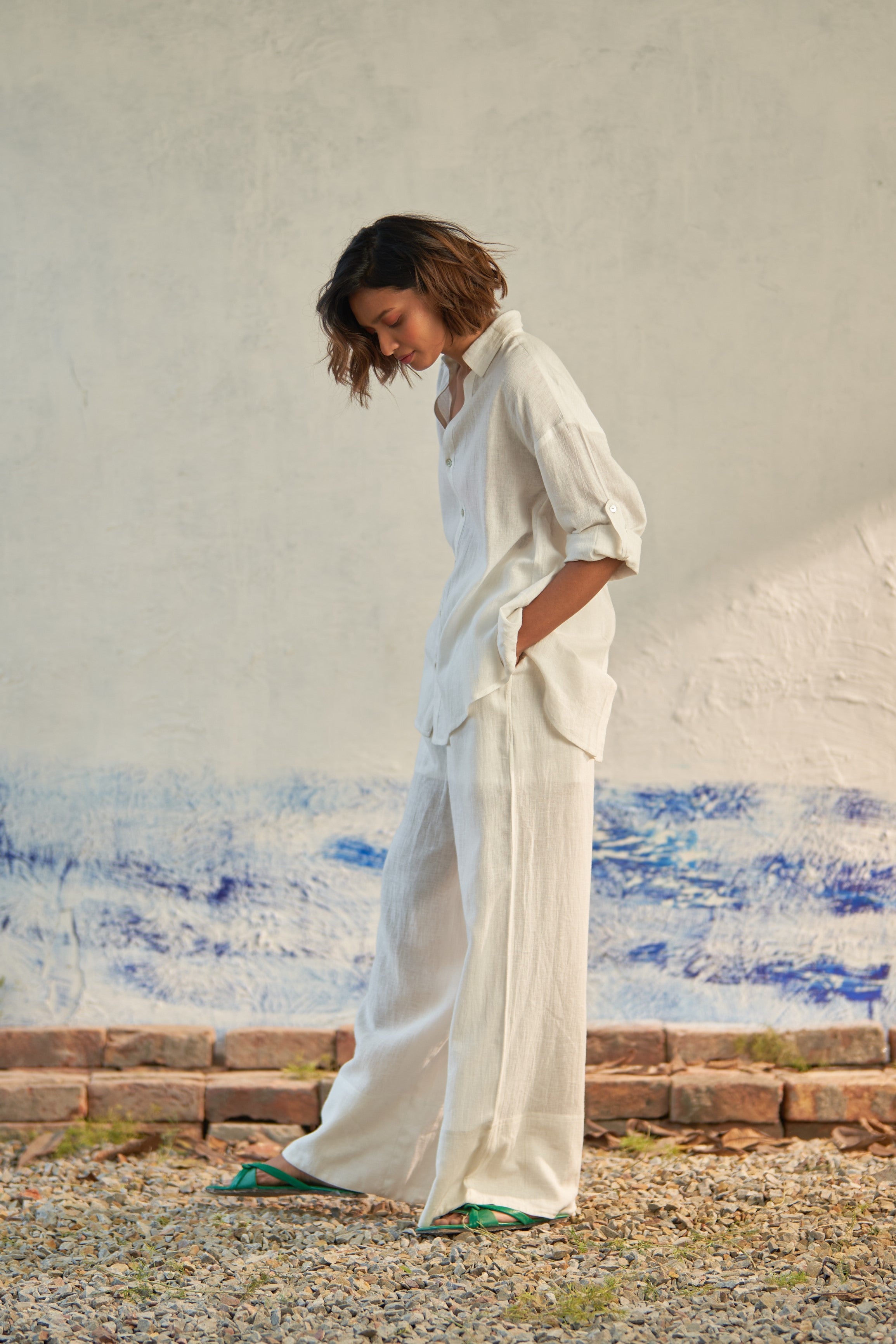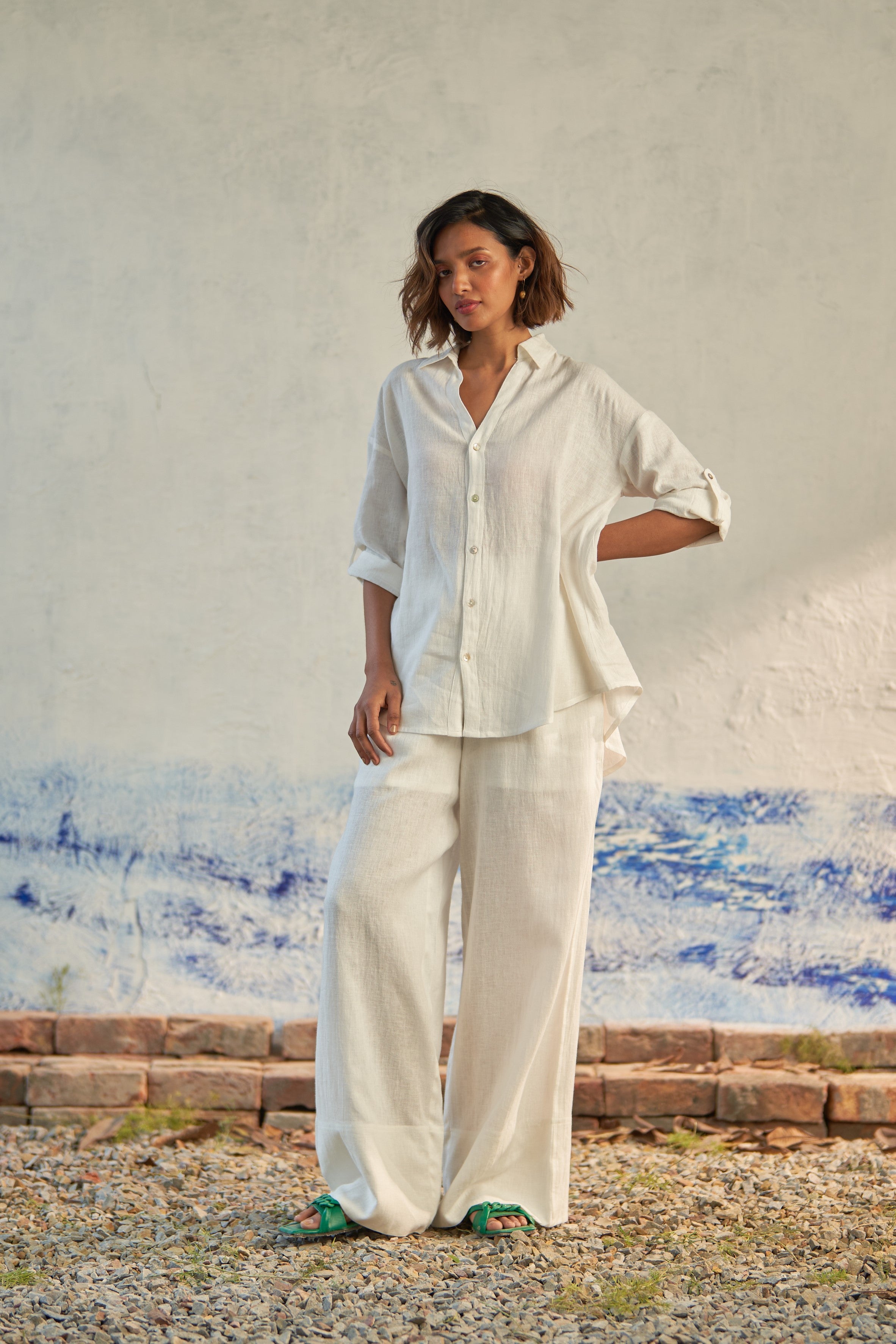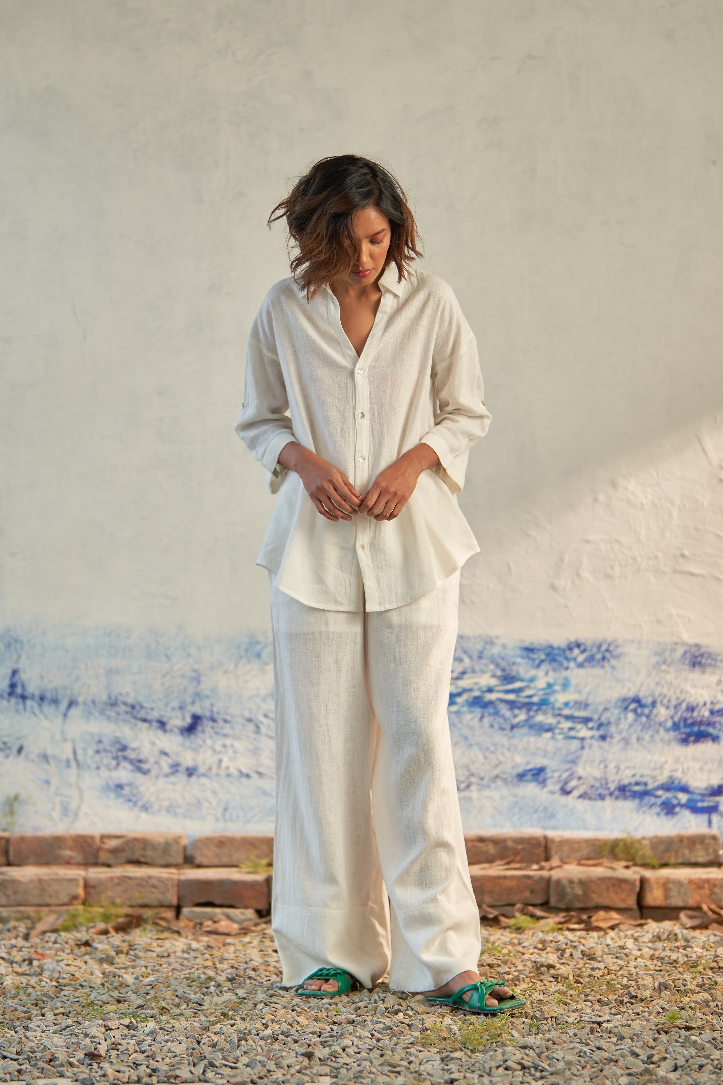 The combo tailored from natural flex fabric in pristine white. The oversized, relaxed fit of the shirt offers a casual vibe, enhanced by its flattering V-neck, gently curved hemline, and exquisite shell buttons. Paired with wide, full-length pants featuring chic broad folds at the bottom, complete with an elasticated waistband for added convenience.