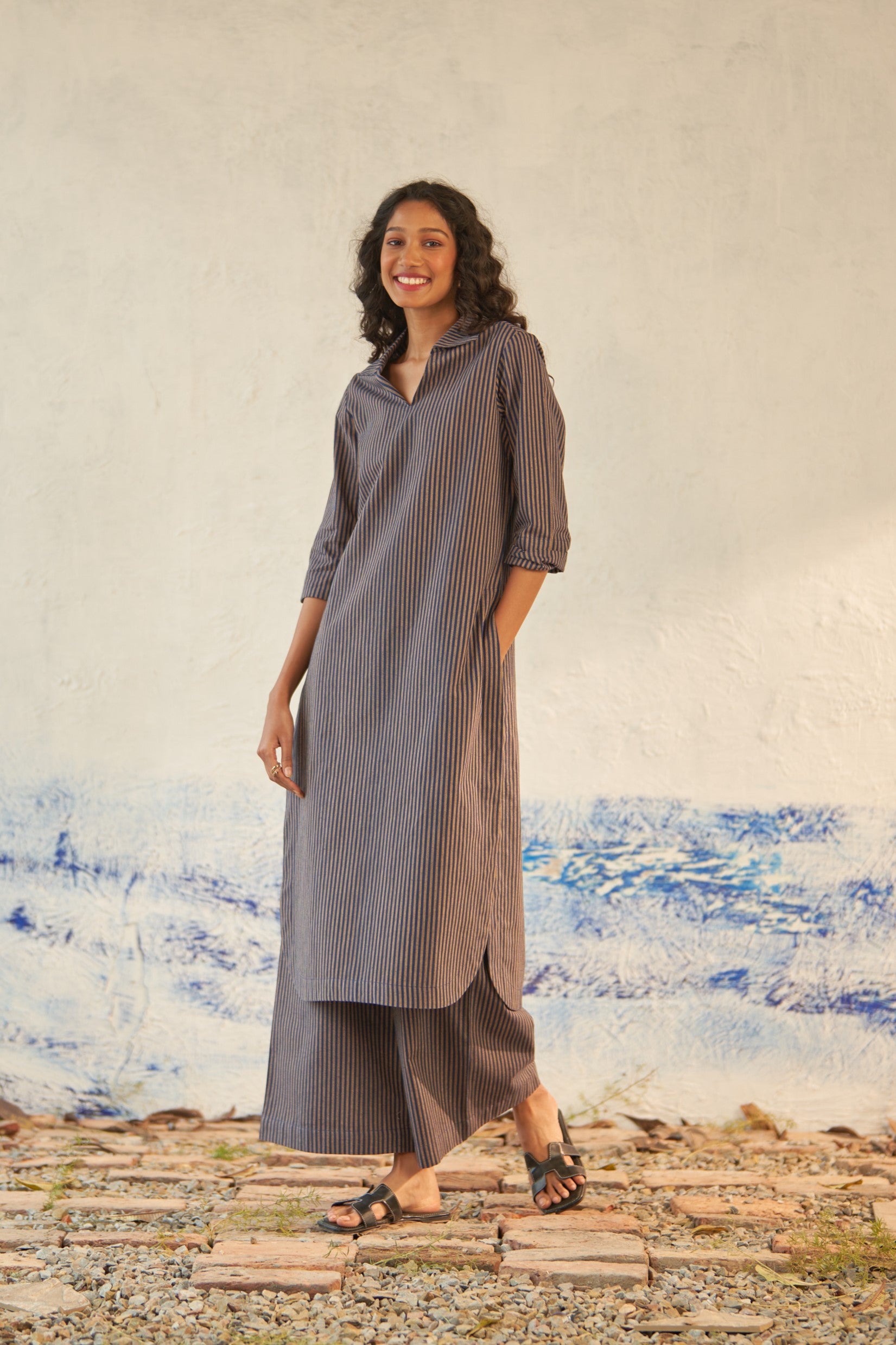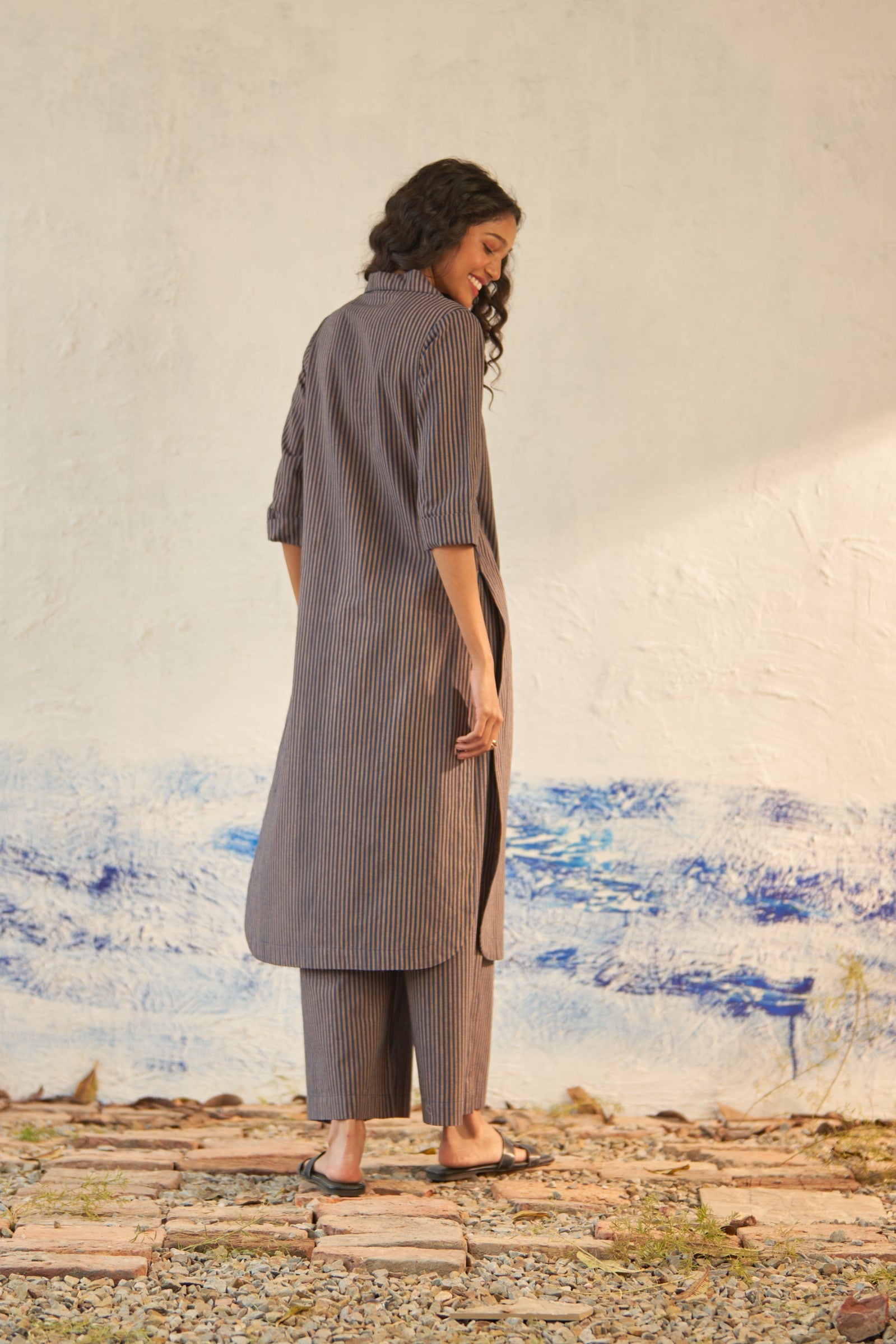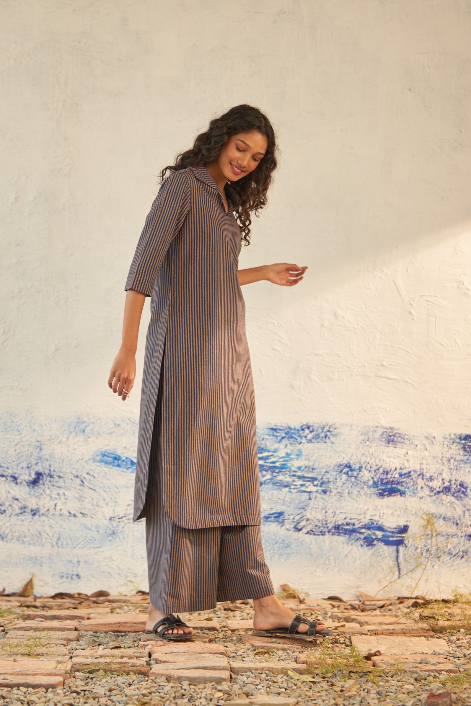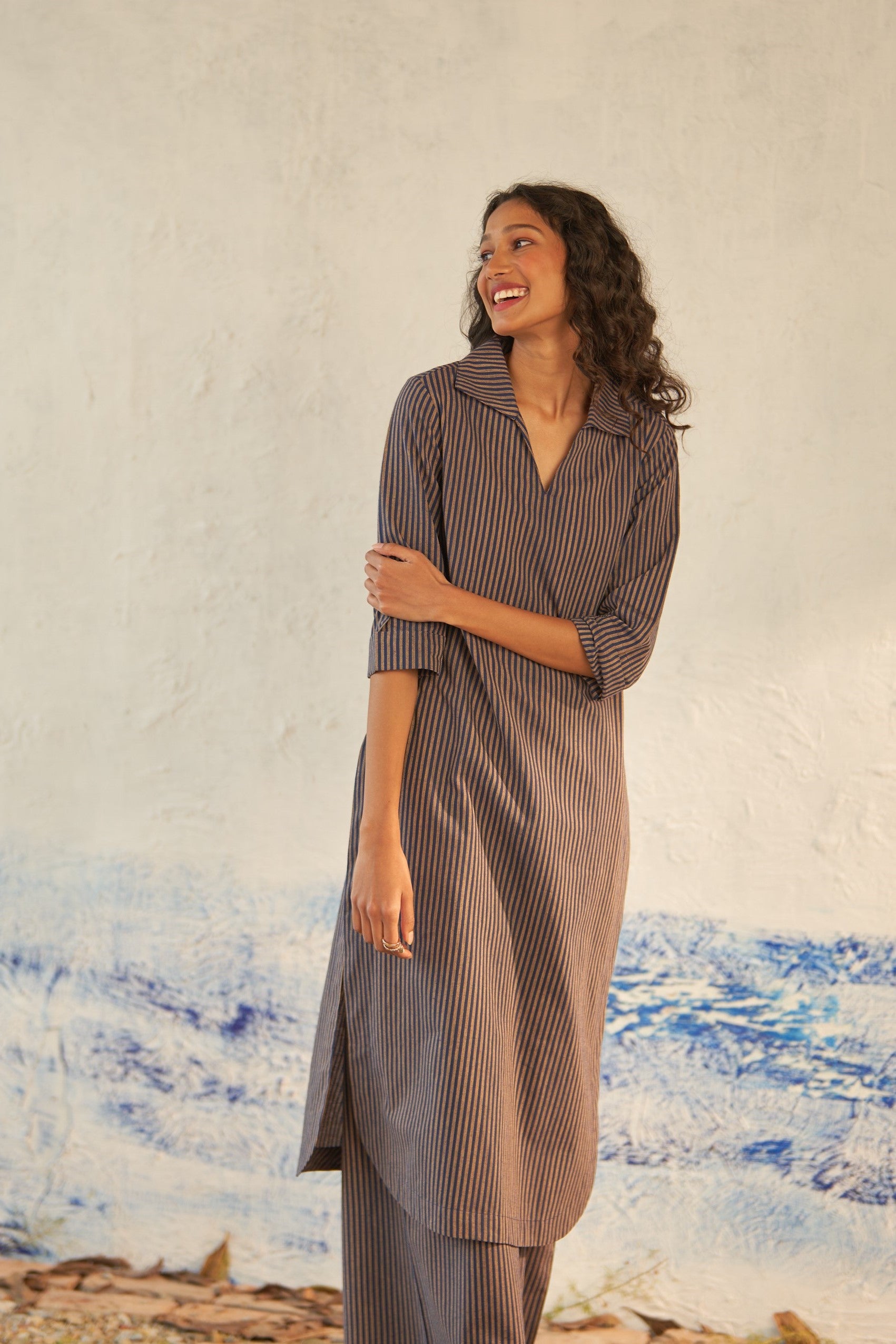 Offered in classic blue and beige stripes, this long kurta is crafted from lightweight cotton that's cut for fluidity and drape. The V-neckline with subtle collars defines the silhouette, while the side slits create subtle movement as you walk. It is paired with matching flared pants to keep up with the latest trend.