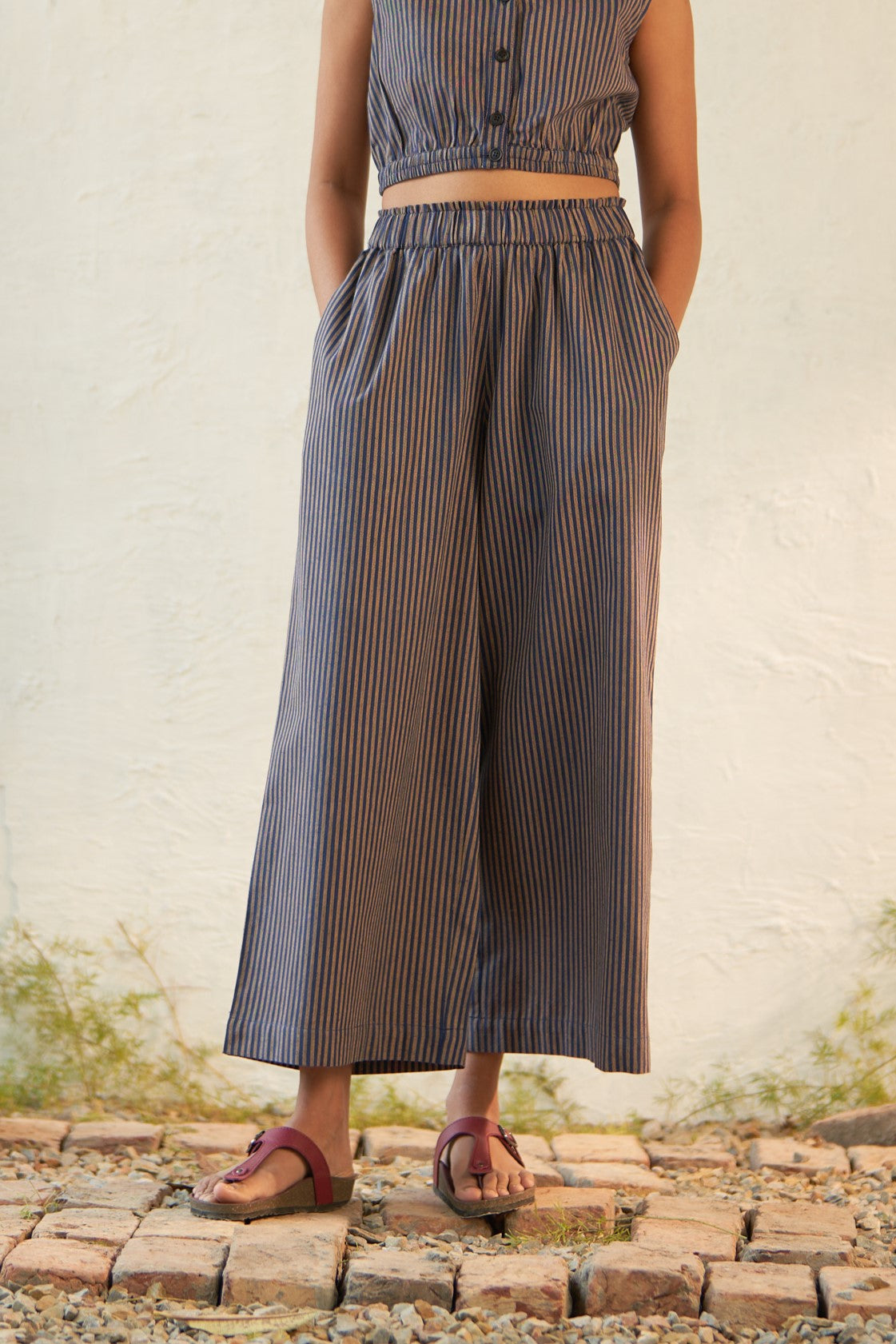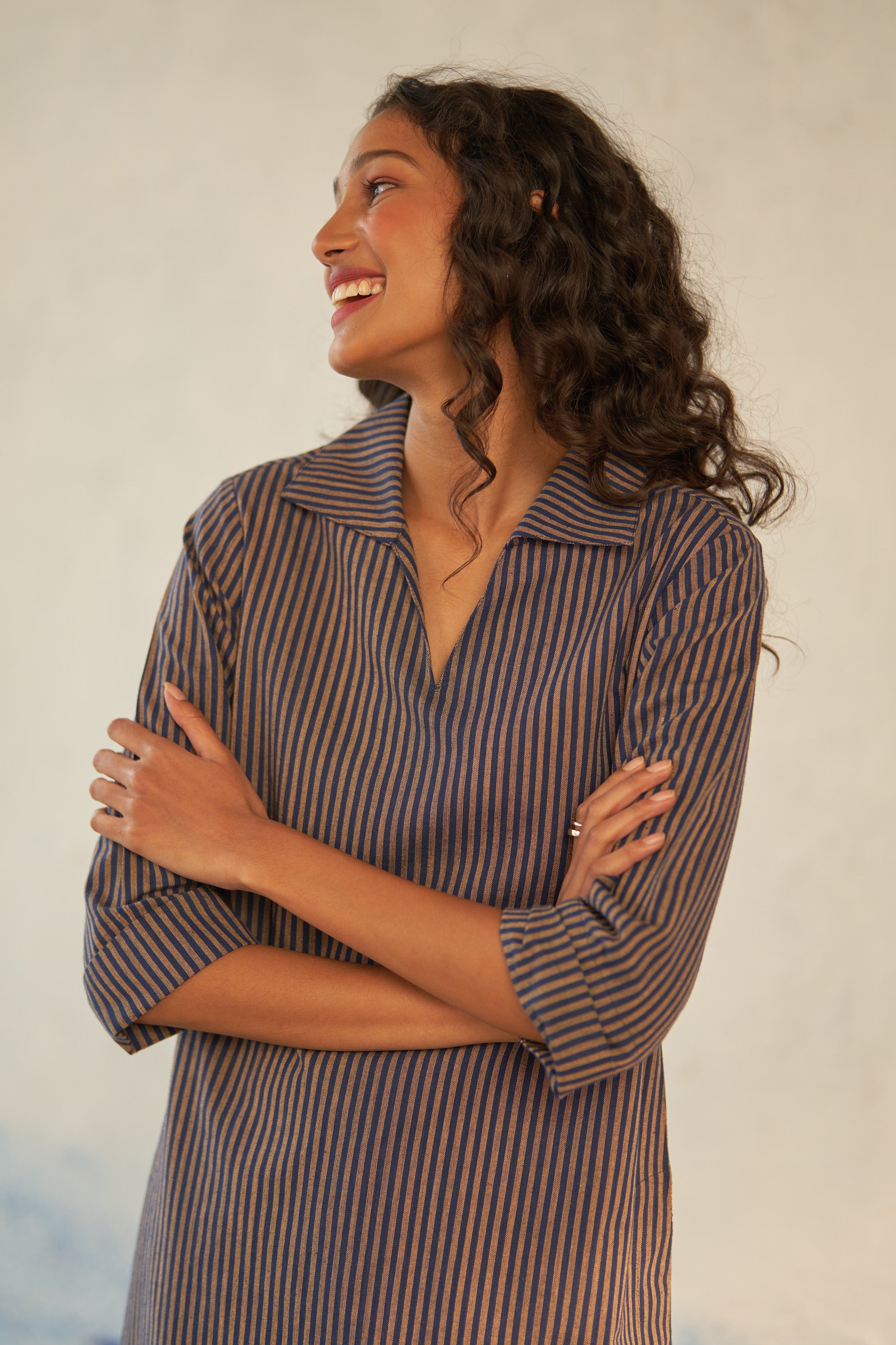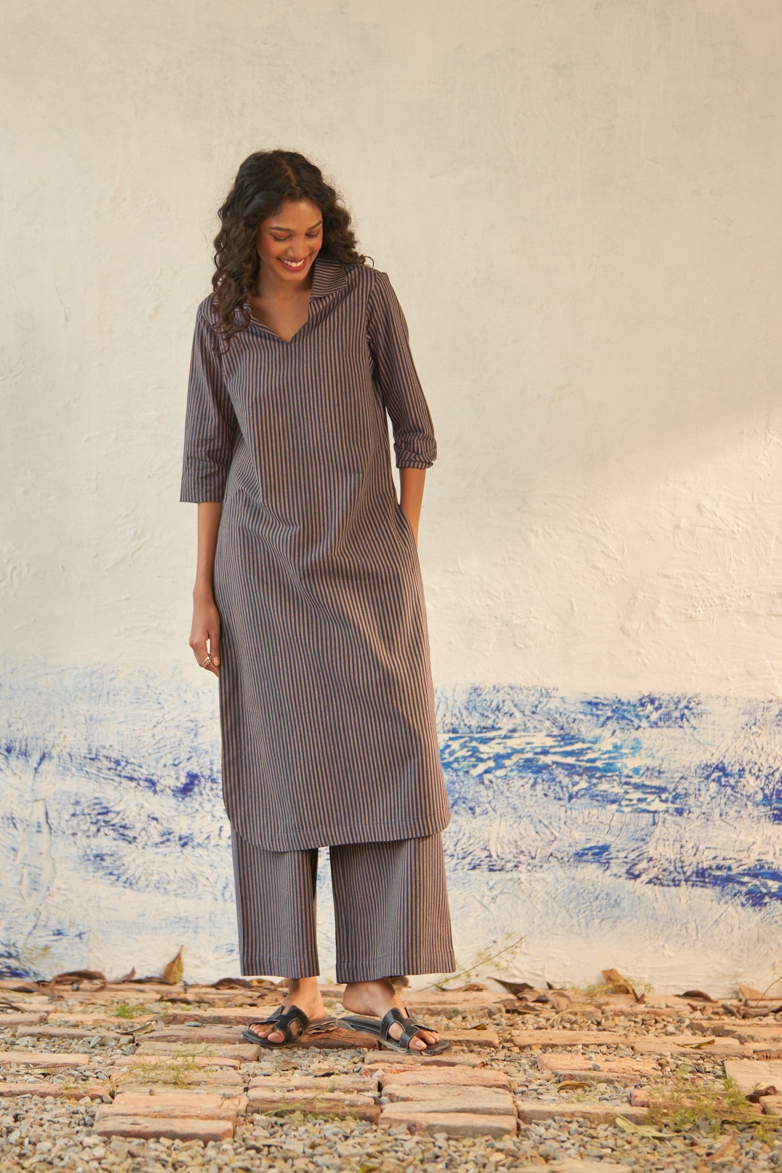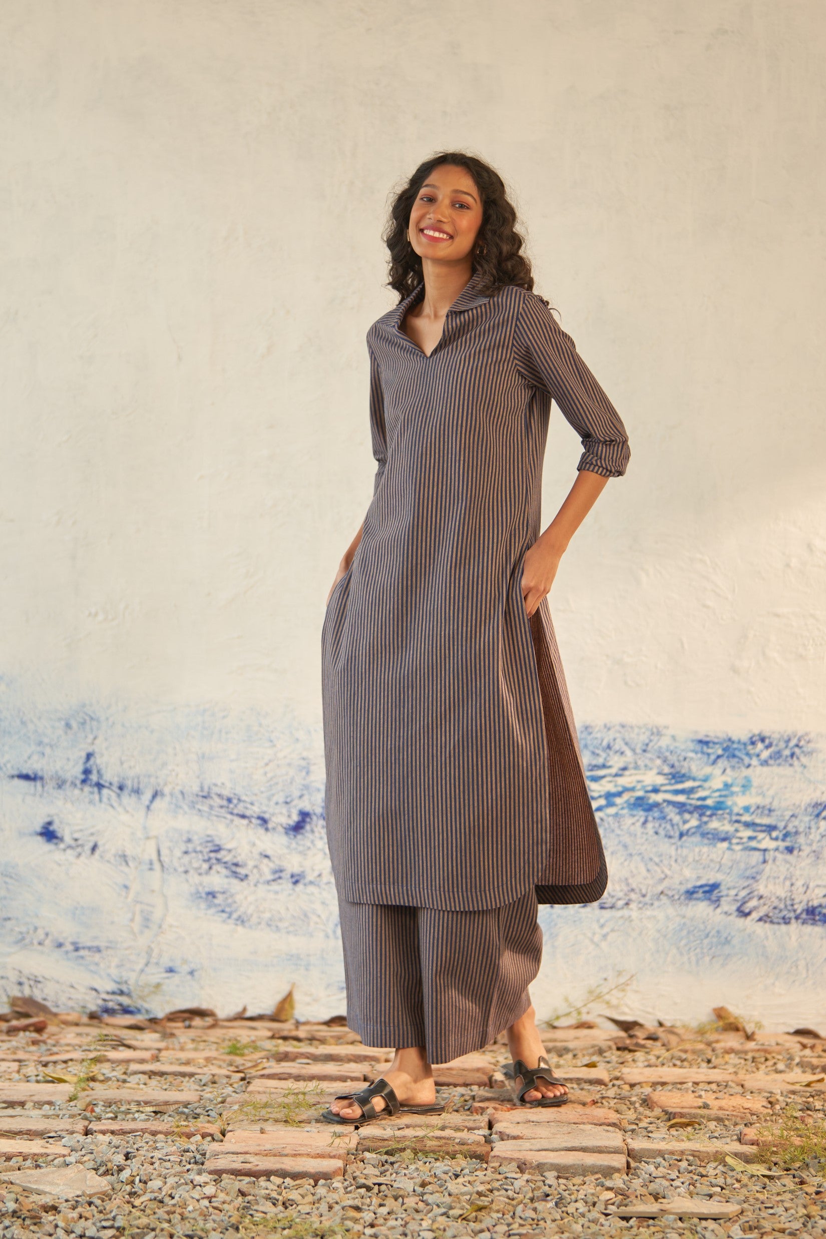 Offered in classic blue and beige stripes, this long kurta is crafted from lightweight cotton that's cut for fluidity and drape. The V-neckline with subtle collars defines the silhouette, while the side slits create subtle movement as you walk. It is paired with matching flared pants to keep up with the latest trend.