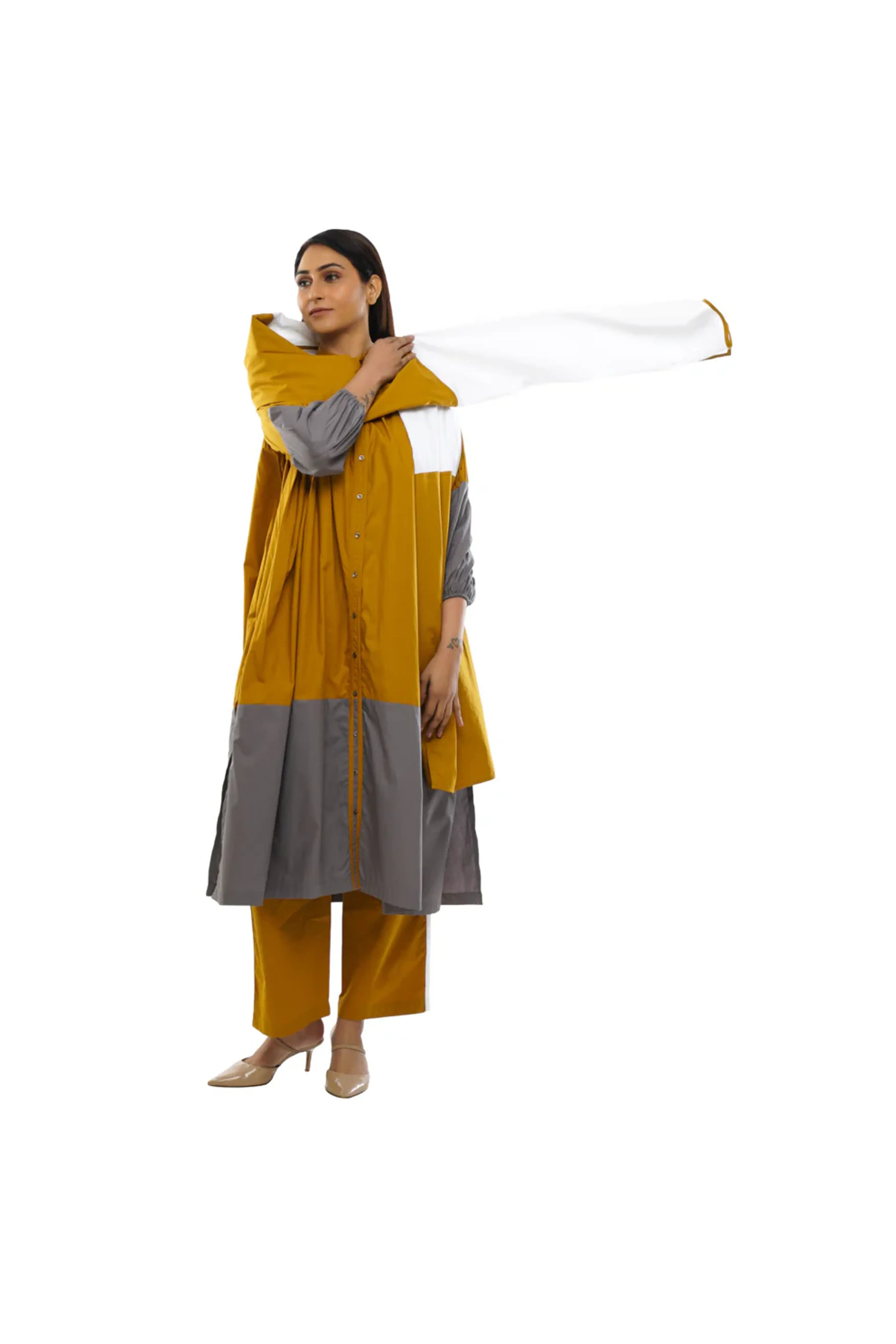 Make a statement with this Mustard & Grey Three-Piece Set. This ensemble features a stylish front-open shirt with gathered sleeves and box pleats, paired with matching pants and a versatile scarf. Crafted from Poplin cotton, this set is your perfect pick for a blend of elegance and comfort.