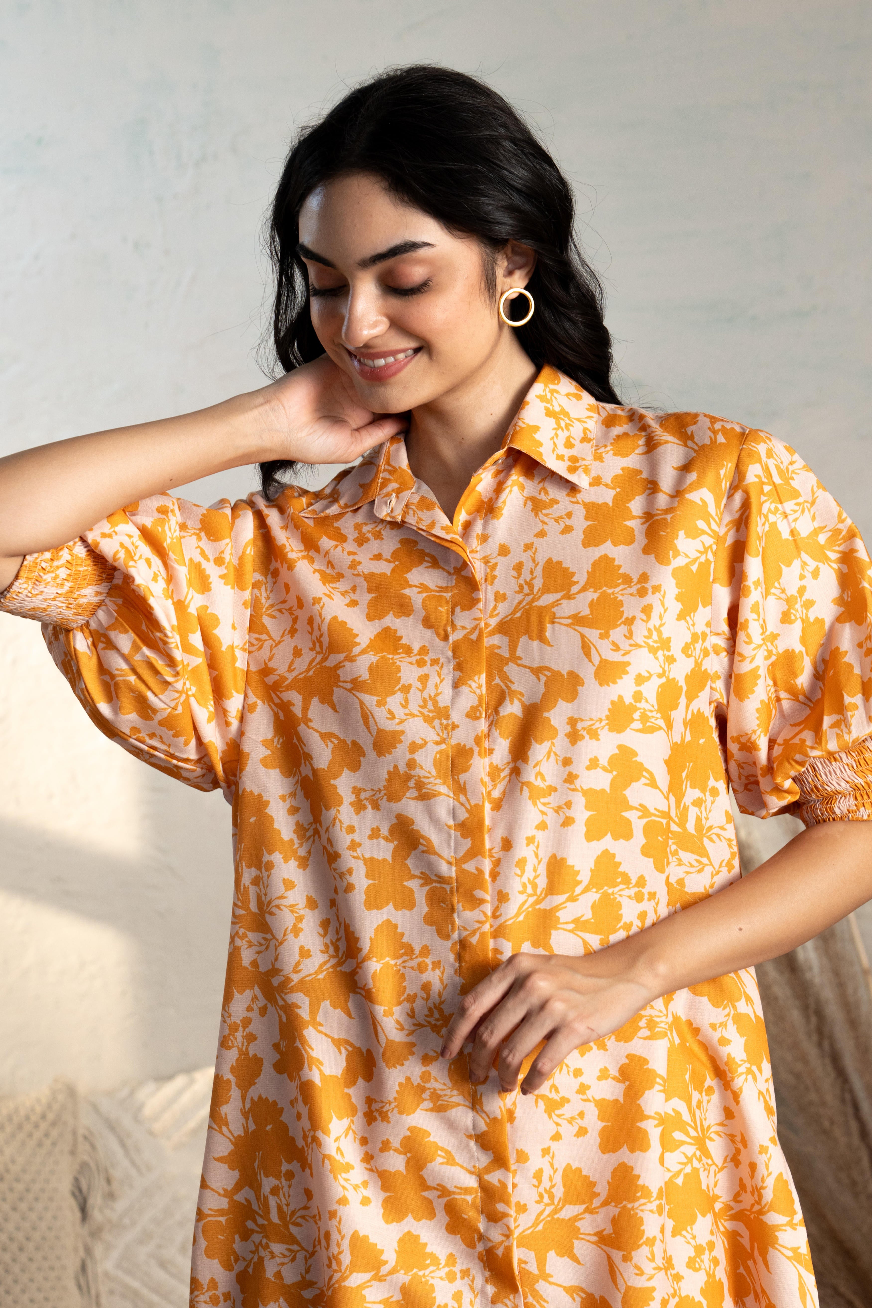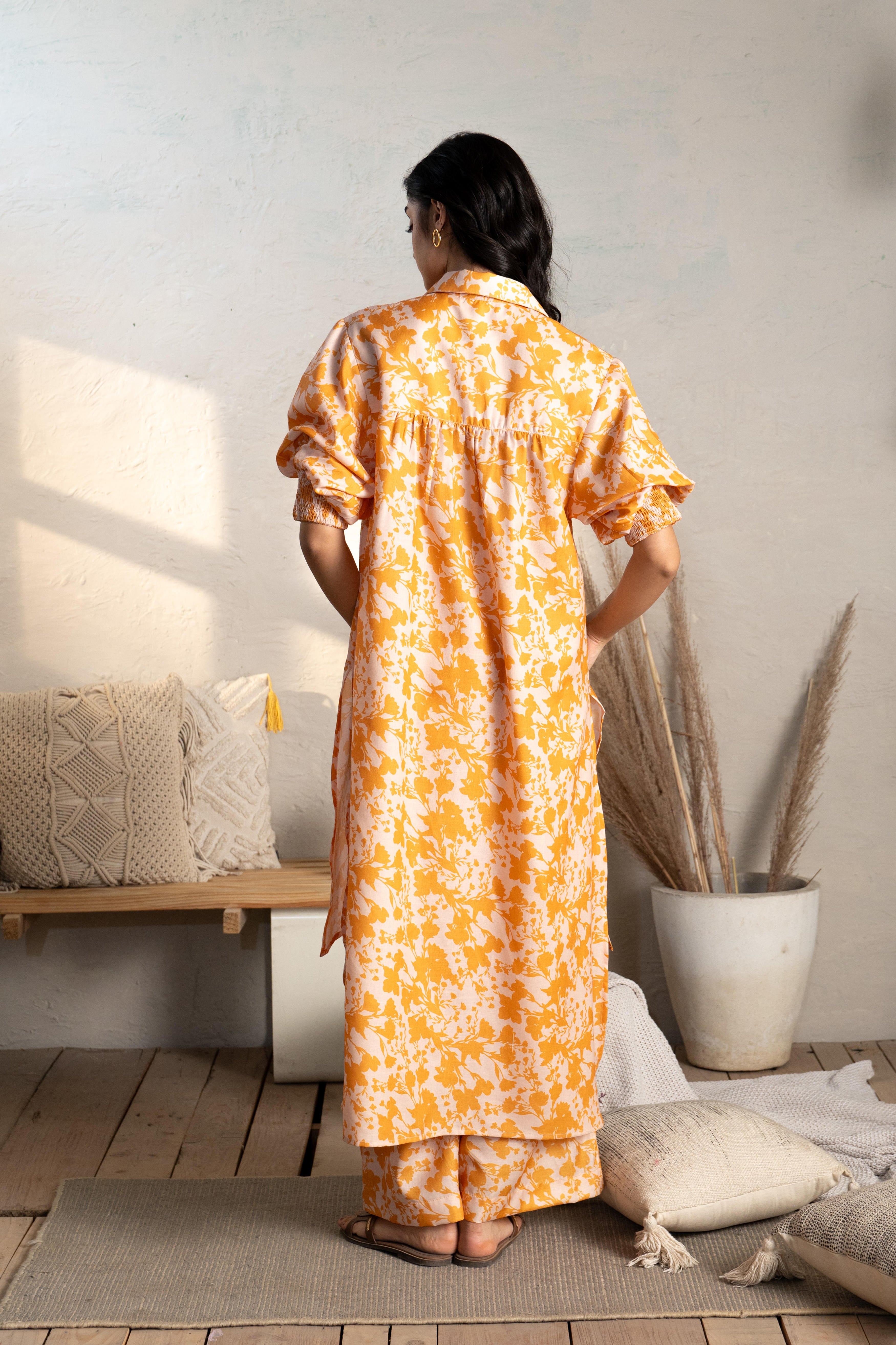 Channel timeless elegance with the Giverny Grace Set, evoking the beauty of gardens in a classic yellow hue print. The front-buttoned kurta features a classic collared neckline and delicate smocking details on the sleeve cuffs for a sophisticated touch. Its hi-lo panels create a flowy, flattering silhouette that moves effortlessly with you. Paired with high-waisted, flared pants equipped with practical side pockets, this set seamlessly blends style and comfort—perfect for refined everyday wear or graceful outings.