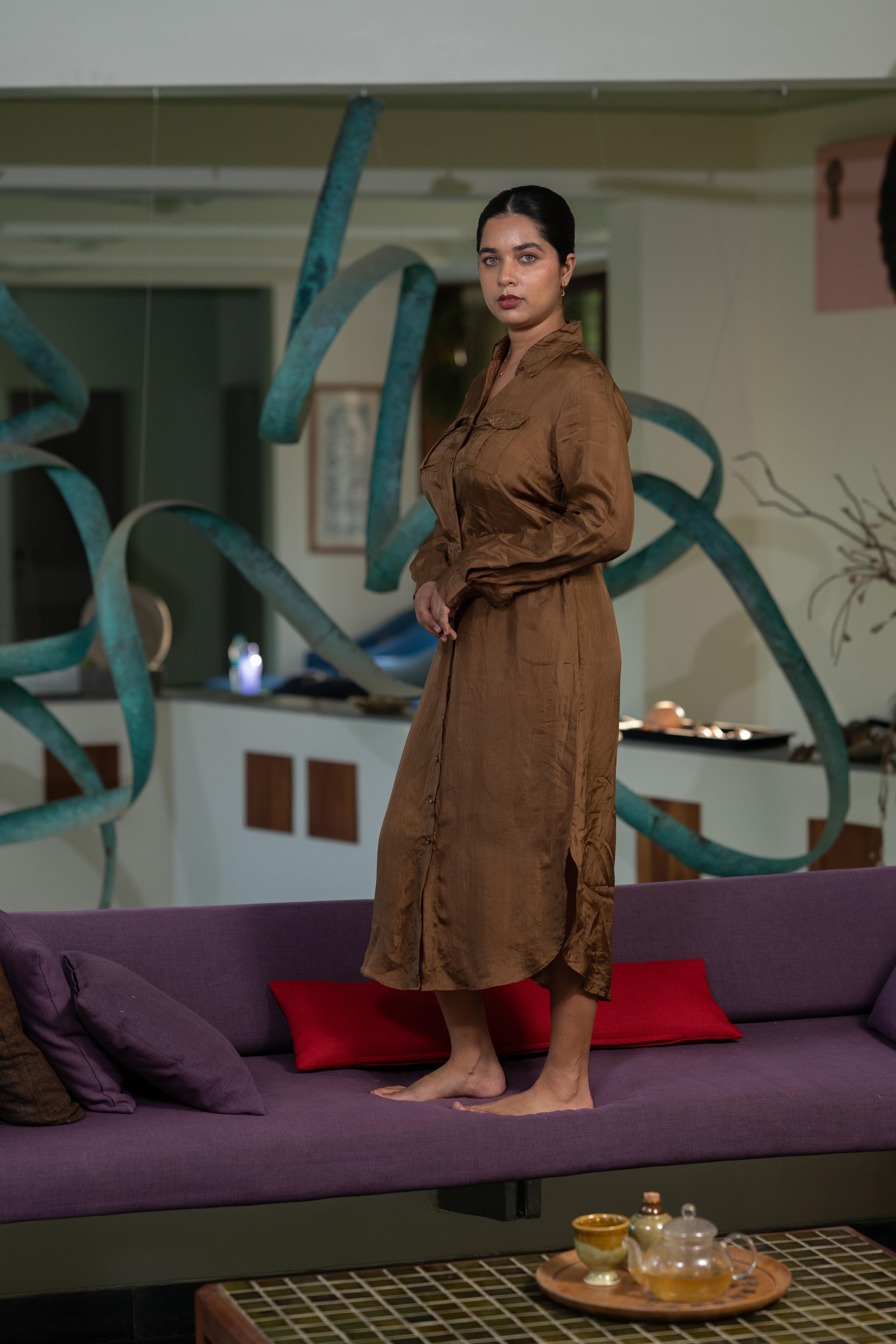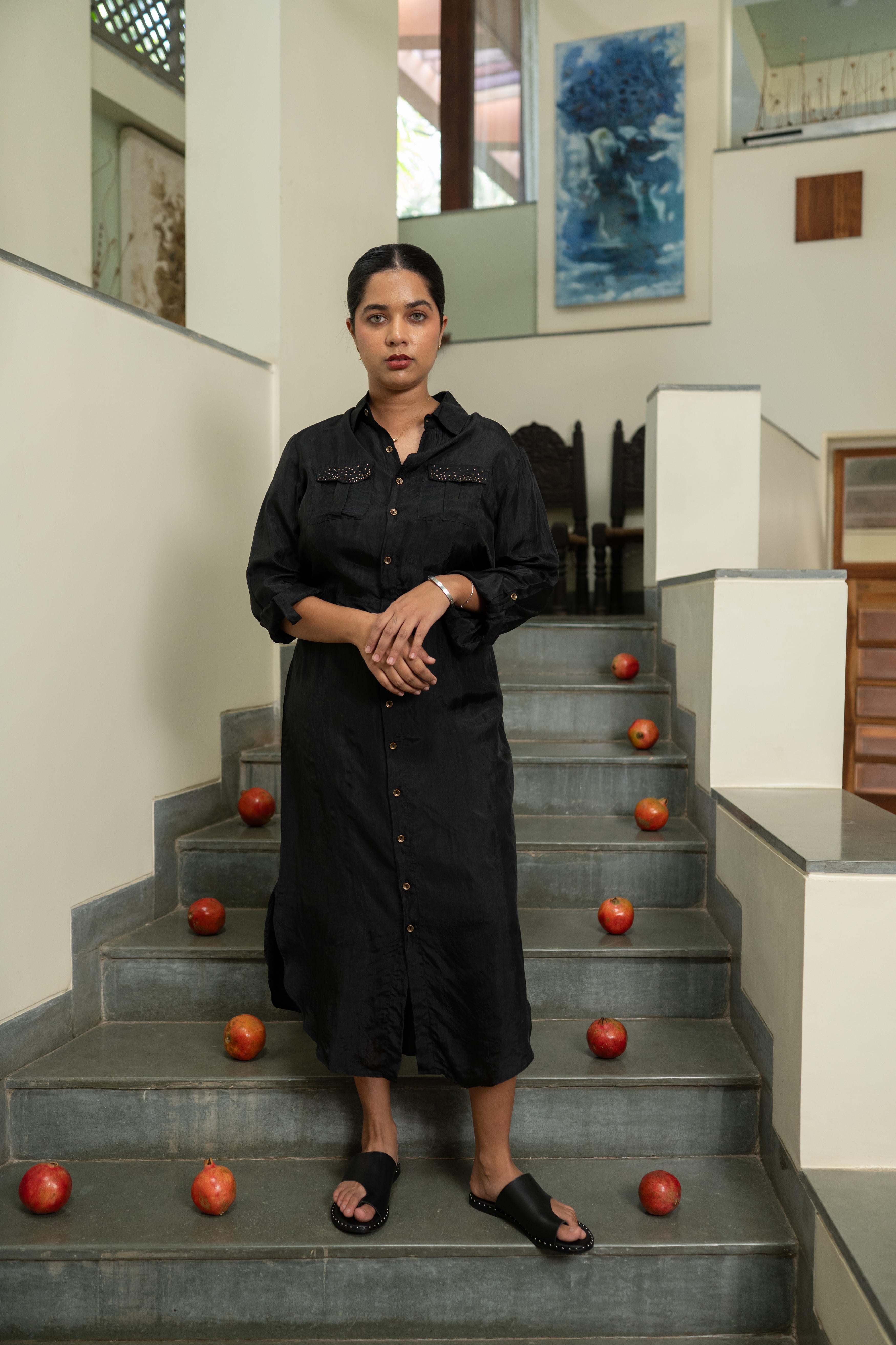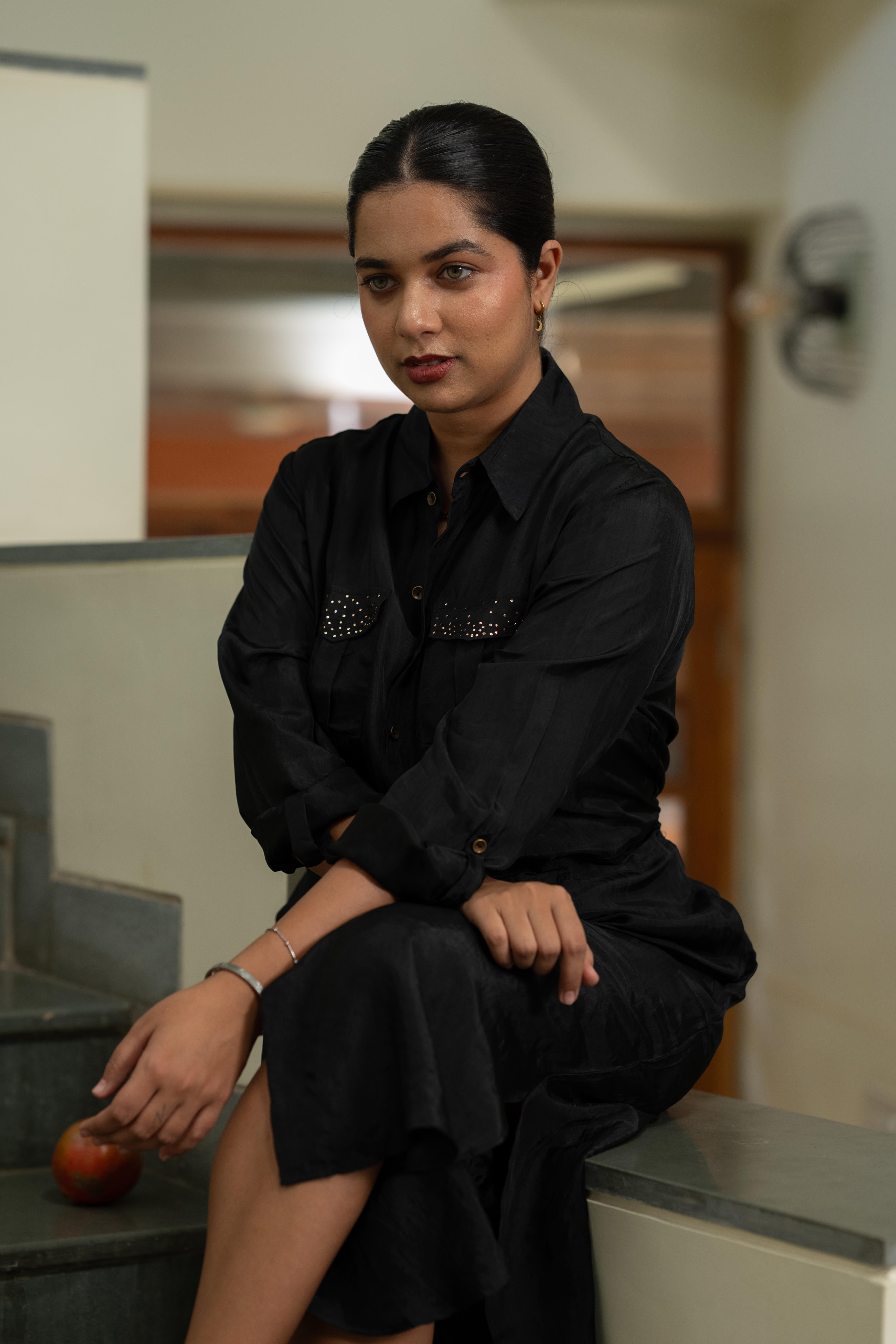 A shirt dress that flows like liquid, catching the light with every turn. Detailed with delicate badla embroidery along the collar, pockets, and sleeves, it’s effortless yet statement-making. Wear it as a dress, belt it for structure, or layer it over trousers as an open cape. * Available in Mocha & Black colours
