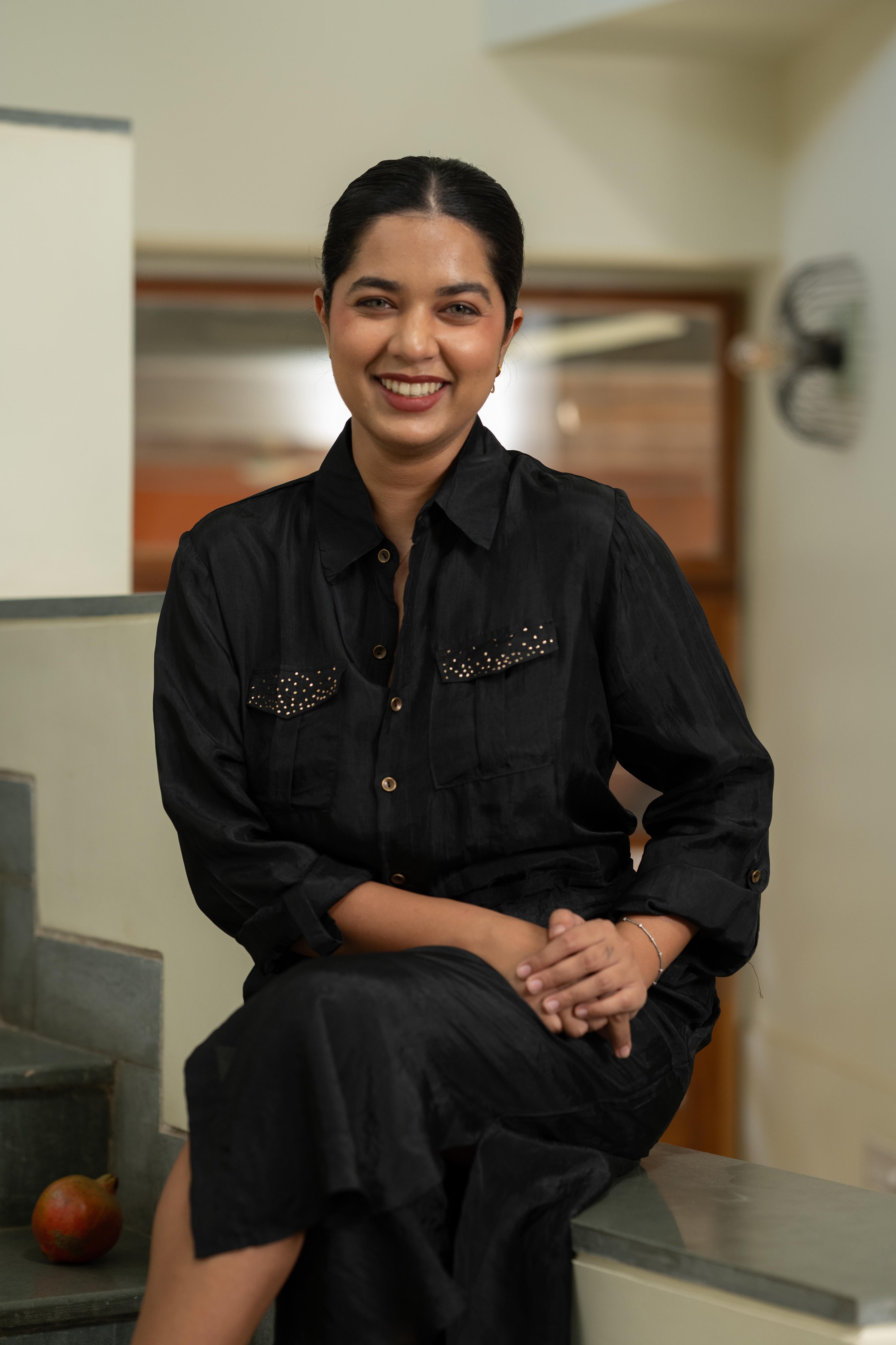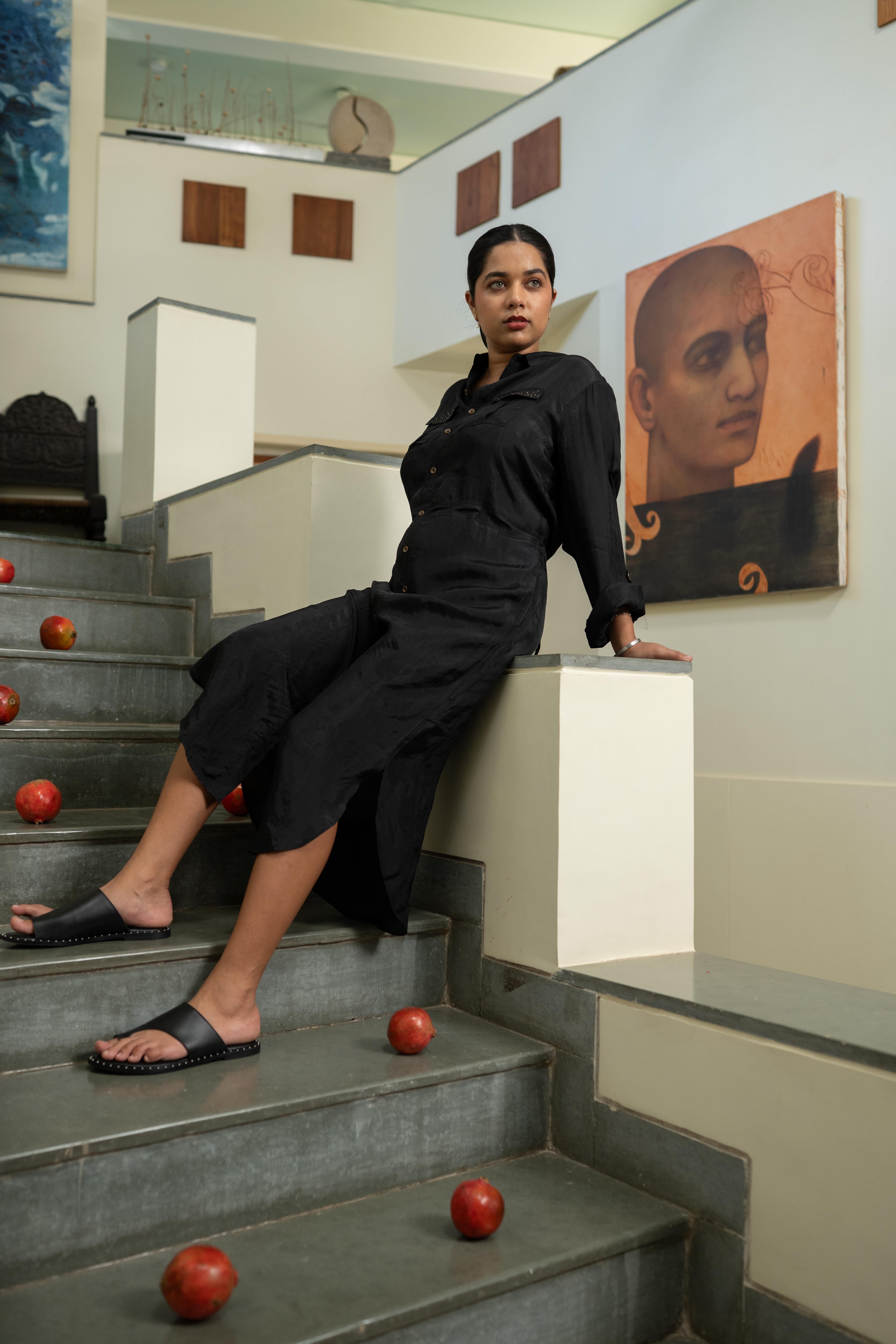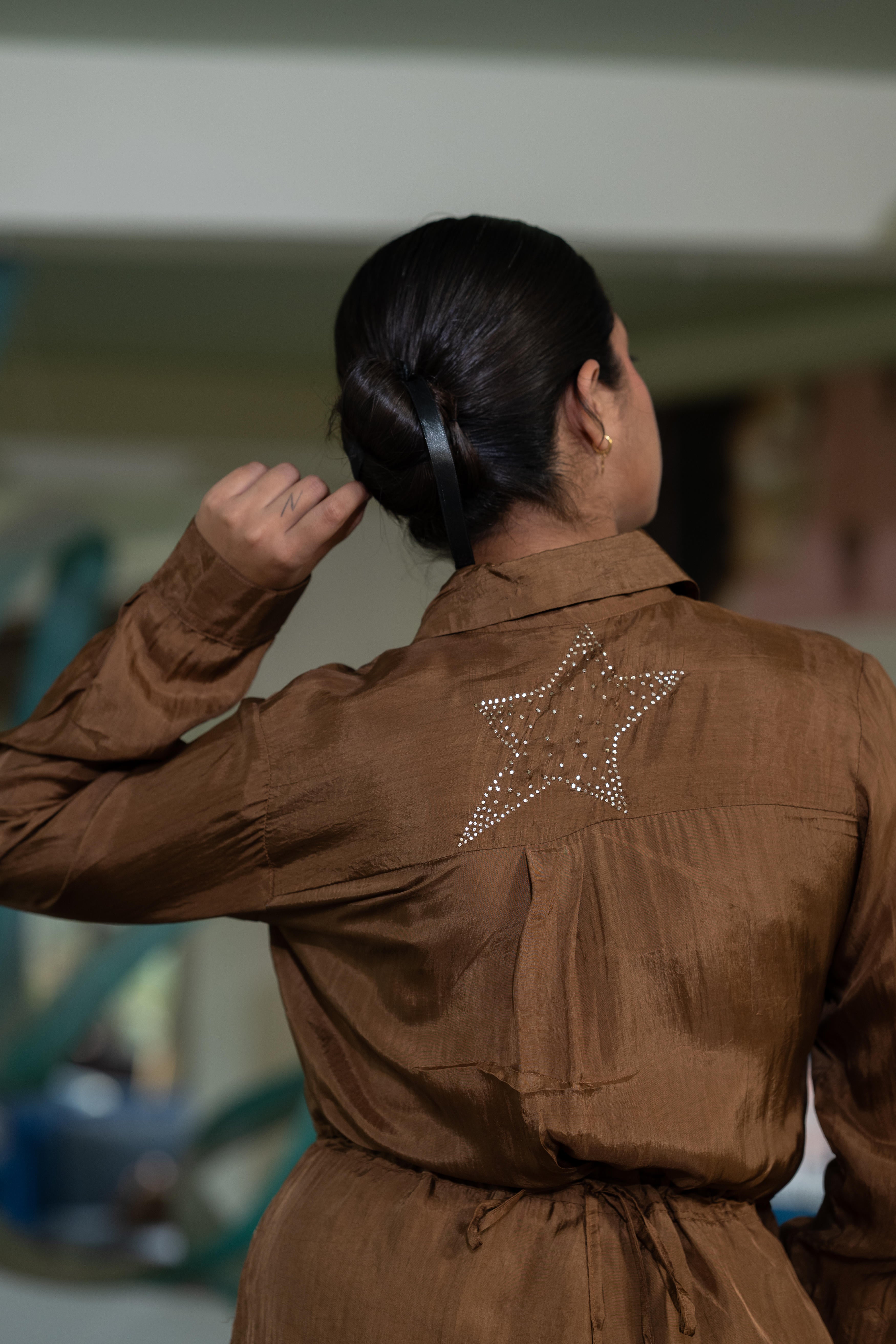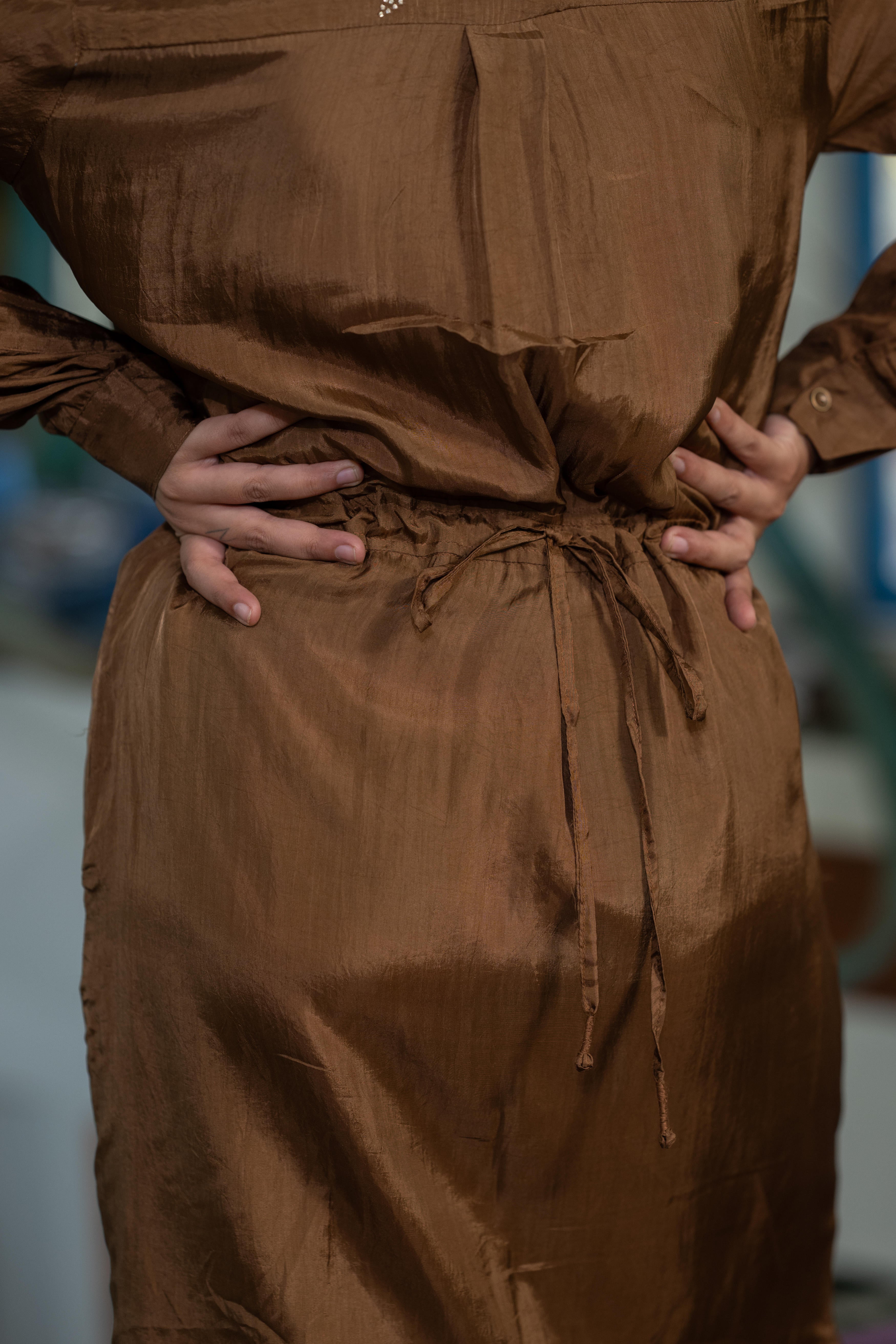 A shirt dress that flows like liquid, catching the light with every turn. Detailed with delicate badla embroidery along the collar, pockets, and sleeves, it’s effortless yet statement-making. Wear it as a dress, belt it for structure, or layer it over trousers as an open cape. * Available in Mocha & Black colours