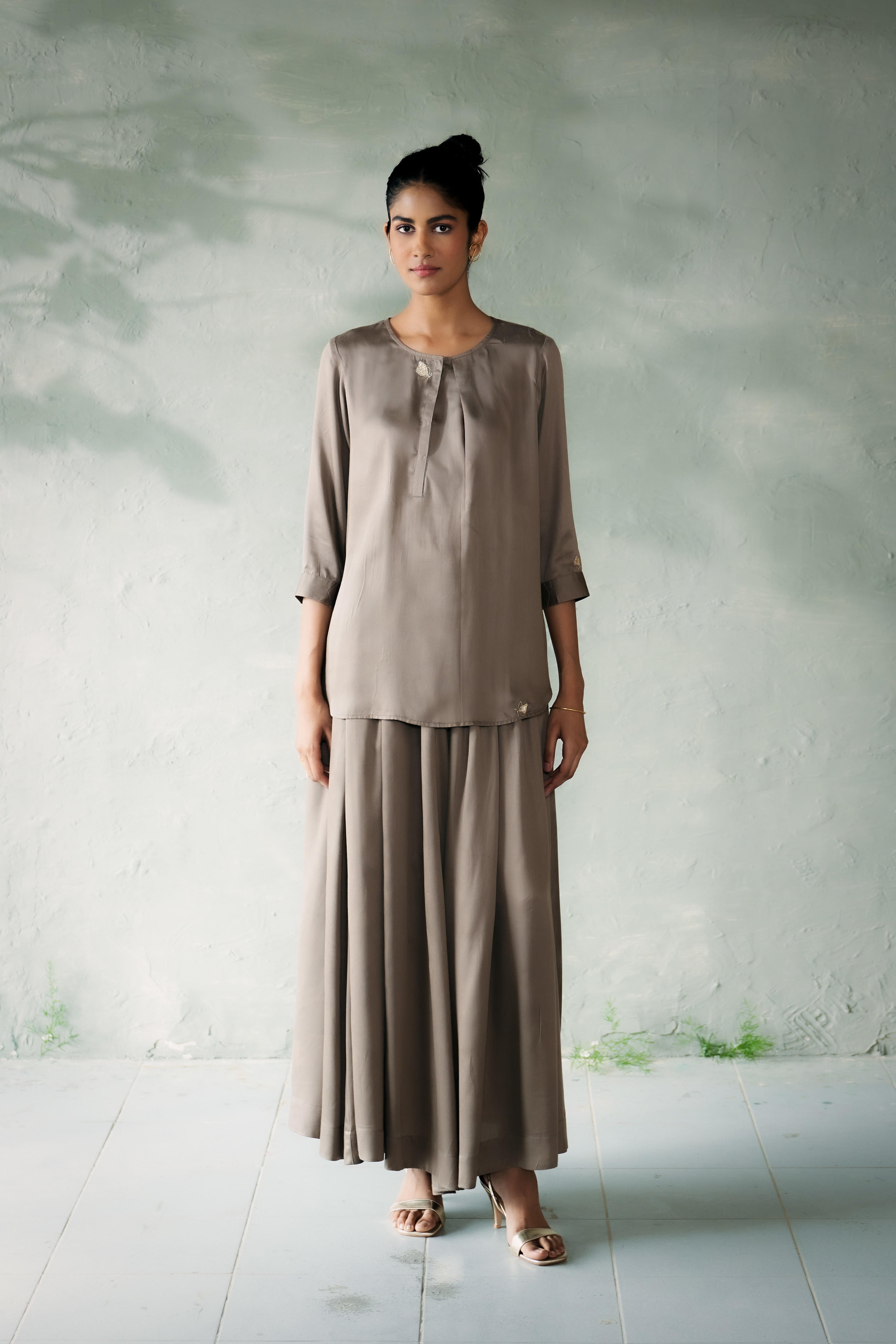 An effortless blend of ease and elegance, the Golden Nector Co-ord is made for days that flow gently but leave a mark. This two-piece coordinated set features placement hand embroidery of delicate butterfly motif. A long, relaxed-fit top with a round neckline with a diagonal pleat and full-length sleeves neatly rolled at the cuffs. Side slits lend fluidity and movement to your every step. Paired with a wide-legged, ankle-grazing palazzo designed like a skirt, the box pleats add just the right volume without weighing you down. It is half elasticated. Model is 5'10" & wearing Size 'S' A silhouette that’s both tailored and free-spirited—perfect for evening soirees, celebrations, or gallery walks.