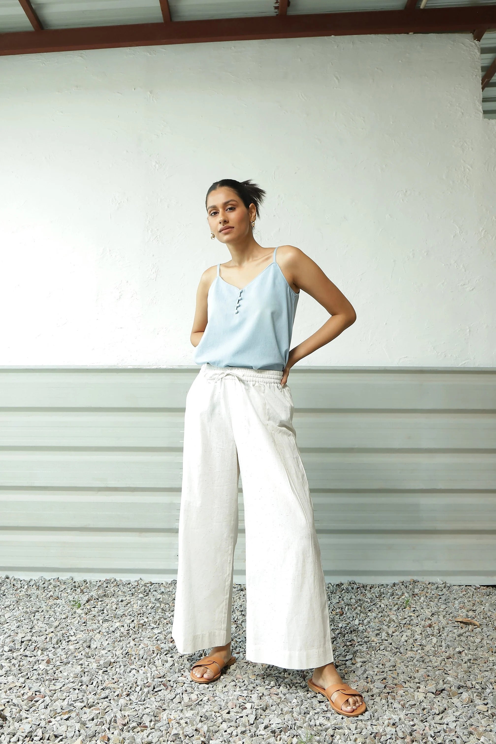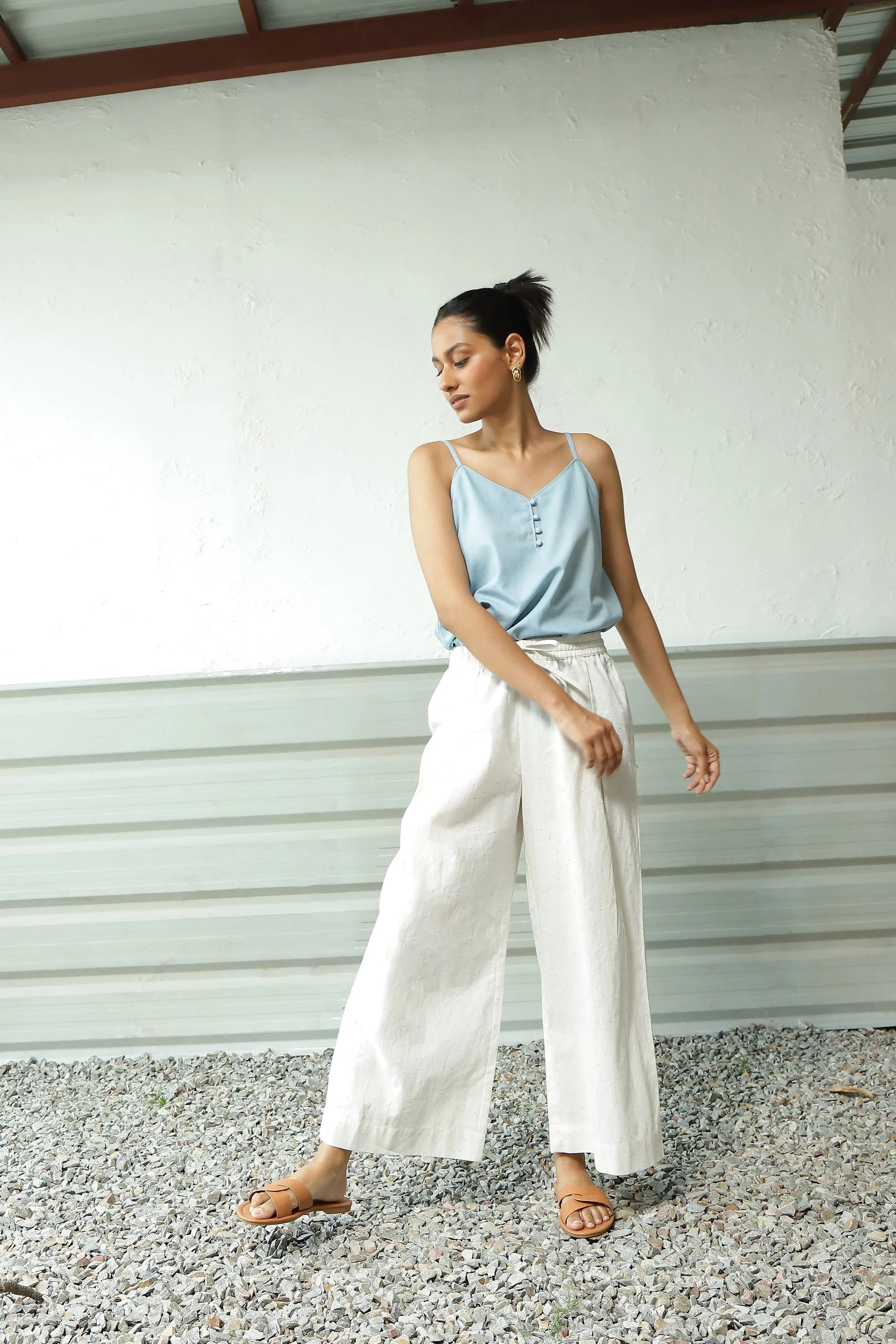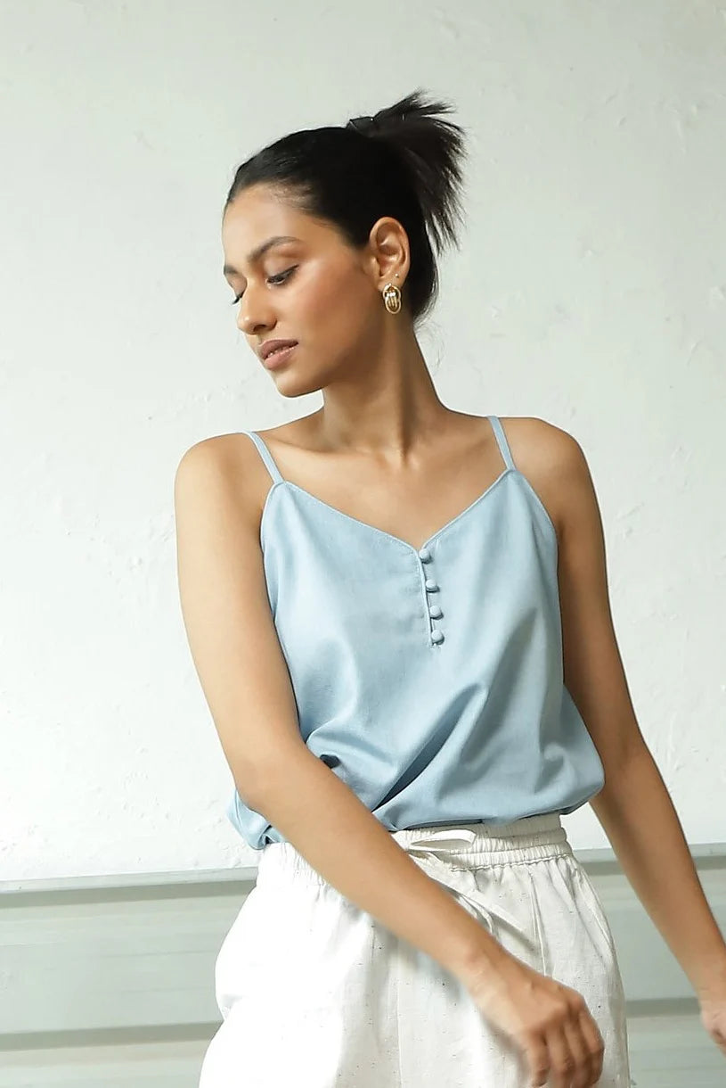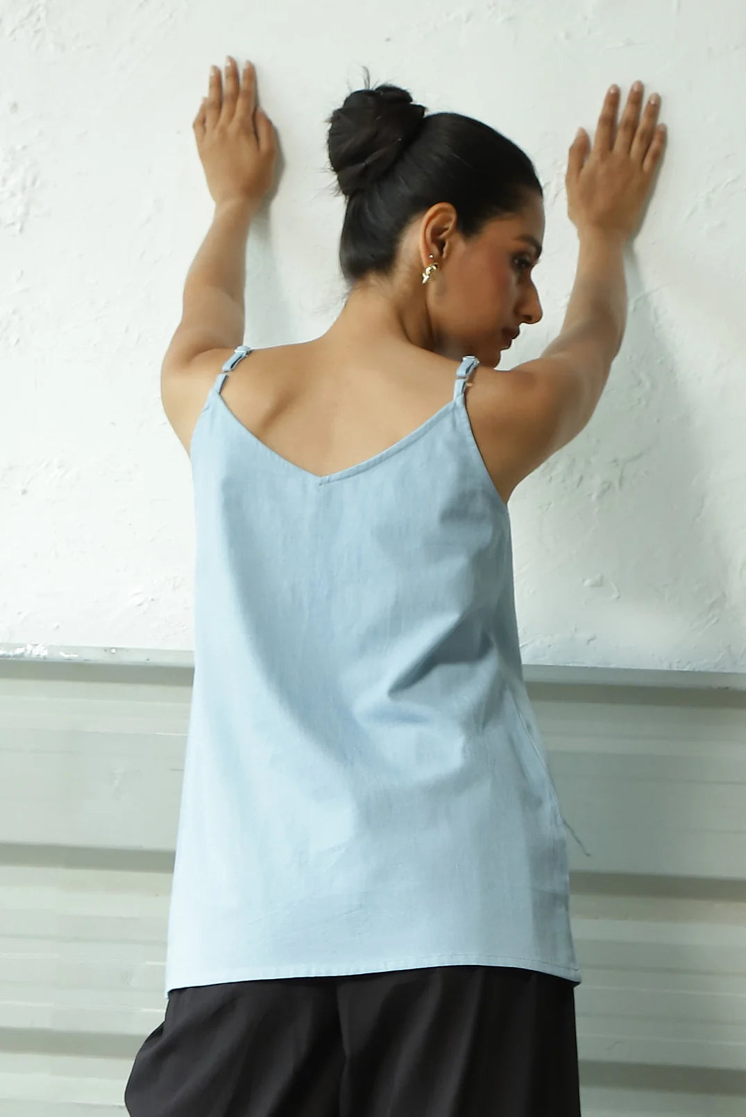Our Elegant Denim Pleat Top - Elevate Your Style Effortlessly. This tailored silhouette with a unique front box pleat detail exudes sophistication and modernity. Crafted from soft denim fabric, it offers a breezy silhouette that adds a touch of elegance to any ensemble. Whether paired with tailored pants for a polished office look or matched with jeans or shorts for a casual yet refined outfit, this top embraces versatility. Our stylist's tip? Pair it with our matching shorts to complete the ensemble.