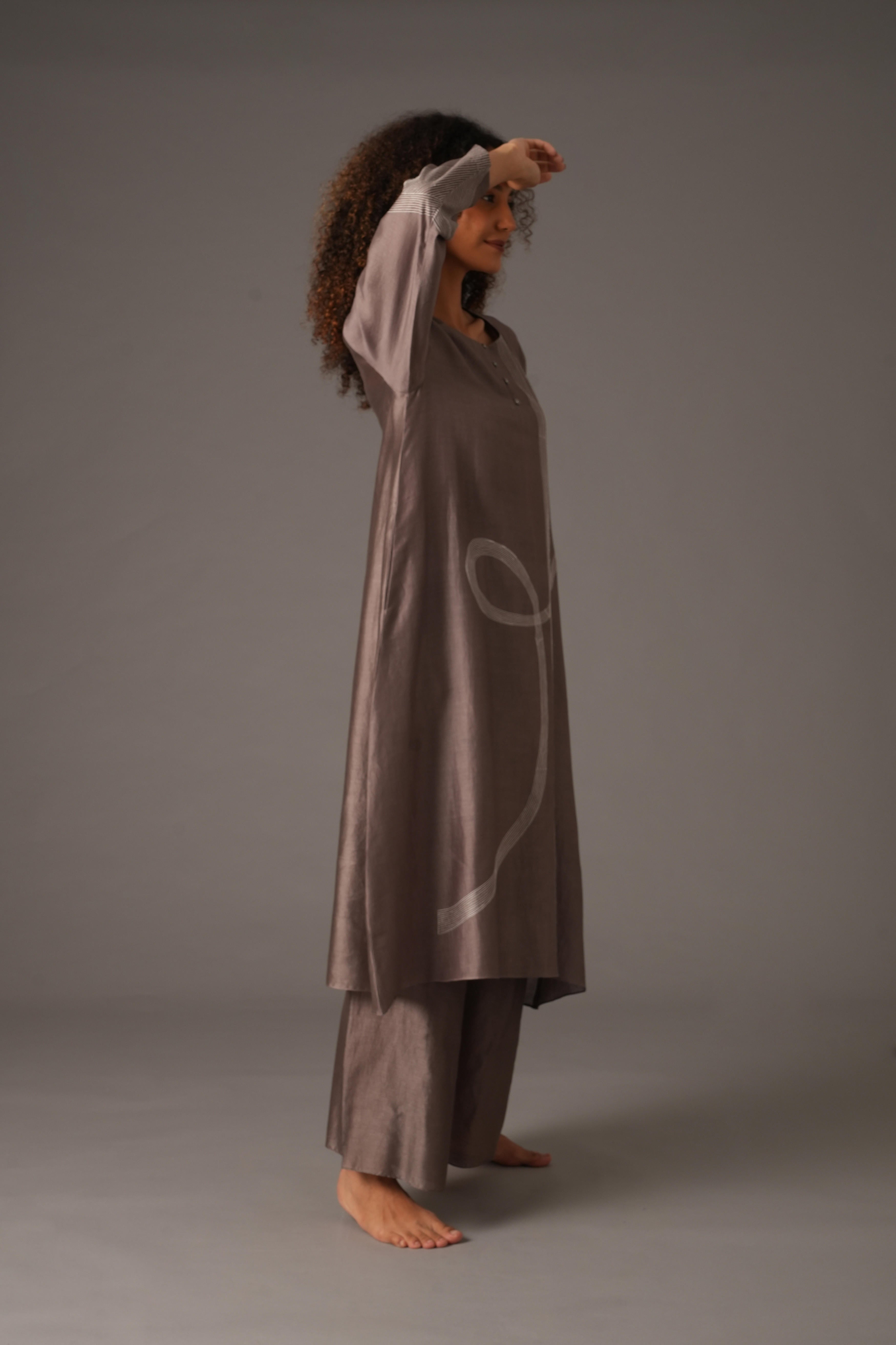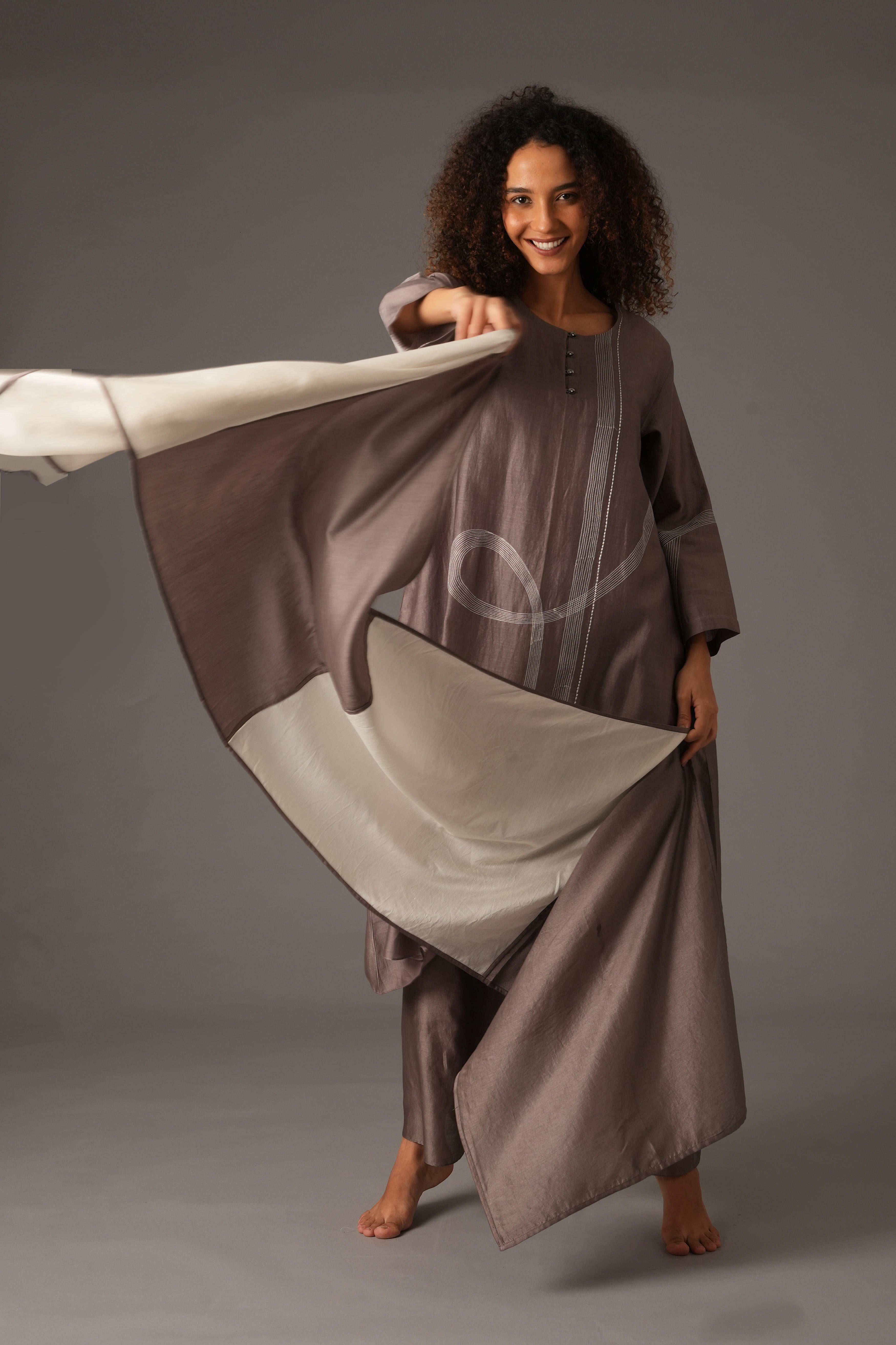 Step into sophistication with this Chanderi Silk set, consisting of a Dress, pants, and a Scarf. The taupe colour and full front embroidery add a touch of elegance to this timeless design. With a loose fit, this set is perfect for both comfort and style, making it ideal for a variety of occasions. Our model, standing at 5'8", is wearing a size S.