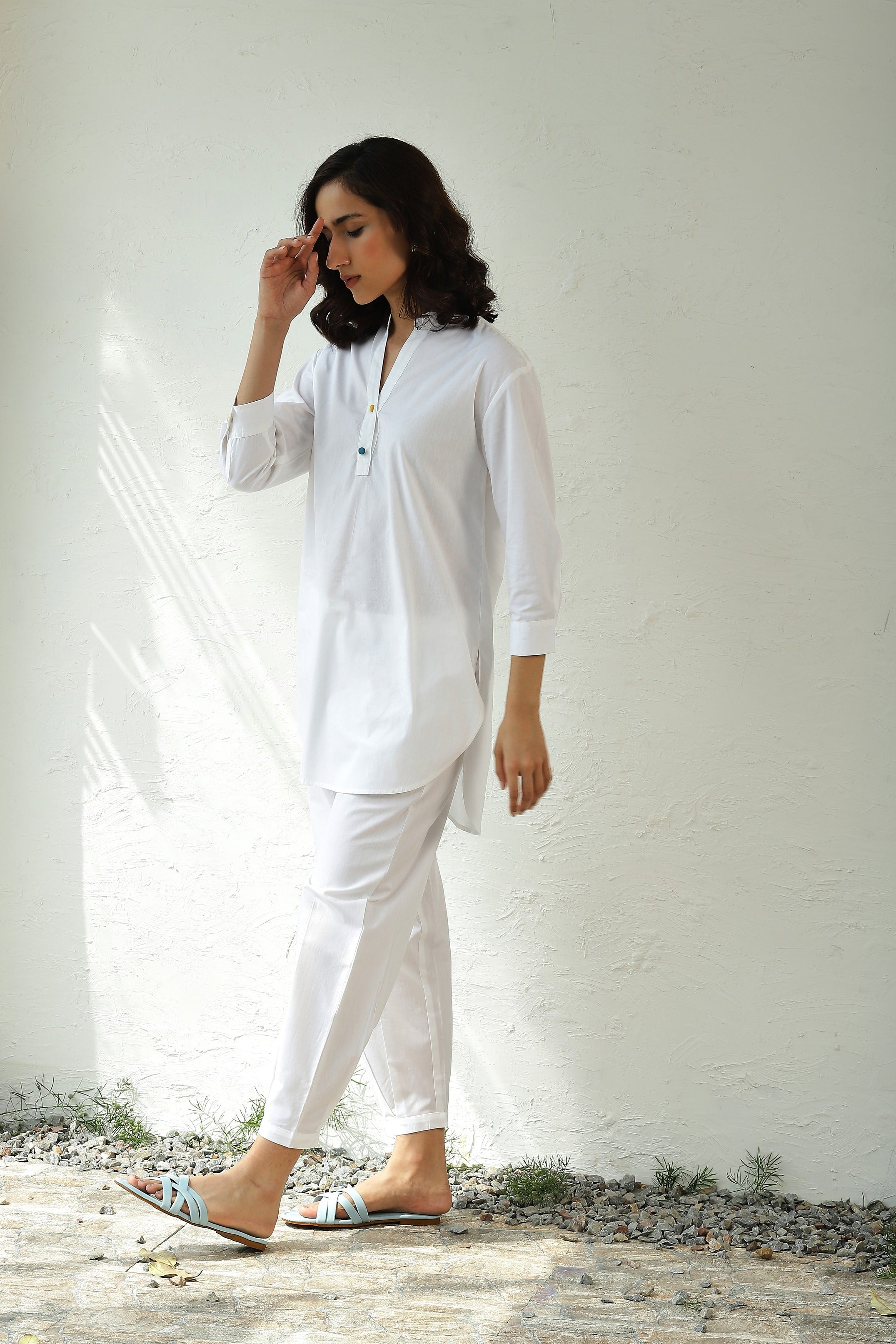 Experience the whiteness of snow, reminiscent of the Gulmarg valley, with our all-white co-ord set. Created from premium cotton poplin fabric, the top boasts a band collar with a v-cut, offering a breezy feel and adorned with beautiful color-contrast buttons. This style resonates like a refreshing hill breeze. Paired with pleated elasticated waistband pant, this ensemble embodies the enchanting allure of a hillside stroll.