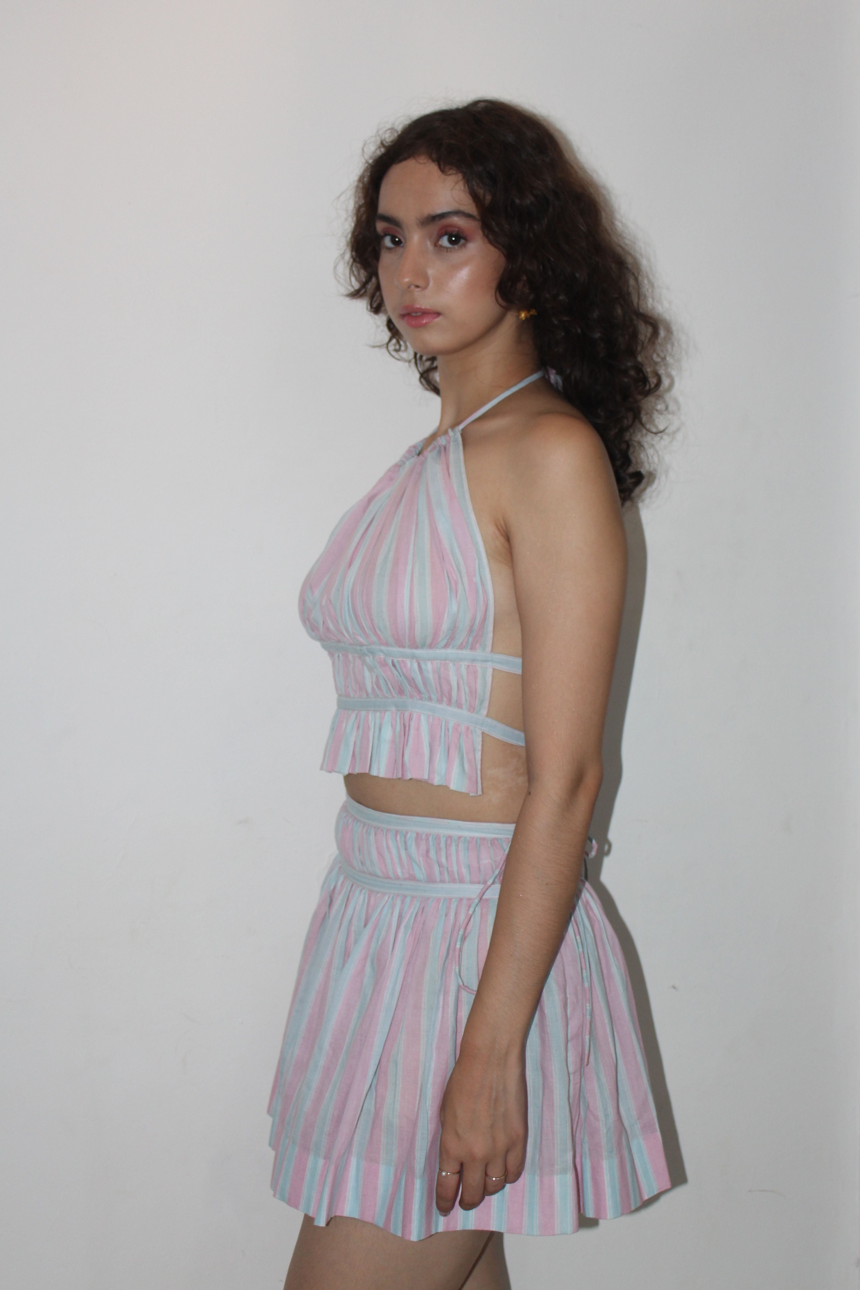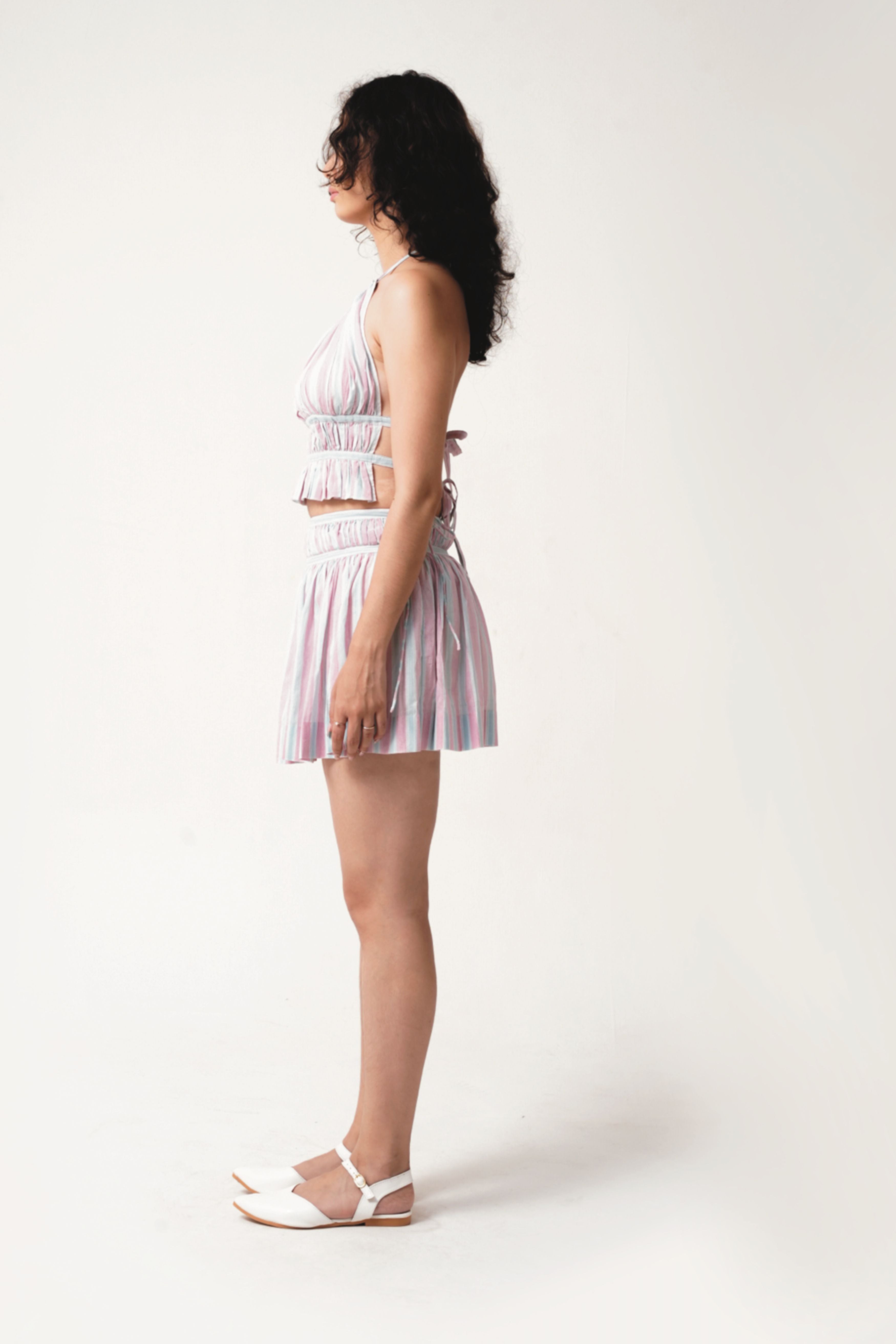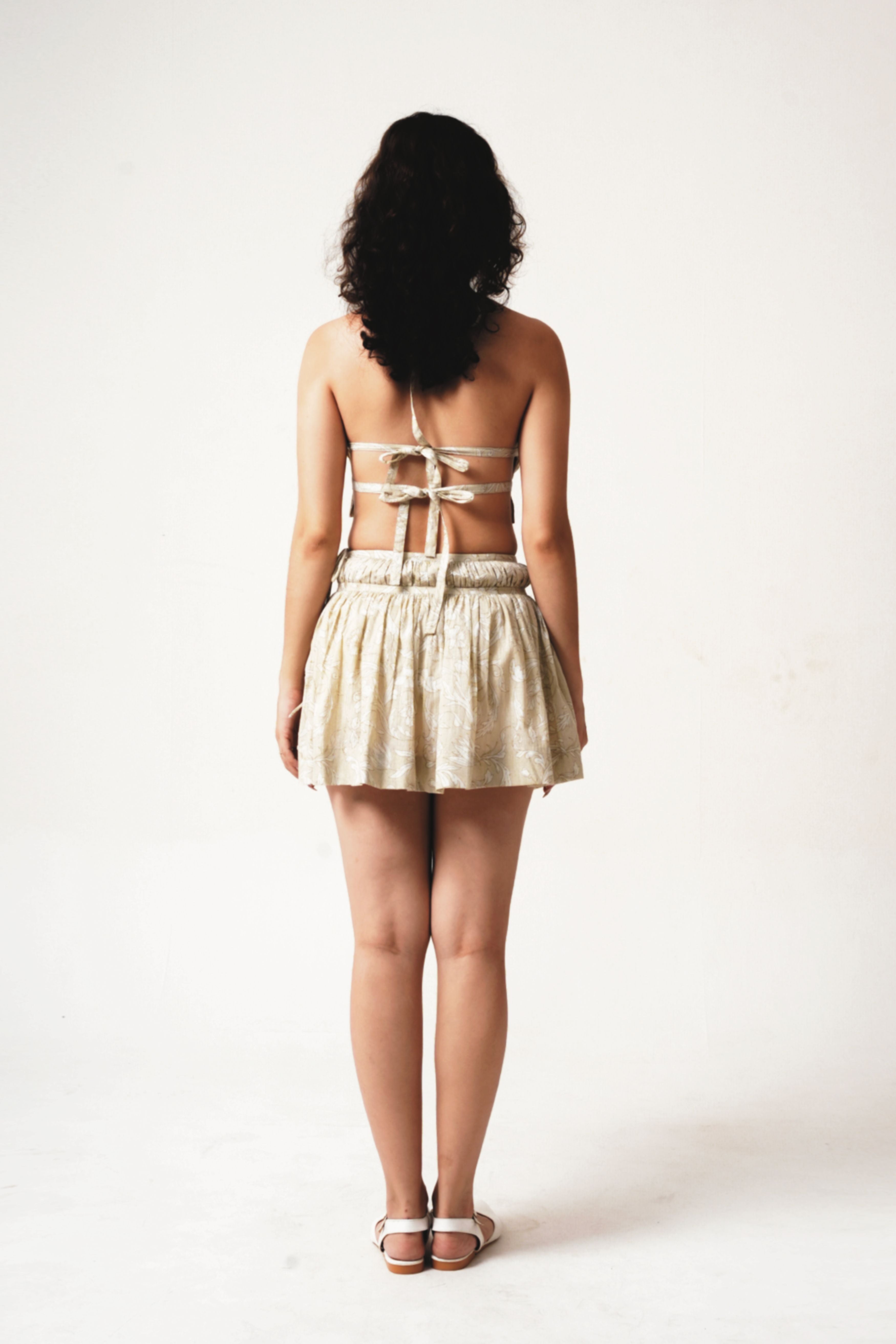 This stunning two-piece set blends sophistication with playful charm, featuring a cropped halter top and a flared gathered mini skirt that work seamlessly as one elegant ensemble. The halter neckline gracefully highlights the shoulders, while delicate pleating and tie-back closures offer both structure and flexibility. The coordinating mini skirt mirrors the top’s soft pleats, enhancing movement and flow. Designed in airy, breathable fabric with subtle floral print. Perfect for summer brunches, casual gatherings, or evening soirees. Model is 5'8 and is wearing a size XS.