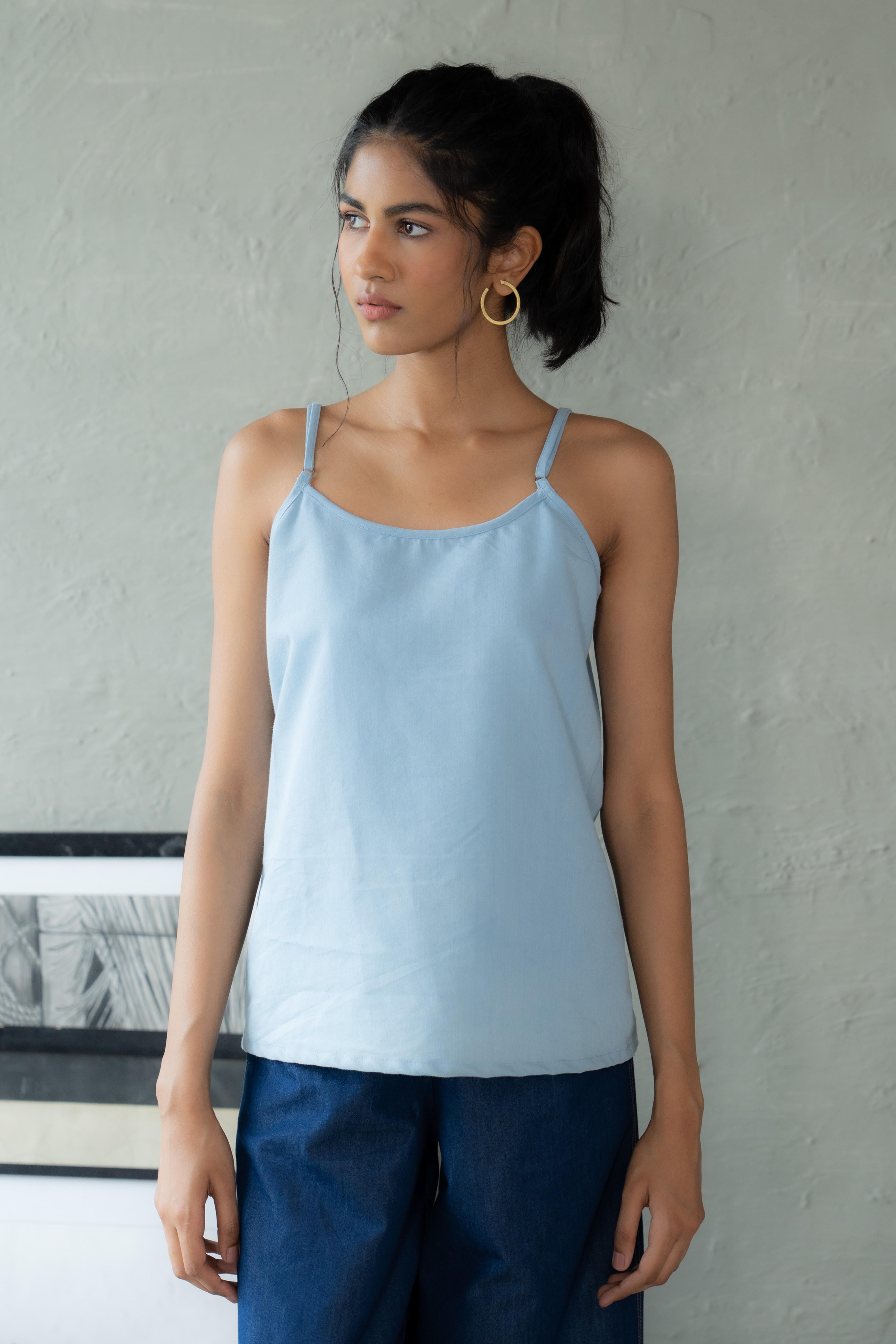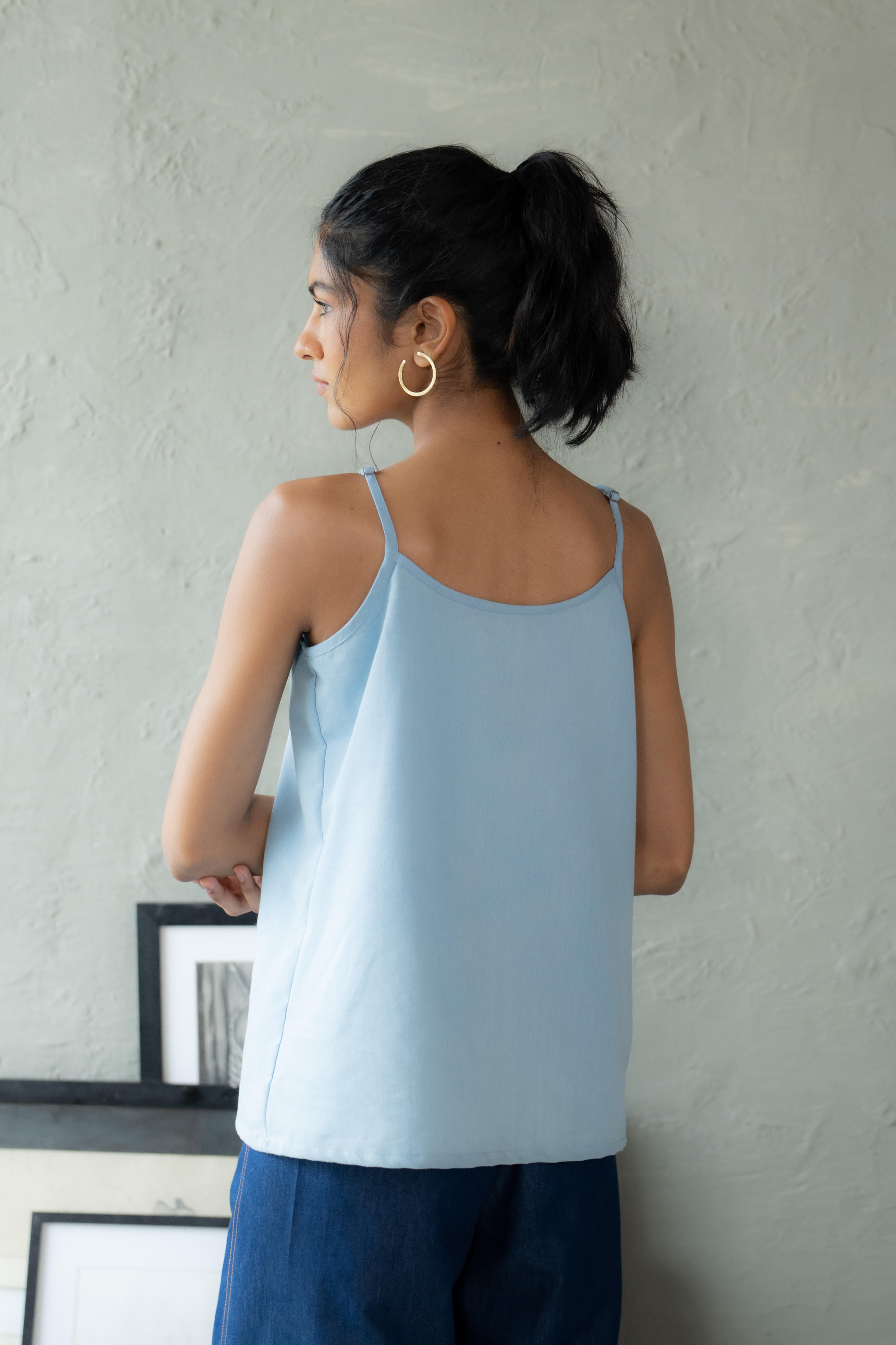 The Heritage Wayfarer Top in soft cotton denim is designed with slim spaghetti straps and a fluid, relaxed fit. Perfect for layering or wearing solo, it pairs effortlessly with denim pants, skirts, or under the matching overlay for a versatile look. Model is 5.9".