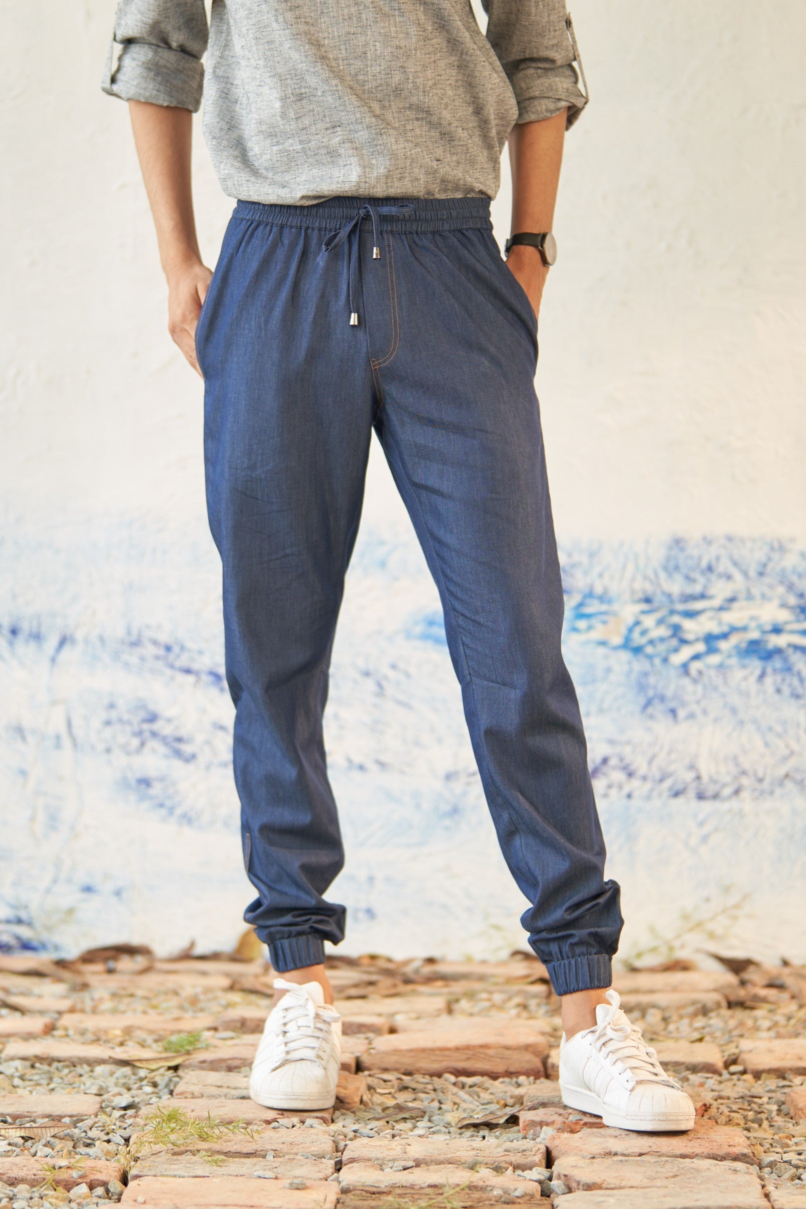 Soft Denim joggers for a relaxed comfort wear. Featuring an elasticated waist with a drawstring and metal accents, these joggers offer both style and functionality. The thread detailing adds a subtle yet distinctive touch, enhancing the overall visual appeal. Whether you're looking for an alternative to rugged jeans or gearing up for an on-the-go race to the top, these joggers are the perfect choice for a laid-back yet stylish look.